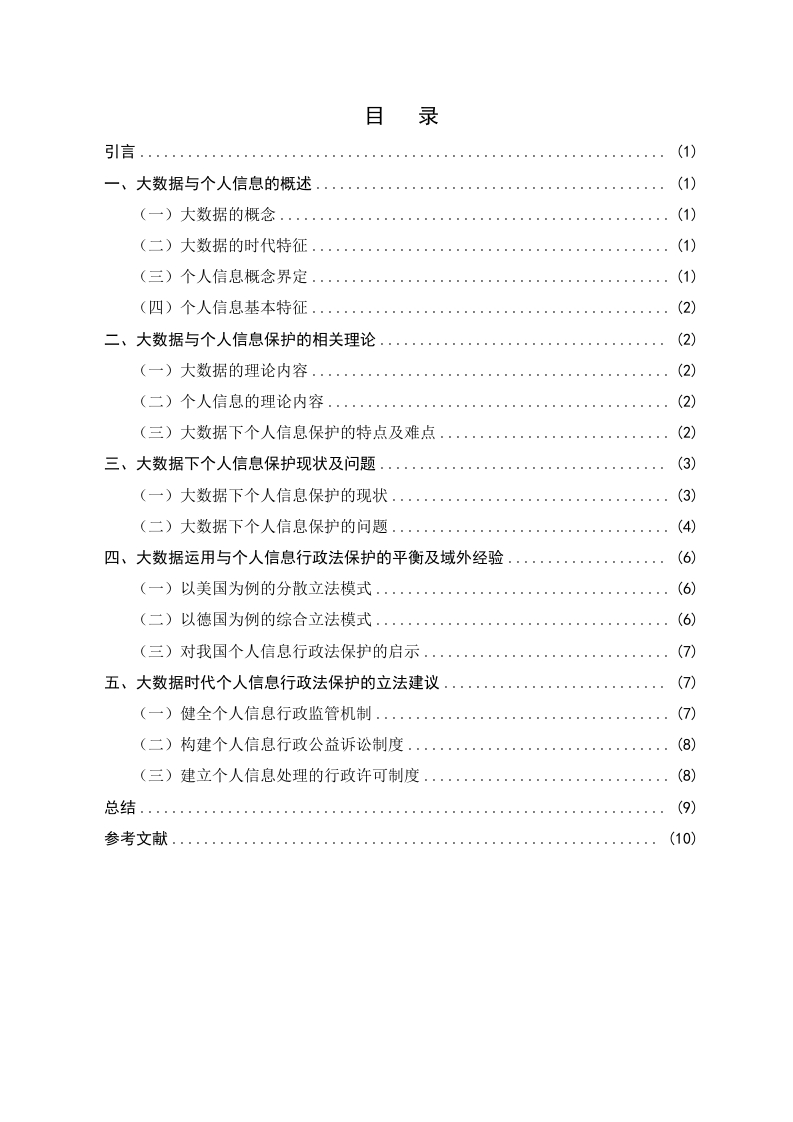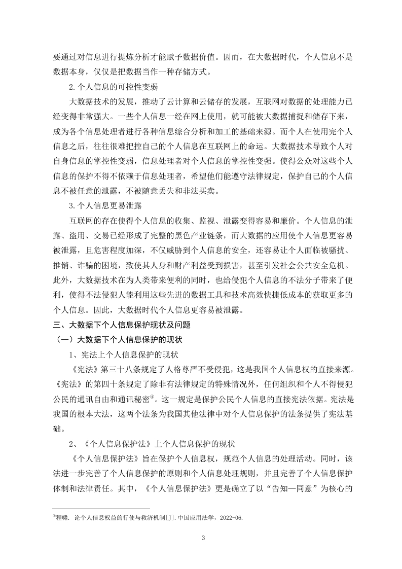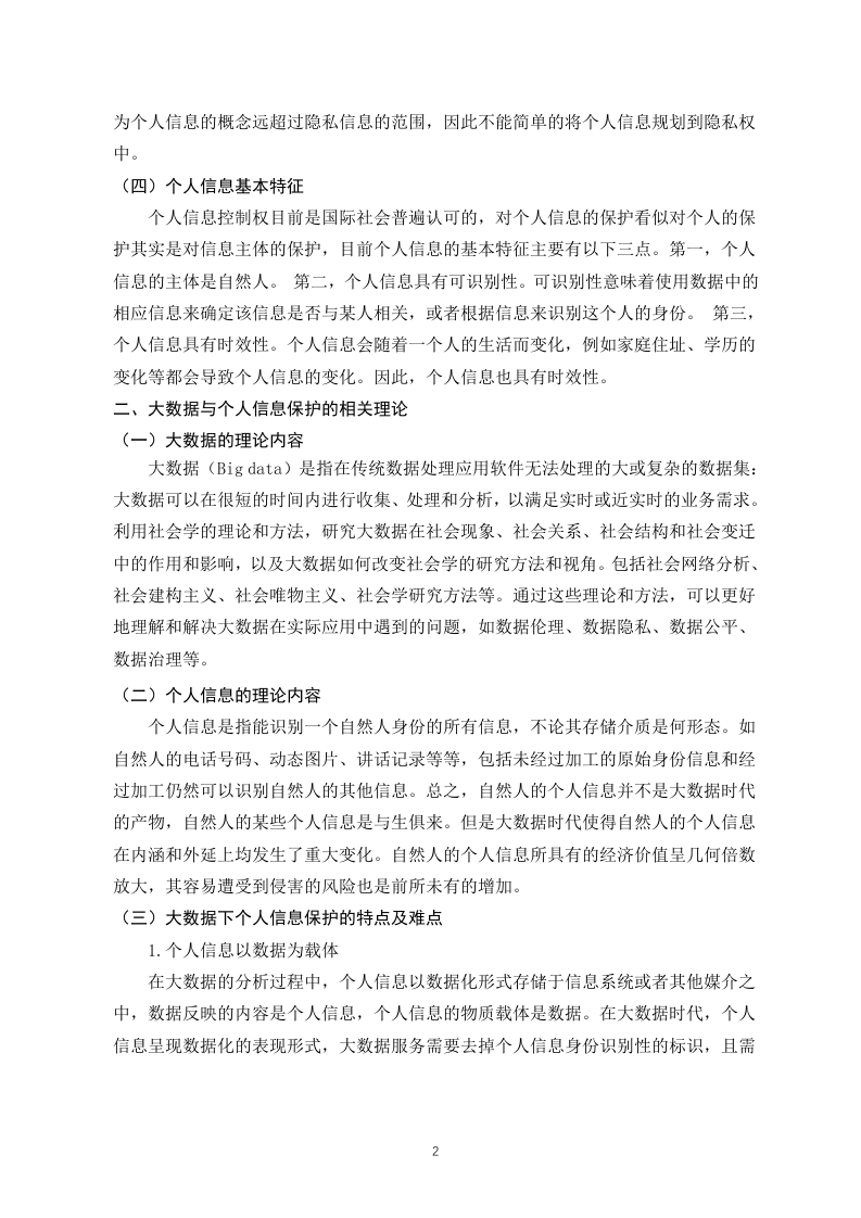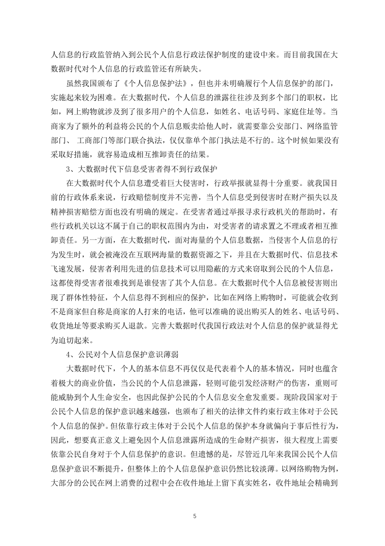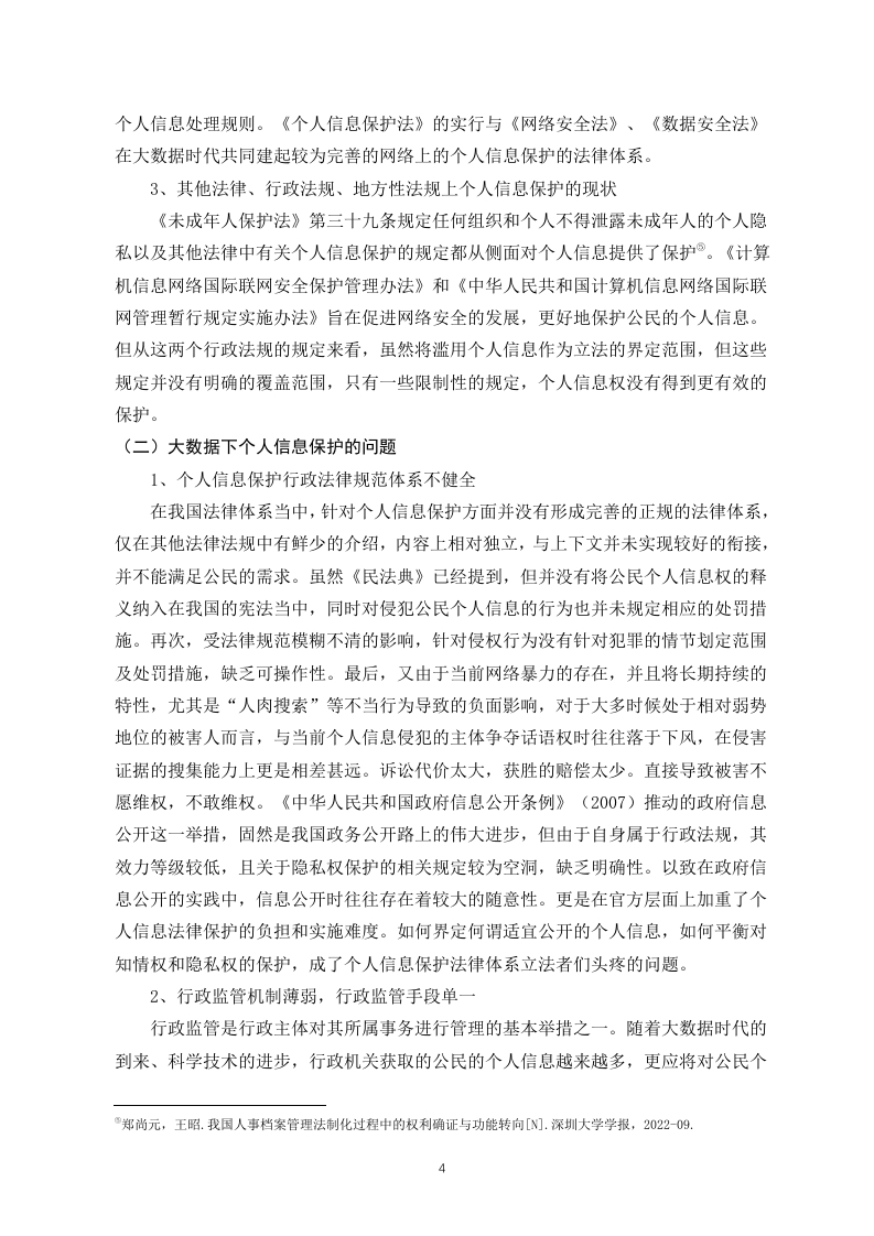 大数据时代个人信息权的保护研究摘要:随着大数据时代到来,大数据已经渗透到了我们的生活中,并给我们带来了便利。但它在给我们带来了便利的同时,也使我们的个人信息越来越容易被泄露。我国的行政机构对公民的个人信息有着双重身份,既是个人信息的使用者也是个性信息的保护者,如果行政机构合理利用个人信息可以有效的提升行政职能的行使,同时保障行政决策的科学性与准确性。但是,行政机构在使用时造成公民个人信息泄露,则将形成不可估量的风险,基于此本文从个人信息的行政法保护入手,分析我国对个人信息保护的现状和在大数据时代我国对个人信息的行政法保护中存在的问题,并提出了大数据时代个人信息的行政法保护的建议。关键词:大数据时代:个人信息;行政法保护On Administrative Law Protection of Personal Information inthe Era of Big DataAbstract:With the advent of the big data era,big data has penetrated into our livesand brought us convenience.But while it brings us convenience,it also makes itincreasingly easy for our personal information to be leaked.The administrative institutionsin our country have a dual identity towards the personal information of citizens,serving asboth users and protectors of personal information.If the administrative institutions makereasonable use of personal information,they can effectively enhance the exercise ofadministrative functions while ensuring the scientific and accurate nature of administrativedecision-making.However,if administrative agencies cause the leakage of personalinformation of citizens during use,it will pose incalculable risks.Based on this,this articlestarts with the administrative law protection of personal information,analyzes the currentsituation of personal information protection in China and the problems existing in theadministrative law protection of personal information in the era of big data,and proposessuggestions for the administrative law protection of personal information in the era of bigdataKey words:the era of big data;personal information;Administrative Law Protection目录引言.…(1)一、大数据与个人信息的概述(1)(一)大数据的概念。。。(1)(二)大数据的时代特征....(1)(三)个人信息概念界定...…(1)(四)个人信息基本特征...(2)二、大数据与个人信息保护的相关理论(2)(一)大数据的理论内容(2)(二)个人信息的理论内容...(2)(三)大数据下个人信息保护的特点及难点.........(2)三、大数据下个人信息保护现状及问题....(3)(一)大数据下个人信息保护的现状...(3)(二)大数据下个人信息保护的问题.................(4)四、大数据运用与个人信息行政法保护的平衡及域外经验(6)(一)以美国为例的分散立法模式..(6)(二)以德国为例的综合立法模式.....(6)(三)对我国个人信息行政法保护的启示.(7)五、大数据时代个人信息行政法保护的立法建议(7)(一)健全个人信息行政监管机制....(7)(二)构建个人信息行政公益诉讼制度(8)(三)建立个人信息处理的行政许可制度(8)总结.(9)参考文献....(10)引言大数据时代的到来,给我们带来了很多便利,例如我们可以通过网络来进行购物、买票等。同时大数据也给国家行政机关的管理方式带来了翻天覆地的变化,行政机关拥有了庞大的个人信息数据库,这大大提高了行政机关的办事效率。但大数据在给我们带来便利的同时,也更容易导致个人信息的泄露。比如,我们在网络购物时个人信息被商家买卖:政府在收集我们个人信息时,没有进行“脱敏”处理导致我们的个人信息被泄露等等。所以在大数据时代,如何保护好公民的个人信息就变得十分重要。一、大数据与个人信息的概述(一)大数据的概念大数据这一概念早在十九世纪九十年代提出,最早的学者仅仅对大数据进行了预测,并没有深入进行研究,时至今日,大数据时代正式来临,围绕着数据本身进行的各种行业应用也变得极为广泛,数据俨然成为新时代中生产力的重要构成,然而对于“大数据”一词的解释,学术界至今没有给出准确的说法。笔者认为,“大数据”应当是指运用技术搜集、处理、整合、挖掘庞大的数据信息,并对众多的信息资源予以聚合,形成为行政机关决议、提供公共服务、企业决策以及经济发展的数据平台,从而创造出相应的经济价值与社会价值。(二)大数据的时代特征基于大数据而产生的智能运用在人们的生活中已经极为普遍,大数据得到了政界、商界、学术界、科技界的广泛认可,我国已经进入大数据运用的信息化发展的新阶段,学术界对于大数据的时代特征大致分为数据量庞大、类型多样化、价值密度低、处理速度快四大特征®。(三)个人信息概念界定个人信息是以电子或者其他方式记录的能够单独或者与其他信息联合识别个人的各种信息,包括姓名、身份证件号码、生物识别信息等。关于个人信息的研究主要是隐私说和关联说。隐私说是指通过隐私权来实现对个人信息的保护:关联说是将个人信息的范围进行了极致的扩大。我国学术界在关于个人信息的概念的研究过程中,有的学者支持隐私说,例如,陈长明教授认为个人信息具有明显的隐私性:而更多的学者支持关联说,关联说认为个人信息不仅包括姓名、身份证号等能够具体识别到的个人信息,还包括个人隐私,甚至将个人在社会的各种联系都包括在内,王利明教授认李超凡.新时期背景下我国个人信息行政法保护问题思考[J门.文存阅刊,2021,(11)”程喷.论个人信息