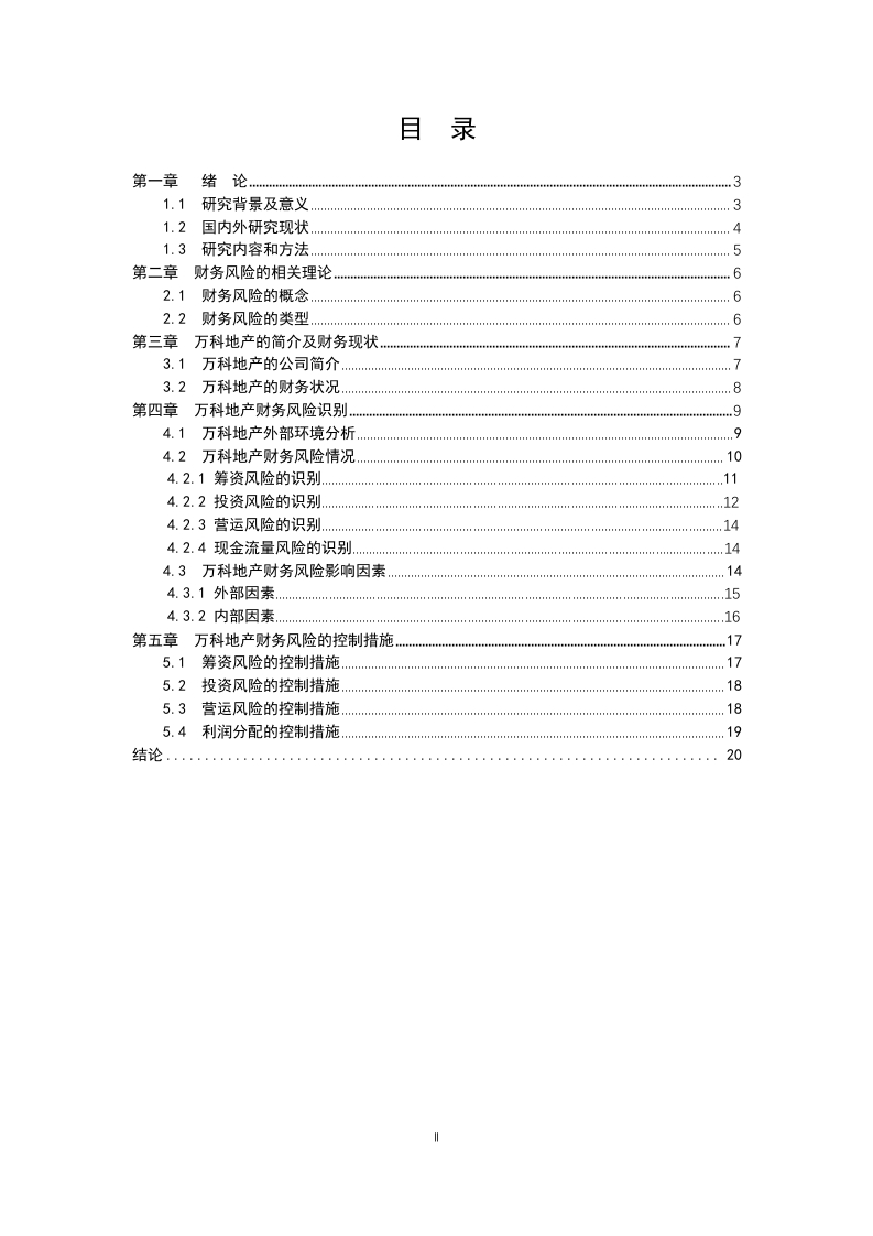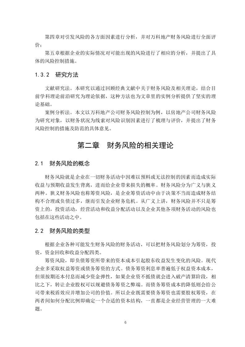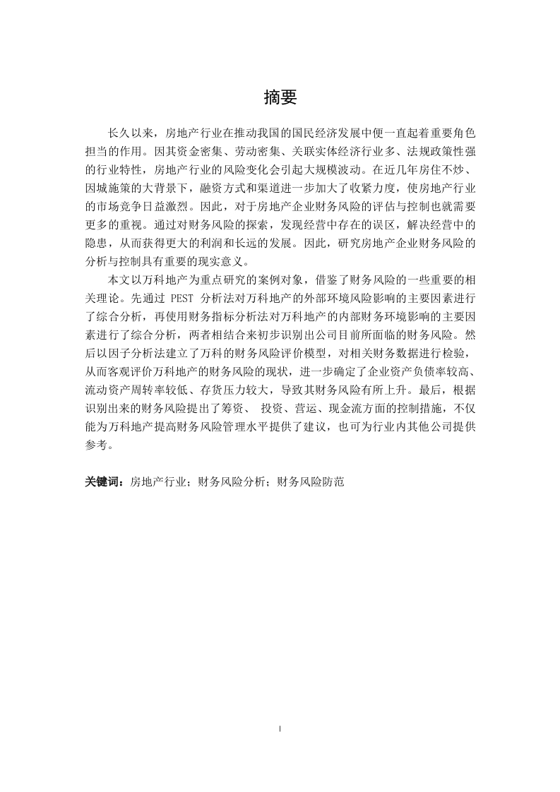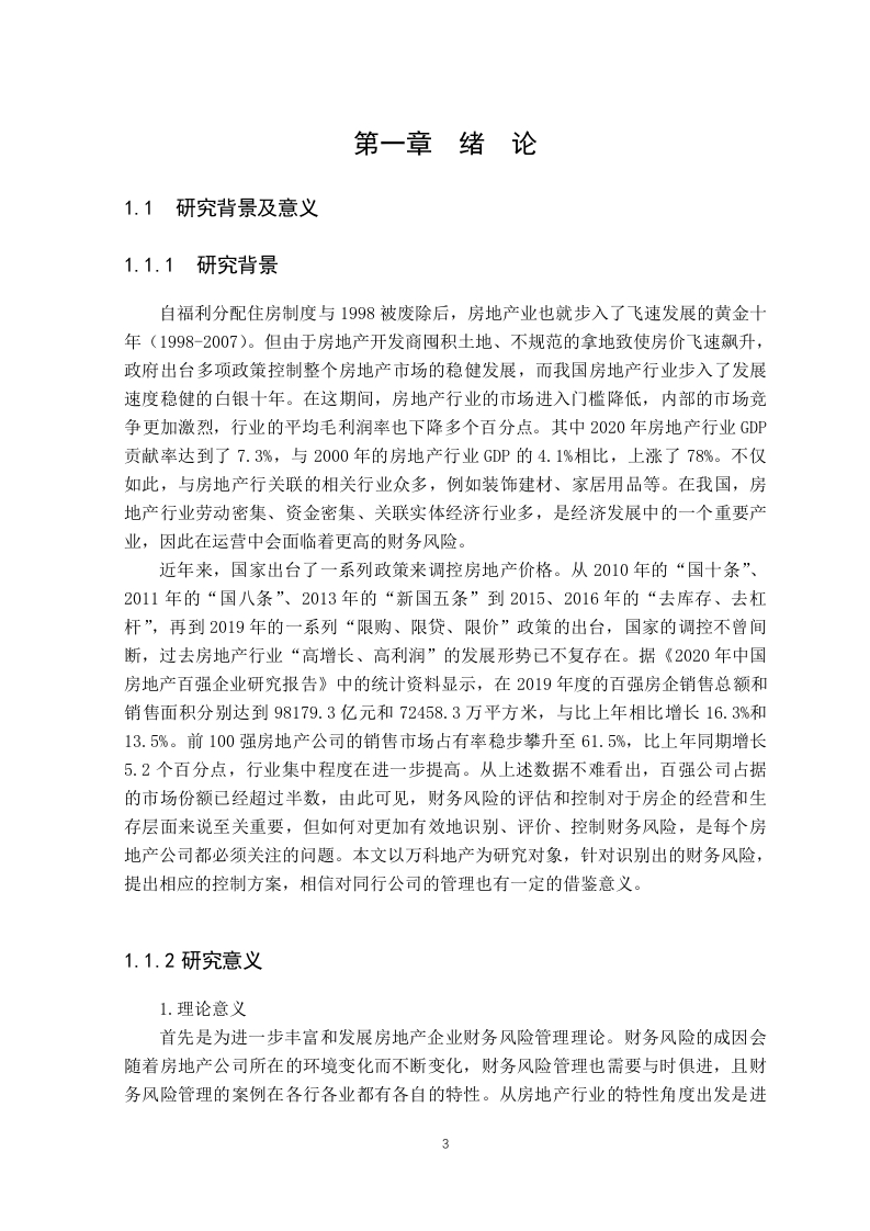广东工业大学华立学院本科生毕业设计(论文)论文题目房地产行业财务风险分析与防范一以万科地产为例学院年级专业班级姓名指导教师2024年3月摘要长久以来,房地产行业在推动我国的国民经济发展中便一直起着重要角色担当的作用。因其资金密集、劳动密集、关联实体经济行业多、法规政策性强的行业特性,房地产行业的风险变化会引起大规模波动。在近几年房住不炒、因城施策的大背景下,融资方式和渠道进一步加大了收紧力度,使房地产行业的市场竞争日益激烈。因此,对于房地产企业财务风险的评估与控制也就需要更多的重视。通过对财务风险的探索,发现经营中存在的误区,解决经营中的隐患,从而获得更大的利润和长远的发展。因此,研究房地产企业财务风险的分析与控制具有重要的现实意义。本文以万科地产为重点研究的案例对象,借鉴了财务风险的一些重要的相关理论。先通过PST分析法对万科地产的外部环境风险影响的主要因素进行了综合分析,再使用财务指标分析法对万科地产的内部财务环境影响的主要因素进行了综合分析,两者相结合来初步识别出公司目前所面临的财务风险。然后以因子分析法建立了万科的财务风险评价模型,对相关财务数据进行检验,从而客观评价万科地产的财务风险的现状,进一步确定了企业资产负债率较高、流动资产周转率较低、存货压力较大,导致其财务风险有所上升。最后,根据识别出来的财务风险提出了筹资、投资、营运、现金流方面的控制措施,不仅能为万科地产提高财务风险管理水平提供了建议,也可为行业内其他公司提供参考。关键词:房地产行业:财务风险分析:财务风险防范目录第一章绪论…31.1研究背景及意义1.2国内外研究现状.41.3研究内容和方法.5第二章财务风险的相关理论t62.1财务风险的概念62.2财务风险的类型..6第三章万科地产的简介及财务现状73.1万科地产的公司简介…。3.2万科地产的财务状况8第四章万科地产财务风险识别…94.1万科地产外部环境分析94.2万科地产财务风险情况104.2.1筹资风险的识别114.2.2投资风险的识别124.2.3营运风险的识别144.2.4现金流量风险的识别144.3万科地产财务风险影响因素144.3.1外部因素154.3.2内部因素16第五章万科地产财务风险的控制措施.175.1筹资风险的控制措施.175.2投资风险的控制措施185.3营运风险的控制措施.185.4利润分配的控制措施..19结论…20第一章绪论1.1研究背景及意义1.1.1研究背景自福利分配住房制度与1998被废除后,房地产业也就步入了飞速发展的黄金十年(1998-2007)。但由于房地产开发商囤积土地、不规范的拿地致使房价飞速飙升,政府出台多项政策控制整个房地产市场的稳健发展,而我国房地产行业步入了发展速度稳健的白银十年。在这期间,房地产行业的市场进入门槛降低,内部的市场竞争更加激烈,行业的平均毛利润率也下降多个百分点。其中2020年房地产行业GDP贡献率达到了7.3%,与2000年的房地产行业GDP的4.1%相比,上涨了78%。不仅如此,与房地产行关联的相关行业众多,例如装饰建材、家居用品等。在我国,房地产行业劳动密集、资金密集、关联实体经济行业多,是经济发展中的一个重要产业,因此在运营中会面临着更高的财务风险。近年来,国家出台了一系列政策来调控房地产价格。从2010年的“国十条”、2011年的“国八条”、2013年的“新国五条”到2015、2016年的“去库存、去杠杆”,再到2019年的一系列“限购、限贷、限价”政策的出台,国家的调控不曾间断,过去房地产行业“高增长、高利润”的发展形势已不复存在。据《2020年中国房地产百强企业研究报告》中的统计资料显示,在2019年度的百强房企销售总额和销售面积分别达到98179.3亿元和72458.3万平方米,与比上年相比增长16.3%和13.5%。前100强房地产公司的销售市场占有率稳步攀升至61.5%,比上年同期增长5.2个百分点,行业集中程度在进一步提高。从上述数据不难看出,百强公司占据的市场份额已经超过半数,由此可见,财务风险的评估和控制对于房企的经营和生存层面来说至关重要,但如何对更加有效地识别、评价、控制财务风险,是每个房地产公司都必须关注的问题。本文以万科地产为研究对象,针对识别出的财务风险,提出相应的控制方案,相信对同行公司的管理也有一定的借鉴意义。1.1.2研究意义1.理论意义首先是为进一步丰富和发展房地产企业财务风险管理理论。财务风险的成因会随着房地产公司所在的环境变化而不断变化,财务风险管理也需要与时俱进,且财务风险管理的案例在各行各业都有各自的特性。从房地产行业的特性角度出发是进