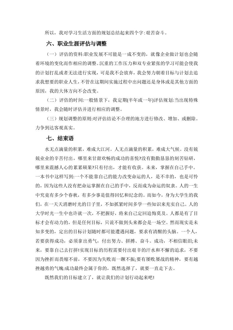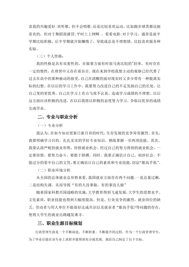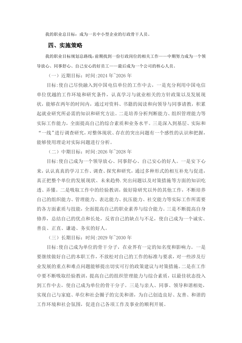 个人职业生涯规划书学号:姓名:班级:前言作为一名行政管理专业的大学生,我已经匆匆走过了三年的大学生活。性格活泼开朗,并且擅于言谈。业余时间喜欢看书、听音乐、写文章(尤其是散文类的文章)。乐于观察生活,并且习惯用自己的方式记录下生活中令自己感动以及自己感兴趣的东西。做事讲求脚踏实地、有始有终,不喜欢弄虚作假、半途而废。待人和善,尤其是对自己的老师以及前辈,因此能够很快的被老师以及身边的人肯定和接受。往往对于身边的每一件事情都持有自己的看法和想法。我的优势在于,我能够经常对身边的事进行总结和反思,从他人以及自己的身上获得对自己前进和成长极具好处的东西。有很好的团队精神,这是我在集体生活以及校园活动中比较活跃的法宝之一。但是,偶尔缺乏勇气的性格也同样会使我面对不必要的失败和挫折,甚至丧失难得的锻炼和展示的机会。我来自于农村,和其他生活在城市中的同学相比,我的生活条件并不是很好。父母把他们的辛苦凝结成对我的殷切期望,因此,我的身上除了有自己的人生理想之外,还一样有父母及全家的期望,我没有理由不努力实践、努力进取。也正是有全家人的支持,我才能顺利坚强地一个人走到现在。有时面对着自己周围衣着华丽的同学的时候,也会有一点小小的自卑。并且,经常多愁善感,对周围的一切充满感慨。一、自我分析(一)个人基本情况:姓名:性别:出生日期:专业:行政管理专科(二)个人兴趣:自己的性格有时候比较活泼开朗,有时候又比较内向,不太善和同学交流:喜我的兴趣爱好:欢听歌,但不会唱歌:还是比较喜欢运动,比如跑步球类都还挺喜欢的,但对于舞蹈部感冒:平时上上网啊,看看电影:对于学习,通常是前半学期比较积极,后半学期就开始懒惰了,导致成总是不理想绩。比较喜欢做各种实验。(三)个人性格:我的性格是具有双重性的,在做事方面有时很马虎比较的“轻率,有时存在一定的惰性,在理智中又存在着盲目。现在来到学校我想主动的观察已经代替了过去在高中的那种被动的接受,自己在清醒的面对现实时又多少带有一种脱离实际的幻想。在以后的学习工作中,我要努力改进自己的不足发扬自己的长处,让自己变的更优秀,自己在学习上有点马虎不认真,造成学习成绩的不理想,以后这方面应该积极的改进,在以后我将以积极的态度努力学习,争取以优异的成绩完成学业二、专业与职业分析(一)专业分析我认为,在如今知识更新日新月异的时代,生存发展的竞争异常激烈。首先,我要明确学习目的。扎扎实实的学好专业知识,熟练掌握一至两项技能。其次,我要认清严峻的就业形势,珍惜就业机会。经过自己的努力得到的就业机会,一定要珍惜,要努力奋斗,要敢于拼搏。同时,我要正确估计自己。初涉社会,不能过分的看中自己的文凭,要正确估计自己的素质和专业技能,切忌“眼高手低”。(二)职业环境分析从全国的总体就业总形势来看,我国就业方面存在两个问题:一是总量过剩,二是结构失调。从而导致“有的人没事做,有的事没人做”随着国家科教兴国战略的实施,大学教育得到飞速发展,大学生的思想水平、文化素质,职业技能也得到大幅度提高。但是,行业竞争的激烈,就业岗位的缺乏,劳动者与用人单位不能很好达成共识以及就业者“眼高手低?等问题的存在,使得大学生的就业出路越发难寻。三、职业生涯目标规划行政管理生涯是一个不断深造、不断积累、不断提升的过程。作为一个行政管理学生,为了毕业后能在该专业上求职并能得到充分地发展,我给自己制定了以下目标。我的职业总目标:成为一名中小型企业的行政骨干人员。四、实施策略我的职业目标规划总路线:前期找到一份行政岗位的相关工作一一中期努力成为一个领导放心、同事舒心、自己安心的好员工一一最后成为一个公司的核心人员。(一)近期目标:时间:2024年2026年目标:使自己尽快融入到中国电信单位的工作中去,一是充分利用中国电信单位优越的工作环境和研究条件,认真学习与就业相关的方针政策以及发展现状,能够在两年的时间内,通过对资料、书籍的阅读和向领导与同事请教,积累起就业研究所必需的知识和研究方法。二是培养分析判断能力、组织管理能力等实际工作能力,全面提高自己的综合素质和业务水平。三是深入到基层、实际和“一线”进行调查研究,对整体现状、存在的突出问题有一个感性的认识和把握,能够使用理论对实际问题进行分析。(二)中期目标:时间:2026年2028年目标:使自己成为一个领导放心、同事舒心、自己安心的好人。一是安下心来,认认真真的学习工作、调查、探究和研究,通过多种形式的相互补充与促进,真正把整个单位的发展现状、未来趋势.突出问题以及对策措施等方面的知识吃透、弄懂。二是吸取工作中的经验教训,做好除研究以外的其他工作,不断培养自己的组织能力、管理能力、表达能力、抗压能力、社交能力等实际工作所需要的各方面素质与技能,全面提高自己的职业素养与综合能力。三是不断提高自身修养,总结自己的优点和长处,反省自己的缺点与不足,使自己成为一个诚实、善良、正直、谦逊、务实的好人。(三)长期目标:时间:2029年2030年目标:使自己成为单位的骨干分子,在业界有一定的知名度和影响力。一是要继续做好自己的本职工作,不放