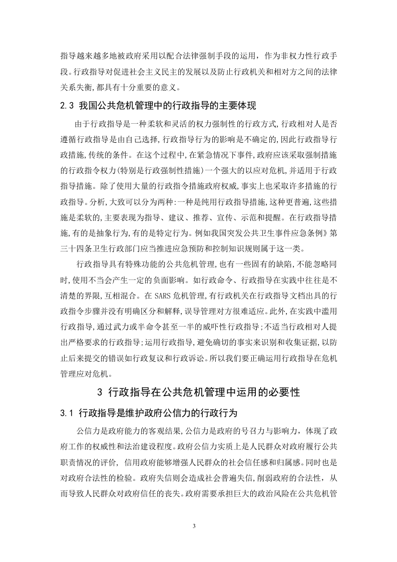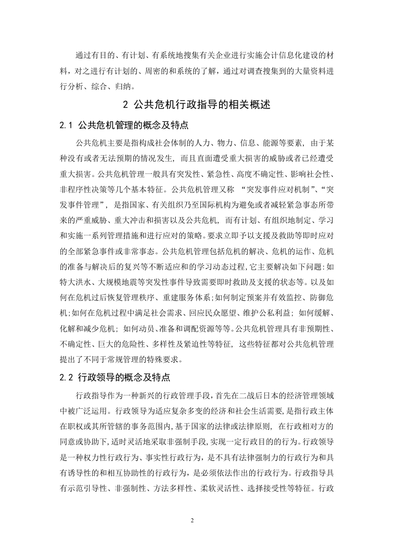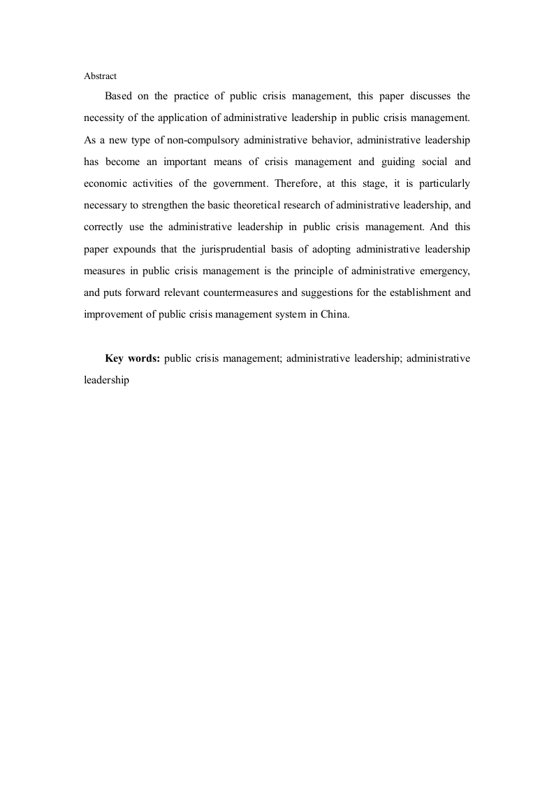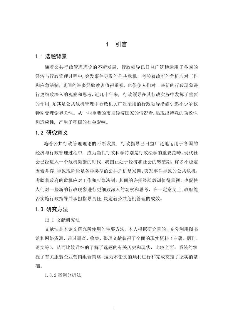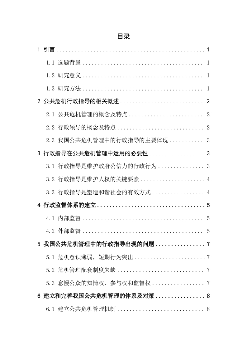 公共危机管理中的行政领导监督方式摘要本文结合公共危机管理的实践,探讨了行政领导在公共危机管理中运用的必要性。行政领导作为一种新型的非强制性行政行为,已成为政府危机管理和引导社会经济活动的重要手段。所以现阶段特别需要加强行政领导的基础理论研究,正确地运用公共危机管理中的行政领导。并且本文阐述了在公共危机管理中采用行政领导措施的法理基础是行政应急性原则,并对我国公共危机管理系统的建立和完善提出了相关的对策建议。关键词:公共危机管理:行政领导:行政领导方式AbstractBased on the practice of public crisis management,this paper discusses thenecessity of the application of administrative leadership in public crisis management.As a new type of non-compulsory administrative behavior,administrative leadershiphas become an important means of crisis management and guiding social andeconomic activities of the government.Therefore,at this stage,it is particularlynecessary to strengthen the basic theoretical research of administrative leadership,andcorrectly use the administrative leadership in public crisis management.And thispaper expounds that the jurisprudential basis of adopting administrative leadershipmeasures in public crisis management is the principle of administrative emergency,and puts forward relevant countermeasures and suggestions for the establishment andimprovement of public crisis management system in China.Key words:public crisis management;administrative leadership;administrativeleadership目录1引言...1.1选题背景..1.2研究意义...1.3研究方法..·2公共危机行政指导的相关概述22.1公共危机管理的概念及特点....22.2行政领导的概念及特点.....22.3我国公共危机管理中的行政指导的主要体现.·..····3行政指导在公共危机管理中运用的必要性.........3.1行政指导是维护政府公信力的行政行为..·....·33.2行政指导是维护人权的关键要素......3.3行政指导是塑造和谐社会的有效方式..…·44行政监督体系的建立.....4.1内部监督54.2外部监督.............5我国公共危机管理中的行政指导出现的问题....75.1危机意识薄弱,短期行为突出......5.2危机管理配套制度欠缺.......5.3怠慢公众的知情权、参与权和监督权........·6建立和完善我国公共危机管理的体系及对策......·86.1建立公共危机管理机制.....86.2加强公共应急法制建设.…·96.3积极灵活地运用行政指导措施..9结语...10致谢.10参考文献...…10