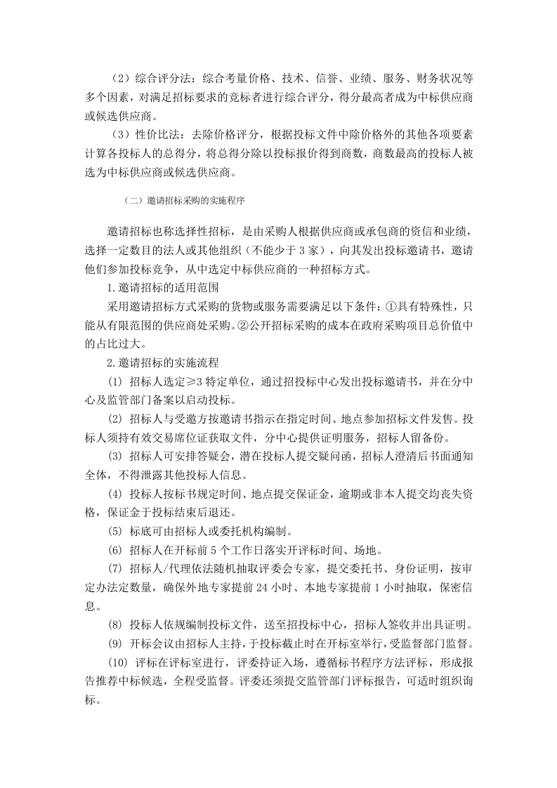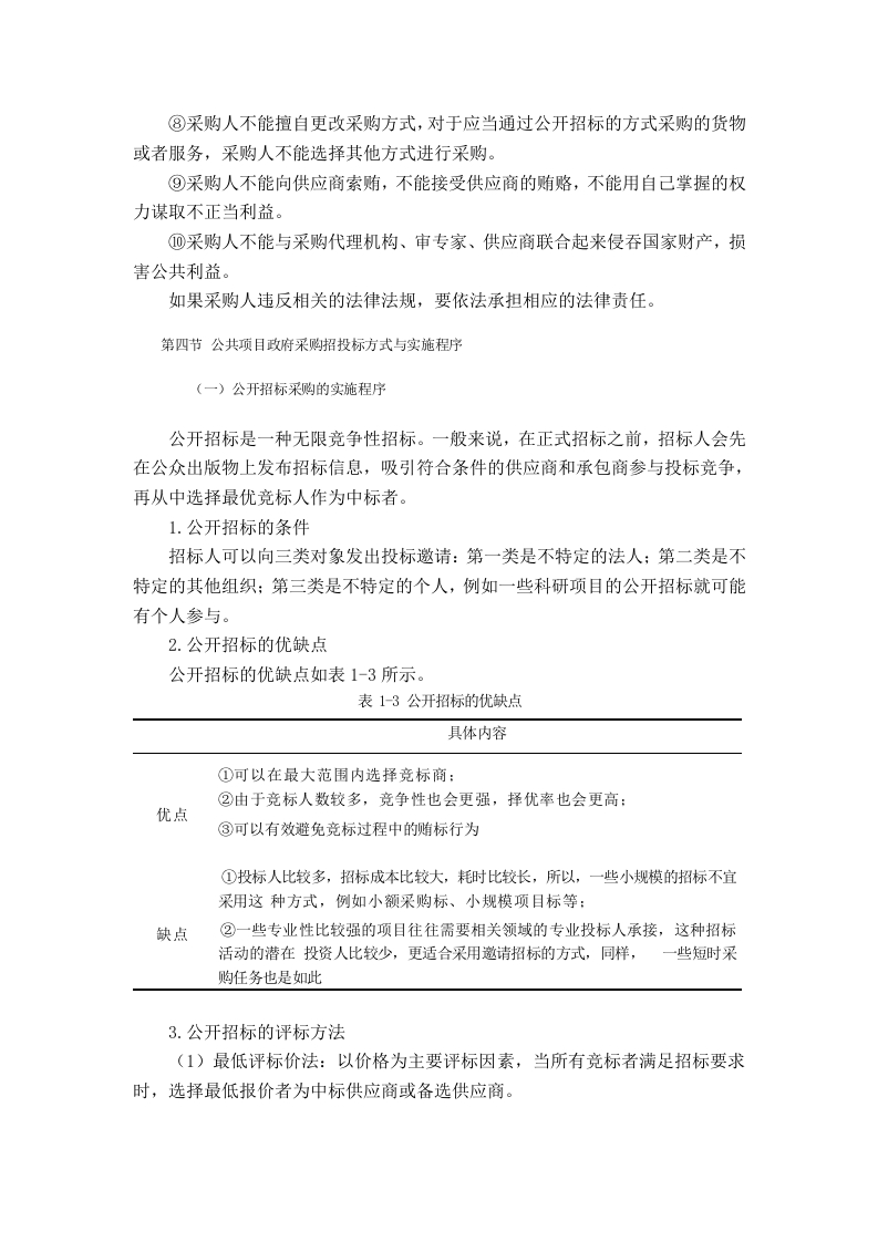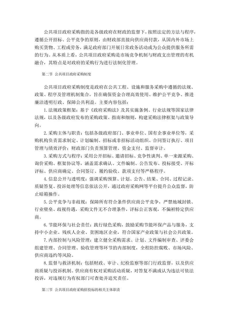 公共项目采购课件导语作为公共事业与基础设施建设的核心环节,项目采购不仅关乎资金的合理使用,更直接影响着公共服务的质量、社会公平以及政府公信力。公共项目采购课程的学习,旨在深入解析公共项目采购的全流程,探讨其面临的挑战与应对策略,以提升我国公共资源配置效率,推动阳光采购,实现公共利益最大化。知识目标1.明确公共项目政府采购的基本概念、原则、各种采购方式的适用条件、操作流程及优缺点:2.掌握重点讲授的项目需求分析与采购计划制定的方法与技巧,招标文件等文档编写能力,绩效评价的方法与流程及合同管理、变更、争议解决及风险防控策略:3.了解电子化采购平台的操作技能,采购风险管理,及成本分析等工具的应用。能力目标1.根据项目需求和市场状况,科学选择采购方式,制定合理的采购策略。2.在采购过程中,能够灵活运用专业知识和技能,做出有利于项目整体效益的决策。第一章公共项目采购招投标基本概述第一节公共项目采购的概念(一)公共项目采购公共项目采购是指政府部门、事业单位、公共组织(包括非营利的国有企业)在实施各类公共工程项目、提供公共服务或购置所需物资的过程中,按照法定程序和规定方式,从市场中选择合适的供应商或承包商,购买、租赁、外包或获取其他形式的货物、工程和服务的行为。这一过程旨在确保以透明、公正、竞争的方式高效使用公共资金,实现项目目标,同时兼顾经济效益、社会效益和环境效益。(二)公共项目政府采购公共项目政府采购指的是各级政府在财政的监督下,按照法定的方法与程序,遵循公开招标、公平竞争的原则,由财政部直接向供应商付款,从国内外市场上购买货物、工程或劳务,满足政府部门开展日常政务活动或为公众提供服务所需的行为。从本质上看,公共项目政府采购是市场竞争机制与财政支出管理的有机融合,其特点是对政府的采购行为进行法制化管理。第二节公共项目政府采购制度公共项目政府采购制度是政府在公共工程、设施和服务采购中遵循的法规、政策、程序及管理机制集合,旨在确保资金合理高效使用、维护公平竞争、推进廉洁透明行政、保障公共利益。主要内容包括:1.法规政策框架:基于《政府采购法》及其实施条例、行业法规等国家法律法规,以及各级政府发布的采购政策、指南和细则,构建采购法律框架与政策导向。2.采购主体与职责:包括各级政府部门、事业单位、国有企事业单位等,采购机构负责需求制定、计划编制、招标或非招标活动组织、合同签订执行、项目管理与绩效评价:财政部门负责预算管理、资金支付、监督审计。3.采购方式与程序:采用公开招标、邀请招标、竞争性谈判、单一来源采购、询价采购、框架协议等,涵盖需求确认、文件编制、公告发布、投标接受、开标评标、供应商确定、合同签订、履约验收、款项支付等严格程序。4.信息公开与透明度:强调采购预算、计划、公告、结果、合同、过程记录、质疑答复、投诉处理等信息依法公开,通过政府采购网等平台提升公众监督,防止暗箱操作。5.公平竞争与非歧视:保障所有符合条件供应商公平竞争,严禁地域封锁、行业壁垒、歧视待遇,采购文件无不合理条件,评标公正客观,不偏祖特定供应商。6.节能环保与社会责任:践行绿色采购,鼓励采购节能环保产品与服务,支持中小企业、残疾人企业、贫困地区企业,符合国家产业政策与社会公共政策。7.内部控制与风险管理:建立健全采购需求、计划、文件编制审查、评委会组建管理、合同管理、验收管理等环节的内部制度,全程防控腐败、市场风险、供应商违约等风险。8.监督与救济机制:包括财政、审计、纪检监察等部门行政监督,以及供应商质疑与投诉机制。供应商有权对采购活动质疑,对答复不满或认为违法可依法投诉,对违规行为有权部门可查处并追究责任。第三节公共项目政府采购招投标的相关主体职责(一)公共项目政府采购的类型政府采购的类型划分大致包括六种方式,如图1-1所示。贵物采购政府采购机构直接组织的采购梦与程度采斯对象了程采购委托投招标机构采购服务采购集中采购集中程度分做采购供应离所在炮国际招标采购攻莉采购的英轻国内招标采购半集中半分敝采购传统采购采均手段单阶段招标采购招标阶段现代采购两阶段招标采购图1-1政府采购的类型(二)公共项目政府采购管理基本原则根据《政府采购法》规定,政府采购原则有四条,分别是公开透明原则、公平竞争原则、公正原则、诚实信用原则。1.公开透明原则政府采购的全过程必须贯彻公开透明的原则,具体表现在三个方面,如表1-1所示。表1-1公开透明原则的三大内容内容具体表现政府采购应该公开的信息包括政府采购的法规政策,省级以上人民政府公布的集中采购目录、政府采购限额标准和公开招标数额标准,政府采公开的内容购招标业务代理机构名录,招标投标信息,财政部门受理政府采购投诉的联系方式及投诉处理决定,财政部门对集中采购机构的考核结果,采购代理机构、供应商不良行为记录名单等政府采购信息公开应该遵循四大标准,分别是内容真实、准确可靠、发公开的标准布及时、便于查找公开的途径政府采购信息应该通过省级以上财政部门指定的媒体面向全社会公开发布2.公平竞争原则公平竞争原则