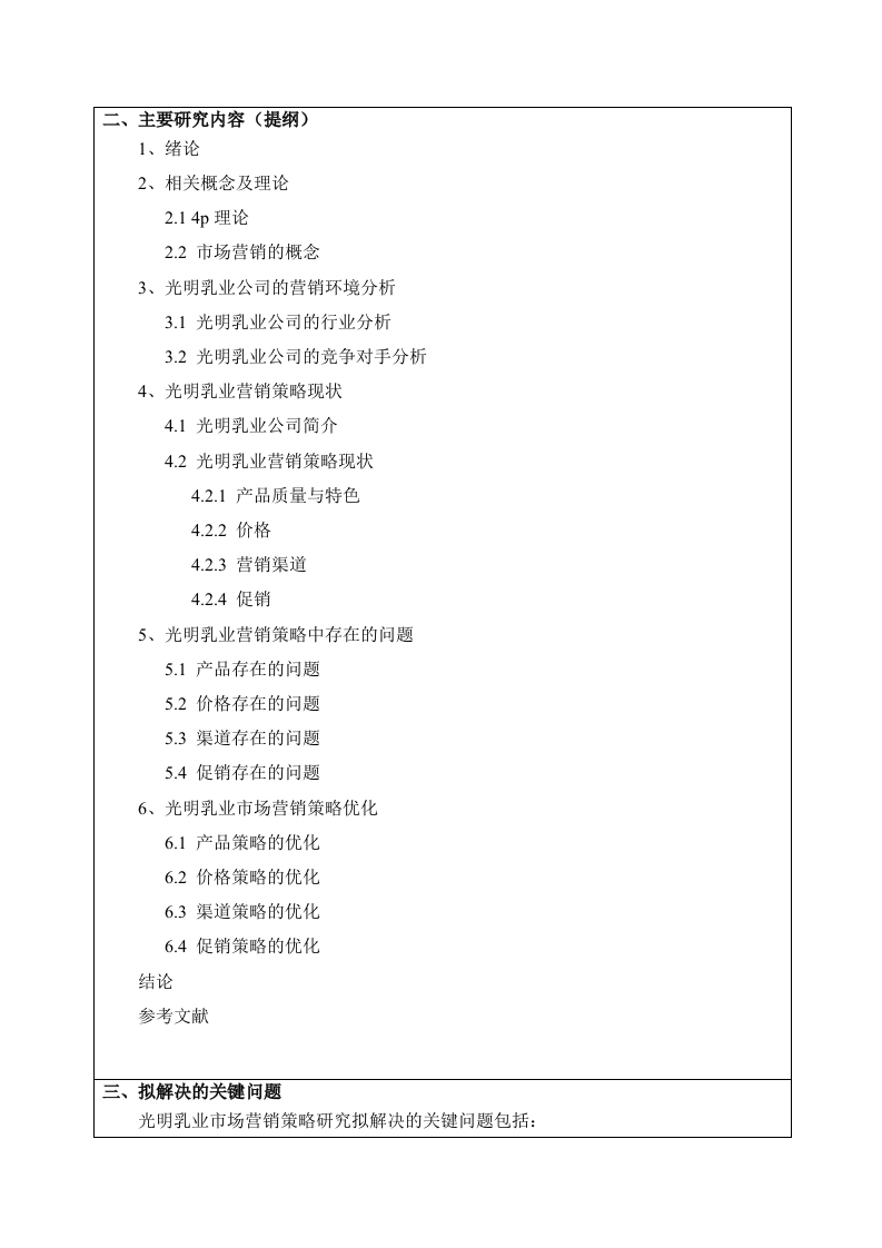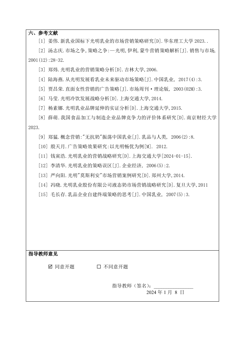 上海第二工业大学继续教育学院本科毕业设计(论文)开题报告论文题目光明乳业市场营销策略研究学院继续教育学院教学点专业班级姓名学号一、研究目的和意义研究目的:光明乳业市场营销策略研究的目的包括以下几点:①分析市场环境:了解光明乳业所处的市场环境,包括政策法规、经济形势、社会文化等方面的影响因素,以便为公司制定适应市场环境的营销策略。②研究消费者需求:通过调查和分析消费者的需求、喜好和购买行为,为光明乳业提供产品开发、品牌定位和营销渠道等方面的参考依据。③评估竞争态势:分析同行业竞争对手的实力、市场占有率和营销策略等,以便光明乳业能够在竞争中找到自己的优势和不足,制定有针对性的营销策略。④制定营销策略:根据市场环境、消费者需求和竞争态势,为光明乳业制定产品策略、价格策略、渠道策略和促销策略等,以提高公司的市场竞争力和市场份额。⑤优化营销体系:通过对市场营销策略的研究,帮助光明乳业优化其营销组织结构、流程和资源配置,提高营销效率和效果。总之,光明乳业市场营销策略研究的目的是为了帮助公司在不断变化的市场环境中,找到适合自己的营销策略,提高市场竞争力和盈利能力。研究意义:结合消费者购买行为分析,探索乳制品营销的关键要素,提出有针对性的建议,为光明乳业完善营销策略提供有益借鉴。通过分析乳业新国标对乳制品企业的生产营销行为、对消费者的购买行为的影响,结合消费者调查,研究乳制品国家标准的发展趋势。二、主要研究内容(提纲)1、绪论2、相关概念及理论2.14p理论2.2市场营销的概念3、光明乳业公司的营销环境分析3.1光明乳业公司的行业分析3.2光明乳业公司的竞争对手分析4、光明乳业营销策略现状4.1光明乳业公司简介4.2光明乳业营销策略现状4.2.1产品质量与特色4.2.2价格4.2.3营销渠道4.2.4促销5、光明乳业营销策略中存在的问题5.1产品存在的问题5.2价格存在的问题5.3渠道存在的问题5.4促销存在的问题6、光明乳业市场营销策略优化6.1产品策略的优化6.2价格策略的优化6.3渠道策略的优化6.4促销策略的优化结论参考文献三、拟解决的关键问题光明乳业市场营销策略研究拟解决的关键问题包括:1、产品策略制定:如何根据市场环境和消费者需求,为光明乳业制定合适的产品策略,包括产品种类、品质、包装和创新等方面?2、价格策略制定:如何根据产品成本、市场供求和竞争态势等因素,为光明乳业制定合理的价格策略,以提高产品销售和市场占有率?3、渠道策略制定:如何根据光明乳业的产品特性和目标市场,选择和优化营销渠道,包括经销商、零售商和电商平台等?4、促销策略制定:如何根据市场环境和消费者需求,为光明乳业制定有效的促销策略,包括广告、促销活动和公关活动等?通过解决以上关键问题,光明乳业市场营销策略研究能够帮助公司在不断变化的市场环境中,找到适合自己的营销策略,提高市场竞争力和盈利能力。四、主要研究方法与思路本文通过理论学习和资料文献的研究,在分析企业数据、现状和进行相关调研的的基础上,运用相关的市场营销理念,结合天润乳业的实际情况,对企业的营销环境进行分析,就天润乳业对目标市场的选择和营销策略的优化,给出自己的建议。五、论文进程安排序号各阶段安排起止日期备注1论文定趣,接受《毕业设计(论文)任务书》2023年秋季学期第15周2搜集资料,撰写《毕业设计(论文)开趣报告》2023年秋季学期第17周3设计、调研及撰写毕业设计(论文)2024年春季学期第1-7周4撰写《毕业设计(论文)中期检查表》2024年春季学期第8周5修改毕业〔设计)论文2024年春季学期第910周6毕业(设计)论文定稿、查重2024年春季学期第11周7毕业设计〔论文)答辩2024年春季学期第14周8上传及汇总论文相关资料2024年秋季学期第16周六、参考文献[1]姜伟.新乳业国标下光明乳业的市场营销策略研究[D].华东理工大学2023.·[2]汤志庆.市场之争,策略之争:一光明,伊利,蒙牛营销策略解析[J].销售与市场,2001(12):28-32.[3]郑炜.光明乳业的营销策略分析[D].吉林大学,2006.[4]陆海燕.从光明发展看乳业未来驱动市场策略[J].中国乳业,2017(4):3.[5]贾昌荣.直面女性营销的广告策略[J].市场周刊·理论版,2003(020:3.[6]马莹.光明冷饮发展战略分析[D].上海交通大学,2014.[7]杨素娜.光明乳业品牌延伸的实证分析[D].上海交通大学,2015,[8]薛萌.我国食品加工与制造企业品牌竞争力的评价体系研究[D].南京财经大学2023.[9]郑猛.概念营销:“无抗奶"振荡中国乳业[J].乳品与人类,2006(2):8.[10]殷天月.广告策略效果研究:以光明畅优为例[M.2012.[11]钱寅浩.光明乳业的营销战略研究[D].上海交通大学[2024-01-15].[12]李清华.光明乳业的策略误区[J].企业经济,2006(⑤):2.[13]严向阳.光明“莫斯利安"市场营销案例研究[D].郑州大学,2014.[14]冯晓.光明乳业股份有限公司液态奶市场营销战略研究[D].复旦大学,2011[15]毛长存.乳品企业自建终端策略的思考[J].中国乳业,2007(5):3.指导教师意见☑同意开题口不同意开题指导教师(签名):2024年1月8日