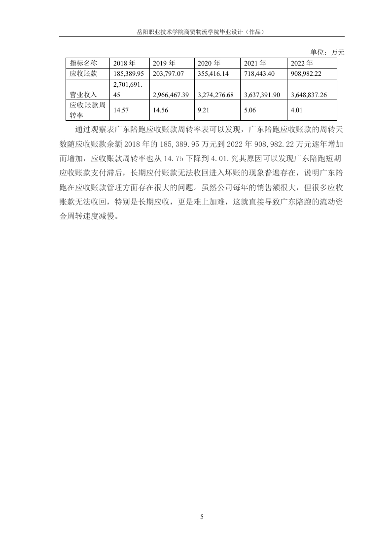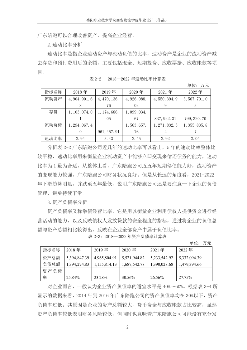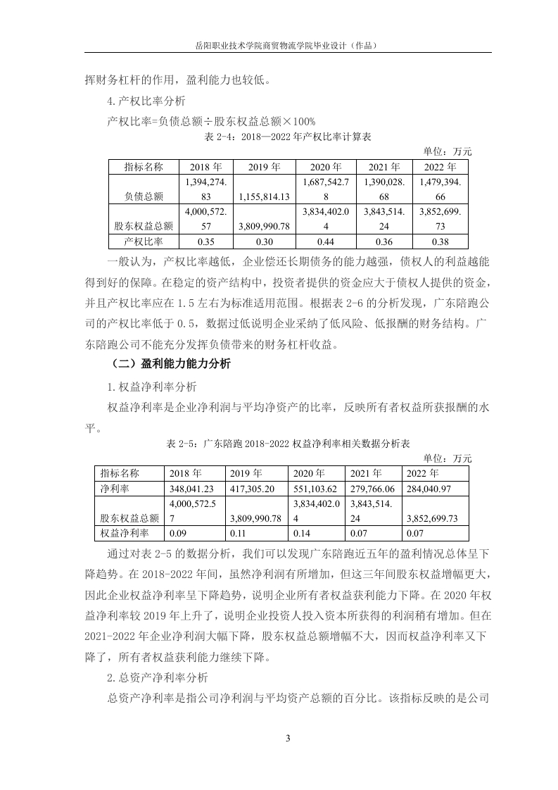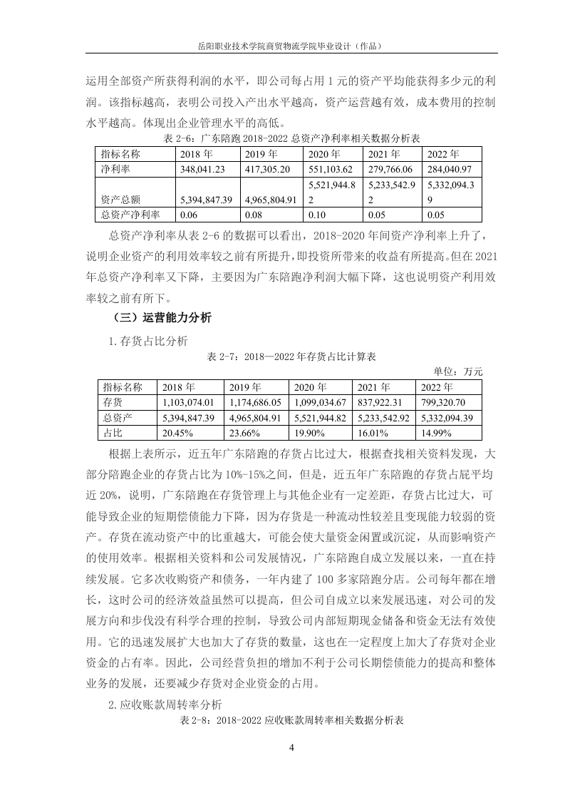 目录一、公司简介..1二、财务报表分析...(一)偿债能力分析1(二)盈利能力能力分析3(三)运营能力分析......三、分析结果及建议......6(一)广东陪跑财务报表分析存在问题6(二)优化广东陪跑财务报表对策.....6参考文献…9广东陪跑公司财务分析报告姓名一、公司简介广东陪跑公司成立于2009年12月21日,注册地位于广州市番禺区钟村街汉溪村(汉溪商业中心)泽溪街9号1801、1901写字楼。自成立以来,广东陪跑公司已获得星柚资本3000万天使轮融资和AD-VC投资基金A轮1亿元投资,并受到多家大型资本的追捧。作为全国技术领先的企业服务平台、高校合作单位、政府关注企业、准上市企业、高新技术企业和中国联通战略伙伴,陪跑兔正在改变企业服务行业的格局。在未来的发展中,广东陪跑公司将继续秉持创新、专业、服务的核心价值观,为企业提供更优质、更全面的服务。他们相信只有通过不断创新和改进,才能更好地满足商家和客户的需求。同时,陪跑兔还将不断拓展合作伙伴关系和跨界合作机会,为商家打造更多元化、更具影响力的品牌传播和增长方式。二、财务报表分析(一)偿债能力分析1.流动比率分析流动比率是流动资产对流动负债的比率,用来衡量企业流动资产在短期债务到期以前,可以变为现金用于偿还负债的能力。一般说来,比率越高,说明企业资产的变现能力越强,短期偿债能力亦越强:反之则弱。一般认为流动比率应在2:1以上。表2-1:2018一2022年流动比率计算表单位:万元指标名称2018年2019年2020年2021年2022年流动资产4,904,901.64470,136.74.926.088.04,550,394862.993,567,701.03流动负债1,294,067.41,563,657.71,271,8320961,457.916.521,355,835.87流动比率3.794.653.153.582.63根据表2-1可以看出,广东陪跑公司几年的流动比率上下波动在2.60-4.65之间,最高的2019年流动比率为4.65,最低是2.63,流动比率一般标准值为2。从总体上看,广东陪跑公司整体比率比较高,说明广东陪跑公司流动比率还是比较好的,短期偿债能力比较强,但是较高的流动比率也会影响到广东陪跑的经营,所以岳阳职业技术学院商贸物流学院毕业设计(作品)广东陪跑可以合理改善资产,提高企业经营。2.速动比率分析速动比率是指企业速动资产与流动负债的比率,速动资产是企业的流动资产减去存货和预付费用后的余额,主要包括现金、短期投资、应收票据、应收账款等项目。表2-22018一2022年速动比率计算表单位:万元指标名称2018年2019年2020年2021年2022年流动资产4.904.901.64,470.136.4.926.088.4,550.394.93.567.701.0876029存货1.103.074.01,174,686.1.099.034.0567837,922.31799,320.70流动负债1.294.067.41.563.6571,271,832.51,355,835.80961,457.917627速动比率2.943.432.452.922.04分析表2-2广东陪跑公司近几年的速动比率可以看出,5年的速动比率整体比较平稳,速动比率用来衡量企业流动资产中能够立即变现来偿还债务的能力,速动比率为1最为合适,从整体上看,广东陪跑公司近五年短期偿债能力好,流动资产的变现能力较强,广东陪跑公司财务状况良好。但是从长远的角度看,2021-2022年下滑趋势明显,并跌至五年最低,说明广东陪跑公司还是要注意一下企业的负债管理,避免持续下滑。3.资产负债率分析资产负债率又称举债经营比率,它是用以衡量企业利用债权人提供资金进行经营活动的能力,以及反映债权人发放贷款的安全程度的指标,通过将企业的负债总额与资产总额相比较得出,反映在企业全部资产中属于负债比率。表2-3:2018-一2022年资产负债率计算表单位:万元指标名称2018年2019年2020年2021年2022年资产总额5,394,847.394.965.804.915,521,944.825,233,542.925.332.094.39负债总额1,394,274.831,155,814.131,687,542.781,390,028.681,479,394.66资产负债率25.84%23.28%30.56%26.56%27.75%对企业而言,一般认为企业资产负债率的适宜水平是40%~60%。根据表3-4所显示的数据来看,2014年到2016年广东陪跑公司的资产负债率均在30%以下,资产负债率过低。其原因是企业的资产总额较大,货币资金与应收账款占比较高,虽然资产负债率较低表明财务风险较低,但同时也意味着广东陪跑公司可能没有充分发2岳阳职业技术学院商贸物流学院毕业设计(作品)挥财务杠杆的作用,盈利能力也较低。4.产权比率分析产权比率=负债总额÷股东权益总额×100%表2-4:2018一2022年产权比率计算表单位:万元指标名称2018年2019年2020年2021年2022年1394.274.1,687,542.71,390,0281.479.394.负债总额831,155,814.13868664.000.5723.834.402.03843.514.3.852.699.股东权益总额573.809.990.7842473产权比率0.350.300.440.360.38般认为,产权比率越低,企业偿还长期债务的能力越强,债权人的利益越能得到好的保障。在稳定的资产结构中,投资者提供的资金应大于债权人提供的资金,并且产权比率应在1.5左右为标准适用范围。根据表26的分析发现,广东陪跑公司的产权比率低于0.5,数据过低说明企业采纳了低风险、低报酬的财务结构。广东陪跑公司不能充分发挥负债带来的财务杠杆收益。(二)盈利能力能力分析1.权益净利率分析权益净利率是企业净利润与平均净资产的比率,反映所有者权益所获报酬的水平表2-5:广东陪跑2018-2022权益净利率相关数据分析表单位:万元指标名称2018年2019年2020年2021年2022年净利率348.041.23417305.20551,103.62279,766.06284.040.974.000.572.53.834.402.03.843.514股东权益总额73.809.990.784243.852.699.73权益净利率0.090.110.140.070.07通过对表2-5的数据分析,我们可以发现广东陪跑近五年的盈利情况总体呈下降趋势。在