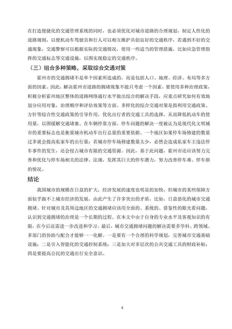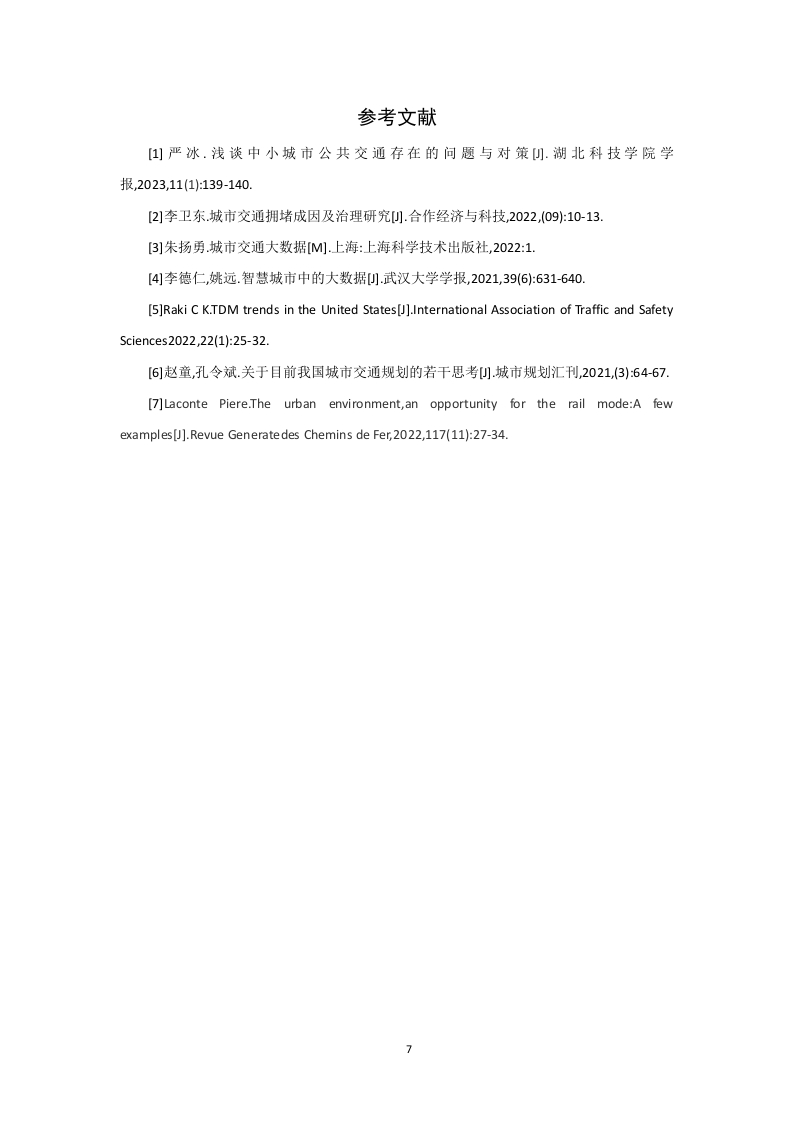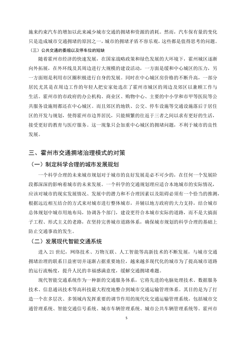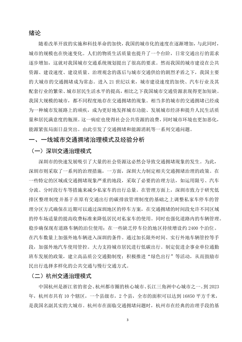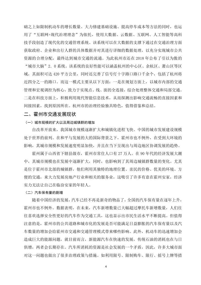 缓解霍州市交通拥堵问题研究目录摘要。,。。。。2绪论3一、一线城市交通拥堵治理模式及经验分析......3(一)深圳交通治理模式……………3(二)杭州交通治理模式.二、霍州市交通发展现状......4(一)城市规模的扩大以及周边城镇群的增加.…………·4(二)汽车保有量的刷增...·4(三)公共交通的萎缩以及停车位的短缺...........5三、霍州市交通拥堵治理模式的对策.....0…5(一)制定科学合理的城市发展规划..5(二)发展现代智能交通系统.....(三)组合多种策略,采取综合交通对策6结论参考文献.…71摘要随着改革开放的快速推进,我国的城市化进程也在迅猛发展,这主要表现为城市规模的扩大,数量的增加,农村人口向城市的转移以及交通运输网的建设,此外,汽车保有量和驾驶员的数量也在随着城市化而逐年增加。这就出现了许多城市问题,其中,较为突出的是城市交通的拥堵问题,造成交通拥堵的因素有很多。如人口,汽车保有量,城市道路的规划以及城市交通管理部门的治理手段等。这些因素造成了中国许多大中型城市的不同程度的交通拥堵问题。随着城市交通问题的突出,对城市居民的生活和工作产生了不好的影响,还会对城市经济和城市居住环境造成冲击。因此,解决目前许多城市所面临的交通问题的关键就在于能否找到一个行之有效的城市交通拥堵治理摸式关键词:城市交通:拥堵:治理模式:2绪论随着改革开放的实施和科技革命的加快,我国的城市化的速度在逐渐增加,与此同时,城市的规模也在快速变化。人们的物质生活质量也提升了一个台阶,日常交通出行的需求逐步增加,这就对我国城市交通系统规划提出了很高的要求。然而我国的城市建设在公共资源、建设速度、建设质量、治理观念的落后与城市交通供给的剧烈矛盾之下,我国主要的大城市的交通拥堵成为常态。进入21世纪以来,城市建设速度的加快、汽车行业及其配套行业的繁荣、城市居民生活水平的提高,相比之下我国城市交通资源表现得更加短缺。我国大规模的城市,都不同程度地存在交通拥堵的现象。相当多的城市的交通拥堵已经成为一种城市发展路上的顽疾,成为更好地发挥城市功能、发展城市经济和提升人民生活质量和居民满意度的瓶颈。这一病症也使得社会公共资源的浪费,同时城市环境也更加恶化,能源紧张局面日益突出。由此引发了交通拥堵和能源消耗等一系列交通问题。一、一线城市交通拥堵治理模式及经验分析(一)深圳交通治理模式深圳市的快速发展吸引了大量的社会资源这必然会导致交通拥堵现象的发生。为此,深圳市则采取了一系列的治理措施,一方面,深圳大力制定相关交通拥堵治理的政策。在一些特定的区域或交通拥堵现象严重的地段,采取了必要的治理方法,如运用限号、汽车分流、分时段行车等措施来减少私家车的出行总量。在管理方面上,深圳市致力于研究低排区整理制度并基于在原有交通出行的碳排放管理制度的基础之上调整私家车停车的管理分区方式确保在近期可以通过深圳地区的停车方案,在交通拥堵的时间段允许不同区域的停车场适量的提高收费标准来降低居民对私家车的使用。同时也强化道路内的车辆管理。稳步确保现有道路车辆的泊位使用:在一些缺乏停车位的地区持续增设约2400个泊位。在汽车数量上加强外地车辆进入深圳的条件。通过加长限外时间、实行外地车辆管控等手段,加强外地汽车使用管控。大力支持城市居民进行低碳出行。制定促进企事业单位通勤班车发展的政策,建立高品质公交通勤制度:积极推进“绿色出行”等活动,从而鼓励市民出行选择多样化的公共交通与慢行交通方式。(二)杭州交通治理模式中国杭州是浙江省的省会、杭州都市圈的核心城市、长江三角洲中心城市之一。到2023年,杭州市共有10个辖区,一个县级市,2个县,全市的面积可以达到16850平方千米,是我国名副其实的大城市。杭州市在面临交通拥堵问题时,杭州市在经典的治理手段的基3础之上如限制机动车的增长数量、大力修建基础设施、提高停车成本等方法的同时,也运用了“互联网+现代治理理念”为依托,使用大数据、云数据、互联网、人工智能等高科技手段创造了现代化的交通管理系统。该系统可以在大数据的支撑下通过在交通治理方面获取政府、企业和出行人群的具体数据并对其进行详细的数据处理,以充分实现城市公共资源的合理分配,最终达到城市交通的流通。为此杭州市还在2018年公布了引以为傲的“城市大脑”2.0系统。该系统的良好性能可以涵盖杭州的中心区、余杭区、萧山区等区域,其面积可达420平方公里,同时还完善了信号灯十字路口路口千余个,包括了杭州将近四分之一的路口。而这一模式主要从以下方面:一是在规划方面上,以城市内部的交通管理和宏观调控为核心,致力于实现点、线、面的全连接,综合处理整体交通和局部交通。二是在科技方面上,积极利用现代智能信息技术,从而探测出影响交通流畅的直接因素和间接因素,找到原因所在。杭州市的治理经验独具特色,值得借鉴和总结。二、霍州市交通发展现状(一)城市规模的扩大以及周边城镇群的增加自改革开放来,我国城市规模逐渐扩大和城镇化进程飞快。中国的城市发展建设规模处于世界的前列。在和平与发展的大的国际背景之下,霍州市也不例外,在受到大环境的影