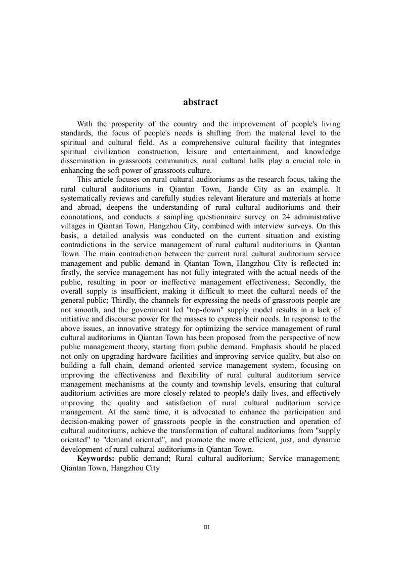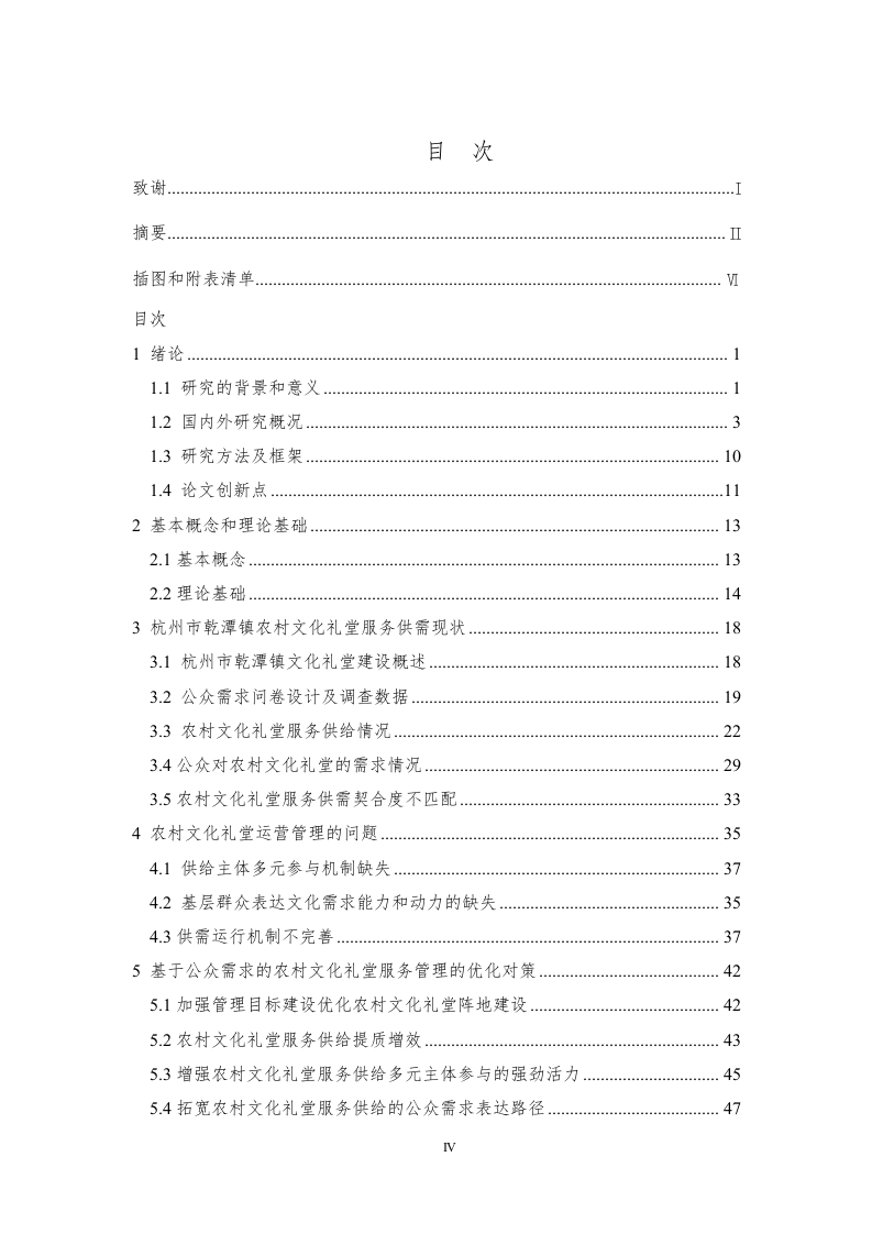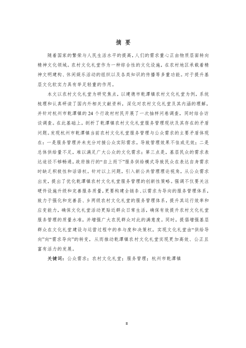 基于公众需求的农村文化礼堂服务管理提升研究一一以杭州市乾潭镇为例致谢行文至此,落笔为终。已经到了论文的结尾之处,也就意味着我的学习生活即将结束,在学校里面都是满满的回忆。在这充满活力的校园里面,留下了青春的岁月和满满的收获,纵使万般不舍,但仍心存感激。桃李不言,下自成蹊。在此,要特别感谢我的论文指导老师。在整个论文写作的过程中,从选题到定稿都给予了我悉心地指导,并且在标点符号和格式方面不厌其烦地帮助我。正是因为您的教诲和指导,本文才得以呈现。对此,我深表感激,同时也祝愿您工作一切顺利。也感谢教授我的每一位老师,他们每一位都有十分严谨的教学态度,对上课认真负责,培养我们的良好行为,让我学到了专业知识与技能。你们都是我人生道路上的榜样,祝各位老师身体健康,事事顺心。再者我要感谢我的家人。感谢家人一直以来对我的支持和鼓励。他们始终是我的坚强后盾,无论我遇到什么困难和挑战,他们总是在我身边给予我力量和支持。感谢他们对我的关爱和教育,让我成了今天的自己。未来的路还有很长,这一路的成长是我下一个阶段的铺垫,我永远会怀念少年时的我那个敢爱敢恨的我,只言片语道不尽,那就祝以上这些我爱的人永远平安喜乐。由于自身的专业水平的不足,对于论文中出现了很多错误与疏漏,恳请老师给予批评和指正。摘要随着国家的繁荣与人民生活水平的提高,人们的需求重心正由物质层面转向精神文化领域。农村文化礼堂作为一种综合性的文化设施,在农村地区承载着精神文明建构、休闲娱乐活动的组织以及各类知识的传播等多重功能。对于提升基层文化软实力具有举足轻重的作用。本文以农村文化礼堂为研究焦点,以建德市乾潭镇农村文化礼堂为例,系统梳理和认真研读了国内外相关文献资料,深化对农村文化礼堂及其内涵的理解,并针对杭州市乾潭镇的24个行政村村民开展了一次抽样问卷调查,同时结合访谈调查。在此基础上,剖析了乾潭镇农村文化礼堂服务管理现状及其存在的矛盾问题。发现杭州市乾潭镇当前农村文化礼堂服务管理与公众需求的主要矛盾体现在:一是服务管理并未充分对接公众实际需求,导致管理效果不佳或无效:二是总体供给量不足,难以满足广大公众的文化需求:第三点是,基层民众的需求表达途径不够畅通,政府推行的“自上而下”服务供给模式导致民众在表达自身需求时缺乏积极性和话语权。针对以上问题,引入新公共管理理论视角,从公众需求出发,提出了优化乾潭镇农村文化礼堂服务管理的创新性策略。强调不仅要关注硬件设施升级和完善服务质量,更要构建全链条、以需求为导向的服务管理体系,致力于强化和完善县、乡两级农村文化礼堂的服务管理体系,提升其运行效率和应变能力,确保文化礼堂活动更贴近群众日常生活,确保有效提升农村文化礼堂服务管理的质量水准,并增强广大农民群众对此的满意度。同时,提倡增强基层群众在文化礼堂建设与运营过程中的参与度和决策权,实现文化礼堂由“供给导向”向“需求导向”的转变,从而推动乾潭镇衣村文化礼堂实现更加高效、公正且富有活力的发展。关键词:公众需求;农村文化礼堂;服务管理;杭州市乾潭镇abstractWith the prosperity of the country and the improvement of people's livingstandards,the focus of people's needs is shifting from the material level to thespiritual and cultural field.As a comprehensive cultural facility that integratesspiritual civilization construction,leisure and entertainment,and knowledgedissemination in grassroots communities,rural cultural halls play a crucial role inenhancing the soft power of grassroots culture.This article focuses on rural cultural auditoriums as the research focus,taking therural cultural auditoriums in Qiantan Town,Jiande City as an example.Itsystematically reviews and carefully studies relevant literature and materials at homeand abroad,deepens the understanding of rural cultural auditoriums and theirconnotations,and conducts a sampling questionnaire survey on 24 administrativevillages in Qiantan Town,Hangzhou City,combined with interview surveys.On thisbasis,a detailed analysis was conducted on the current situation and existingcontradictions in the service management of rural cultural auditoriums in QiantanTown.The main contradiction between the current rural cultural auditorium servicemanagement and public demand in Qiantan Town,Hangzhou City is reflected in:firstly,the service management has not fully integrated with the actual needs of thepublic,resulting in poor or ineffective management effectiveness;Secondly,theoverall supply is insufficient,making it difficult to meet the cultural needs of thegeneral public;Thirdly,the channels for expressing the needs of grassroots people arenot smooth,and the government led "top-down"supply model results in a lack ofinitiative and discourse power for the masses to express their needs.In response to theabove issues,an
