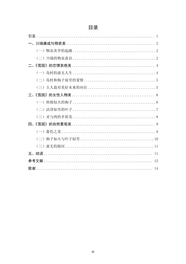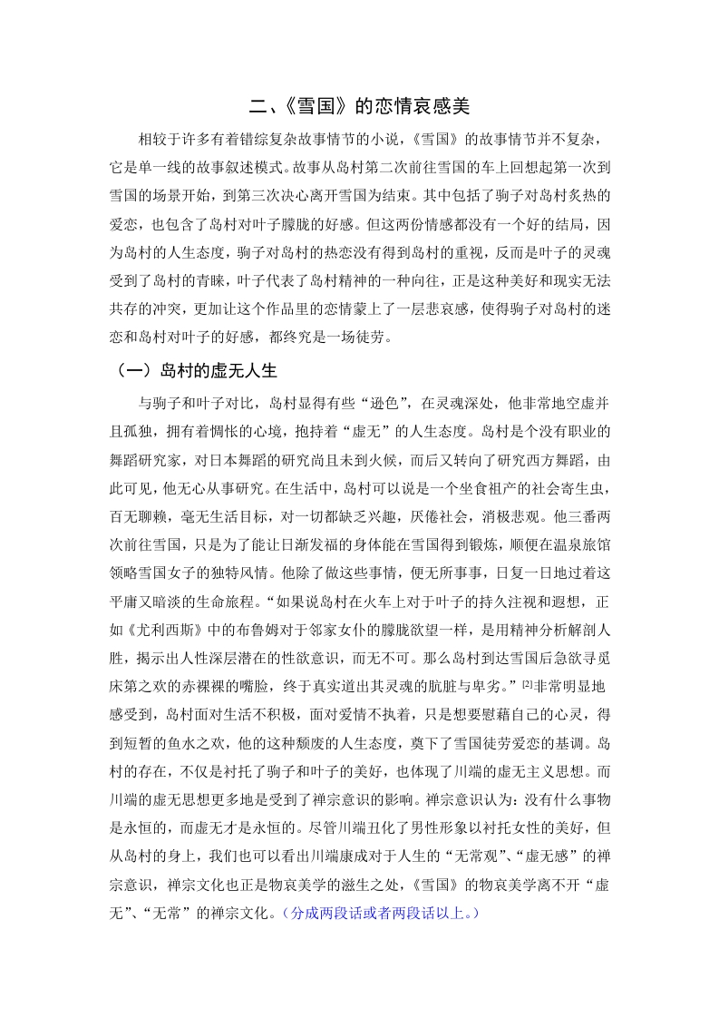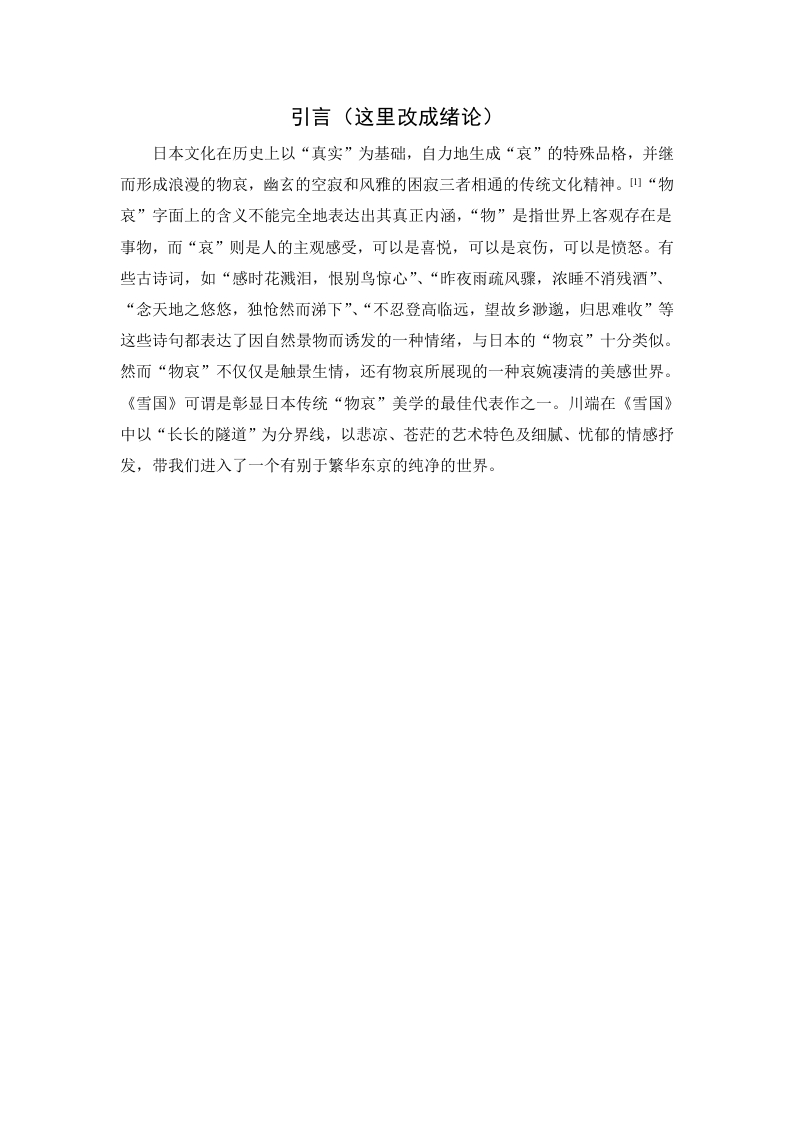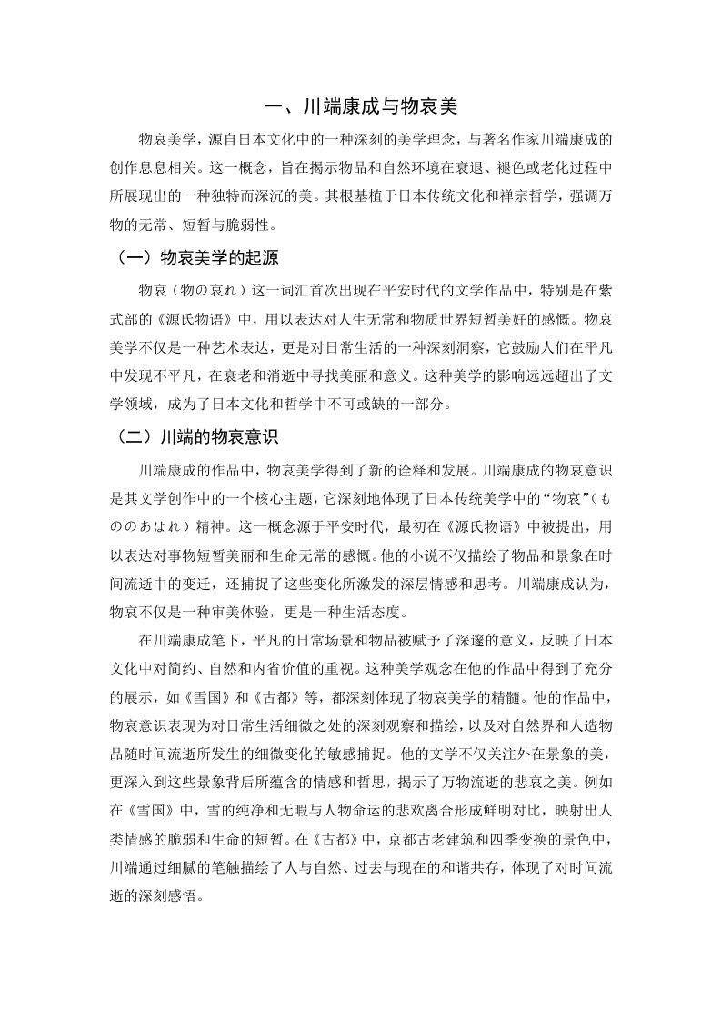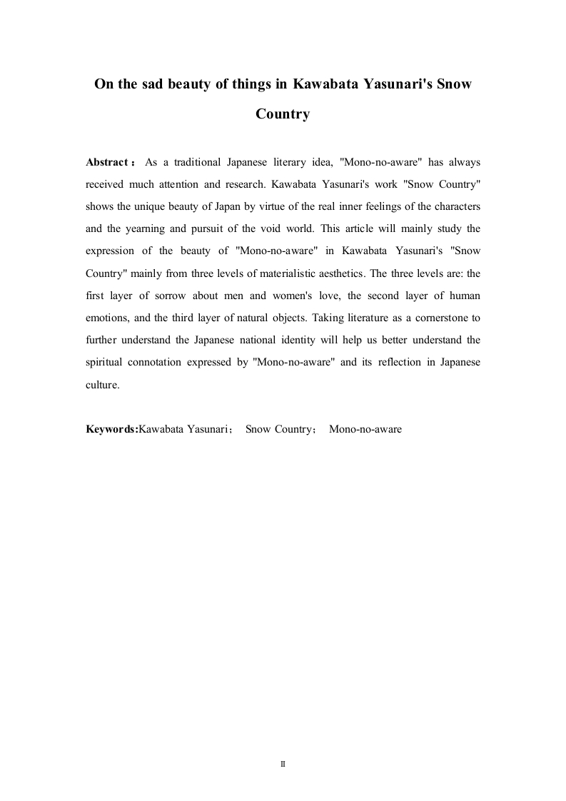 论川端康成《雪国》中的物哀美摘要:“物哀”作为日本传统的文学理念,一直以来备受人们的关注与研究。川端康成的作品《雪国》凭借人物真实的内心感受和对虚无世界的向往与追求,展现了日本独特之美。本文将主要从物哀美学的三个层次来研究川端康成《雪国》中“物哀”美的表达。这三个层次分别为:第一层关于男女恋情的哀感,第二层对人情世态的感动,第三层对自然物的感动。以文学为基石进一步了解日本民族特性,有助于我们更好地理解“物哀”所表达的精神内涵和其在日本文化中的体现。关键词:川端康成:雪国:物哀On the sad beauty of things in Kawabata Yasunari's SnowCountryAbstract As a traditional Japanese literary idea,"Mono-no-aware"has alwaysreceived much attention and research.Kawabata Yasunari's work "Snow Country"shows the unique beauty of Japan by virtue of the real inner feelings of the charactersand the yearning and pursuit of the void world.This article will mainly study theexpression of the beauty of "Mono-no-aware"in Kawabata Yasunari's "SnowCountry"mainly from three levels of materialistic aesthetics.The three levels are:thefirst layer of sorrow about men and women's love,the second layer of humanemotions,and the third layer of natural objects.Taking literature as a cornerstone tofurther understand the Japanese national identity will help us better understand thespiritual connotation expressed by "Mono-no-aware"and its reflection in Japaneseculture.Keywords:Kawabata Yasunari;Snow Country:Mono-no-aware目录引言…一、川端康成与物哀美....2(一)物哀美学的起源(二)川端的物哀意识...….2二、《雪国》的恋情哀感美..。4(一)岛村的虚无人生..(二)岛村和驹子徒劳的爱情.(三)主人翁对美好未来的向往..三、《雪国》的女性人物美6(一)热情似火的驹子....…6(二)洁净如雪的叶子....0.7(三)灵与肉的矛盾美...四、《雪国》的自然景观美...9(一)暮色之美.……9(二)驹子如火与叶子似雪10(三)虚无的银河...11五、结语..11参考文献..12致谢.........14引言(这里改成绪论)日本文化在历史上以“真实”为基础,自力地生成“哀”的特殊品格,并继而形成浪漫的物哀,幽玄的空寂和风雅的困寂三者相通的传统文化精神。山“物哀”字面上的含义不能完全地表达出其真正内涵,“物”是指世界上客观存在是事物,而“哀”则是人的主观感受,可以是喜悦,可以是哀伤,可以是愤怒。有些古诗词,如“感时花溅泪,恨别鸟惊心”、“昨夜雨疏风骤,浓睡不消残酒”、“念天地之悠悠,独怆然而涕下”、“不忍登高临远,望故乡渺邈,归思难收”等这些诗句都表达了因自然景物而诱发的一种情绪,与日本的“物哀”十分类似。然而“物哀”不仅仅是触景生情,还有物哀所展现的一种哀婉凄清的美感世界。《雪国》可谓是彰显日本传统“物哀”美学的最佳代表作之一。川端在《雪国》中以“长长的隧道”为分界线,以悲凉、苍茫的艺术特色及细腻、忧郁的情感抒发,带我们进入了一个有别于繁华东京的纯净的世界。
