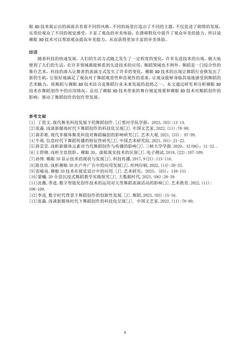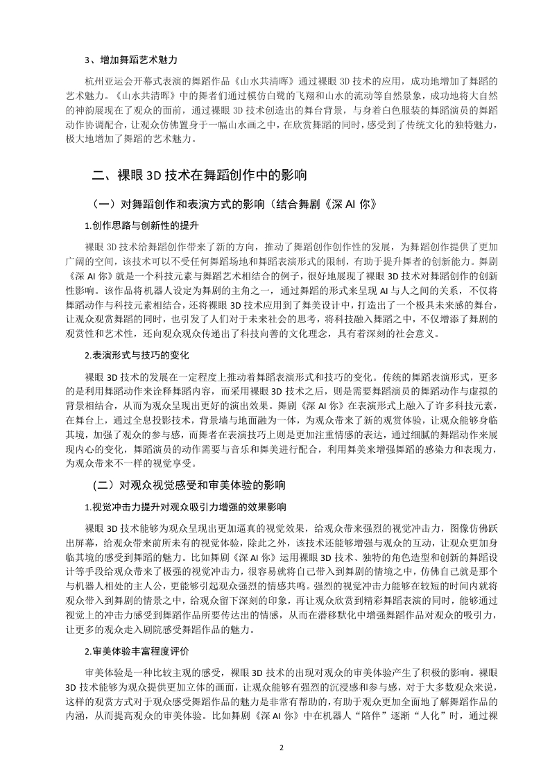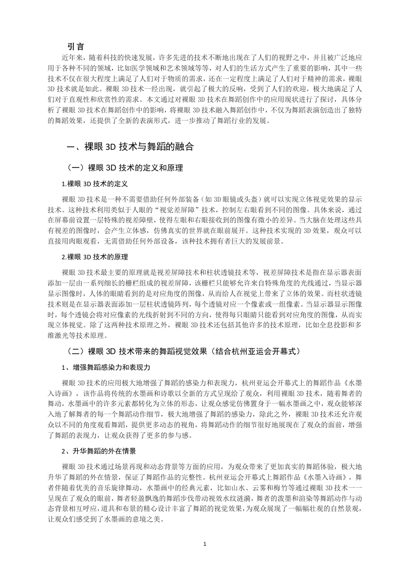裸眼3D技术在舞蹈创作中的应用×XX学院××X专业XXX(学号)XXX(姓名)指导教师X××【摘要】随着科技的不断发展,人们的生活水平有了明显地提高,并且生活方式也发生了很大的改变。为了满足人们对物质和精神的需求,许多先进的技术得到了很好地应用和推广,裸眼3D技术就是其中的一个典型代表。裸眼3D技术的发展给舞者创作舞端提供了更多的可能性和想象空间。本文通过阐迷裸眼3D技术在舞端创作中的应用,总结出了裸眼3D技术对舞端创作的影响,希望推动舞端创作的发展,为裸眼3D技术在舞端创作中的应用提供更多的理论依据。【关键词】裸眼3D技术:舞蹈:创作The application of naked eye 3D technology in dance creationAbstract:With the continuous development of technology,people's living standards have significantly improved,andtheir lifestyles have also undergone significant changes.In order to meet people's material and spiritual needs,many advancedtechnologies have been well applied and promoted,and naked eye 3D technology is a typical representative of them.Thedevelopment of naked eye 3D technology provides dancers with more possibilities and imaginative space to create dance.Thisarticle elaborates on the application of naked eye 3D technology in dance creation,summarizes the impact of naked eye 3Dtechnology on dance creation,and hopes to promote the development of dance creation,providing more theoretical basis for theapplication of naked eye 3D technology in dance creation.Keywords:Bare eye 3D technology;Dance;Creation目录引言.1一、裸眼3D技术与舞蹈的融合1(一)裸眼3D技术的定义和原理..11.裸眼3D技术的定义12.裸眼3D技术的原理.。1(二)裸眼3D技术带来的舞蹈视觉效果(结合杭州亚运会开幕式)·.11、增强舞蹈感染力和表现力…12、升华舞蹈的外在情景…13、增加舞蹈艺术魅力…2二、裸眼3D技术在舞蹈创作中的影响。2(一)对舞蹈创作和表演方式的影响(结合舞剧《深AI你》21.创作思路与创新性的提升.…22.表演形式与技巧的变化.…2(二)对观众视觉感受和审美体验的影响.。21.视觉冲击力提升对观众吸引力增强的效果影响。22.审美体验丰富程度评价…2结语…3参考文献…3引言近年来,随着科技的快速发展,许多先进的技术不断地出现在了人们的视野之中,并且被广泛地应用于各种不同的领域,比如医学领域和艺术领域等等,对人们的生活方式产生了重要的影响,其中一些技术不仅在很大程度上满足了人们对于物质的需求,还在一定程度上满足了人们对于精神的需求,裸眼3D技术就是如此。裸眼3D技术一经出现,就引起了极大的反响,受到了人们的欢迎,极大地满足了人们对于直观性和欣赏性的需求。本文通过对裸眼3D技术在舞蹈创作中的应用现状进行了探讨,具体分析了裸眼3D技术在舞蹈创作中的影响,将裸眼3D技术融入舞蹈创作中,不仅为舞蹈表演创造出了独特的舞蹈效果,还提供了全新的表演形式,进一步推动了舞蹈行业的发展。一、裸眼3D技术与舞蹈的融合(一)裸眼3D技术的定义和原理1.裸眼3D技术的定义裸眼3D技术是一种不需要借助任何外部装备(如3D眼镜或头盔)就可以实现立体视觉效果的显示技术。这种技术利用类似于人眼的“视觉差屏障”技术,控制左右眼看到不同的图像。具体来说,通过在屏幕前设置一层特殊的视差障壁,使得左眼和右眼接收到的图像有微小的差异。当大脑在处理这些具有视差的图像时,会产生立体感,仿佛真实的世界就在眼前展开。这种技术实现的3D效果,观众可以直接用肉眼观看,无需借助任何外部设备,该种技术拥有者巨大的发展前景。2.裸眼3D技术的原理裸眼3D技术最主要的原理就是视差屏障技术和柱状透镜技术等,视差屏障技术是指在显示器表面添加一层由一系列细长的栅栏组成的视差屏障,该栅栏只能够允许来自特殊角度的光线通过,当显示器显示图像时,人体的眼睛看到的是对应角度的图像,从而给人在视觉上带来了立体的效果。而柱状透镜技术则是在显示器表面添加一层柱状透镜阵列,每个透镜对应一个像素或一组像素。当显示器显示图像时,每个透镜会将对应像素的光线折射到不同的方向,使得每只眼睛只能看到对应角度的图像,从而实现立体视觉。除了这两种技术原理之外,裸眼3D技术还包括其他许多的技术原理,比如全息投影和多维激光等技术原理。(二)裸眼3D技术带来的舞蹈视觉效果(结合杭州亚运会开幕式)1、增强舞蹈感染力和表现力裸眼3D技术的应用极大地增强了舞蹈的感染力和表现力,杭州亚运会开幕式上的舞蹈作品《水墨入诗画》,该作品将传统的水墨画和诗歌以全新的方式呈现给了观众,利用裸眼3D技术,随着舞者的舞动,水墨画中的许多元素都转化为立体的形态,让观众感觉仿佛置身于一幅水墨画之中,观众能够深入地了解舞者的每一个舞蹈动作细节,极大地增强了舞蹈的感染力,除此之外,裸眼3D技术还允许观众以不同的角度观看舞蹈,提供更多动态的视角,将舞蹈动作的细节很好地展现在了观众的面前,增强了舞蹈的表现力,让观众获得了更多的参与感。2、升华舞蹈的外在情景裸眼3D技术通过场景再现和动态背景等方面的应用,为观众带来了更加真实的舞蹈体验,极大地升华了舞蹈的外在情景,保证了舞蹈作品的完整性。杭州亚运会开幕式上舞蹈作品《水墨入诗画》,舞者伴随着优美的音乐旋律舞动,水墨画中的经典元素,比如山水、云雾和梅竹等通过裸眼3D技术一呈现在了观众的眼前,舞者轻盈飘逸的舞蹈