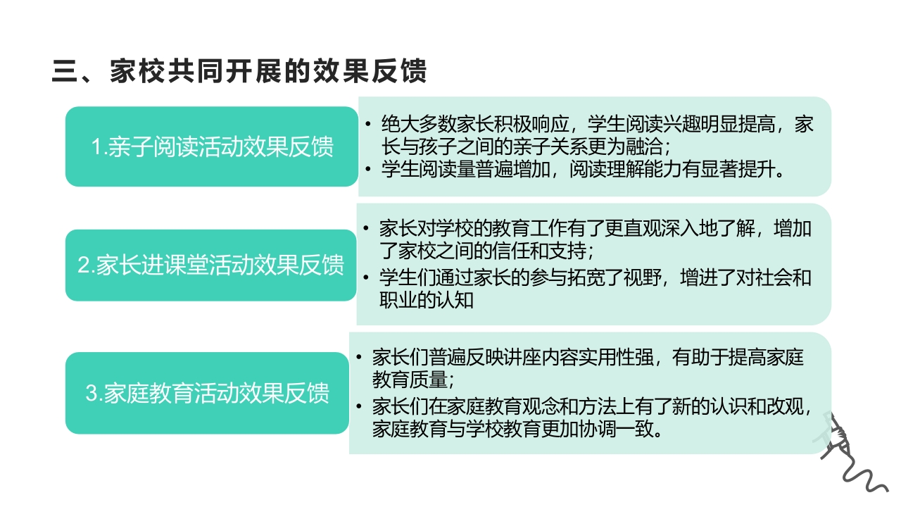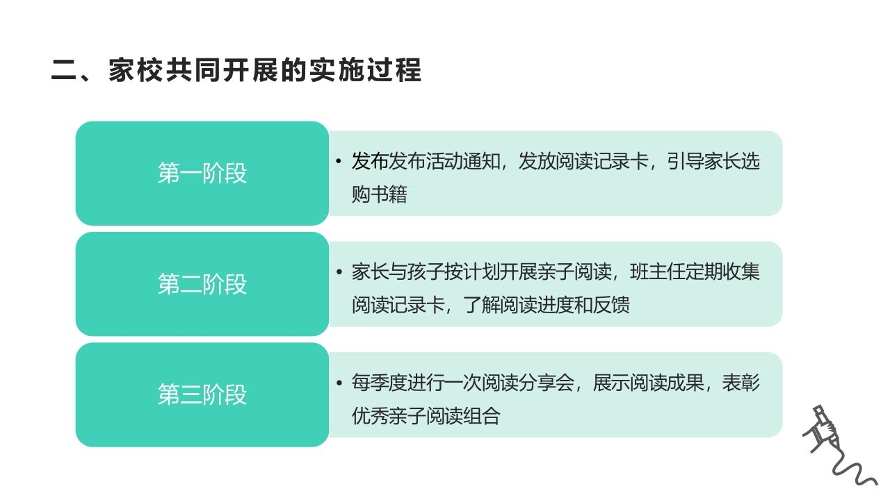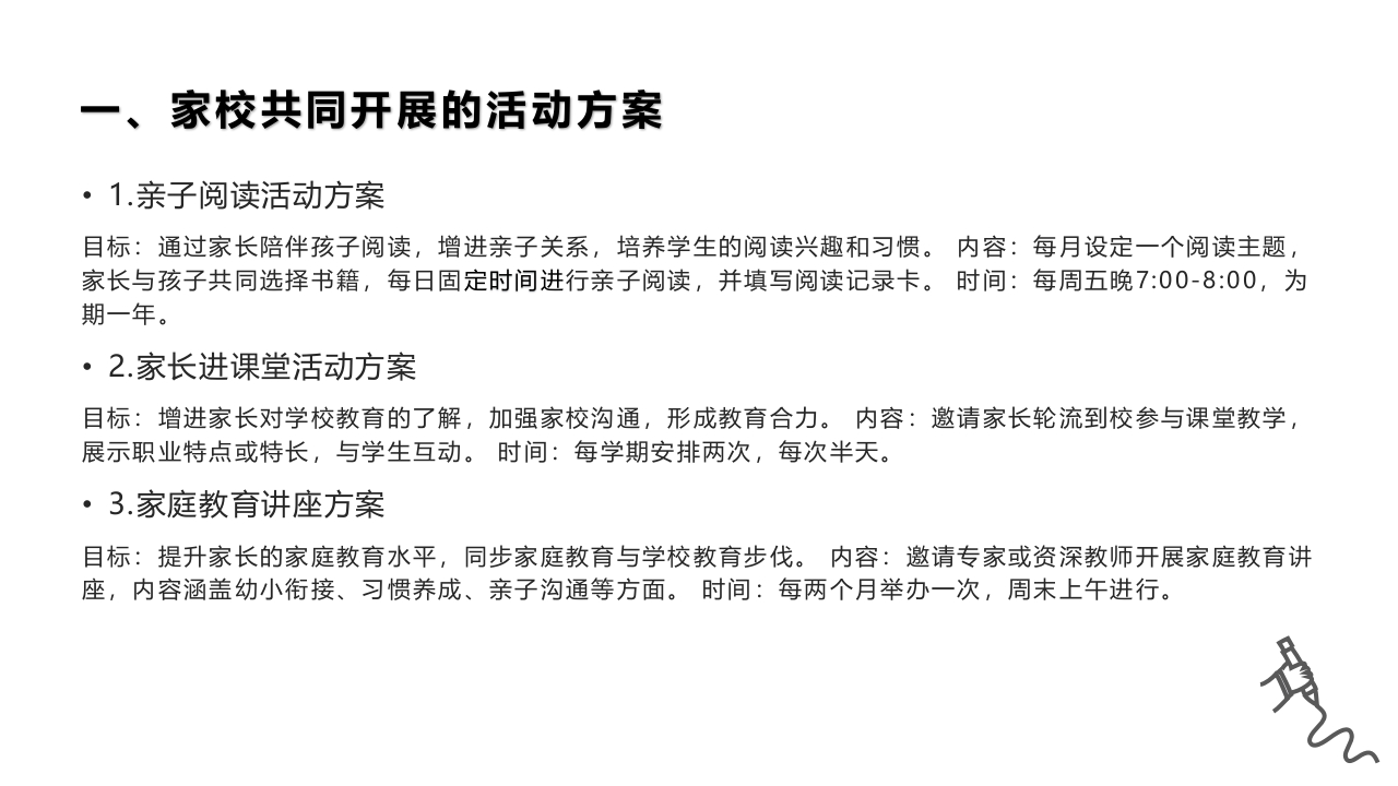 侔平区小课题立项申请书小学一年级优秀班集体阶段性发展的研究一、家校共同开展的活动方案·1.亲子阅读活动方案目标:通过家长陪伴孩子阅读,增进亲子关系,培养学生的阅读兴趣和习惯。内容:每月设定一个阅读主题,家长与孩子共同选择书籍,每日固定时间进行亲子阅读,并填写阅读记录卡。时间:每周五晚7:00-8:00,为期一年。·2.家长进课堂活动方案目标:增进家长对学校教育的了解,加强家校沟通,形成教育合力。内容:邀请家长轮流到校参与课堂教学,展示职业特点或特长,与学生互动。时间:每学期安排两次,每次半天。·3.家庭教育讲座方案目标:提升家长的家庭教育水平,同步家庭教育与学校教育步伐。内容:邀请专家或资深教师开展家庭教育讲座,内容涵盖幼小衔接、习惯养成、亲子沟通等方面。时间:每两个月举办一次,周末上午进行。二、家校共同开展的实施过程第一阶段发布发布活动通知,发放阅读记录卡,引导家长选购书籍第二阶段家长与孩子按计划开展亲子阅读,班主任定期收集阅读记录卡,了解阅读进度和反馈第三阶段每季度进行一次阅读分享会,展示阅读成果,表彰优秀亲子阅读组合二、家校共同开展的实施过程提前一个月与家长沟通确定主题,进行活动筹备;1.家长进课堂活动实施安排家长进课堂的具体时间和内容,确保不影响正常教学秩序;活动结束后收集学生和教师的反馈意见,进行总结反思。确定讲座主题和讲师,提前预告给家长:2.家庭教育活动实施讲座当天做好签到、现场布置等工作;讲座结束后,组织家长进行交流研讨,收集家长的意见和建议。