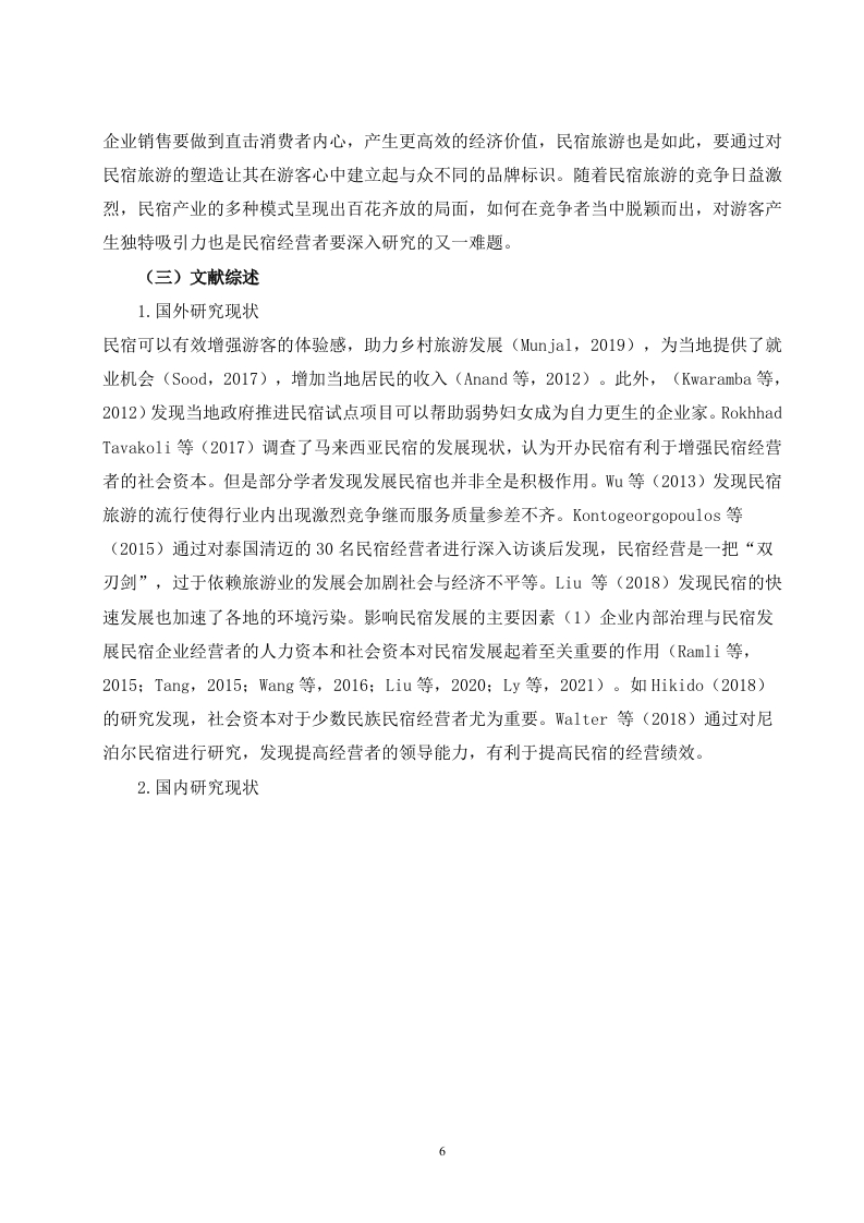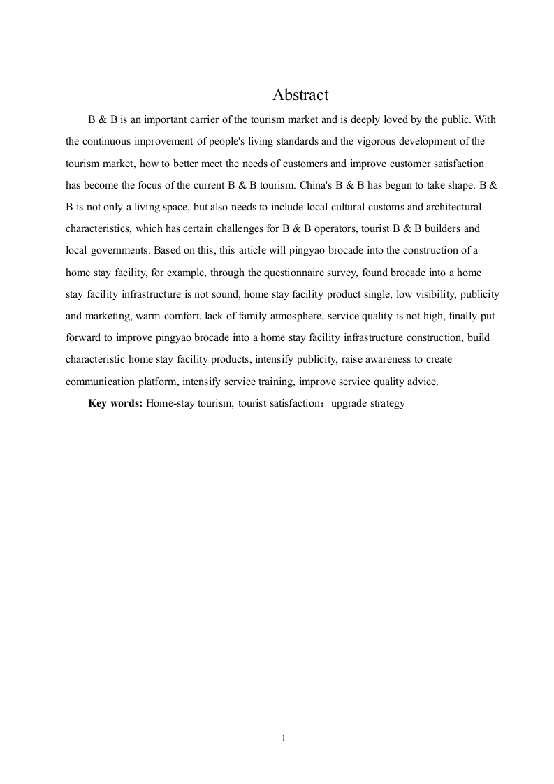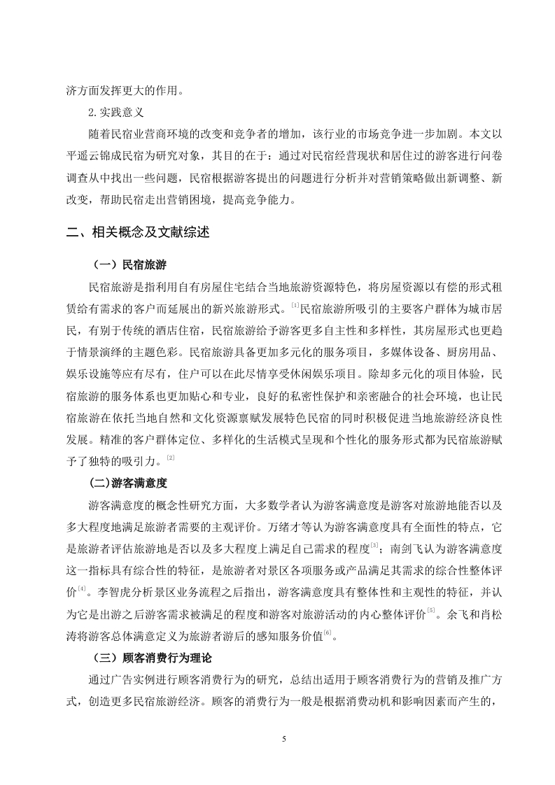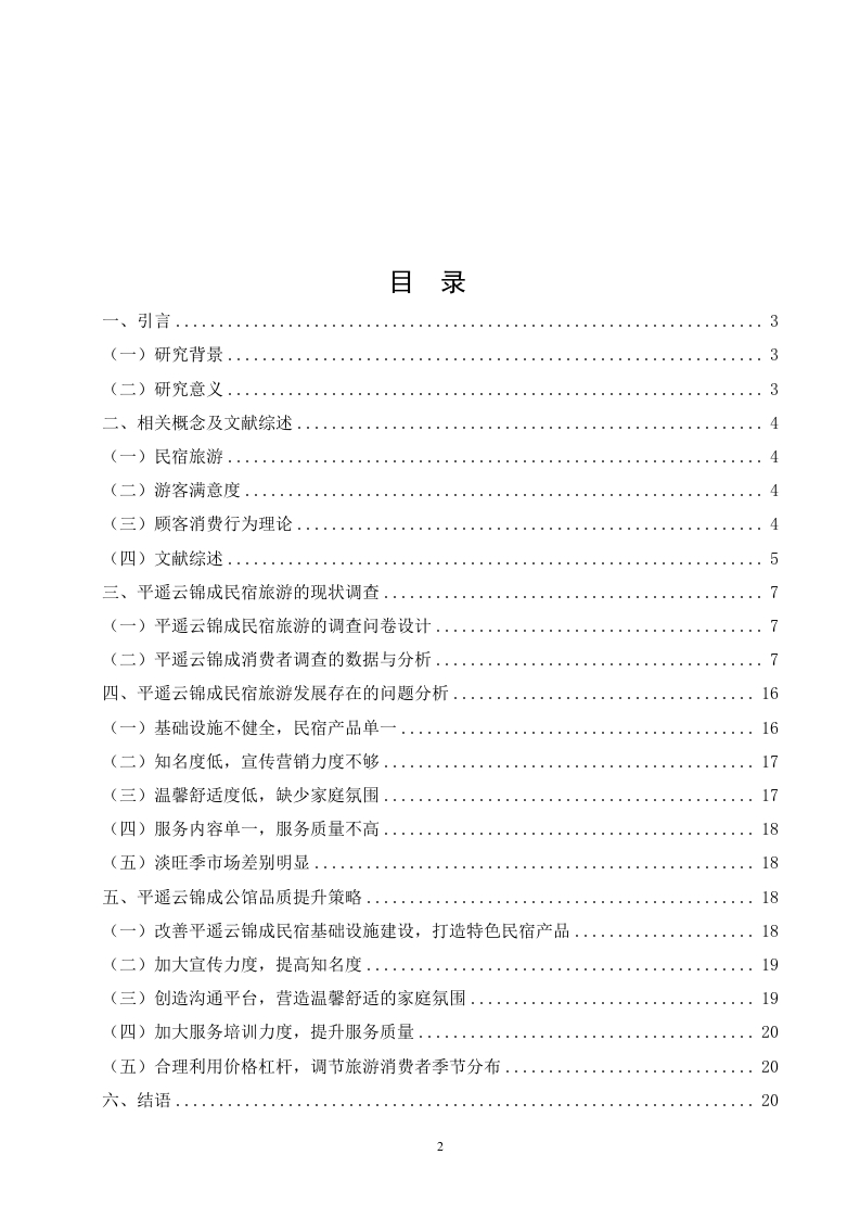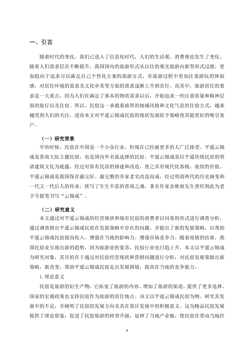 平遥云锦成民宿旅游的发展策略摘要民宿是旅游市场的重要载体深受大众喜爱,随着人们生活水平的不断提高和旅游市场的蓬勃发展,如何更好地满足顾客需求,提高顾客的满意度已成为当下民宿旅游关注的重点。我国的民宿已初具规模,民宿不仅是一个居住空间,还需要包含当地的人文风情、建筑特点等,这对于民宿经营者、旅游民宿建设者及当地政府都有一定的挑战,基于此,本文将以平遥云锦成民宿建设情况为例,通过对平遥云锦成游客进行问卷调查,发现云锦成民宿基础设施不健全,民宿产品单一,知名度低,宣传营销力度不够,温馨舒适度低,缺少家庭氛围,服务质量不高等问题,最后提出改善平遥云锦成民宿基础设施建设,打造特色民宿产品,加大宣传力度,提高知名度创造沟通平台,加大服务培训力度,提升服务质量等建议。关健词:民宿旅游;游客满意度;提升策略AbstractB&B is an important carrier of the tourism market and is deeply loved by the public.Withthe continuous improvement of people's living standards and the vigorous development of thetourism market,how to better meet the needs of customers and improve customer satisfactionhas become the focus of the current BB tourism.China's B&B has begun to take shape.B&B is not only a living space,but also needs to include local cultural customs and architecturalcharacteristics,which has certain challenges for B&B operators,tourist BB builders andlocal governments.Based on this,this article will pingyao brocade into the construction of ahome stay facility,for example,through the questionnaire survey,found brocade into a homestay facility infrastructure is not sound,home stay facility product single,low visibility,publicityand marketing,warm comfort,lack of family atmosphere,service quality is not high,finally putforward to improve pingyao brocade into a home stay facility infrastructure construction,buildcharacteristic home stay facility products,intensify publicity,raise awareness to createcommunication platform,intensify service training,improve service quality advice.Key words:Home-stay tourism;tourist satisfaction:upgrade strategy目录一、引言...3(一)研究背景(二)研究意义3二、相关概念及文献综述4(一)民宿旅游......(二)游客满意度.....4(三)顾客消费行为理论......(四)文献综述.…5三、平遥云锦成民宿旅游的现状调查...·.7(一)平遥云锦成民宿旅游的调查问卷设计..(二)平遥云锦成消费者调查的数据与分析.·四、平遥云锦成民宿旅游发展存在的问题分析.....16(一)基础设施不健全,民宿产品单一16(二)知名度低,宣传营销力度不够17(三)温馨舒适度低,缺少家庭氛围....17(四)服务内容单一,服务质量不高..18(五)淡旺季市场差别明显..18五、平遥云锦成公馆品质提升策略...…18(一)改善平遥云锦成民宿基础设施建设,打造特色民宿产品......·18(二)加大宣传力度,提高知名度.....19(三)创造沟通平台,营造温馨舒适的家庭氛围.....19(四)加大服务培训力度,提升服务质量....20(五)合理利用价格杠杆,调节旅游消费者季节分布.....·20六、结语…20参考文献.22致谢233