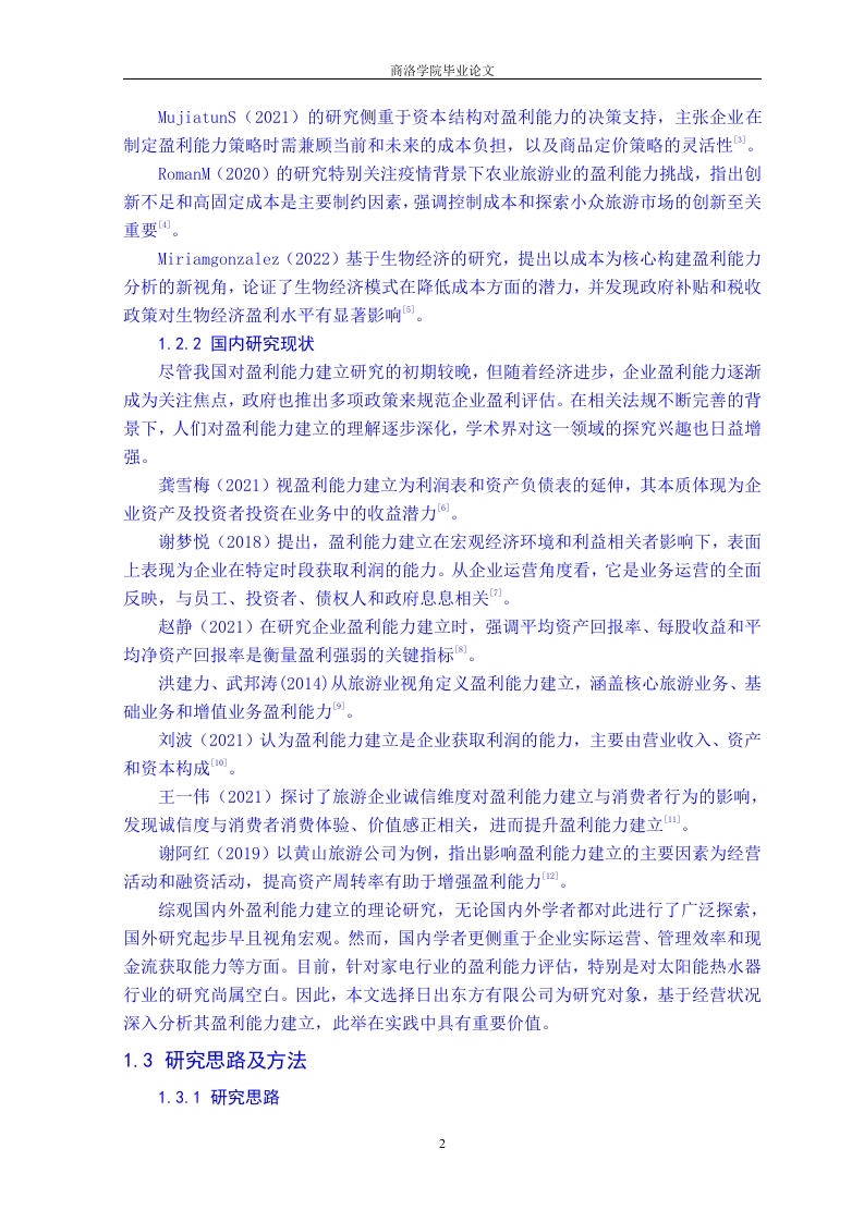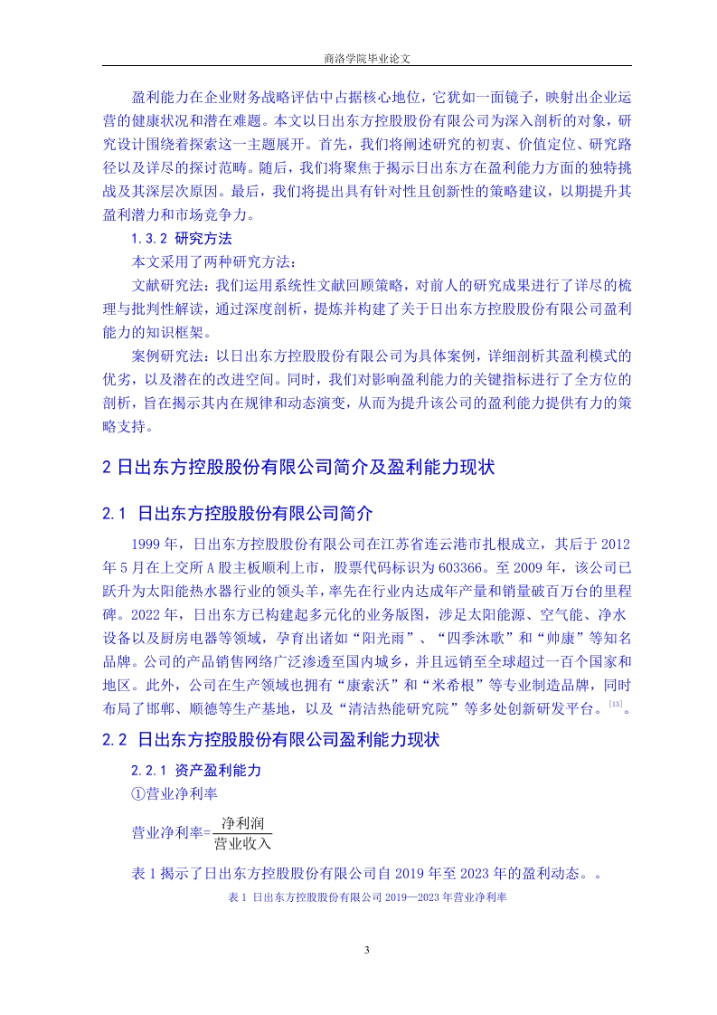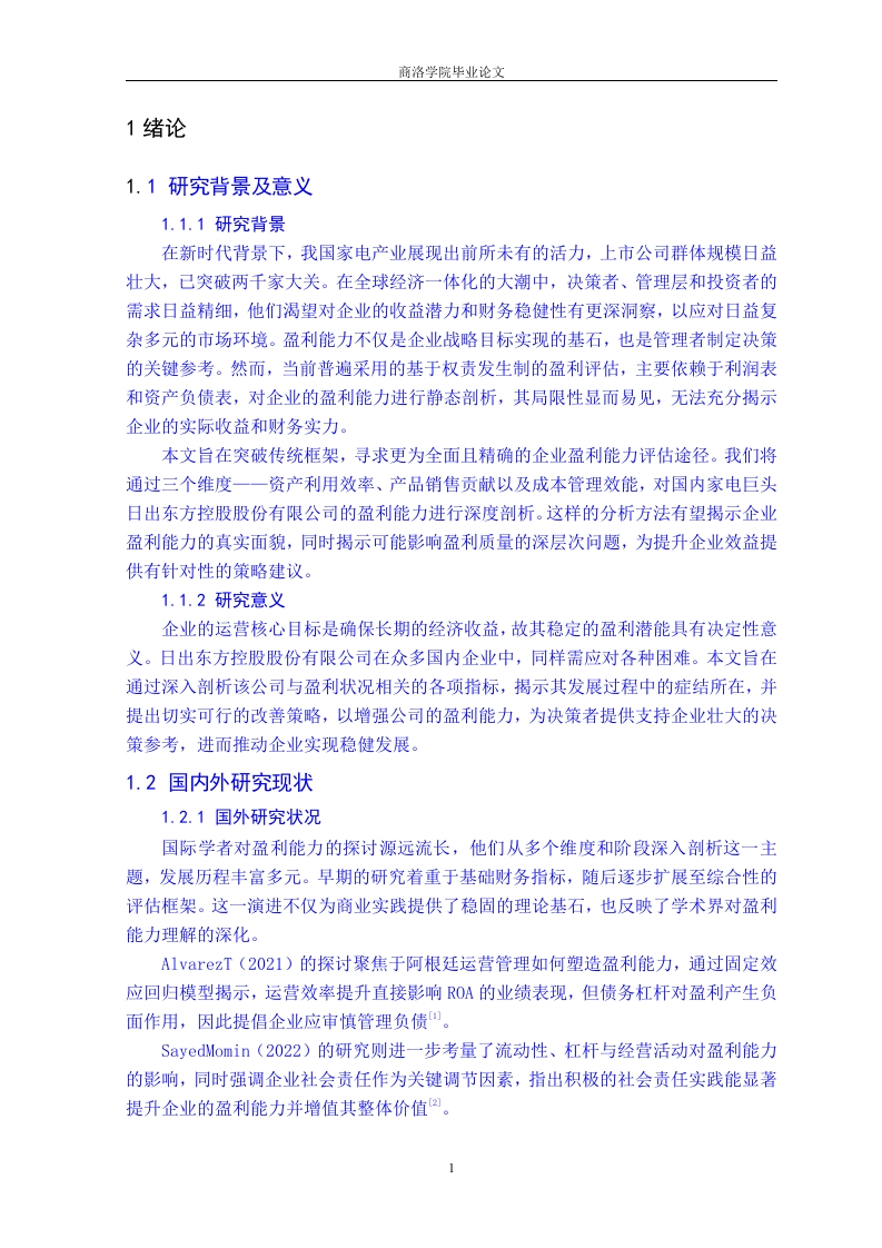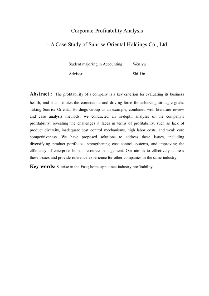 企业盈利能力分析一以日出东方控股股份有限公司为例会计学专业学生文雨指导教师石琳摘要:企业的获利能力是评估其业务健康状况的关键标准,它构成了企业实现战略目标的基石和驱动力。以日出东方控股集团为例,结合文献探讨法和个案分析法,我们深入剖析了该公司的盈利能力,揭示出其在盈利方面遇到的产品多样性匮乏、成本管控机制不健全、人力成本过高以及核心竞争力薄弱等挑战。针对这些问题,我们提出了解决方案,包括多元化产品组合、强化成本控制体系以及提升企业人力资源管理效能,旨在有效应对这些问题,并为同类行业内的其他公司提供参考经验。关键词:日出东方:家电行业:盈利能力Corporate Profitability Analysis--A Case Study of Sunrise Oriental Holdings Co.,LtdStudent majoring in AccountingWen yuAdvisorShi LinAbstract The profitability of a company is a key criterion for evaluating its businesshealth,and it constitutes the cornerstone and driving force for achieving strategic goals.Taking Sunrise Oriental Holdings Group as an example,combined with literature reviewand case analysis methods,we conducted an in-depth analysis of the company'sprofitability,revealing the challenges it faces in terms of profitability,such as lack ofproduct diversity,inadequate cost control mechanisms,high labor costs,and weak corecompetitiveness.We have proposed solutions to address these issues,includingdiversifying product portfolios,strengthening cost control systems,and improving theefficiency of enterprise human resource management.Our aim is to effectively addressthese issues and provide reference experience for other companies in the same industry.Key words:Sunrise in the East;home appliance industry;profitability目录1绪论.1.1研究背景及意义.1.1.1研究背景1.1.2研究意义1.2国内外研究现状...1.2.1国外研究状况..1.2.2国内研究现状...1.3研究思路及方法...1.3.1研究思路.31.3.2研究方法...…2日出东方控股股份有限公司简介及盈利能力现状..............32.1日出东方控股股份有限公司简介32.2日出东方控股股份有限公司盈利能力现状.............·32.2.1资产盈利能力.....2.2.2产品销售盈利能力..·62.2.3成本控制盈利能力..73日出东方控股股份有限公司盈利能力存在问题及原因分析.........73.1日出东方控股股份有限公司盈利能力存在的问题........73.1.1产品结构单一,缺乏竞争优势.....3.1.2成本控制制度不完善,影响企业发展.3.1.3人力资源管理效率低,核心竞争力不足..83.2日出东方控股股份有限公司盈利能力不足的原因.…83.2.1行业市场竞争日益激烈.........83.2.2企业在成本控制方面缺乏责任划分83.2.3企业管理缺乏有效组织和协调....4日出东方控股股份有限公司盈利能力的对策建议............94.1丰富企业产品结构,增强多样性.94.2完善企业成本控制制度,重视管理方法.…94.3提高企业人力资源管理效率............…105结论10参考文献.…11致谢.12