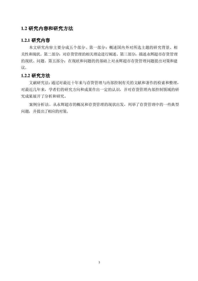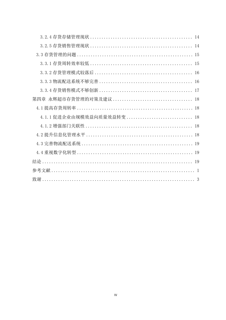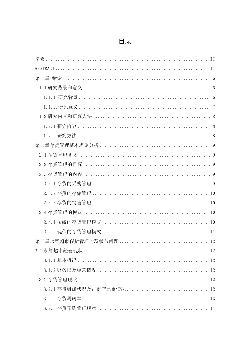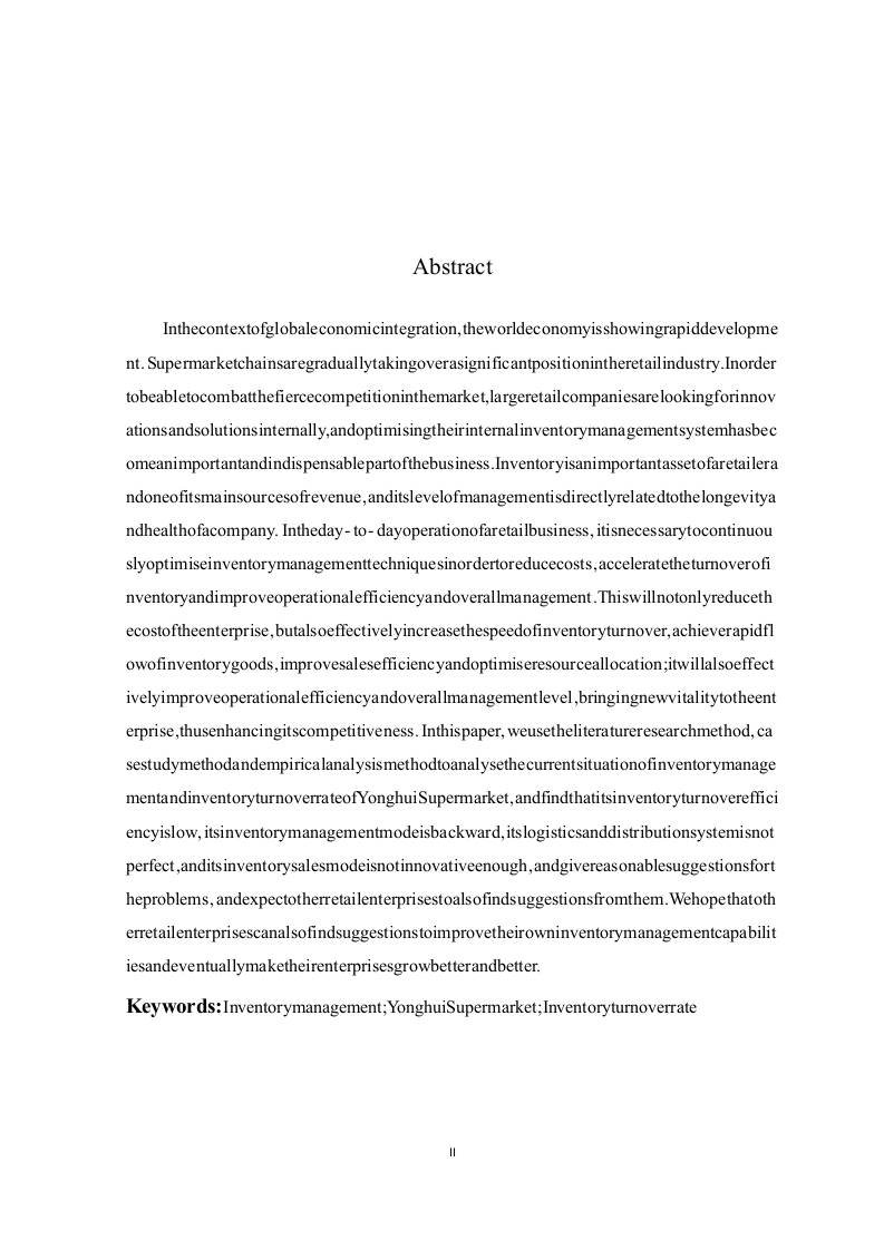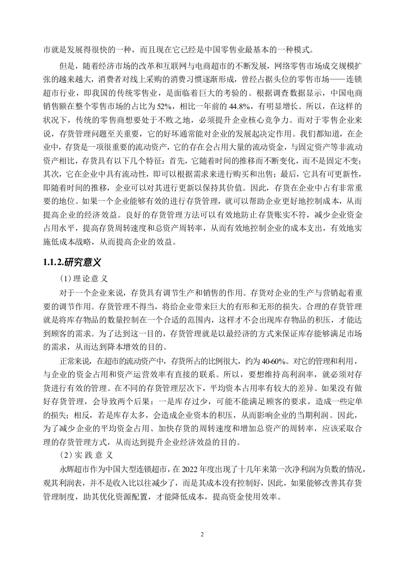 企业存货管理存在的问题及对策一一以永辉超市为例摘要在全球经济一体化的大背景下,世界经济呈现出飞速发展的态势。连锁超市正逐渐占据零售业的重要地位。为了能够对抗激烈的市场竞争,大型零售公司纷纷在内部寻找创新和解决方案,对企业内部存货管理体系进行优化已成为企业的一个重要而又不可或缺的环节。存货是零售企业的一项重要资产,也是其营业收入的主要来源之一,其管理水平直接关系到一家企业能否长久、健康地发展。在零售企业的日常经营过程中,为了更好地降低企业成本,加速存货的周转速度,提升运营效率和整体管理水平,需要持续地对存货管理技术进行优化。这样做不仅可以降低企业的成本,而且可以有效地提高存货周转速度,实现库存商品的快速流转,提高销售效率,实现资源配置的最优化:同时还能有效提升运营效率和整体管理水平,给企业带来新的活力,从而提升企业的竞争能力。本文以永辉超市为例,利用文献研究法、案例分析法和数据分析法通过对永辉超市存货管理现状、存货周转率等方面的分析,发现其存货周转效率较低、存货管理模式较落后、物流配送系统不够完善、存货销售模式不够创新的几个问题,针对问题给予合理的建议,并期望其他零售企业也能从其中找到可以参考的建议,从而提升自身的存货管理能力最终使得企业发展越来越好。关键词:存货管理:永辉超市;存货周转率AbstractInthecontextofglobaleconomicintegration,theworldeconomyisshowingrapiddevelopment.Supermarketchainsaregraduallytakingoverasignificantpositionintheretailindustry.Inordertobeabletocombatthefiercecompetitioninthemarket,largeretailcompaniesarelookingforinnovationsandsolutionsinternally,andoptimisingtheirinternalinventorymanagementsystemhasbecomeanimportantandindispensablepartofthebusiness.Inventoryisanimportantassetofaretailerandoneofitsmainsourcesofrevenue,anditslevelofmanagementisdirectlyrelatedtothelongevityandhealthofacompany.Intheday-to-dayoperationofaretailbusiness,itisnecessarytocontinuouslyoptimiseinventorymanagementtechniquesinordertoreducecosts,acceleratetheturnoverofinventoryandimproveoperationalefficiencyandoverallmanagement.Thiswillnotonlyreducethecostoftheenterprise,butalsoeffectivelyincreasethespeedofinventoryturnover,achieverapidflowofinventorygoods,improvesalesefficienc yandoptimiseresourceallocation;itwillalsoeffectivelyimproveoperationalefficiencyandoverallmanagementlevel,bringingnewvitalitytotheenterprise,thusenhancingitscompetitiveness.Inthispaper,weusetheliteratureresearchmethod,casestudymethodandempiricalanalysismethodtoanalysethecurrentsituationofinventorymanagementandinventoryturnoverrateofYonghuiSupermarket,andfindthatitsinventoryturnoverefficiencyislow,itsinventorymanagementmodeisbackward,itslogisticsanddistributionsystemisnotperfect,anditsinventorysalesmodeisnotinnovativeenough,andgivereasonablesuggestionsfortheproblems,andexpectotherretailenterprisestoalsofindsuggestionsfromthem.Wehopethatotherretailenterprisescanalsofindsuggestionstoimprovetheirowninventorymanagementcapabilitiesandeventuallymaketheirenterprisesgrowbetterandbetter.Key words:Inventorymanagement;YonghuiSupermarket;Inventoryturnoverrate目录摘要.IIABSTRACT..........I1l第一章绪论..61.1研究背景和意义.61.1.1研究背景..。1.1.2.研究意义..….71.2研究内容和研究方法.1.2.1研究内容.·.81.2.2研究方法.....8第二章存货管理基本理论分析92.1存货管理含义...92.2存货管理的目标..92.3存货管理的内容.....92.3.1存货的采购管理92.3.2存货的存储管理102.3.3存货的销售管理...102.4存货管理的模式...102.4.1传统的存货管理模式..102.4.2现代的存货管理模式.…·11第三章永辉超市存货管理的现状与问题..123.1永辉超市经营现状..123.1.1基本概况.....123.1.2财务以及经营情况....123.2存货管理现状.........123.2.1存货组成状况及占资产比重情况123.2.2存货周转率.…133.2.3存货采购管理现状......143.2.4存货存储管理现状143.2.5存货销售管理现状143.3存货管理的问题....153.3.1存货周转效率较低....153.3.2存货管理模式较落后..163.3.3物流配送系统不够完善163.3.4存货销售模式不够创新..17第四章永辉超市存货管理的对策及建议184.1提高存货周转率.....…184.1.1促进企业由规模效益向质量效益转变..·184.1.2增强部门关联性184.2提升信息化管理水平184.3完善物流配送系统..194.4重视数字化转型19结论19参考文献.1致谢.......3IV