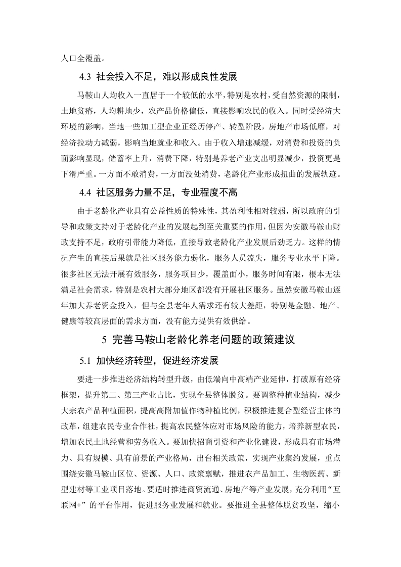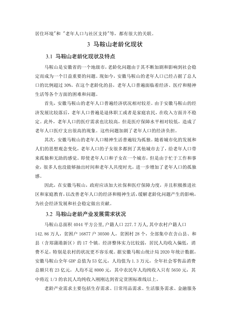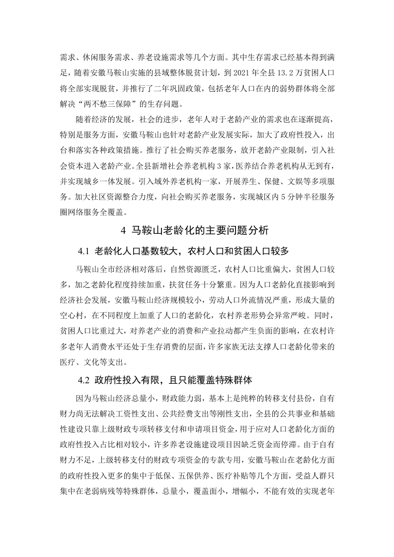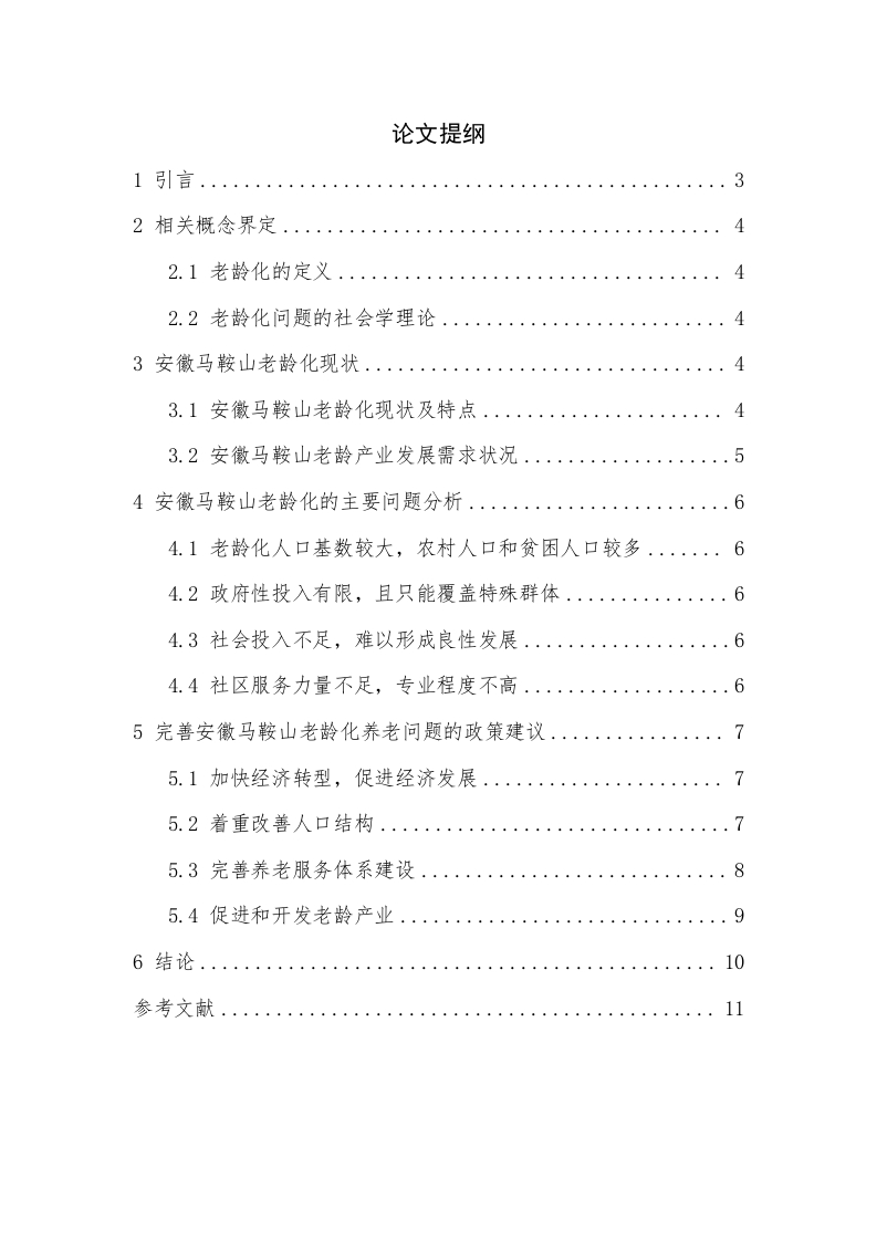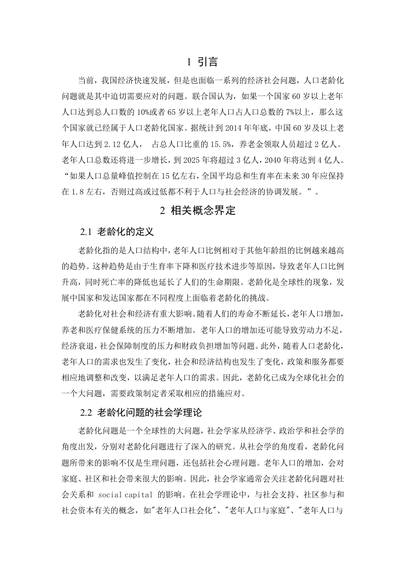 人口老龄化带来的社会问题及应对策略摘要中国目前正在进入老龄化社会,老龄化人口比重在未来三十年会持续升高,这必然会带来社会整体结构的改变,相应产生一系列广泛而深远的社会问题。特别是人口老龄化基本上是伴随着我国从传统农业社会向现代工业社会转型的过程,这就使得我国出现了前所未有的“未富先老”的社会现象,特别是作为贫困地区的黑龙江省安徽马鞍山,老龄化带来的社会问题和矛盾日益突显。而建立一个“老有所养”的老龄化社会服务体系,为老龄人口提供全方位的服务,进一步整合政府和社会资源,在公共服务提供和市场运作中实现有效的联接,使人口老龄化问题得到有效、有序、有利解决,已成为当前乃至今后一个时期需要重视和推进的问题。关键词:安徽马鞍山:人口老龄化:社会服务体系论文提纲1引言...32相关概念界定...42.1老龄化的定义..2.2老龄化问题的社会学理论3安徽马鞍山老龄化现状.......3.1安徽马鞍山老龄化现状及特点...3.2安徽马鞍山老龄产业发展需求状况.........54安徽马鞍山老龄化的主要问题分析.........64.1老龄化人口基数较大,农村人口和贫困人口较多..·642政府性投入有限,且只能覆盖特殊群体.·.·...·..643社会投入不足,难以形成良性发展....64.4社区服务力量不足,专业程度不高..65完善安徽马鞍山老龄化养老问题的政策建议.·75.1加快经济转型,促进经济发展..5.2着重改善人口结构...5.3完善养老服务体系建设...85.4促进和开发老龄产业.96结论.10参考文献..111引言当前,我国经济快速发展,但是也面临一系列的经济社会问题,人口老龄化问题就是其中迫切需要应对的问题。联合国认为,如果一个国家60岁以上老年人口达到总人口数的10%或者65岁以上老年人口占人口总数的7%以上,那么这个国家就已经属于人口老龄化国家。据统计到2014年年底,中国60岁及以上老年人口达到2.12亿人,占总人口比重的15.5%,养老金领取人员超过2亿人。老年人口总数还将进一步增长,到2025年将超过3亿人,2040年将达到4亿人“如果人口总量峰值控制在15亿左右,全国平均总和生育率在未来30年应保持在1.8左右,否则过高或过低都不利于人口与社会经济的协调发展。”。2相关概念界定2.1老龄化的定义老龄化指的是人口结构中,老年人口比例相对于其他年龄组的比例越来越高的趋势。这种趋势是由于生育率下降和医疗技术进步等原因,导致老年人口比例升高,同时死亡率的降低也延长了人们的生命期限。老龄化是全球性的现象,发展中国家和发达国家都在不同程度上面临着老龄化的挑战。老龄化对社会和经济有重大影响。随着人们的寿命不断延长,老年人口增加,养老和医疗保健系统的压力不断增加。老年人口的增加还可能导致劳动力不足,经济衰退,社会保障制度的压力和财政负担增加等问题。此外,随着人口老龄化,老年人口的需求也发生了变化,社会和经济结构也发生了变化,政策和服务都要相应地调整和改变,以满足老年人口的需求。因此,老龄化已成为全球化社会的一个大问题,需要政策制定者采取相应的措施应对。2.2老龄化问题的社会学理论老龄化问题是一个全球性的大问题,社会学家从经济学、政治学和社会学的角度出发,分别对老龄化问题进行了深入的研究。从社会学的角度看,老龄化问题所带来的影响不仅是生理问题,还包括社会心理问题。老年人口的增加,会对家庭、社区和社会带来很大的影响。因此,社会学家通常会关注老龄化问题对社会关系和social capital的影响。在社会学理论中,与社会支持、社区参与和社会资本有关的概念,如“老年人口社会化”、“老年人口与家庭”、“老年人口与居住环境“和“老年人口与社区支持“等,都有很大的关联。3马鞍山老龄化现状3.1马鞍山老龄化现状及特点马鞍山是安徽省的一个地级市,老龄化问题由于其不断加剧和影响到社会稳定而成为一个日益重要的问题。现如今,安徽马鞍山的老年人口已经占据了总人口的比例超过30%。在这个老龄化的县,老年人口普遍面临着经济、医疗和精神生活等各个方面的困难和问题。首先,安徽马鞍山的老年人口普遍经济状况相对较差。由于安徽马鞍山的经济发展比较落后,老年人口普遍是退休职工或者是家庭农民,在收入方面并不稳定。此外,老年人口的医疗需求也比较高,但是医疗保障水平相对较低,造成了老年人口医疗支出很高的现象。这些问题加剧了老年人口的经济负担。其次,安徽马鞍山的老年人口精神生活普遍较为孤独。随着城市化的发展和人们的思想观念变化,老年人口的子女很多都到了其他城市去了,给老年人口带来孤独和无助的感觉。即使老年人口和子女在一个城市,但是由于忙于工作和事业,很多人也没能够抽出时间和老年人共度时光,进一步增加了老年人口的孤独感。因此,在安徽马鞍山,政府应该加大社保和医疗保障力度,并且积极推进社区和家庭教育,以改善老年人口的经济和精神生活,缓解老龄化问题产生的影响,为社会经济发展和社会稳定做出贡献。3.2马鞍山老龄产业发展需求状况马鞍山总面积4044平方公里,户籍人口227.7万人,其中农村户籍人口142.86万人,贫困户16877户30500人,贫困村28个,全部集中在含山县、和县(含郑蒲港新区)的17个镇。经济整体实力比较弱,居民人均收入偏低,消费不足,特别是农村的状况更不容乐观。据安徽马鞍山统