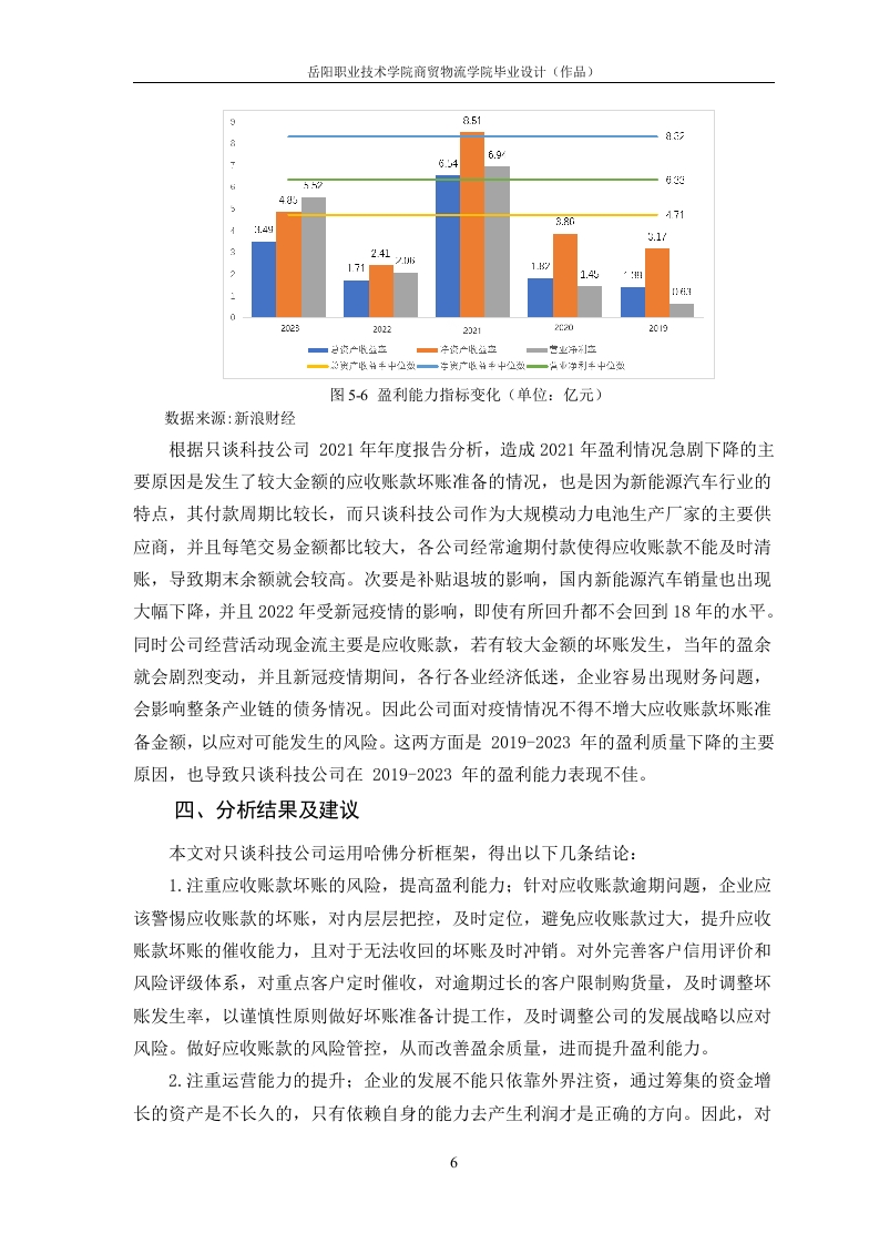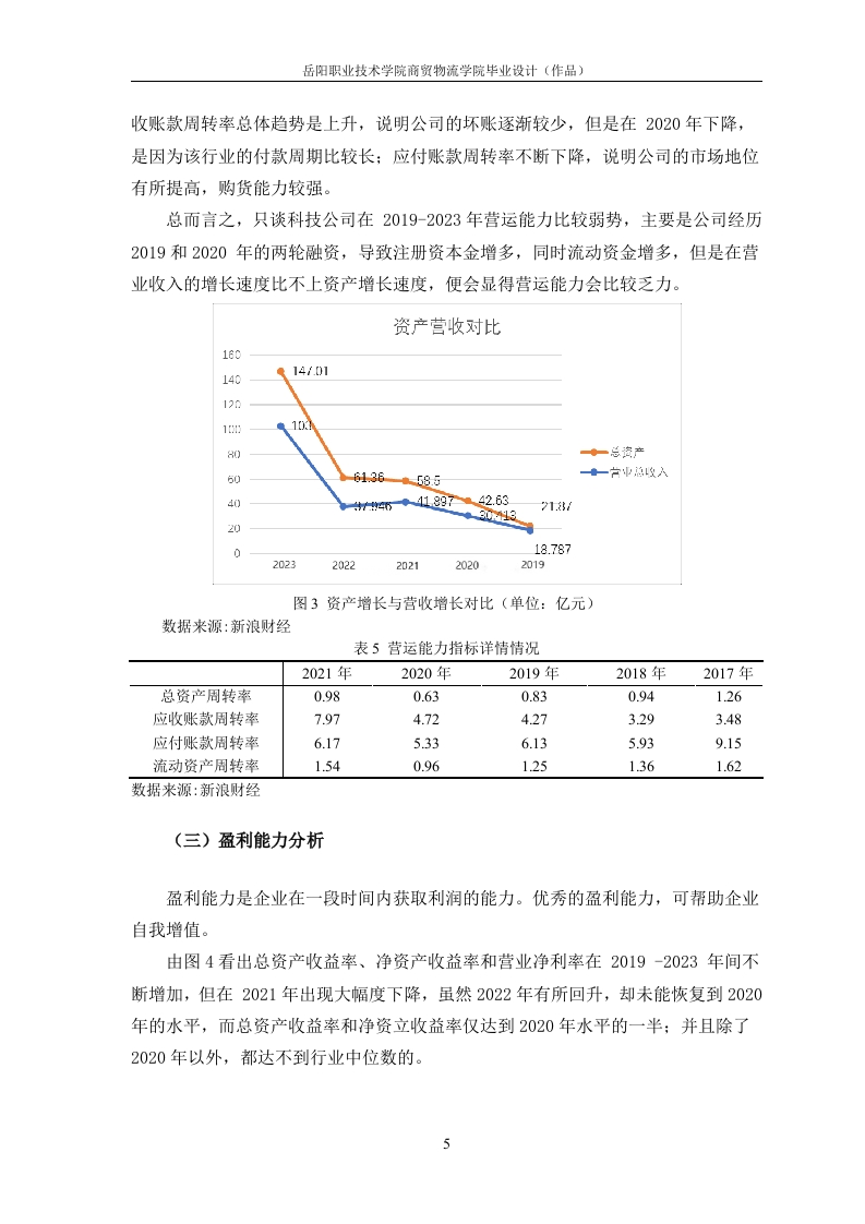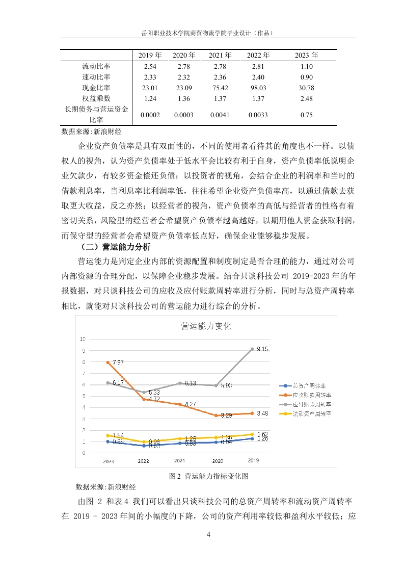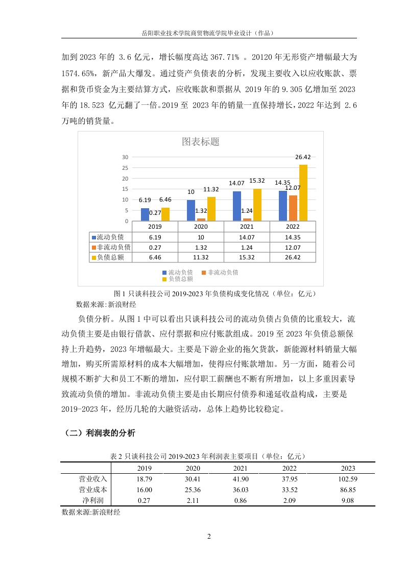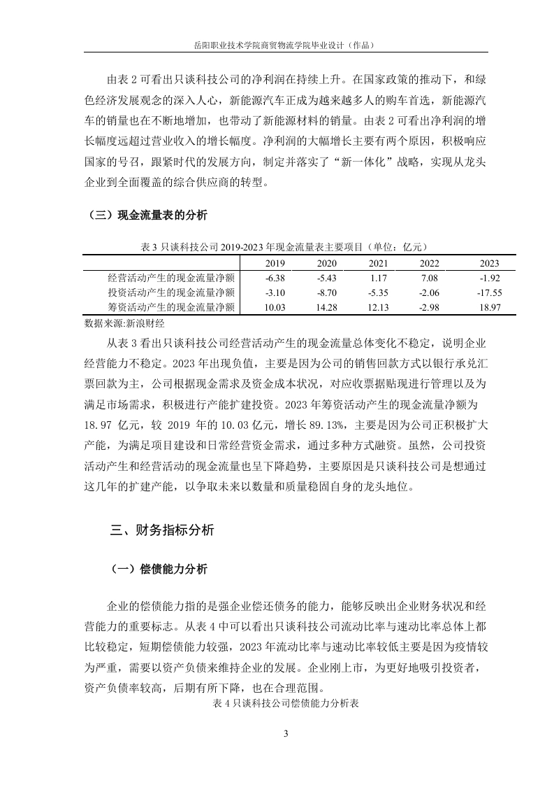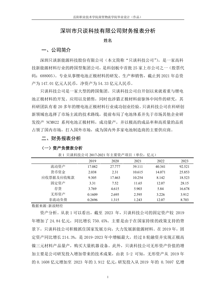 目录一、公司简介..二、财务报表分析.....1(一)资产负债表分析..(二)利润表的分析.2(三)现金流量表的分析三、财务指标分析.....(一)偿债能力分析….3(二)营运能力分析……4(三)盈利能力分析.5参考资料:。8岳阳职业技术学院商贸物流学院毕业设计(作品)深圳市只谈科技有限公司财务报表分析姓名一、公司简介深圳只谈新能源科技股份有限公司(本文简称“只谈科技公司”),是一家高科技新能源材料行业的跨国型集团公司,是科创板中首批25家上市公司之一(股票代码:688005)。专业从事锂电池正极材料的研发、生产和销售,截止到2021年总资产为147.01亿元人民币,净资产为54.33亿元人民币。只谈科技公司是一家大型的跨国集团。只谈科技公司自开创以来就着重与锂电池正极材料的开发、应用以及销售,同时也涉猎正极材料前驱体中间件的研究,其科研团队有着20多年的锂电池正极材料行业成功创业经验。只谈科技公司在科研创新领域也选择了市场主流的技术路线,提前布局了电池体系并先于市场其他企业研发投产NCM822系列电池正极材料,成功量产,并以极高的成品率和高质量的品质占领了国内市场,打入国外市场,成为国内外多家电池制造商的主要供应商。二、财务报表分析(一)资产负债表分析表1只谈科技公司2017-2021年主要资产项目(单位:亿元)20192020202120222023流动资产17.08227.77739.11140.34192.521货币资金2.0382.3110.61514.07125.853应收票据及应收账款9.30517.46310.2548.14218.523固定资产3.317.5211.6512.0728.15存货3.7694.6155.9035.8416.678无形资产0.16092.6952.5953.2263.912非流动负债0.26961.315124312.078.703数据来源:新浪财经资产分析。从表1可以看出,截至2023年,只谈科技公司的固定资产较2019年增加了24.84亿元,同比增长750.45%。主要是由于在国家持续的政策支持的背景下,只谈科技公司积极抓住国家发展方向,大力发展新能源材料。在2019年,固定资产同比增长214.3%,是2019-2023年中增幅最大,经过B轮融资并实现正极高镍三元材料产品量产,购买大量机器设备。此外,只谈科技公司无形资产价值的增加主要是公司研发投入增加带来的技术成果,由表5-2可知,无形资产从2019年的0.1608亿元增加至2023年的3.912亿元,研发投入从2019年的0.7697亿增岳阳职业技术学院商贸物流学院毕业设计(作品)加到2023年的3.6亿元,增长幅度高达367.71%。20120年无形资产增幅最大为1574.65%,新产品大爆发。通过资产负债表的分析,发现主要收入以应收账款、票据和货币资金为主要结算方式,应收账款和票据从2019年的9.305亿增加至2023年的18.523亿元翻了一倍。2019至2023年的销量一直保持增长,2022年达到2.6万吨的销货量。图表标题3026.42252014.0715.3214.35152.01011.32106.196.460.271.321.2402019202020212022■流动负债6.191014.0714.35■非流动负债0.271.321.2412.07■负债总额6.4611.3215.3226.42■流动负债■非流动负债■负债总额图1只谈科技公司2019-2023年负债构成变化情况(单位:亿元)数据来源:新浪财经负债分析。从图1中可以看出只谈科技公司的流动负债占负债的比重较大,流动负债主要是由银行借款、应付票据和应付账款组成。2019至2023年负债总额保持上升趋势,2023年增幅最大。主要是下游企业的拖欠货款,新能源材料销量大幅增加,购买所需原材料的成本大幅增加,使得应付账款增加。另一方面,随着公司规模不断扩大和员工不断的增加,应付职工薪酬也不断有所增加,以上多重因素导致流动负债的增加。非流动负债主要是由长期应付债券和递延收益构成,主要是2019-2023年,经历几轮的大融资活动,总体上趋势比较稳定。(二)利润表的分析表2只谈科技公司2019-2023年利润表主要项目(单位:亿元)20192020202120222023营业收入18.7930.4141.9037.95102.59营业成本16.0025.3636.0333.5286.85净利润0.272.110.862.099.08数据来源:新浪财经2岳阳职业技术学院商贸物流学院毕业设计(作品)由表2可看出只谈科技公司的净利润在持续上升。在国家政策的推动下,和绿色经济发展观念的深入人心,新能源汽车正成为越来越多人的购车首选,新能源汽车的销量也在不断地增加,也带动了新能源材料的销量。由表2可看出净利润的增长幅度远超过营业收入的增长幅度。净利润的大幅增长主要有两个原因,积极响应国家的号召,跟紧时代的发展方向,制定并落实了“新一体化”战略,实现从龙头企业到全面覆盖的综合供应商的转型。(三)现金流量表的分析表3只谈科技公司2019-2023年现金流量表主要项目(单位:亿元)20192020202120222023经营活动产生的现金流量净额-6.38-5.431.177.08-1.92投资活动产生的现金流量净额-3.10-8.70-5.35-2.06-17.55筹资活动产生的现金流量净额10.0314.2812.13-2.9818.97数据来源:新浪财经从表3看出只谈科技公司经营活动产生的现金流量总体变化不稳定,说明企业经营能力不稳定。2023年出现负值,主要是因为公司的销售回款方式以银行承兑汇票回款为主,公司根据现金需求及资金成本状况,对应收票据贴现进行管理以及为满足市场需求,积极进行产能扩建投资。2023年筹资活动产生的现金流量净额为18.97亿元,较2019年的10.03亿元,增长89.13%,主要是因为公司正积极扩大产能,为满足项目建设和日常经营资金需求,通过多种方式融资。虽然,公司投资活动产生和经营活动的现金流量也呈下降趋势,主要原因是只谈科技公司是想通过这几年的扩建产能,以争取未来以数量和质量稳固自身的龙头地位。三、财务指标分析(一)偿债能