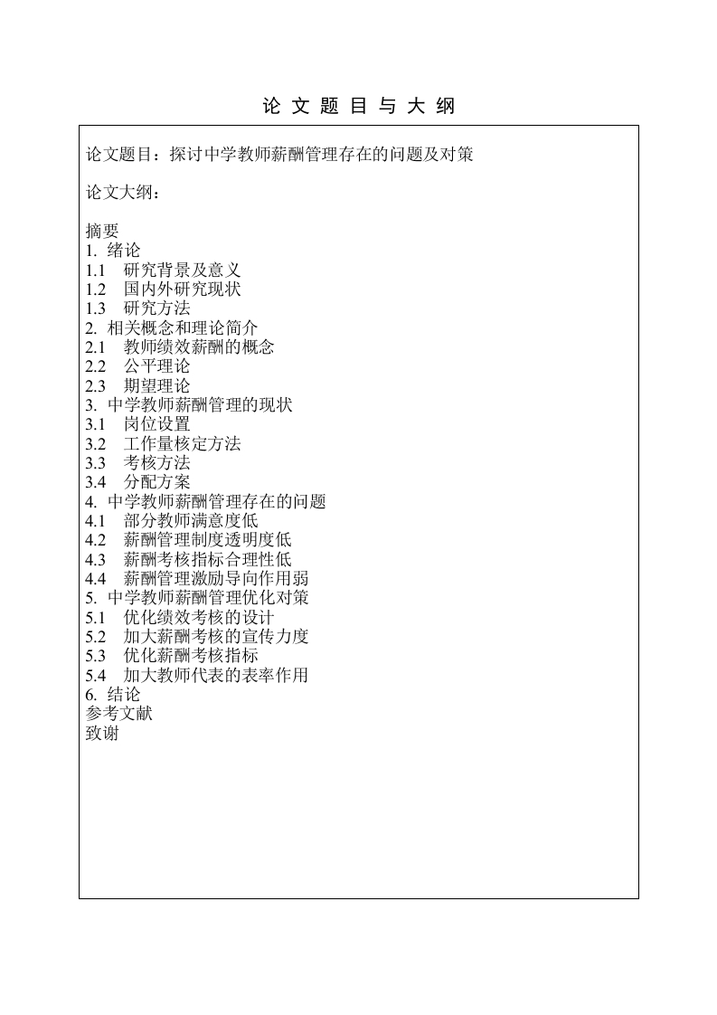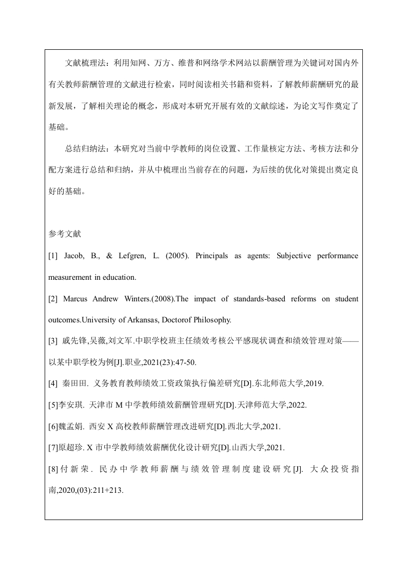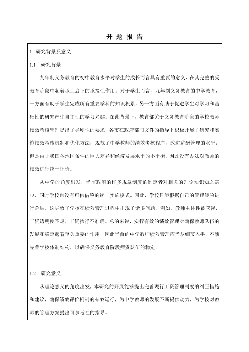 上海海事大学本科毕业论文(设计)开题报告出上海涵事大学9D9姓名:学号:学院:专业:班级指导教师:年月日填开题报告1.研究背景及意义1.1研究背景九年制义务教育的初中教育水平对学生的成长而言具有重要的意义,在其完整的受教育阶段中起着承上启下的承接性作用。对于学生而言,九年制义务教育的中学教育,一方面有助于学生完成所有重要学科的知识积累,另一方面有助于促进学生对学习和基础性的研究产生自主性的学习兴趣。在此背景下,教育部关于义务教育阶段的学校教师绩效考核管理提出了导则性的要求,各市在政府部门文件的指导下积极开展了研究和实施绩效考核机制和优化方法,规范了中学教师的绩效考核程序,改进薪酬管理的水平。但是由于我国各地区条件的巨大差异和经济发展水平的不平衡,因此没有办法对教师的绩效进行统一评价。从中学的角度出发,当前政府的许多规章制度的制定者对相关的理论知识知之甚少,同时学校也没有可供借鉴的统一实施模式。因此,学校只能根据自己的管理经验进行总结,这导致了学校在绩效管理过程中出现了诸多问题。例如,教师主体性被忽视,工资透明度不足,工资执行不准确。总的来说,实行有效的绩效管理对确保教师队伍的发展和稳定起着至关重要的作用,因此当前的中学教师绩效管理应当从细节入手,不断完善学校体制结构,以确保义务教育阶段师资队伍的稳定。1.2研究意义从理论意义的角度出发,本研究的开展能够提出完善现行工资管理制度的纠正措施和建议,确保绩效评价机制的有效运行,为中学教师的发展不断提供动力,为学校对教师的管理方案提出可参考性的指导。从现实意义的角度出发,本研究的开展从中学教师薪酬管理的现状出发,不仅可以揭示中学教师薪酬管理中存在的问题和不足,而且可以根据学校的实际情况予以纠正。同时不断完善和切实落实规章制度,可以极大地调动中学教师的积极性。通过分析研究,结合教师奖励理论,不断优化薪酬评价的实施,进而提高教师的积极性和主动性,因此本研究的开展具有一定的现实意义。2.文献综述Jacobs和Lefgren认为学校的校长在对教师进行绩效评估时,其评估结果反映了学校对教师的认可程度,因此会直接影响教师在今后工作中的积极性,因此绩效评估的结果与教师行为之间存在明显的正相关关联。Marcus Andrew Winters认为教师的薪酬评价机制有助于提升教师的教学水平,进而帮助学生提升阅读理解能力,同时也能帮助学校营造良好的师生关系。此外,薪酬评价机制的优化尤其对学校中表现较差的教师有明显的促进作用。戚先锋,吴薇和刘文军运用问卷调查的方式开展研究,在其研究中通过数据分析,得出职业中学班主任的评价缺乏公平性的结论。其次,其认为有必要提高中等职业学校班主任的公平感、感受性和主动性,以此不断改进班主任的工作。秦田田的研究表明,教师薪酬政策应具有差异性、公平性和激励性,但在实际实施过程中,由于设计、实施行为和实施效率的偏差难以实施。在今后的工作中,要调动主观能动性,进一步完善绩效评价体系,合理落实工资梯度原则,促进工作发展。3.研究方法本研究采用的研究方法主要有文献梳理法和总结归纳法。文献梳理法:利用知网、万方、维普和网络学术网站以薪酬管理为关键词对国内外有关教师薪酬管理的文献进行检索,同时阅读相关书籍和资料,了解教师薪酬研究的最新发展,了解相关理论的概念,形成对本研究开展有效的文献综述,为论文写作奠定了基础。总结归纳法:本研究对当前中学教师的岗位设置、工作量核定方法、考核方法和分配方案进行总结和归纳,并从中梳理出当前存在的问题,为后续的优化对策提出奠定良好的基础。参考文献[1]Jacob,B.,Lefgren,L.(2005).Principals as agents:Subjective performancemeasurement in education.[2]Marcus Andrew Winters.(2008).The impact of standards-based reforms on studentoutcomes.University of Arkansas,Doctorof Philosophy.[3]戚先锋,吴薇,刘文军.中职学校班主任绩效考核公平感现状调查和绩效管理对策以某中职学校为例[U.职业,2021(23):47-50.[4秦田田.义务教育教师绩效工资政策执行偏差研究D].东北师范大学,2019.[5]李安琪.天津市M中学教师绩效薪酬管理研究D].天津师范大学,2022.[6]魏孟娟.西安X高校教师薪酬管理改进研究D].西北大学,2021.[7刀原超珍.X市中学教师绩效薪酬优化设计研究D].山西大学,2021.[8]付新荣,民办中学教师薪酬与绩效管理制度建设研究).大众投资指南,2020,(03):211+213.