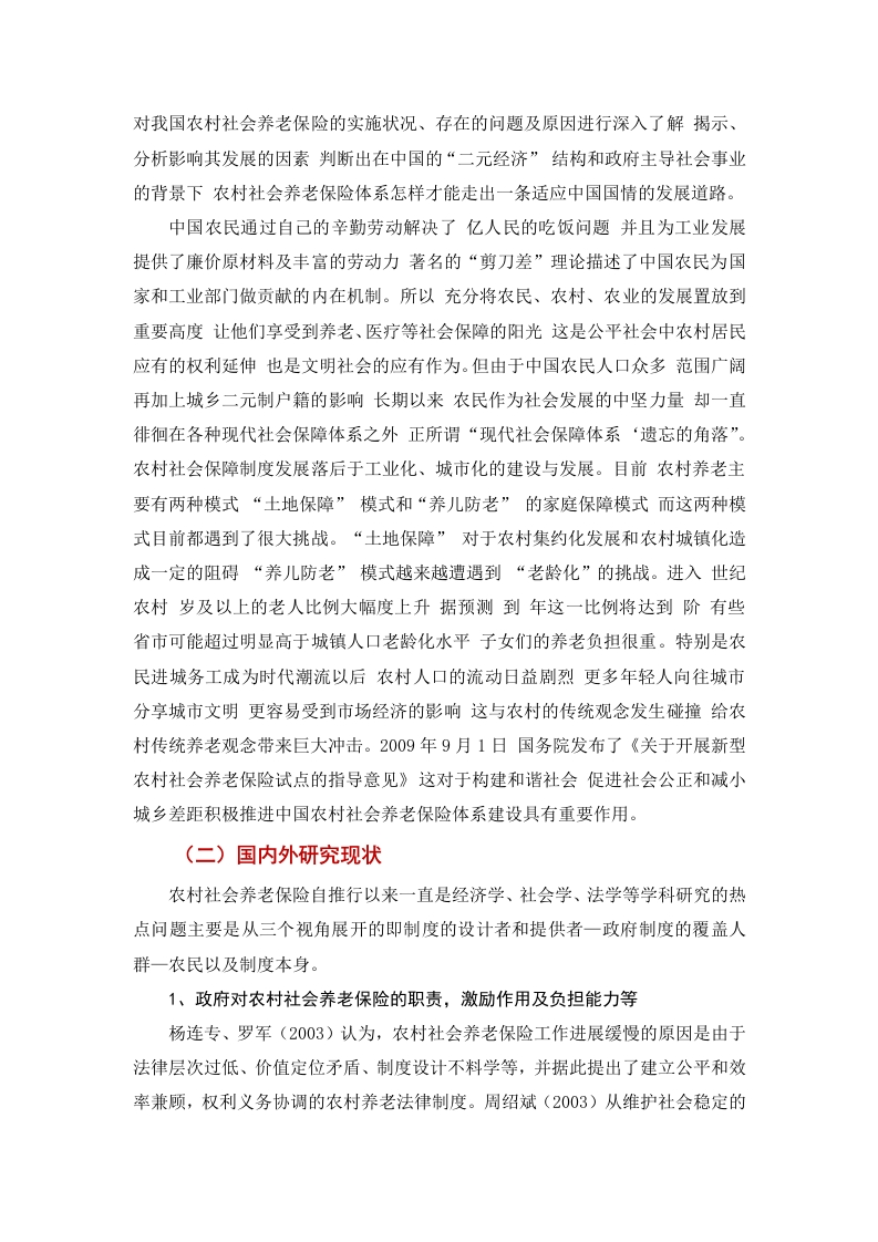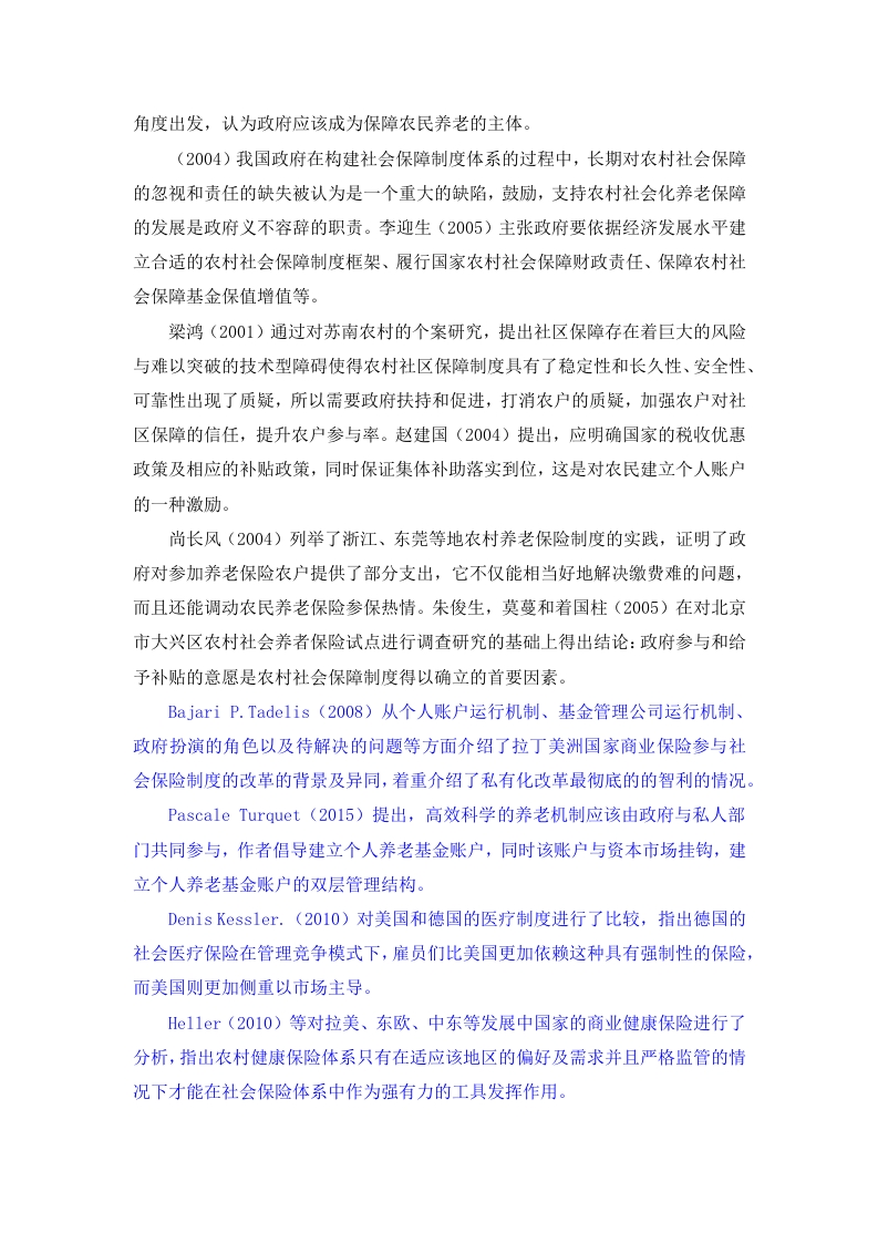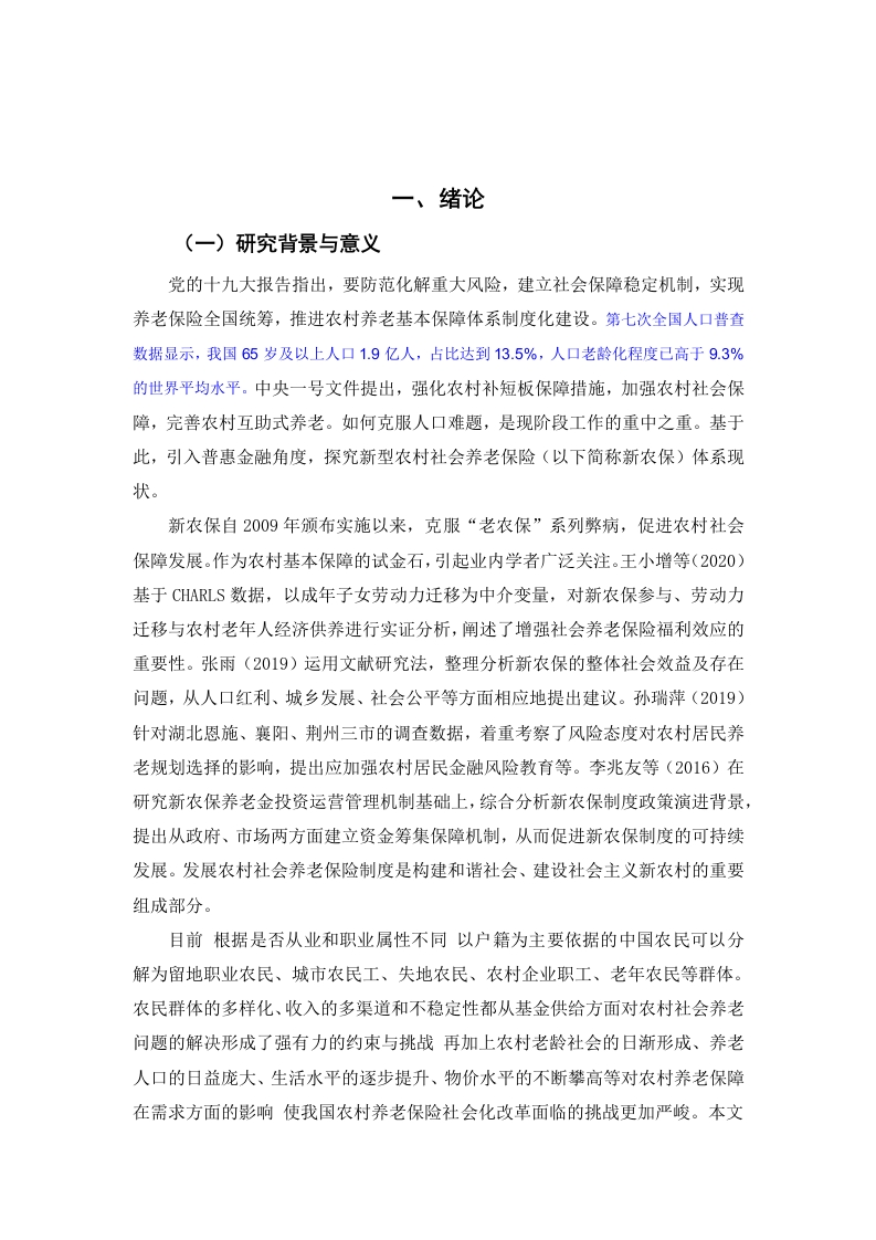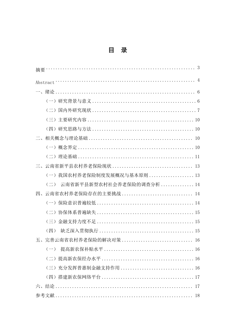 我国农村养老保险体系面临的挑战及对策分析一一以云南省新平县为例摘要:为了解西南地区农村养老保险的现状,有效应对人口老龄化,我们对云南省新平县农村养老保险的现状、问题及发展对策进行了文献综述和实地访谈等深入研究。结果表明,总体上存在城乡养老保险参保意愿低、覆盖面不足、城乡养老保险基金监管能力不足等问题。结果显示,农村养老保险普遍存在农民参加养老保险意识不足、协保体系普遍缺失、普惠金融支持力度不足、缺乏深入贯彻执行等问题。为进一步提高农民参加养老保险的积极性,建议新平县充分利用信息化管理系统,发挥城乡居民养老保险制度的社会效应,不断推进城乡社会保险扩面工作,提高新农保补贴水平、经办水平,充分发挥普惠金融支持作用,搭建新农保网平台。关键词:农村养老保险:普惠金融:新平县Analysis of Challenges and Countermeasures Facedby China's Rural Pension Insurance System--TakingXinping County of Yunnan Province as an ExampleAbstract In order to understand the current situation of rural pensioninsurance in economically backward areas and effectively respond to populationaging,we conducted an in-depth study on the current situation,problems anddevelopment countermeasures of rural pension insurance in Xinping County,Yunnan Province,including literature review and field interviews.The resultsshow that overall there are problems such as low willingness to participate inrural and urban pension insurance,insufficient coverage,and insufficientsupervisory capacity of rural and urban pension insurance funds.The resultsshow that rural pension insurance generally suffers from insufficient awarenessof farmers'participation in pension insurance,a general lack of co-insurancesystem,insufficient inclusive financial support,and a lack of in-depthimplementation.In order to further increase farmers'motivation to participate inpension insurance,it is recommended that Xinping County make full use of theinformation management system,give full play to the social effects of the urbanand rural residents'pension insurance system,continuously promote theexpansion of urban and rural social insurance,improve the level of subsidies andthe level of handling of the New Rural Insurance,give full play to the role ofinclusive financial support,and set up a network platform for the New RuralInsurance.Keywords:pension insurance;rural;Xinping County目录摘要…Abstract4一、绪论6(一)研究背景与意义..(二)国内外研究现状...…7(三)主要研究内容10(四)研究思路与方法.............10二、相关概念与理论基础....10(一)概念界定10(二)理论基础.11三、云南省新平县农村养老保险现状....13(一)我国农村养老保险制度发展概况与基本原则....·13(二)云南省新平县新型农村社会养老保险的调查分析..14四、云南省农村养老保险存在的主要挑战.......14(一)保险意识普遍较低..14(二)协保体系普遍缺失....15(三)金融支持力度不足.....15(四)缺乏深入贯彻执行...15五、完善云南省农村养老保险的解决对策.16(一)提高新农保补贴水平....................16(二)提高新农保经办水平.....16(三)充分发挥普惠制金融支持作用6(四)搭建新农保网络平台….17六、结论17参考文献.18致谢…19