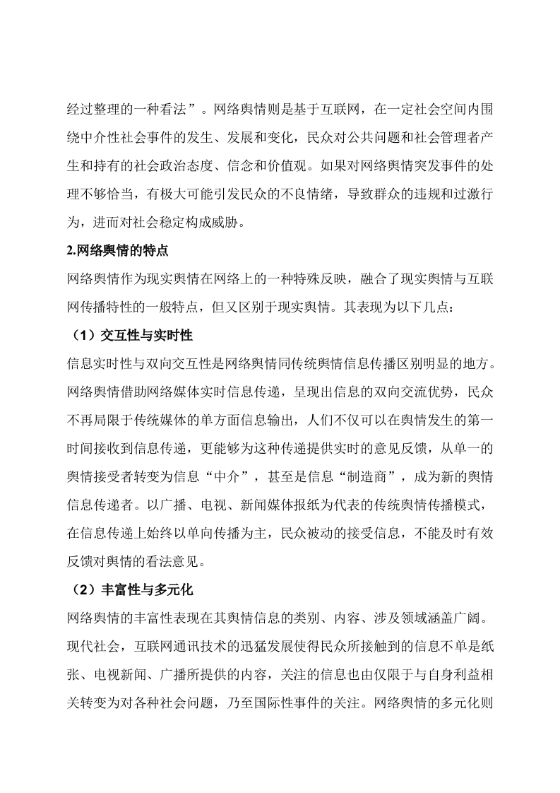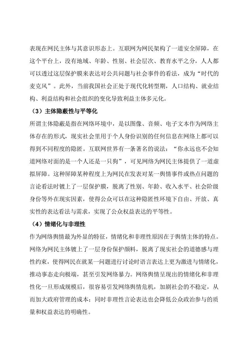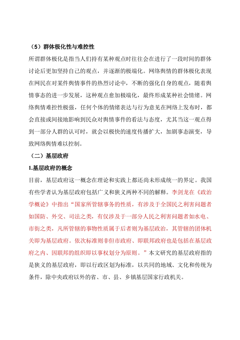 摘要:随着互联网的迅速普及和公众民主意识的日益高涨,网络逐渐成为现代社会中人们表达政治意见、与政府互动交流的重要平台。交流中会产生许多舆论场,与政府主流媒体声音不一致或者相违背,由此形成的网络舆情对基层政府公信力是一种挑战,更是一种机遇。政府公信力是基层政府的形象,也是基层政府为民服务的软实力,网络舆情环境中维护和提升基层政府公信力意义重大,影响深远。通过案例梳理,可以看到近年来基层政府在处理网络舆情事件中己经有了明显的进步和发展,早期行政主导型的理念正在悄然转变。本文依据现代政府“以人为本”、“公开透明”的理念以及党的十八大以来,尤其是五中全会重点提出的“构建全民共建共享社会治理格局”的重要精神,针对网络舆情环境下基层政府公信力的问题,提出基层政府应树立正确服务理念、加强法治和责任政府建设、规范信息公开、加强公众与网民互动、规范网络生态秩序、加强网络舆情应对,为基层政府公信力提升铺平道路。关键词:网络舆情:信息:媒体一、相关概念阐述(一)网络奥情1.网络奥情的概念网络是继广播、报刊杂志、电视电影之后的又一新兴媒体,网络以其自身有别于传统媒体的特殊优势,目前正处于一个青出于蓝而胜于蓝的阶段。所谓舆情,根据美国报业巨子、舆情学奠基人一沃尔特·李普曼在其著作《舆情学》中写到的,“舆情基本上就是对一些事实从道义上加以解释和经过整理的一种看法”。网络舆情则是基于互联网,在一定社会空间内围绕中介性社会事件的发生、发展和变化,民众对公共问题和社会管理者产生和持有的社会政治态度、信念和价值观。如果对网络舆情突发事件的处理不够恰当,有极大可能引发民众的不良情绪,导致群众的违规和过激行为,进而对社会稳定构成威胁。2.网络奥情的特点网络舆情作为现实舆情在网络上的一种特殊反映,融合了现实舆情与互联网传播特性的一般特点,但又区别于现实舆情。其表现为以下几点:(1)交互性与实时性信息实时性与双向交互性是网络舆情同传统舆情信息传播区别明显的地方。网络舆情借助网络媒体实时信息传递,呈现出信息的双向交流优势,民众不再局限于传统媒体的单方面信息输出,人们不仅可以在舆情发生的第一时间接收到信息传递,更能够为这种传递提供实时的意见反馈,从单一的舆情接受者转变为信息“中介”,甚至是信息“制造商”,成为新的舆情信息传递者。以广播、电视、新闻媒体报纸为代表的传统舆情传播模式,在信息传递上始终以单向传播为主,民众被动的接受信息,不能及时有效反馈对舆情的看法意见。(2)丰富性与多元化网络舆情的丰富性表现在其舆情信息的类别、内容、涉及领域涵盖广阔。现代社会,互联网通讯技术的迅猛发展使得民众所接触到的信息不单是纸张、电视新闻、广播所提供的内容,关注的信息也由仅限于与自身利益相关转变为对各种社会问题,乃至国际性事件的关注。网络舆情的多元化则表现在网民主体与其意识形态上。互联网为网民架构了一道安全屏障,在这个平台上,没有地域、年龄、性别、社会层次、教育水平之分,人人都可以透过这层保护膜来表达对公共问题与社会事件的看法,成为“时代的麦克风”。此外,当前我国社会正处于现代化转型期,人口结构、就业结构、利益结构和社会组织的变化导致利益主体多元化。(3)主体隐蔽性与平等化所谓主体隐蔽是指在网络环境中,是以图像、音频、电子文本作为网络主体存在的形式,现实社会里用于个人身份识别的任何信息在网络上都可以得到不同程度的隐匿。互联网世界有一条著名的说法:“你永远也不会知道网络对面的是一个人还是一只狗”,可见网络为网民主体提供了一道虚拟屏障。这种屏障某种程度上为网民在发表对某一舆情事件或热点问题的言论看法时镀上了一层保护膜,脱离了性别、年龄、收入水平、社会阶级身份等外在现实因素,使得公众可以在这种隐匿性环境下自由、开放、真实性的表达看法与需求,实现了公众权益表达的平等性。(4)情绪化与非理性作为网络舆情最为外显的特征,情绪化和非理性原因在于舆情主体的特点。网络为网民主体镀上了一层身份保护颜料,脱离了现实社会的道德感与理性约束,使得网民在就某一问题进行讨论时语言表达上更为激进与情绪化,推动事态走向极端,甚至引发网络暴力。网络舆情呈现出的情绪化和非理性化一旦形成规模后,很容易引发网络舆情危机,加剧社会的不稳定,从而加大政府管理的成本:同时非理性言论表达也会降低公众政治参与的质量和权益表达的明确性。(5)群体极化性与难控性所谓群体极化是指当人们持有某种观点时往往会在进行了一段时间的群体讨论后更加坚持自己的观点,并逐渐的极端化。网络舆情的群体极化表现在网民在对某件舆情事件的热烈讨论中,不断的强化自身的观点,随着舆情事态的进一步发展,这种观点愈加极端化,最终形成某种社会情绪。网络舆情难控性极强,任何个体的情绪表达与行为意见在网络上发布时,都会直接或间接地影响到民众对舆情事件的看法与态度,尤其当这一观点得到一部分人群的认可时,就会以极快的速度传播扩大,加剧事态演变,导致网络舆情难以控制。(二)基层政府1基层政府的概念目前,基层政府这一概念在理论