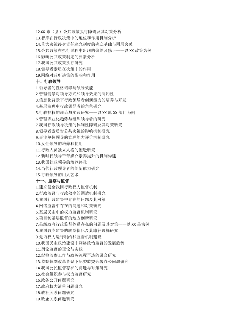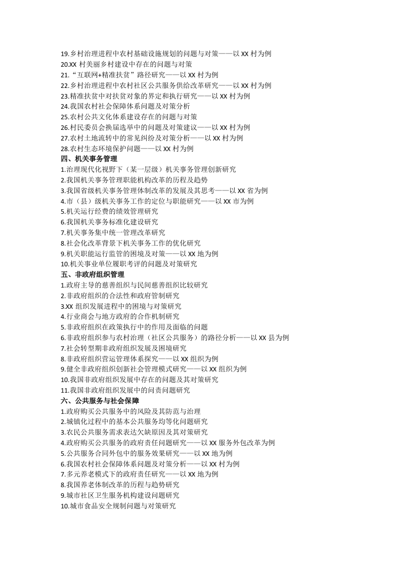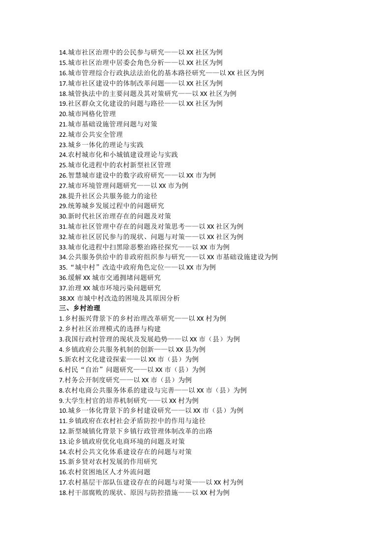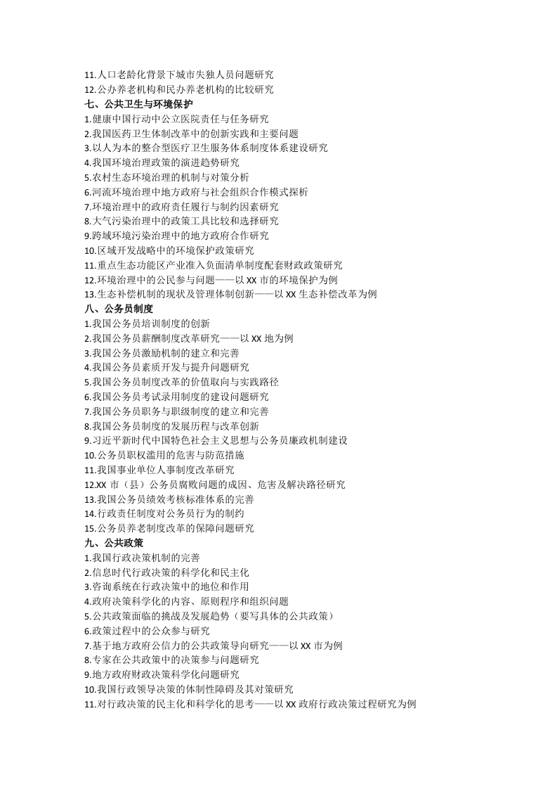 行政管理(本)毕业论文选题方向一、治理改革1.我国政府机构改革的困境与对策研究2.网络时代(某一特定人群)政治参与相关问题研究3X政府政务公开与政府形象(地方治理)(电子政务)(构建透明政府)问题研究4.大数据时代政府信息资源共享(政府形象)(社会治理创新)研究5.基于智慧政府视角下的地方政府行政效率提升的路径研究6.简政放权形势下的地方行政审批改革探析7.我国行政法制建设的完善及其途径8.对(某一类)行政许可危害的补救措施探讨9.地方治理中的行政许可制度创新研究10.行政审批制度的改革方向及其保障11.影响我国政府行政效率的主要因素及调适之道12.新公共管理理论对中国行政管理改革的影响与借鉴13.我国公共行政观念的发展与转变14.和谐视角下透明政府建设研究15.权力制约与反腐败机制问题研究16.社会转型中的我国行政协调机制变革研究17.地方政府优化营商环境的案例研究18.放管服改革存在的主要问题和对策一一以X地为例19.行政服务中心服务质量提升路径探析一一以x为例20.食品安全管控过程中的政府职能转变21.服务型政府的建设一一以政务大厅的建设和发展为例22.行政审批制度改革的现状、措施及发展方向23.目前我国地方政府财政困难的现状、成因与对策一一以X市为例24.市场经济条件下政府职能转变的思考一一以建设服务型政府为例25X地方政府制度创新与体制创新问题研究26.服务型政府绩效评估的探索一一基于F市服务型政府绩效评估的探索27.制度反腐与运动式反腐的比较研究28.政府部门之间的合作因境研究二、城市治理1.基于增长联盟的府际治理创新研究一一以x市为例2.城市文化与城市可持续发展研究一一以x市为例3.“城中村”政策的历史演变研究一一以双市为例4.我国城市化进程中的问题与对策一一以X市为例5.城市精细化管理的有效途径6.生态城市建设问题研究7.智慧城市发展的整体框架和路径研究8.智慧城市建设中的电子政府研究一一以x市为例9.城市社区建设与管理中存在的问题及对策研究一一以X市为例10.我国城市街道基层组织的建设一一以X市为例列11Xx市城中村改造的困境及其原因分析一一以x市为例12Xx市“城中村”改造中的政府角色研究13.城市治安存在问题及对策一一以X市为列14.城市社区治理中的公民参与研究一一以x社区为例15.城市社区治理中居委会角色分析一一以x社区为例16.城市管理综合行政执法法治化的基本路径研究一一以x社区为例17.城市社区建设中的体制改革问题一一以X社区为例18.城管执法中的主要问题及其对策研究一一以社区为例19.社区群众文化建设的问题与路径一一以X社区为例20.城市网格化管理21.城市基础设施管理问题与对策22.城市公共安全管理23.城乡一体化的理论与实践24.农村城市化和小城镇建设理论与实践25.城市化进程中的农村新型社区管理26.智慧城市建设中的数字政府研究一一以x市为例27.城市环境管理问题研究一一以双市为例28.提升社区公共服务能力的途径29.统筹城乡发展过程中的问题研究30.新时代社区治理存在的问题及对策31.城市社区管理中存在的问题及对策思考一一以X社区为伤列32.城市社区居民参与的现状、问题与对策一一以x社区为例33.城市化进程中扫黑除恶整治路径探究一一以双市为例34.公共服务供给中的非政府组织参与研究一一以x市基础设施建设为例35.“城中村”改造中政府角色定位一一以x市为例36.缓解X城市交通拥堵问题研究37.治理X城市环境污染问题研究38X市城中村改造的因境及其原因分析三、乡村治理1.乡村振兴背景下的乡村治理改革研究一一以X村为例2.乡村社区治理模式的选择与构建3.我国行政村管理的现状及发展趋势一一以X市(县)为例4.乡镇政府公共服务机制的创新一一以x县为例5.新农村文化建设探索一一以X市(县)为例6.村民“自治”问题研究一一以x市(县)为例7.村务公开制度研究一一以x市(县)为例8.农村电商公共服务体系的建设与完善一一以x市(县)为例9.大学生村宫的培养机制研究一一以x村为例10.城乡一体化背景下的乡村建设研究一一以x市(县)为例11.乡镇政府在农村社会矛盾防控中的作用与途径12.新型城镇化背景下乡镇行政管理体制改革的出路13.论乡镇政府优化电商环境的问题及对策14.农村公共文化体系建设存在的问题与对策15.新乡贤对农村发展的作用研究16.农村贫困地区人才外流问题17.农村基层干部队伍建设存在的问题与对策一一以Xx村为例18.村干部腐败的现状、原因与防控措施一一以x村为例19.乡村治理进程中农村基础设施规划的问题与对策一一以双X村为例20X村美丽乡村建设中存在的问题与对策21.“互联网+精准扶贫”路径研究一一以XX村为例22.乡村治理进程中农村社区公共服务供给改革研究一一以X村为列23.精准扶贫中对扶贫对象的界定和执行研究一一以双村为例24.我国农村社会保障体系问题及对策分析25.农村公共文化体系建设存在的问题与对策26.村民委员会换届选举中的问题及对策建议一一以X村为伤例27.农村土地流转中的常见纠纷及对策分析一一以x村为例28.农村生态环境保护问题一一以X村为例四、机关事务管理1.治理现代化视野下(某一层级)机关事务管理创新研究2.我国机关事务管理职能机构改革的历程及趋势3.我国省级机关事务管理体制改革的发展及其思考一一以X省为例4.市(县)级机关