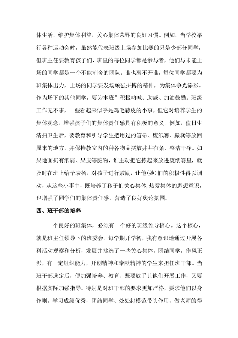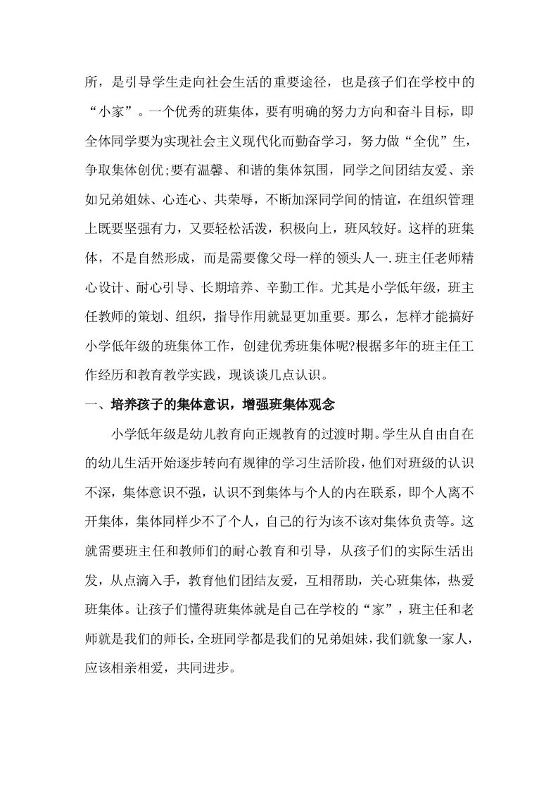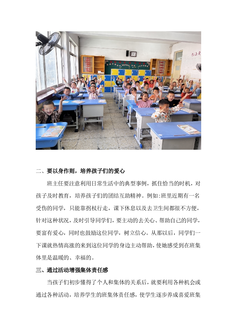 小学一年级优秀班集体阶段性发展的研究摘要:一个小学低年级优秀班集体的形成,需要教师,尤其是班主任付出长期而艰辛的努力。班主任要根据儿童年龄的心理特色和教育教学的客观规律,掌握科学的教育方法和切合实际的教育形式,培养学生的集体意识,增强孩子们的责任感,营造文明健康、积极向上的舆论氛围,培养孩子们关心集体、且人为乐的精神,这是培养小学优秀班集体不可缺少的重要内容,也是班主任应该考虑的几个方面。关键词:小学班集体培养一年级的孩子刚从幼儿升到小学,多少都带有娇气,都是那么天真、活泼、贪玩,学习对他们来说充满了挑战。要让他们一入学就喜欢上学习,如同天方夜谈。针对这种情况,我利用班会课组织学生学习《小学生守则》、《小学生日常行为规范》,对守则、规范逐条讲解对照,让学生“通过集体”、“在集体中”受到教育。在班容班貌、清洁卫生、公共财物、两操劳动、课堂纪律等方面都作了明确的规定,如每天勤剪指甲、集合队伍快静齐等,并提出了相应的措施,如教师不定期抽查,让抽查出来的规范示范员,享有检查的资格,去督促做的不够好的同学,这样,一批又一批的同学合格了,成为了行为标兵、榜样、带头人。一天一天,人人都有良好的习惯,班风班貌自然得到了发展。我经过细心研究,努力调动他们的积极性和自觉性,培养班级良好的学风,做出了巨大的努力。开展“比写字”“比读书”等活动,激发学生对学习兴趣。不到半学期,班级也形成了良好的学习氛围。班集体是孩子学习、生活的地方,是学生在校学习生活的集中场所,是引导学生走向社会生活的重要途径,也是孩子们在学校中的“小家”。一个优秀的班集体,要有明确的努力方向和奋斗目标,即全体同学要为实现社会主义现代化而勤奋学习,努力做“全优”生,争取集体创优:要有温馨、和谐的集体氛围,同学之间团结友爱、亲如兄弟姐妹、心连心、共荣辱,不断加深同学间的情谊,在组织管理上既要坚强有力,又要轻松活泼,积极向上,班风较好。这样的班集体,不是自然形成,而是需要像父母一样的领头人一.班主任老师精心设计、耐心引导、长期培养、辛勤工作。尤其是小学低年级,班主任教师的策划、组织,指导作用就显更加重要。那么,怎样才能搞好小学低年级的班集体工作,创建优秀班集体呢?根据多年的班主任工作经历和教育教学实践,现谈谈几点认识。一、培养孩子的集体意识,增强班集体观念小学低年级是幼儿教育向正规教育的过渡时期。学生从自由自在的幼儿生活开始逐步转向有规律的学习生活阶段,他们对班级的认识不深,集体意识不强,认识不到集体与个人的内在联系,即个人离不开集体,集体同样少不了个人,自己的行为该不该对集体负责等。这就需要班主任和教师们的耐心教育和引导,从孩子们的实际生活出发,从点滴入手,教育他们团结友爱,互相帮助,关心班集体,热爱班集体。让孩子们懂得班集体就是自己在学校的“家”,班主任和老师就是我们的师长,全班同学都是我们的兄弟姐妹,我们就象一家人,应该相亲相爱,共同进步。洛法角二、要以身作则,培养孩子们的爱心班主任要注意利用日常生活中的典型事例,抓住恰当的时机,对孩子及时教育,培养孩子们的团结互助精神。例如:班里近期有一名受伤的同学,只能靠拐杖行走,课下休息以及去卫生间都很不方便,针对这种状况,及时引导同学们,要主动的去关心、帮助自己的同学,要富有爱心,同时也鼓励这位同学,树立信心。从那以后,同学们一下课就热情高涨的来到这位同学的身边主动帮助,使她感受到在班集体里是温暖的、幸福的。三、通过活动增强集体责任感当孩子们初步懂得了个人和集体的关系后,就要利用各种机会或通过各种活动,培养学生的班集体责任感,使学生逐步养成喜爱班集体生活,维护集体利益,关心集体荣辱的良好习惯。例如,当学校举行各种运动会时,虽然能代表班级上场参加比赛的只是少部分同学,但班主任要教育孩子们,班里的每位同学都是参与者,他们与未能上场的同学都是一个不能割舍的团队。谁也离不开谁,每位同学都要为班集体出力,上场的同学要发场顽强拼搏的精神,为集体争光添彩。作为场下的其他同学,要为本班”积极呐喊、助威、加油鼓励。班级工作无不事,一些看起来似乎是鸡毛蒜皮的小事,但它对培养学生的集体观念,增强孩子们的集体责任感具有积极的意义。例如,值日生清扫卫生后,要教育和引导学生把用过的笤帚、废纸篓、撮箕等放回原来的地方,并保持教室内的种各物品摆放井井有条、整洁干净。如果地面扔有纸屑、果皮等脏物,谁主动把它拣起来放进废纸篓里,就及时在班上给予表扬,对孩子进行鼓励,让他(她)们的积极性得以调动,从这些小事中,既培养了孩子们关心集体,热爱集体的思想意识,也增强了同学们的集体责任感,营造了良好舆论氛围。四、班干部的培养一个良好的班集体,必须有一个好的班级领导核心。这个核心,就是班主任领导下的班委会。每学期开学初,我有意识地通过开展各科活动观察和分析,发展并挑选了一些关心集体,团结同学,作风正派,有一定组织能力,开创精神和奉献精神的学生来担任班干部。当班干部选定后,便加强培养、教育、既要放手让他们开展工作,又要根据实际加强指导。特别是对班干部的要求更