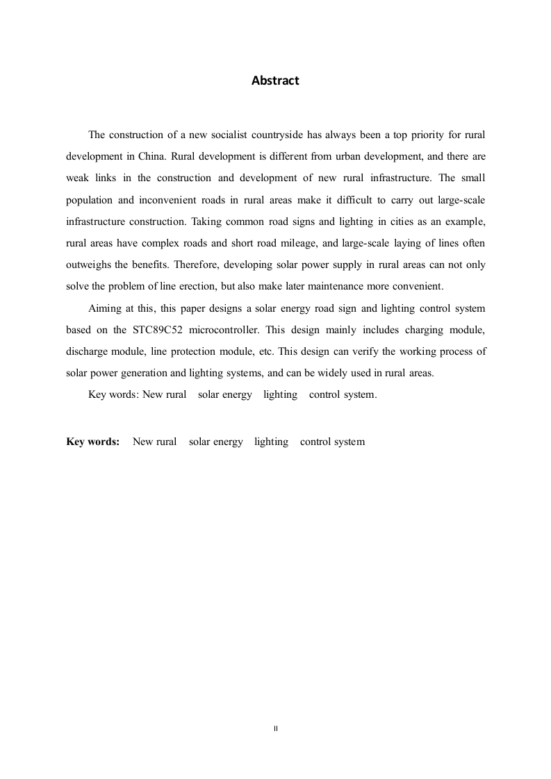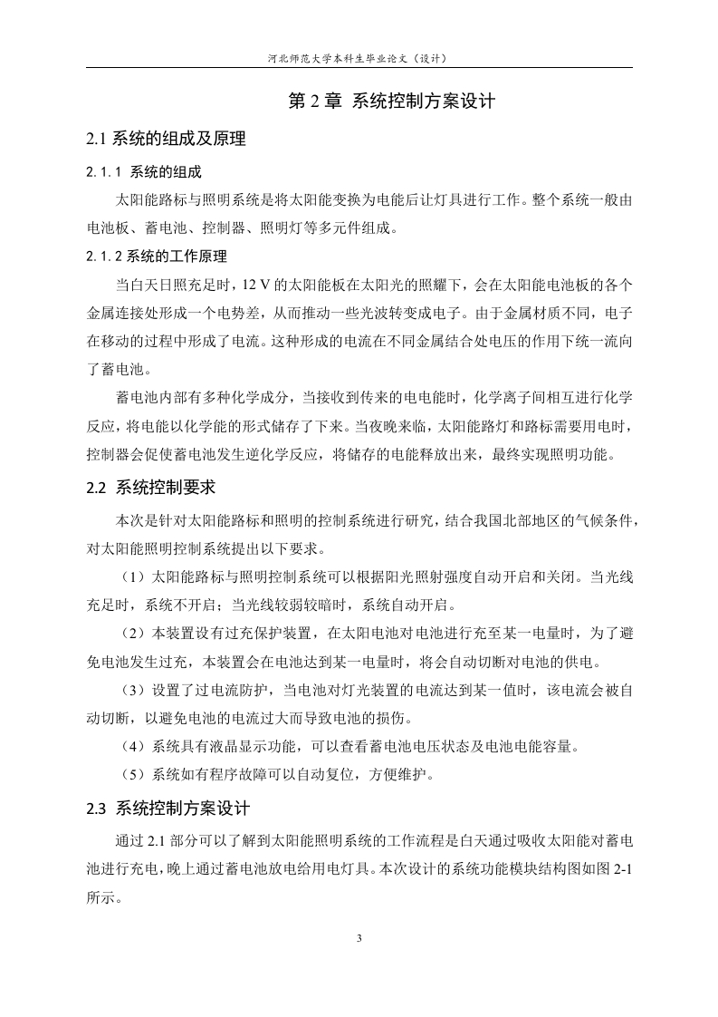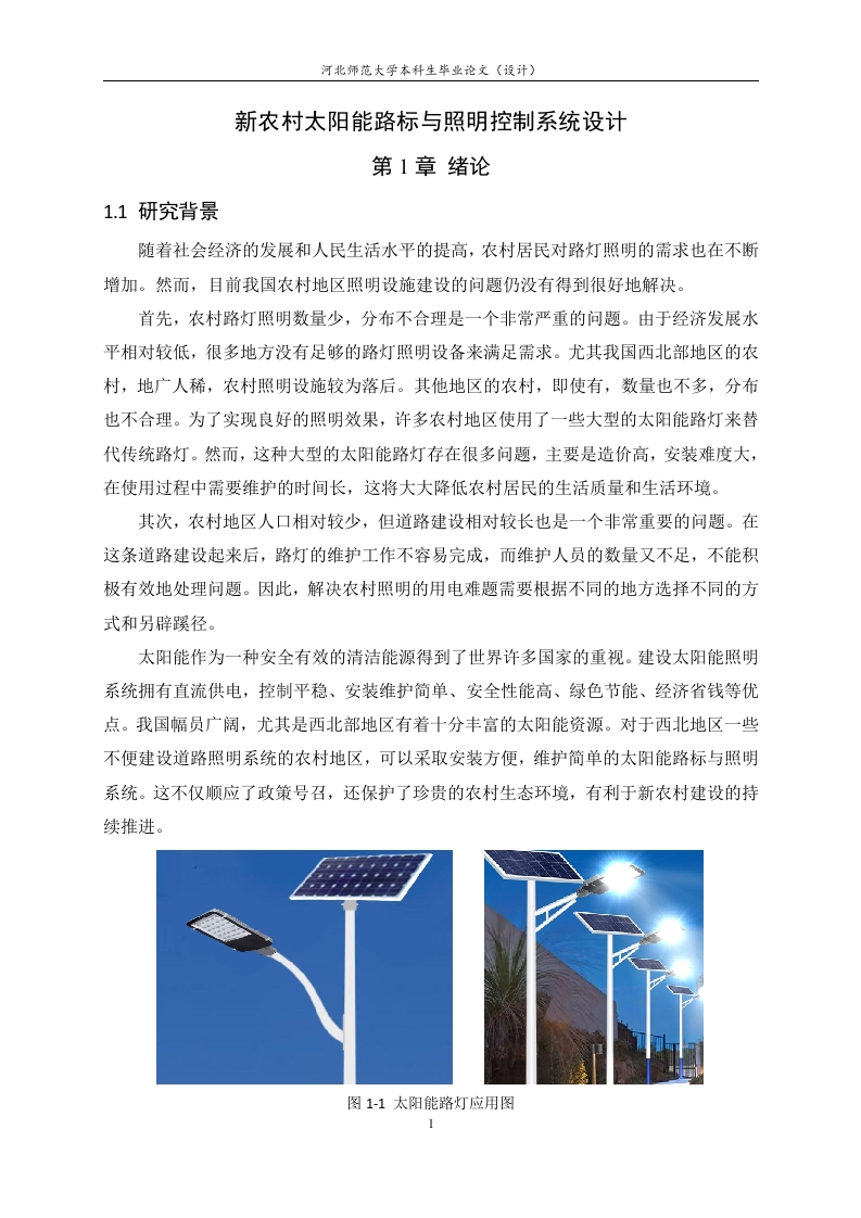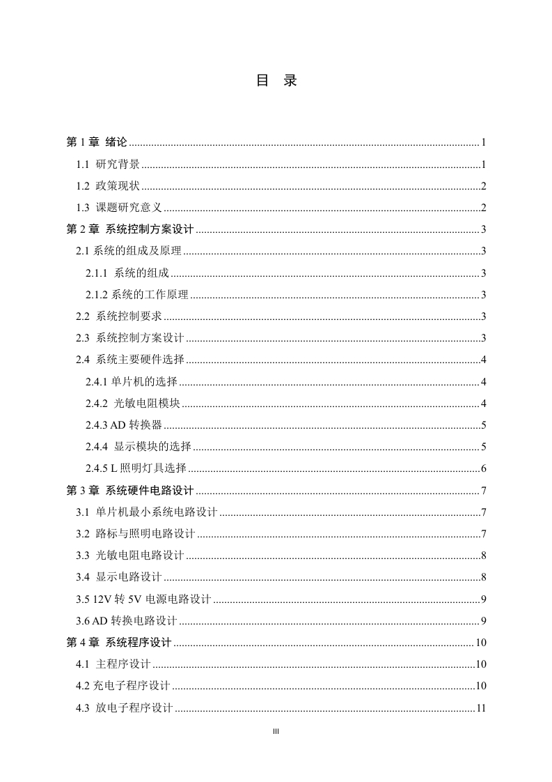 新农村太阳能路标与照明控制系统设计摘要社会主义新农村的建设一直是我国乡村发展的重要之事。乡村发展与城市发展有所区别,基础设施是新农村建设发展的重要环节。农村地区人口少、道路不便,很难开展大规模的基础设施建设。以城市常见的路标和照明为例,乡村地区道路复杂,道路里程较短,如果大规模铺设线路往往得不偿失,因此在乡村地区发展太阳能供电,不仅可以解决线路架设问题,后期维护也更加方便。针对于此,本文以STC89C52单片机为核心设计一款太阳能路标和照明的控制系统。太阳能路标与照明系统功能相似,都是利用太阳能转换为电能进行供电,本次研究的主要是控制系统,因此后文都以照明系统为例进行说明与研究。本次设计主要包括充电模块、放电模块、线路保护模块等。通过本次设计可以验证太阳能发电与照明系统的工作过程,可以大范围在农村地区推广使用。关键词:新农村太阳能照明控制系统AbstractThe construction of a new socialist countryside has always been a top priority for ruraldevelopment in China.Rural development is different from urban development,and there areweak links in the construction and development of new rural infrastructure.The smallpopulation and inconvenient roads in rural areas make it difficult to carry out large-scaleinfrastructure construction.Taking common road signs and lighting in cities as an example,rural areas have complex roads and short road mileage,and large-scale laying of lines oftenoutweighs the benefits.Therefore,developing solar power supply in rural areas can not onlysolve the problem of line erection,but also make later maintenance more convenient.Aiming at this,this paper designs a solar energy road sign and lighting control systembased on the STC89C52 microcontroller.This design mainly includes charging module,discharge module,line protection module,etc.This design can verify the working process ofsolar power generation and lighting systems,and can be widely used in rural areas.Key words:New rural solar energy lighting control system.Key words:New rural solar energy lighting control system目录第1章绪论1.1研究背景.…1.2政策现状.21.3课题研究意义..2第2章系统控制方案设计.32.1系统的组成及原理..2.1.1系统的组成32.1.2系统的工作原理.32.2系统控制要求.32.3系统控制方案设计.32.4系统主要硬件选择.42.4.1单片机的选择」2.4.2光敏电阻模块..42.4.3AD转换器52.4.4显示模块的选择.2.4.5L照明灯具选择..6第3章系统硬件电路设计.73.1单片机最小系统电路设计.73.2路标与照明电路设计.73.3光敏电阻电路设计….83.4显示电路设计.83.512V转5V电源电路设计.93.6AD转换电路设计..9第4章系统程序设计.104.1主程序设计…104.2充电子程序设计..104.3放电子程序设计4.4保护子程序.124.5调试与运行.134.5.1实物展示…134.5.2运行效果.13总结..15致谢….1么