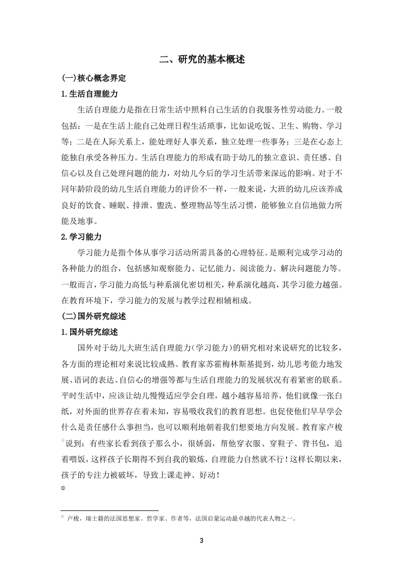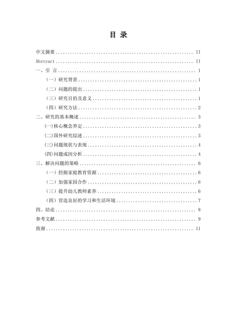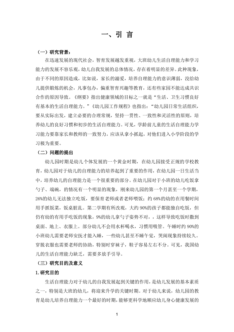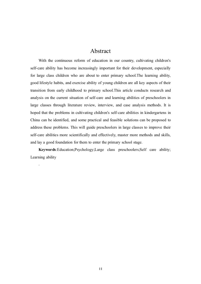 幼儿园大班自理能力(学习能力)现状及问题分析中文摘要随着我国教育的不断改革,培养幼儿的自理能力对幼儿的发展变得越来越重要,尤其是对于即将步入小学的大班幼儿来说。幼儿的学习能力、良好的生活习惯以及运动能力等都是幼儿在幼小衔接工作的重点内容之一。本文通过采用文献法、访谈法和案例分析法等对大班幼儿的自理能力以及学习能力的现状进行了研究和分析,希望能够找到目前我国幼儿园在培养幼儿自理能力方面存在的问题,并且针对存在的问题提出一些切实可行的解决策略,更加科学有效地引导大班幼儿提升自身的自理能力,掌握更多的方法和技巧,为幼儿步入小学阶段奠定一个良好的基础。关键词:教育学,心理学,大班幼儿,生活自理能力,学习力AbstractWith the continuous reform of education in our country,cultivating children'sself-care ability has become increasingly important for their development,especiallyfor large class children who are about to enter primary school.The learning ability,good lifestyle habits,and exercise ability of young children are all key aspects of theirtransition from early childhood to primary school.This article conducts research andanalysis on the current situation of self-care and learning abilities of preschoolers inlarge classes through literature review,interview,and case analysis methods.It ishoped that the problems in cultivating children's self-care abilities in kindergartens inChina can be identified,and some practical and feasible solutions can be proposed toaddress these problems.This will guide preschoolers in large classes to improve theirself-care abilities more scientifically and effectively,master more methods and skills,and lay a good foundation for them to enter the primary school stage.Keywords:Education;Psychology;Large class preschoolers;Self care ability;Learning ability1川111目录中文摘要....IIAbstract.…··11一、引言.…(一)研究背景……1(二)问题的提出..1(三)研究目的及意义(四)研究方法二、研究的基本概述..·3(一)核心概念界定.…(二)国外研究综述..·(三)问题现状与表现..……4(四)问题成因分析...三、解决问题的策略....6(一)挖掘家庭教育资源..·(二)加强家园合作..(三)提升幼儿教师素养....(四)营造良好的学习和生活环境..7四、结论…8参考文献.....致谢…11