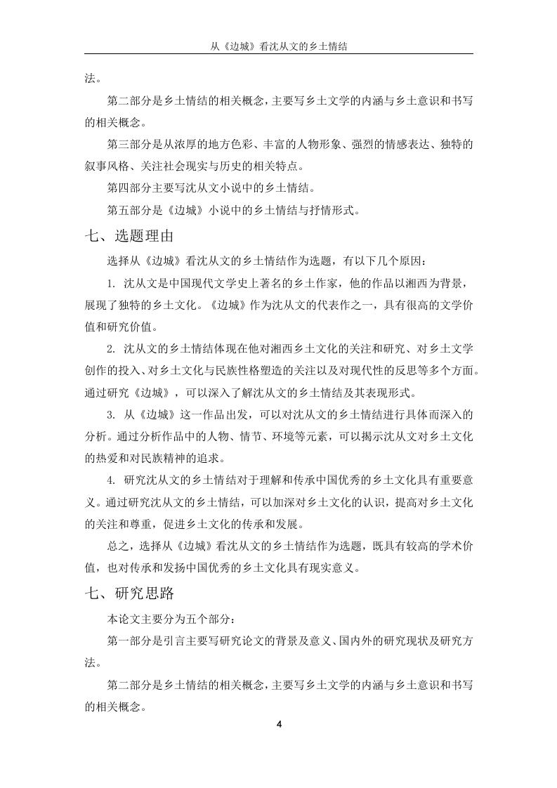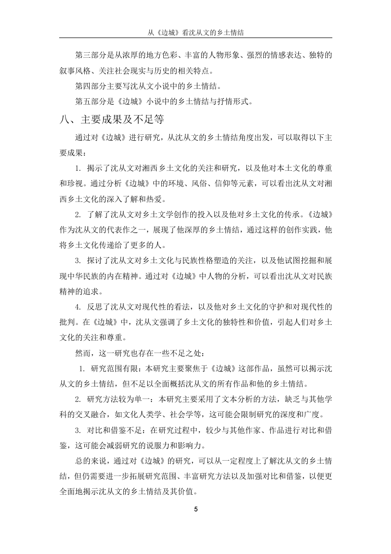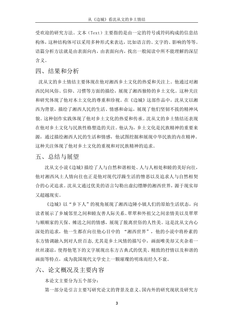 从《边城》看沈从文的乡土情结从《边城》看沈从文的乡土情结自我介绍尊敬的老师,亲爱的同学们:大家好!我是来自汉语言文学专业的赵家兰,非常荣幸能在这里进行我的毕业论文答辩。在此,我要感谢各位老师在百忙之中抽出时间来参加我的答辩,感谢你们对我的指导和帮助。我的毕业论文题目是《从《边城》看沈从文的乡土情结》,指导老师是谭赤子老师。在撰写这篇论文的过程中,我围绕沈从文的乡土情结,从文化人类学视角、乡土文学创作、乡土文化与民族性格塑造以及乡土情结与现代性反思等方面进行了深入研究。通过分析《边城》这部作品,我力求揭示沈从文对乡土文化的关注和热爱,以及他对民族精神的追求。在论文撰写过程中,我收获了很多。首先,我对沈从文的乡土情结有了更深刻的理解,对他的作品也有了更深入的了解。其次,我在研究方法上也有所提高,学会了如何运用不同的研究方法来分析文学作品。最后,通过这次论文写作,我锻炼了自己的独立思考能力和创新能力。然而,我也深知自己的论文还有许多不足之处。比如,研究范围有限,研究方法较为单一,对比和借鉴不足等。在今后的学习和工作中,我会努力改进这些问题,不断提高自己的学术水平。再次感谢各位老师和同学的参与和支持。在接下来的答辩过程中,我会认真听取各位老师的意见和建议,努力完善我的论文。谢谢大家!一、背景及意义沈从文的《边城》通过其深刻的乡土情结,呈现出了对中国农村生活的深刻理解和情感表达。这部小说背景设定在中国南方的小镇,充满了浓厚的乡土氛围,其意义在于通过对乡土生活的刻画,深刻反映了中国农村社会的文化、传统、价值观念以及人际关系,进一步探讨了乡土与现代化之间的冲突和融合。通过研究《边城》,可以更好地理解沈从文作为一位文学巨匠,如何以独特的文学语言和情感深度,表达对乡土情感的热爱,同时也揭示了乡土情结在中国文化中的重要地位,以及其对中国文学和社会的持久影响。此外,研究乡土情结也有助于深入从《边城》看沈从文的乡土情结了解中国现代文学的演变和中国社会变革的历史进程。二、理论基础和研究框架沈从文的乡土情结主要体现在他对湘西乡土文化的热爱和关注上。《边城》作为沈从文的代表作之一,充分展示了他深厚的乡土情结。从理论基础和研究框架来看,可以从以下几个方面探讨沈从文的乡土情结:1.文化人类学视角:从文化人类学的角度来看,沈从文的乡土情结体现在他对湘西乡土文化的关注和研究。他通过对湘西民间风俗、信仰、习惯等方面的描绘,展现了湘西独特的乡土文化。这种关注和研究体现了他对本土文化的尊重和珍视。2.乡土文学创作:沈从文的乡土情结还体现在他的文学创作中。他以湘西为背景,创作了一系列乡土小说,如《边城》《长河》等。这些作品描绘了湘西人民的生活、情感和命运,展现了他们坚韧不拔的精神风貌。这种创作实践体现了他对乡土文化的热爱和传承。3.乡土文化与民族性格塑造:沈从文的乡土情结还表现在他对乡土文化与民族性格塑造的关注。他认为,乡土文化是民族精神的重要来源,通过描绘湘西人民的生活和情感,他试图挖掘和展现中华民族的内在精神。这种关注体现了他对乡土文化的重视和对民族精神的追求。综上所述,沈从文的乡土情结可以从文化人类学视角、乡土文学创作、乡土文化与民族性格塑造以及乡土情结与现代性反思等方面来探讨。这些理论基础和研究框架有助于我们更深入地理解沈从文的乡土情结及其作品的价值。三、对象和方法1.研究对象沈从文的《边城》小说2.研究方法文献研究法:查阅相关文献资料,了解和研究相关理论知识。通过查阅图书馆里的相关书籍和文献,利用知网等渠道搜索查询相关的资料,并进行了研读和分析,这就为后文的案例分析提供了理论基础。文本分析法。文本分析作为一种有效的研究手段,已成为当今文化研究中最2从《边城》看沈从文的乡土情结受欢迎的研究方法。文本(Txt)主要指的是由一定的符号或符码构成的信息结构体,这种结构体可以采用多种形式来表达,比如语言的、文字的、影响的等等。语篇分析方法就是由表面向内,由表面向内,找出一般阅读中所不能理解的深层含义。四、结果和分析沈从文的乡土情结主要体现在他对湘西乡土文化的热爱和关注上。他通过对湘西民间风俗、信仰、习惯等方面的描绘,展现了湘西独特的乡土文化。这种关注和研究体现了他对本土文化的尊重和珍视。在《边城》这部作品中,沈从文以湘西为背景,描绘了湘西人民的生活、情感和命运,展现了他们坚韧不拔的精神风貌。这种创作实践体现了他对乡土文化的热爱和传承。沈从文的乡土情结还表现在他对乡土文化与民族性格塑造的关注。他认为,乡土文化是民族精神的重要来源,通过描绘湘西人民的生活和情感,他试图挖掘和展现中华民族的内在精神。这种关注体现了他对乡土文化的重视和对民族精神的追求。五、总结与展望沈从文小说《边城》描绘了人与自然和谐相处、人与人相处和睦的美好向往,他对湘西风土人情向往也正是他对现代浮躁生活的憎恶以及追求人与自然相契合的心灵追求。沈从文通过优美的语言勾勒出虚幻缥缈的湘西世界,源于现实却又超越现实。《边城》以“乡