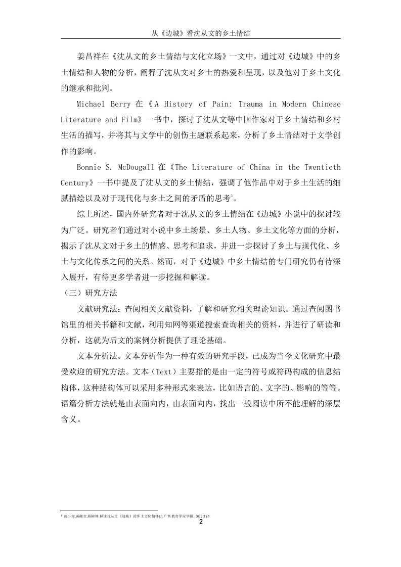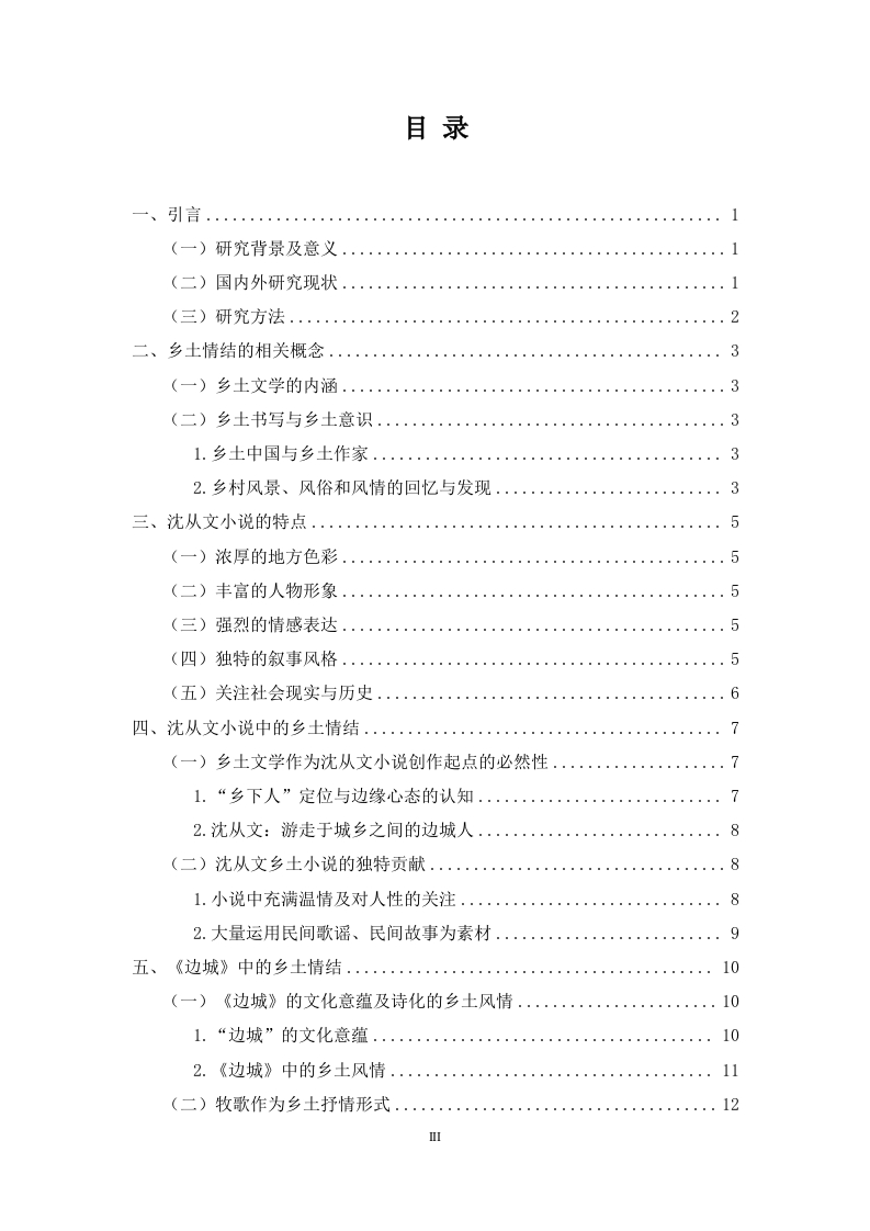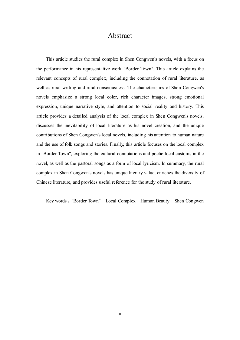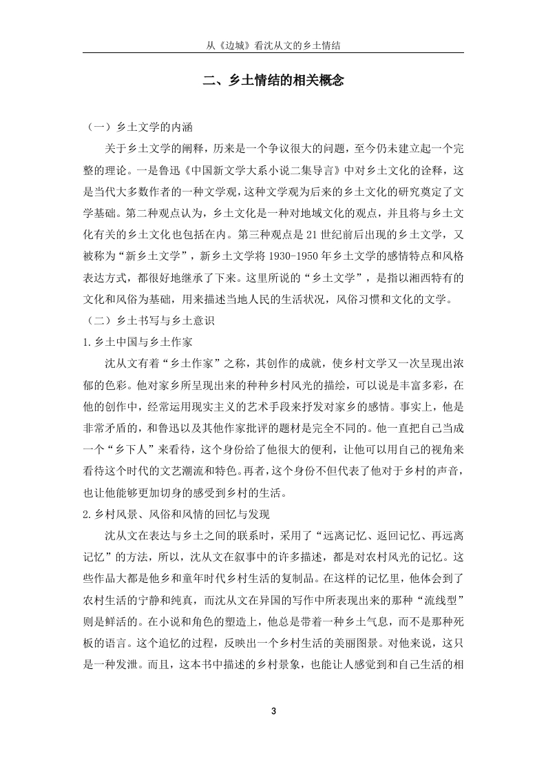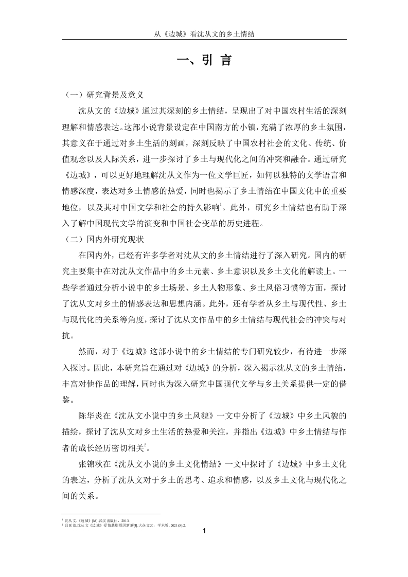 从《边城》看沈从文的乡土情结中文摘要本文研究沈从文小说中的乡土情结,重点关注了他的代表作《边城》中的表现。本文解释乡土情结的相关概念,包括乡土文学的内涵以及乡土书写与乡土意识。沈从文小说的特点部分强调了浓厚的地方色彩、丰富的人物形象、强烈的情感表达、独特的叙事风格以及对社会现实和历史的关注。本文详细分析沈从文小说中的乡土情结,讨论乡土文学作为他小说创作的必然性,以及沈从文乡土小说的独特贡献,包括对人性的关注和对民间歌谣、民间故事的运用。最后,本文重点关注《边城》中的乡土情结,探讨了小说中的文化意蕴和诗化的乡土风情,以及牧歌作为乡土抒情的形式。综上所述,沈从文小说中的乡土情结具有独特的文学价值,丰富了中国文学的多样性,也为乡土文学的研究提供了有益的参考。关键词:《边城》,乡土情结,人性美,沈从文AbstractThis article studies the rural complex in Shen Congwen's novels,with a focus onthe performance in his representative work "Border Town".This article explains therelevant concepts of rural complex,including the connotation of rural literature,aswell as rural writing and rural consciousness.The characteristics of Shen Congwen'snovels emphasize a strong local color,rich character images,strong emotionalexpression,unique narrative style,and attention to social reality and history.Thisarticle provides a detailed analysis of the local complex in Shen Congwen's novels,discusses the inevitability of local literature as his novel creation,and the uniquecontributions of Shen Congwen's local novels,including his attention to human natureand the use of folk songs and stories.Finally,this article focuses on the local complexin "Border Town",exploring the cultural connotations and poetic local customs in thenovel,as well as the pastoral songs as a form of local lyricism.In summary,the ruralcomplex in Shen Congwen's novels has unique literary value,enriches the diversity ofChinese literature,and provides useful reference for the study of rural literature.Key words:"Border Town"Local Complex Human Beauty Shen Congwen目录一、引言…(一)研究背景及意义..(二)国内外研究现状..(三)研究方法......2二、乡土情结的相关概念...3(一)乡土文学的内涵....(二)乡土书写与乡土意识..……31.乡土中国与乡土作家..32.乡村风景、风俗和风情的回忆与发现.........3三、沈从文小说的特点..5(一)浓厚的地方色彩....。…5(二)丰富的人物形象....……5(三)强烈的情感表达..5(四)独特的叙事风格...。(五)关注社会现实与历史...6四、沈从文小说中的乡土情结…7(一)乡土文学作为沈从文小说创作起点的必然性..71.“乡下人”定位与边缘心态的认知...·72.沈从文:游走于城乡之间的边城人..·8(二)沈从文乡土小说的独特贡献.....1.小说中充满温情及对人性的关注...82.大量运用民间歌谣、民间故事为素材.……9五、《边城》中的乡土情结…10(一)《边城》的文化意蕴及诗化的乡土风情...…101.“边城”的文化意蕴.…102.《边城》中的乡土风情.....11(二)牧歌作为乡土抒情形式....…….12结论13参考文献.14致谢.15v