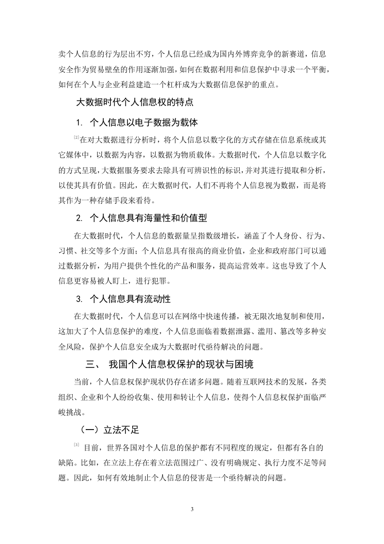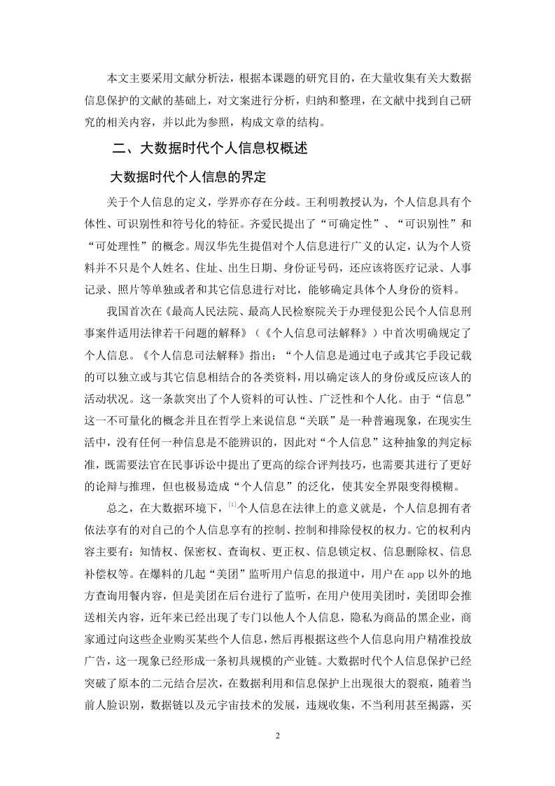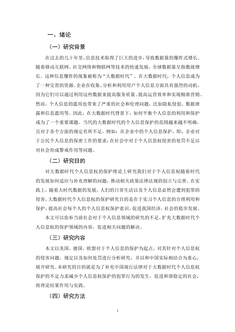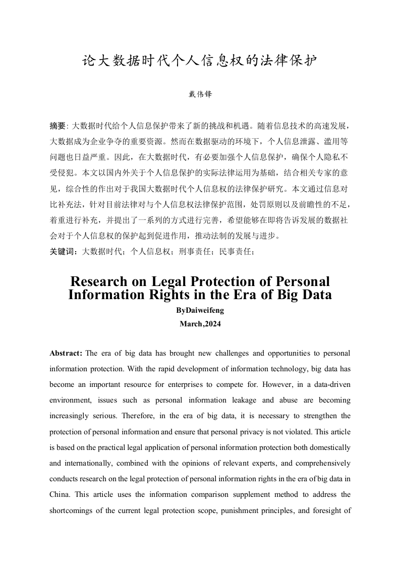 目录一、绪论(一)研究背景……(二)研究目的...........1(三)研究内容(四)研究方法.....二、大数据时代个人信息权概述.2(一)大数据时代个人信息的界定…2(二)大数据时代个人信息权的特点.……三、我国个人信息权保护的现状与困境.3(一)立法不足3(二)对大数据的监管不力…(三)企业自律与个人保护意识不足........4(四)司法救济困境.....四、域外及有关地区个人信息权法律保护现状及其启示.5(一)美国碎片化保护.5(二)欧盟综合保护.…5(三)德国立法保护.…6(四)域外个人信息法律保护对我国的启示.....6五、完善我国个人信息权保护建议7(一)完善大数据时代个人信息的前置性法规7(二)加强社会规范,实现有效的事前预防...·8(三)对于侵害个人信息的处罚范围及程度的界定....9(四)建立奖励机制.……·9结语………致谢.…论大数据时代个人信息权的法律保护戴伟锋摘要:大数据时代给个人信息保护带来了新的挑战和机遇。随着信息技术的高速发展,大数据成为企业争夺的重要资源。然而在数据驱动的环境下,个人信息泄露、滥用等问题也日益严重。因此,在大数据时代,有必要加强个人信息保护,确保个人隐私不受侵犯。本文以国内外关于个人信息保护的实际法律运用为基础,结合相关专家的意见,综合性的作出对于我国大数据时代个人信息权的法律保护研究。本文通过信息对比补充法,针对目前法律对与个人信息权法律保护范围,处罚原则以及前瞻性的不足,着重进行补充,并提出了一系列的方式进行完善,希望能够在即将告诉发展的数据社会对于个人信息权的保护起到促进作用,推动法制的发展与进步。关键词:大数据时代:个人信息权:刑事责任:民事责任:Research on Legal Protection of PersonalInformation Rights in the Era of Big DataByDaiweifengMarch,2024Abstract:The era of big data has brought new challenges and opportunities to personalinformation protection.With the rapid development of information technology,big data hasbecome an important resource for enterprises to compete for.However,in a data-drivenenvironment,issues such as personal information leakage and abuse are becomingincreasingly serious.Therefore,in the era of big data,it is necessary to strengthen theprotection of personal information and ensure that personal privacy is not violated.This articleis based on the practical legal application of personal information protection both domesticallyand internationally,combined with the opinions of relevant experts,and comprehensivelyconducts research on the legal protection of personal information rights in the era ofbig data inChina.This article uses the information comparison supplement method to address theshortcomings of the current legal protection scope,punishment principles,and foresight ofpersonal information rights.It focuses on supplementing and proposes a series of ways toimprove,hoping to promote the protection of personal information rights in the upcoming datasociety and promote the development and progress of the legal system.Keywords:In the era of big data;Personal information rights;Criminal responsibility;Civilliability;一、绪论(一)研究背景在过去的几十年里,信息技术取得了巨大的进步,导致数据量的爆炸式增长。随着移动互联网、社交网络和物联网等技术的快速发展,全球数据量呈指数级增长。这种信息爆炸的现象被称为“大数据时代”。在大数据时代,个人信息成为了一种宝贵的资源。企业在收集、分析和利用用户个人信息方面具有强烈的动机,因为它们可以通过利用这些数据来提高服务质量、提高运营效率和实现精准营销。然而,个人信息的滥用也带来了严重的社会和伦理问题,比如隐私侵犯、数据泄露和信息滥用等。因此,在大数据时代背景下,如何平衡个人信息的利用和保护成为了一个重要课题。当代的大数据时代的个人信息保护的范围越来越不明确,且对于各个方面的规定有所不足,例如:在企业中的个人信息保护,即:企业对于公民个人信息的保密工作的要求:在社会中对于个人信息权侵害的处罚不足以对社会形成警戒作用等问题。(二)研究目的对大数据时代个人信息权的保护理论上研究我们对于个人信息权随着时代的发展如何适应与补充理解的问题,推动相关政策法律法规的创立与完善。在实践上,随着大时代数据的发展,人们的日常生活以及个人信息必然会遭到犯罪的侵害,大数据时代个人信息权的保护研究目的是在于实习个人信息的合理利用和保护,提高社会每个人的个人信息权保护意识,促进我国经济,社会的稳步发展。本文可以弥补当前社会对于个人信息领域的研究的不足,扩充大数据时代个人信息权的保护领域的内容,促进相关问题的解决。(三)研究内容本文以美国,德国,欧盟对于个人信息的保护为起点,对其针对个人信息权的侵害问题,规定以及如何处罚进行分析研究,并以和中国实际相结合为重心,展开研究。本研究的目的就是为了补充中国现行法律对于大数据时代个人信息权保护的不足力求减少个人信息权保护的犯罪行为的发生,促进和谐稳定的社会,将理论结果作用与实践。(四)研究方法