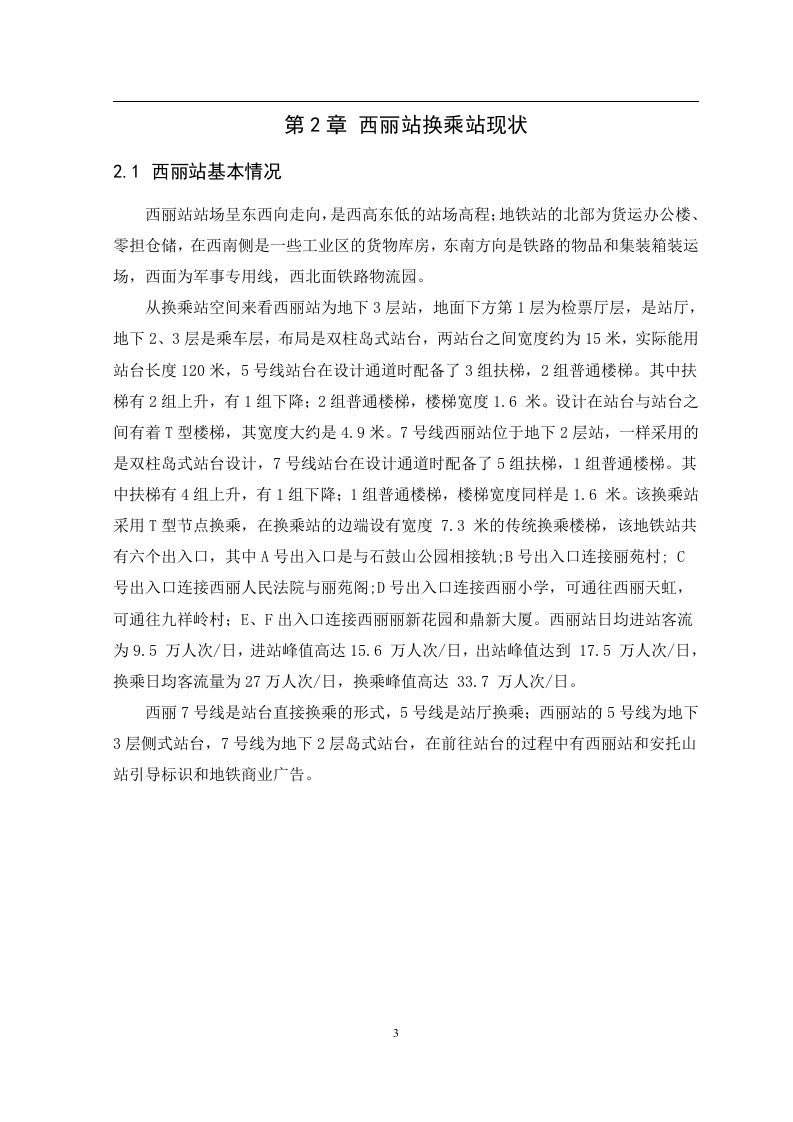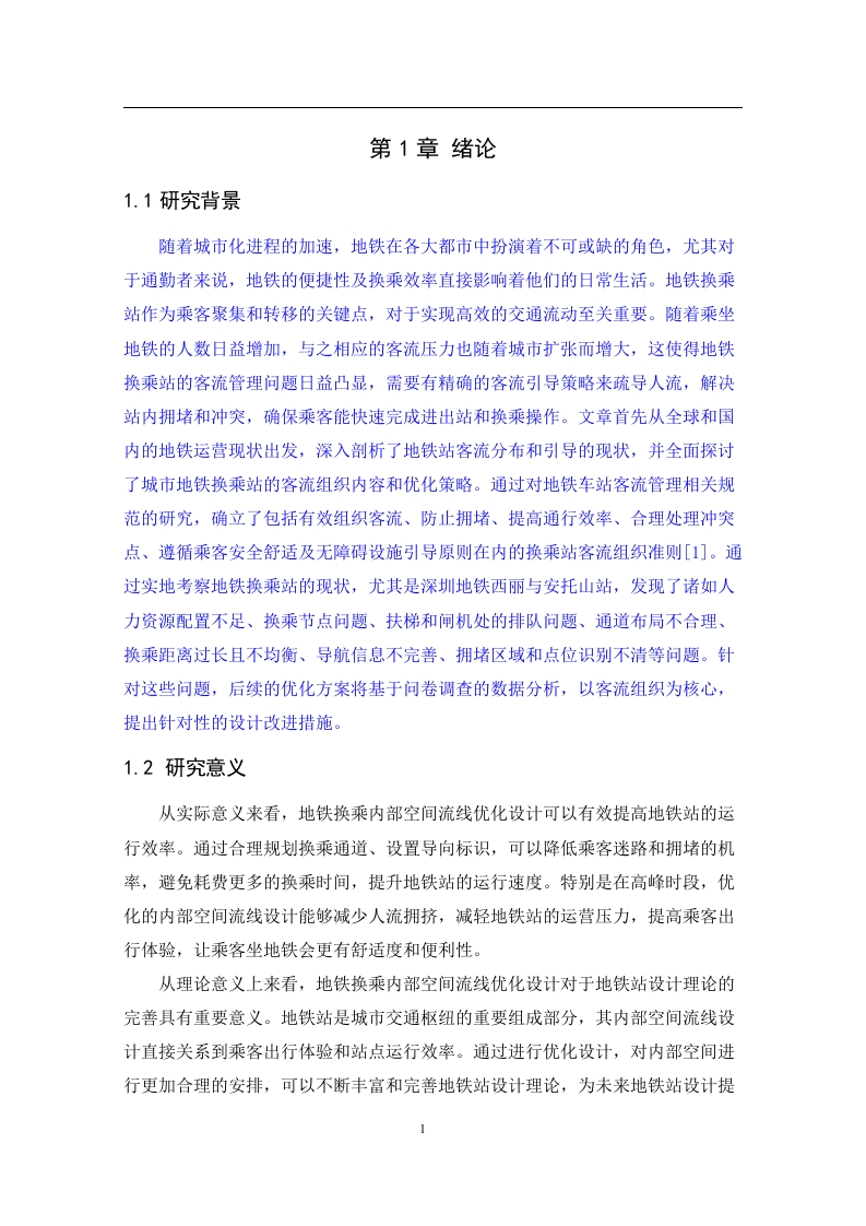 地铁换乘内部空间流线优化设计一以深圳西丽站为例摘要深圳地铁作为这座城市的脉络,其高效运营对于市民日常生活至关重要。本文以深圳地铁为核心议题,首先明确了研究的焦点一一当前深圳地铁的运营状况及其背后的社会需求,强调了探讨这一主题的现实意义。随后,我们采取定量与定性相结合的方法,通过设计并实施深入的问卷调查,同时剖析地铁站换乘站设计的内部细节和通行模式,深入挖掘空间利用和乘客流动模式的特性。此外,本文还广泛审视了国内地铁发展的前沿案例,旨在汲取经验教训,为深圳地铁的改进提供策略参考。基于调研数据和实证分析,我们针对西丽站的空间配置、流线组织存在的问题,提出了针对性的优化建议。这些改进涉及站厅布局、人流导向、设施配备以及安全性考量等多个层面,旨在提升乘客的出行体验,优化整体空间利用效率。总之,本文旨在通过深度研究和实践探索,推动深圳地铁的内部空间和流线设计向更人性化、高效化的方向发展。关键词:地铁换乘站:空间流线优化:空间布局ABSTRACTAs the backbone of this city,the efficient operation of Shenzhen Metro is crucialfor the daily lives of citizens.This article focuses on the Shenzhen Metro as the coretopic,first clarifying the research focus-the current operational status of the ShenzhenMetro and its underlying social needs,emphasizing the practical significance ofexploring this topic.Subsequently,we adopted a combination of quantitative andqualitative methods to design and implement in-depth questionnaire surveys,whileanalyzing the internal details and traffic patterns of subway station transfer stationdesign,and delving into the characteristics of space utilization and passenger flowpatterns.In addition,this article also extensively examines cutting-edge cases ofdomestic subway development,aiming to draw lessons and provide strategic referencesfor the improvement of Shenzhen Metro.Based on research data and empirical analysis,we have proposed targeted optimization suggestions for the spatial configuration andstreamline organization of Xili Station.These improvements involve multiple aspectssuch as station hall layout,pedestrian flow guidance,facility configuration,and safetyconsiderations,aiming to enhance passenger travel experience and optimize overallspace utilization efficiency.In summary,this article aims to promote the development ofShenzhen Metro's internal space and flow design towards a more humane and efficientdirection through in-depth research and practical exploration.Key words:Subway transfer station;optimization of spatial streamline;spatial layout目录第1章绪论.....…1.1研究背景......1.2研究意义....21.3研究的内容...1.3.1实地调研法21.3.2文献资料法.....第2章西丽站换乘站现状....2.1西丽站基本情况...2.2西丽站站台形式...62.3西丽站换乘布局......2.3.17号线换乘5号线..72.3.25号线换乘7号线..8第3章问卷结果与分析..·..93.1问卷调查设计依据.93.1.1问卷的设计与发放..3.2问卷信度分析..93.3问卷调查结果分析...…..103.4基于问卷调查结果主要影响因子分析............15第4章结论及其改进措施..174.1主要结论.....174.2改进措施.。174.2.1站台形式与换乘布局...........184.2.2换乘设施与客流组织...184.2.3进一步完善乘客流引导措施..................194.2.4加强重点区域监督力度....…224.2.5具体实例研究应对大客流的组织措施...22第5章创新与展望.。….235.1研究创新点.....235.2不足与展望...23参考文献.24致