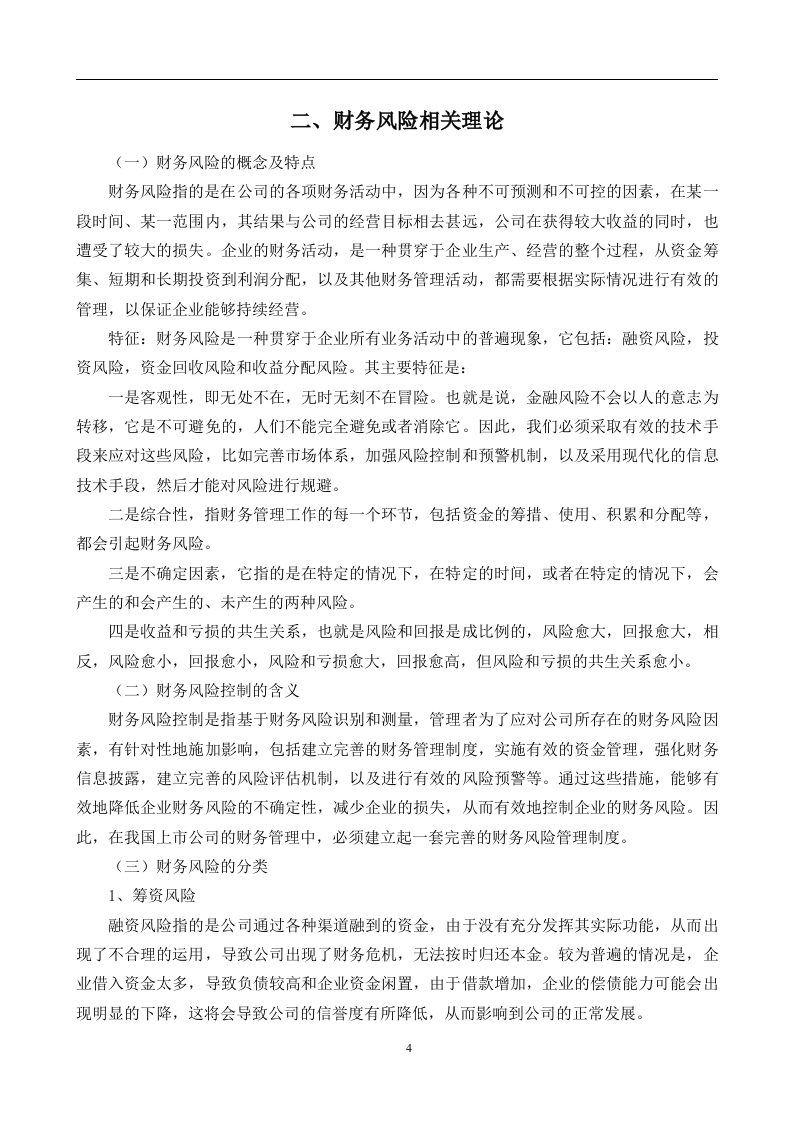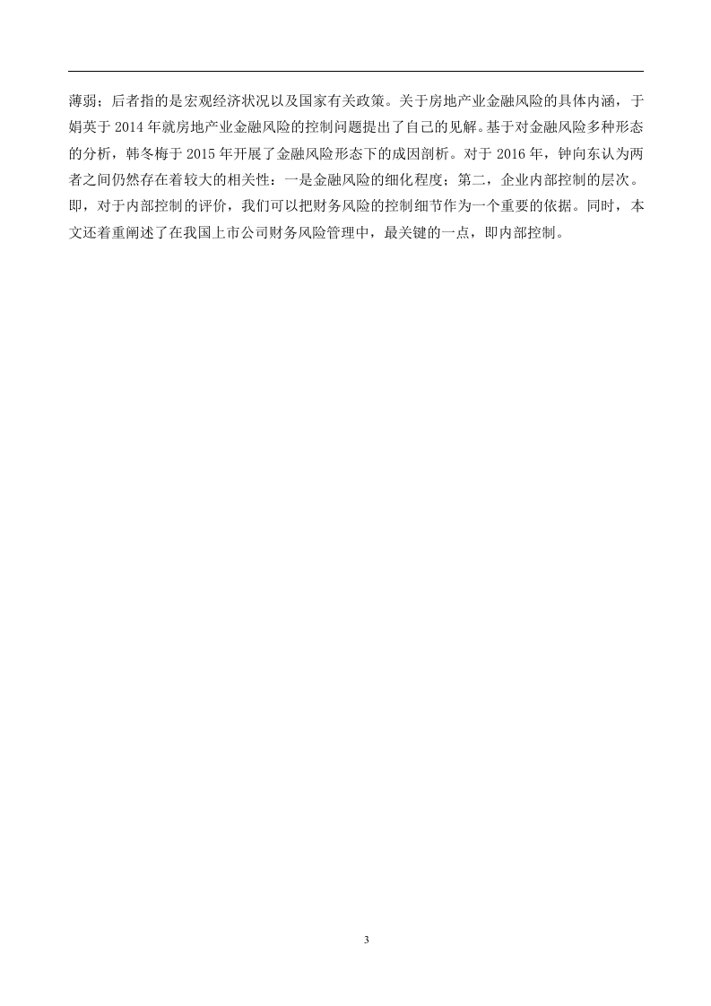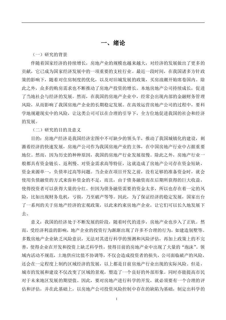 摘要房地产行业是我国经济发展的一个重要的GDP支撑行业,它是一个重资产行业,对资金的需求量很大,项目投资金额很高,而且投资回收周期很长,房地产业的资产负债率很高,金融风险也很大。所以,对于一个具有较高金融风险的行业,如何识别、预防、防范风险,对于一个公司的长远发展与健康成长有着十分重要的影响,而且,对房地产公司的风险进行有效的控制,对于推动国家经济的快速稳定发展,也是十分有益的。本文以华夏幸福房地产为研究对象。首先,本文对会计风险和控制的有关理论进行了简单的梳理,以便对金融风险和控制有一个较为全面的理解。然后,利用财务风险的有关理论,识别出影响上市公司财务风险的主要因素,并对其作出初步的判断。建立健全适合企业发展的财务风险评价体系,对企业财务风险展开系统、全面的评价和分析,为企业防范财务风险提供保障。最后,为解决上述问题,提出了一些相应对策。关键词:财务风险:防范:华夏幸福目录一、绪论…(一)研究的背景(二)研究的目的及意义(三)国内外研究状况2二、财务风险相关理论…4(一)财务风险的概念及特点…4(二)财务风险控制的含义4(三)财务风险的分类」.4三、华夏幸福概况…6(一)公司简介.6(二)房地产行业发展现状..6四、华夏幸福财务风险分析…9(一)偿债能力分析。9(二)营运能力分析.9(三)盈利能力分析…..10五、公司财务风险管理问题.…...〔一)尚未形成良好的风险控制文化(二)企业宏观环境复杂多变….11(三)财务风险控制制度不完普…(四)企业财务管理人员缺乏风险意识.11(一)提高企业对内部会计风险的意识…12(二)提高财务管理系统对外部环境的应变能力.12(三)完普管理规章制度.】2(四)加强财务人员整体素质…13结论.14参考文献…5一、绪论(一)研究的背景伴随着国家经济的持续增长,房地产业的规模也越来越大,对经济的发展做出了更多的贡献,它已成为国家经济发展中的一项重要的支柱行业。最近一段时间,在我国诸多方针政策的影响下,随着对住房制度的优化,以及对旧城发展的政策,买房浪潮开始席卷国内。除此之外,众多的购房需求也不断推动了房地产投资的增长。本地房地产公司持续成长,促进了当地社会与经济的发展。然而,在我国的房地产企业中,经常会出现内部的金融财务管理风险,从而影响了我国房地产企业的长期稳定发展。在高效运营房地产公司的过程中,要科学地规避现实中的风险,让这类公司可以在合理的引导下,全方位地促进我国的社会和经济的发展。(二)研究的目的及意义目的:房地产经济是我国经济宏图中不可缺少的领头羊,推动了我国城镇化的建设,刺激着经济的快速发展,房地产公司作为我国房地产业的主体,在中国房地产行业中占据重要地位。然而,因为历史的种种原因,我国的房地产行业发展很慢。除此之外,房地产行业一般都具有资金链长、返利慢、对资金需求高等特征,这就造成了房地产公司存在资金短缺,资金来源单一,负债率过高等问题。当企业在项目开发之前,没有足够的准备资金时,就会使用负债融资的方式来弥补资金的不足,而且,由于债务融资而在后期所获得的巨大收益,使得投资者可以获得大量的分红。但因为债务融资需要的资金太多,所以也存在着一定的风险,比如出现财务危机,亏损,乃至破产等等。因此,为了保证经济的稳定发展,国家出台了一系列的关于房地产经济的宏观政策,以此来约束房地产企业,让它们可以长久地发展下去。意义:我国的经济处于不断发展的阶段,随着时代的进步,房地产业也步入了正轨。然而,受经济利益的影响,地产企业的投资行为渐渐出现了许多不合理的行为,如建造别墅等。多数房地产企业缺乏风险意识,无法对其进行科学的预测和风险评估,再加上政策上的不完善,使得企业在开发和投资上缺乏科学性,使得目前的房地产业中出现了大量的“泡沫”。领域内活动不规范,土地供应比值不协调等,不仅会造成投资者的损失,公司面临破产的风险,还会在一定程度上制约区域经济的发展,以上都是目前房地产行业出现的实际风险。但是,城市的发展和建设不仅改变了区域的景观,塑造了一个良好的外部形象。同时亦能提高市民对于未来地区发展的期望值。因此,要对房地产进行科学的开发,就必须要有一个合理的评估和评估,并在此基础上,以房地产公司投资风险控制中存在的缺陷为基础,制定出科学的处理方案。房地产业是一项具有高投资、长周期、高风险等特征的行业,如果投资商在没有对各种实际风险的情况下,就盲目地投入其中,很有可能会造成开发活动的损失,甚至面临破产的风险。本文选择了某市的一家房地产公司作为研究对象,从控制投资风险的角度,深入分析当前经济形势对某地区房地产公司所产生的影响,并提出有效的控制措施。(三)国内外研究状况国外:从整体风险管理的角度来看,它是在20世纪90年代后期才被企业普遍采用的。从终极目标来看,这种管理旨在控制所产生的风险。在风险管理中,必须具备以下三个步骤:第一,风险控制:第二,风险测量:第三,风险识别。针对这种情况,专家和学者提出了种全风险管理的重要理念。TM,即完全的风险管理,将三个主要因素综合起来:第一个是选择,第二个是概率,第三个是价格。通过这种方式,投资人可以得到最大程度的回报,同时也要为他们愿意承担