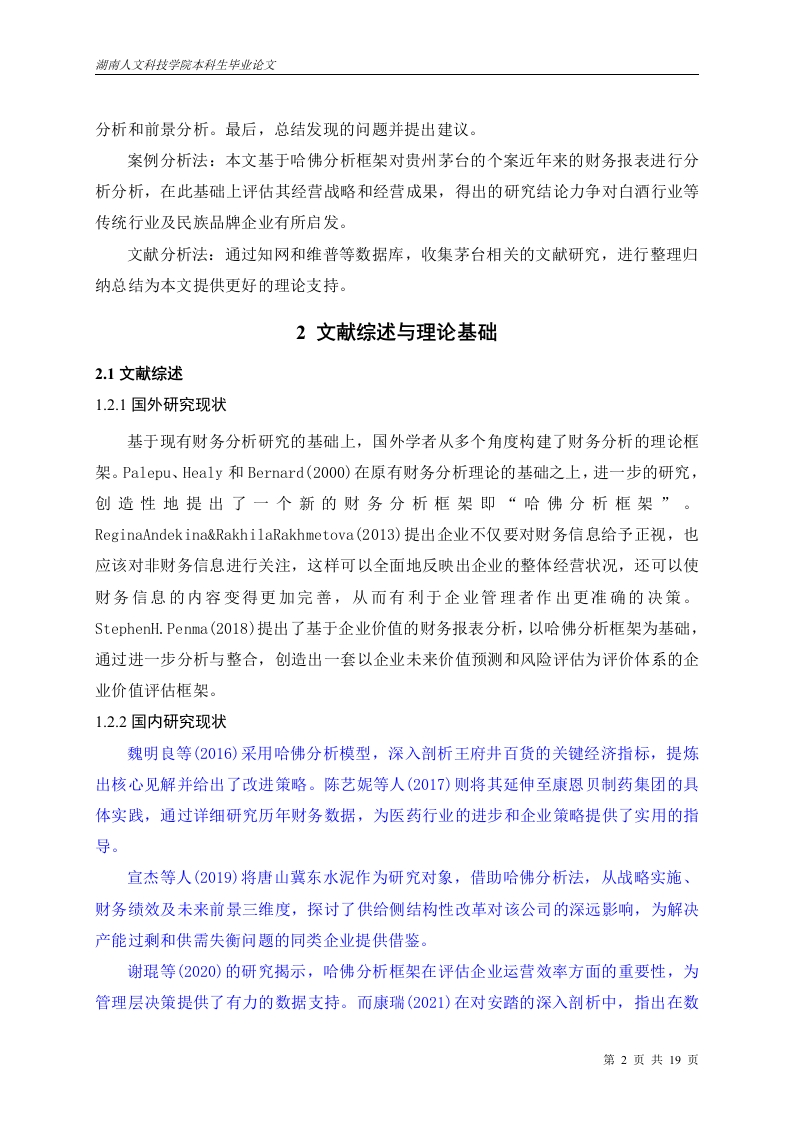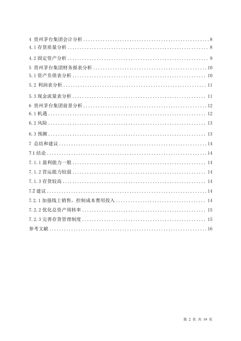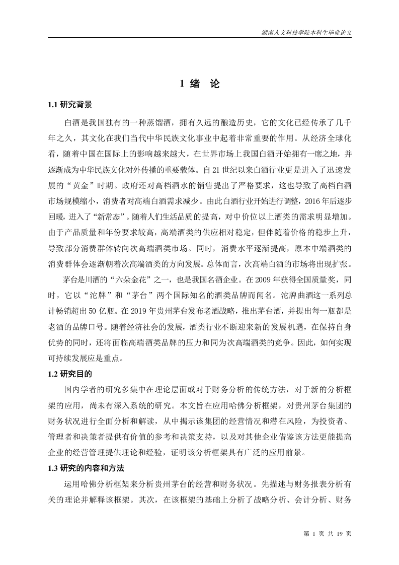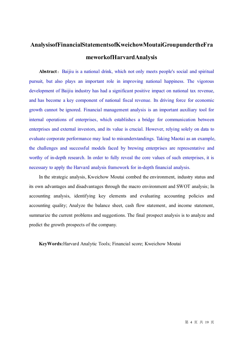 哈佛分析框架下的贵州茅台集团财务报表分析目录1绪论.....21.1研究背景....c21.2研究目的..1.3研究的内容和方法..32文献综述与理论基础2.1文献综述.…31.2.1国外研究现状..31.2.2国内研究现状..1.2.3研究综述..2.2理论基础....。。。。。。。。42.2.1传统财务分析方法..2.2.2哈佛分析框架的内容S3贵州茅台集团战略分析........53.1贵州茅台公司简介...S3.2白酒行业分析..63.3PEST宏观环境分析...73.3.1政治环境分析...3.3.2经济环境分析..3.3.3社会环境分析...73.3.4技术环境分析..3.4贵州茅台S0WT分析3.4.1优势分析....3.4.2劣势分析...........83.4.3机会分析..f3.4.4威胁分析....第1页共19页4贵州茅台集团会计分析4.1存货质量分析........84.2固定资产分析..95贵州茅台集团财务报表分析....105.1资产负债表分析....105.2利润表分析…….115.3现金流量表分析116贵州茅台集团前景分析126.1机遇..…126.2风险......136.3预测......137总结和建议......147.1结论...147.1.1盈利能力一般147.1.2营运能力较弱..147.1.3存货较高....1472建议.….....147.2.1加强线上销售,控制成本费用投入147.2.2优化总资产周转率..。157.2.3完善存货管理制度15参考文献..16第2页共19页哈佛分析框架下的贵州茅台集团财务报表分析摘要:白酒是一种国民饮料,不仅满足了人们的社交与精神追求,也在提升国民幸福感上扮演了重要角色。白酒产业的蓬勃发展,对国家税收产生了显著的积极影响,成为国家财政收入的关键组成部分,其对经济增长的推动力不容忽视。财务管理分析是企业内部运营的重要辅助手段,它建立起企业与外部投资者沟通的桥梁,其价值至关重要。然而,单纯依赖数据评估企业绩效可能产生误解。以茅台为例子的酿酒企业,它们面临的挑战和展现的成功模式都有其代表性,值得深入研究。为了全面揭示此类企业的核心价值,应用哈佛分析框架进行深度财务分析是必要的。贵州茅台在战略分析中,通过宏观环境和SWOT分析对环境、行业状况和它自身优劣势进行梳理:在会计分析中,确定关键要素,对会计政策和会计质量进行评估:在对负债表、现金流表、利润表进行分析,总结出目前存在的问题及建议。最后前景分析是对公司的增长前景进行分析和预测。关键词:哈佛分析工具:财务分:贵州茅台第3页共19页AnalysisofFinancialStatementsofKweichowMoutaiGroupundertheFrameworkofHarvardAnalysisAbstract:Baijiu is a national drink,which not only meets people's social and spiritualpursuit,but also plays an important role in improving national happiness.The vigorousdevelopment of Baijiu industry has had a significant positive impact on national tax revenue,and has become a key component of national fiscal revenue.Its driving force for economicgrowth cannot be ignored.Financial management analysis is an important auxiliary tool forinternal operations of enterprises,which establishes a bridge for communication betweenenterprises and external investors,and its value is crucial.However,relying solely on data toevaluate corporate performance may lead to misunderstandings.Taking Maotai as an example,the challenges and successful models faced by brewing enterprises are representative andworthy of in-depth research.In order to fully reveal the core values of such enterprises,it isnecessary to apply the Harvard analysis framework for in-depth financial analysis.In the strategic analysis,Kweichow Moutai combed the environment,industry status andits own advantages and disadvantages through the macro environment and SWOT analysis;Inaccounting analysis,identifying key elements and evaluating accounting policies andaccounting quality;Analyze the balance sheet,cash flow statement,and income statement,summarize the current problems and suggestions.The final prospect analysis is to analyze andpredict the growth prospects of the company.Key Words:Harvard Analytic Tools;Financial score;Kweichow Moutai第4页共19页