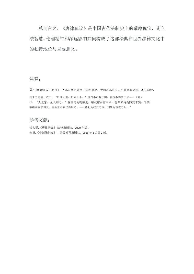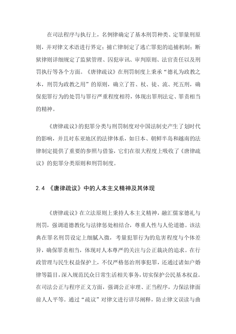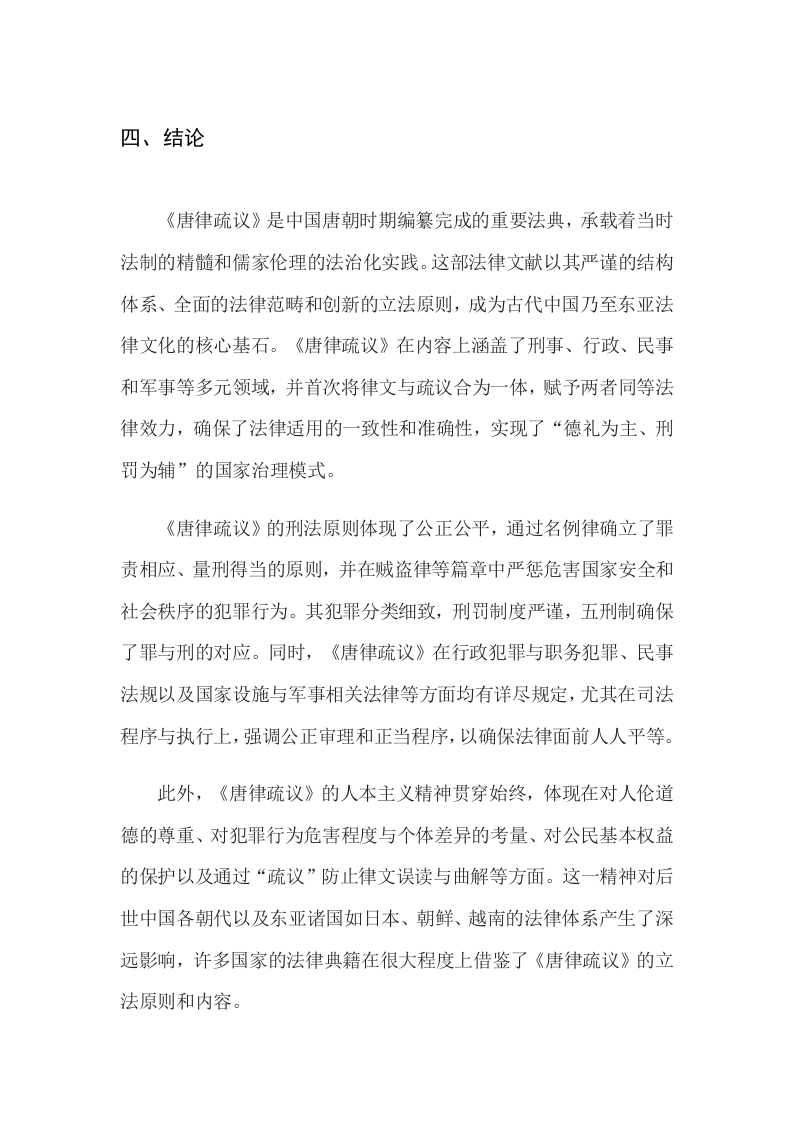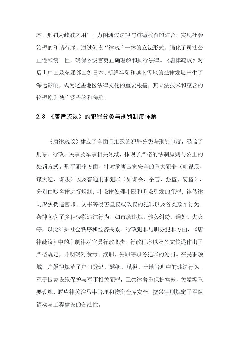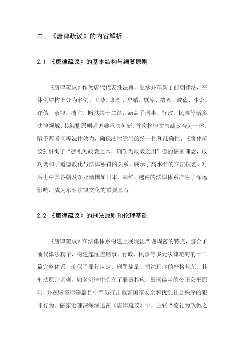 论述《唐律疏议》的内容解析及其深远影响XXX一、摘要《唐律疏议》是在中国古代唐朝时期编纂完成的一部重要法律文献,其历史背景可以追溯至唐朝建立之初至唐高宗永徽年间(公元650年至653年)。唐朝是中国封建社会的鼎盛时期,在政治、经济、文化等领域均达到了高度繁荣。在法律方面,唐代统治者吸取前,尤其是隋朝法律的经验教训,力图制定一套更为系统、完善的法律体系。本论文旨在深度剖析《唐律疏议》的法律内容、结构体系和立法特色,探索其如何通过法律条文将儒家伦理与国家法律融为一体,实现“德礼为主、刑罚为辅”的国家治理模式,并借此彰显其在中国古代法律史上的独特地位与长远贡献。论文还将评估《唐律疏议》对后世中国法律体系,特别是宋、元、明、清各代法律继承与发展的深远影响,以及它在促进东亚其他国家和地区法律体系构建,如日本《大宝律》、《养老律》、朝鲜《高丽律》以及越南《刑书》和《国朝刑律》中的重要作用。通过文献综述、法律文本比较、历史考证、内容解析及案例分析等多种方法,我们将综合对比《唐律疏议》在立法技术、罪名刑罚设定和司法程序设计等方面的创新性与合理性,从而全面揭示这部法典的历史价值和普适意义。二、《唐律疏议》的内容解析2.1《唐律疏议》的基本结构与编纂原则《唐律疏议》作为唐代代表性法典,继承并革新了前朝律法,在体例结构上分为名例、卫禁、职制、户婚、厩库、擅兴、贼盗、斗讼、诈伪、杂律、捕亡、断狱共十二篇,涵盖了刑事、行政、民事等诸多法律领域,其编纂原则强调继承与创新,首次将律文与疏议合为一体,赋予两者同等法律效力,确保法律适用的统一性和准确性。《唐律疏议》贯彻了“德礼为政教之本,刑罚为政教之用”①的儒家理念,成功调和了道德教化与法律惩罚的关系,展示了高水准的立法技艺,对后世中国各朝及东亚诸国如日本、朝鲜、越南的法律体系产生了深远影响,成为东亚法律文化的重要基石。2.2《唐律疏议》的刑法原则和伦理基础《唐律疏议》在法律体系构建上展现出严谨周密的特点,整合了前代律法精华,构建起涵盖刑事、行政、民事等多元法律范畴的十二篇完整体系,确保了罪行认定、刑罚裁量、司法程序的严格规范。其刑法原则明晰,如名例律中确立了罪责相应、量刑得当的公正公平原则,并在贼盗律等篇目中严厉打击危害国家安全和扰乱社会秩序的犯罪行为。儒家伦理深深渗透在《唐律疏议》中,主张“德礼为政教之本,刑罚为政教之用”,力图通过法律与道德教育的结合,实现社会治理的和谐有序。通过创设“律疏”一体的立法形式,强化了司法公正性和统一性,确保各级官吏正确理解和执行法律。《唐律疏议》对后世中国及东亚邻国如日本、朝鲜半岛和越南等地的法律发展产生了深远影响,成为这些地区法律文化的重要根基,其立法技术和蕴含的伦理原则被广泛借鉴和传承。2.3《唐律疏议》的犯罪分类与刑罚制度详解《唐律疏议》建立了全面且细致的犯罪分类与刑罚制度,涵盖了刑事、行政、民事及军事相关领域,体现了严格的法制原则与公正的处罚方式。刑事犯罪方面,针对危害国家安全的重大犯罪(如谋反、谋大逆、谋叛)以及普通刑事犯罪(如谋杀、杀害、强盗、窃盗),分别由贼盗律进行规制;斗讼律处理斗殴和诉讼引发的犯罪:诈伪律则聚焦伪造官印、文书等侵害皇权或政权的犯罪以及各类欺诈行为。杂律包含了多种轻微违法行为,如市场违规、债务纠纷、通奸、失火等,以此维护社会秩序和经济关系。行政犯罪与职务犯罪方面,《唐律疏议》中的职制律对官员行政职责、行政程序以及公文传递作出了严格规定,并明确对贪污、渎职、失职等职务犯罪的处罚。在民事领域,户婚律规范了户口登记、婚姻、赋税、土地管理中的违法行为。至于国家设施保护与军事相关犯罪,卫禁律着重保护宫殿、关隘等重要设施,厩库律关注马牛管理和物资仓库安全,擅兴律则规定了军队调动与工程建设的合法性。在司法程序与执行上,名例律确定了基本刑罚种类、定罪量刑原则,并对律文术语进行界定:捕亡律制定了逃亡罪犯的追捕机制:断狱律则详细规定了监狱管理、囚犯审讯、审判原则、法官责任以及刑罚执行等各个方面。《唐律疏议》在刑罚制度上秉承“德礼为政教之本,刑罚为政教之用”的原则,确立了答、杖、徒、流、死五刑,确保犯罪行为的处罚与罪行严重程度相符,体现出罪刑法定、罪责相当的精神。《唐律疏议》的犯罪分类与刑罚制度对中国法制史产生了划时代的影响,并且对东亚地区的法律体系,如日本、朝鲜半岛和越南的法律制定提供了重要的参照与借鉴,它们在很大程度上吸收了《唐律疏议》的犯罪分类原则和刑罚制度。2.4《唐律疏议》中的人本主义精神及其体现《唐律疏议》在立法原则上秉持人本主义精神,融汇儒家德礼与刑罚,强调道德教化与法律惩处相结合,尊重人性与人伦道德。该法典在罪名刑罚设定上细腻入微,考量犯罪行为的危害程度与个体差异,确保罪责相当,体现对人本尊严的关注与公正裁决的追求。在行政管理与民生权益保护上,不仅严格惩治刑事犯罪,还通过诸如户婚律等篇目,深入规范民众日常生活相关事务,切实保护公民基本权益。在司法公正与程序正义方面,强调公正审理、