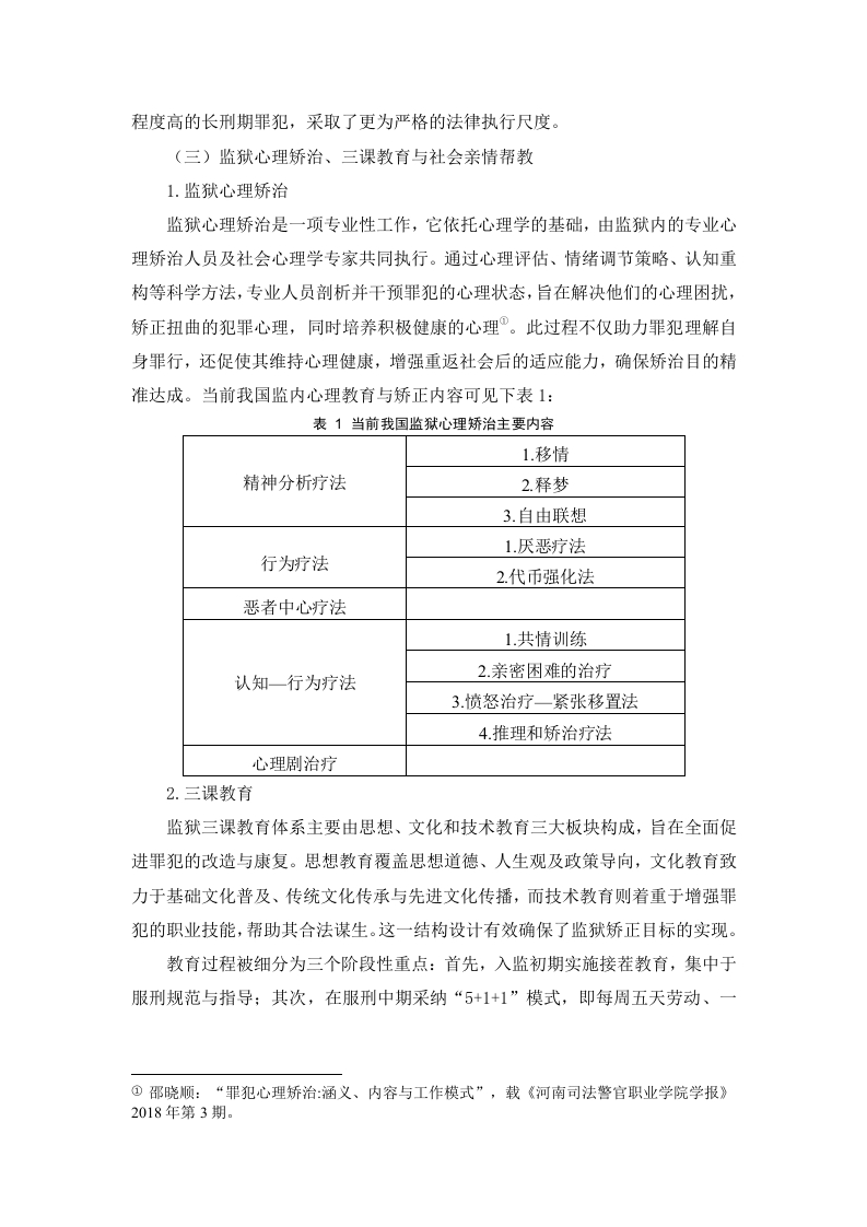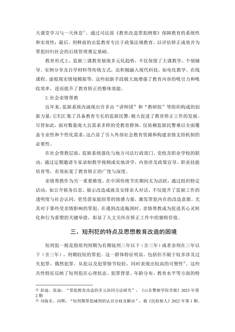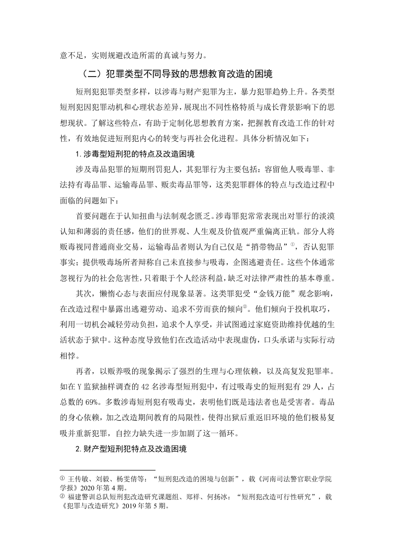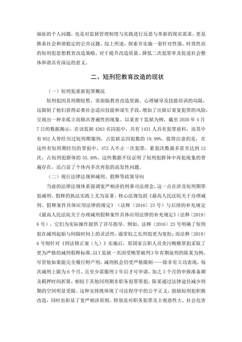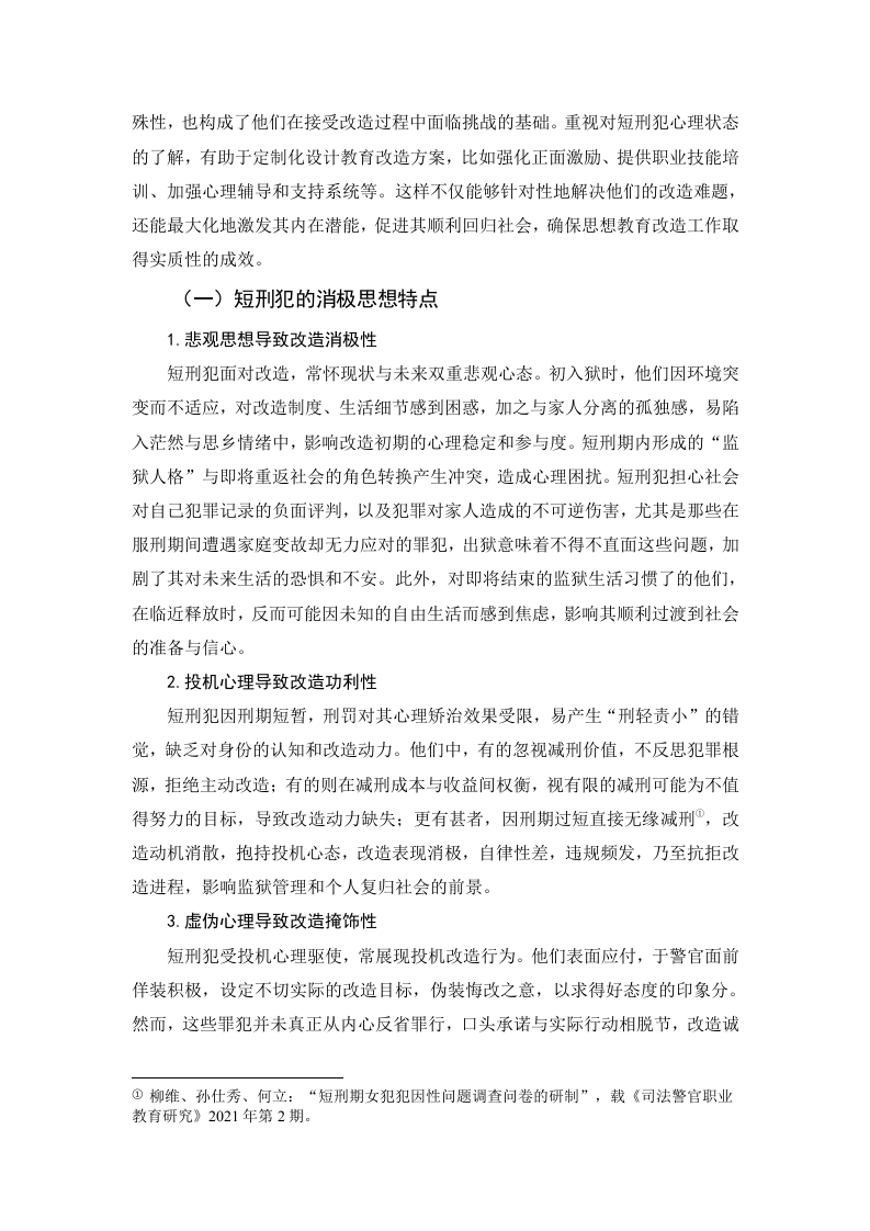 论新时期短刑犯教育改造的困境及对策摘要:短刑犯通常指被判处三年以下有期徒刑或拘役的罪犯,其教育改造具有时间短、任务重、难度大的特点。而教育改造是我国司法机关对犯罪分子进行教育改造的主要目的和手段之一。在各类服刑人员中短刑犯因刑期短,改造时间和手段有限,思想改造效果往往不明显,刑满释放后二次犯罪率较高且有上升趋势,无益于社会的和谐稳定。针对短刑犯的思想特点与教育改造难点,探索有针对性的思想教育改造方式,完善对短刑犯的思想教育改造方法,对确保短刑犯的思想教育改造效果,有重要的现实和理论意义。本文分析了短刑犯教育改造的现状与困境,并在此基础上,针对我国短刑犯教育改造中存在的短刑犯的消极思想犯罪类型不同、年龄层偏低、文化程度较低等问题导致的困境,提出完普短刑犯思想教育改造的五项具体举措。关键词:短刑犯:思想教育:思想改造:改造对策一、引言针对短刑犯的思想教育改造,作为监狱管理工作的一大核心议题,显得尤为重要且迫切。这部分群体因刑期短暂及惩罚较轻,导致其在接受思想教育过程中连续性和多样性难以保障,影响改造成效,进而促使短刑犯重蹈覆辙的比例升高,威胁到社会的和谐稳定大局。据统计,截至2020年,我国监狱系统中刑期不满三年的短刑犯比例已攀升至约15%,相较于前十年数据”,这一数字的增长不仅映射出犯罪结构的变化,也对传统的监狱管理和教育改造模式提出了新的挑战。短刑犯因其刑期特性,往往在狱中停留时间有限,加之心理调适周期短、重返社会准备不足等多重因素,导致思想教育与行为矫正的效果大打折扣。据某地区监狱管理局报告显示,短刑释放人员一年内重新犯罪率高达30%②,这一数据令人警醒,不仅关乎个体的重生机会,更直接影响到社会的安全与秩序。因此,如何在有限的服刑期间内实施高效的思想教育,促使短刑犯真心悔改,成为减少再犯率、实现教育正向转化的关键。这不仅是关乎短刑犯及其家庭未来@王梓红、顾卫勇:“短刑犯现状分析及矫正对策”,载《犯罪与改造研究》2019年第2期。②董婷:“云南省X监狱短刑期罪犯管理研究”,载《云南财经大学》2023。福祉的个人问题,也是对监狱管理制度与实践进行反思与革新的现实需求,更是维系社会和谐稳定的公共议题。综上所述,探索并实施一套针对性强、时效性高的短刑犯思想教育改造策略,对于提升改造质量、降低二次犯罪率及促进社会整体和谐具有深远的意义。二、短刑犯教育改造的现状(一)短刑犯重新犯罪概况短刑犯因其刑期短暂,常面临教育改造资源、心理辅导及技能培训的局限,这限制了他们获得必要社会适应技能和谋生手段,增加了出狱后重复犯罪的风险,呈现出一种非孤立而颇具普遍性的现象。以某省Y监狱为例,截至2020年4月7日的数据揭示,在该监狱4263名囚犯中,共有1431人具有犯罪前科,而其中有852人曾经历过短刑期服刑,占监狱总囚犯数的19.99%。值得注意的是,在这些有短刑期经历的罪犯中,472人不止一次犯罪,累犯次数最多甚至达到12次,占短刑犯群体的55.40%。这些数据不仅证明了短刑犯群体中再犯现象的普遍存在,还凸显了个体内多次再犯的高发性问题。(二)现行法律法规和减刑、假释等政策导向当前的法律法规体系强调宽严相济的刑事司法理念,这一点在涉及短刑期罪犯减刑、假释的执法实践上尤为显著。核心法规包括《最高人民法院关于办理减刑、假释案件具体应用法律的规定》(法释〔2016)23号)与后续的补充规定《最高人民法院关于办理减刑假释案件具体应用法律的补充规定》(法释〔2019)】6号),它们为实际操作提供了详尽指导。例如,法释〔2016)23号明确了短刑犯在减刑起始与间隔时间上的灵活性,通常较之长刑犯更为宽松:而法释〔2019)6号则针对《刑法修正案(九)》实施后,原国家公职人员贪污贿赂罪犯采取了更为严格的减刑假释标准。以Y监狱一名因受贿罪被判3年有期徒刑的陈某为例,尽管他如果能完全履行财产刑,减刑机会仍受严格限制一一除非有立功表现,每次减刑上限为6个月,且至少需服刑2年后才可申请,加之3个月的申报准备期及羁押时间折算,相较于其他同刑期非职务犯罪罪犯,陈某通过法律途径减少刑期的空间明显受限。这种安排既体现了司法程序中的公平正义,鼓励短刑犯积极改造,同时也彰显了宽严相济原则,特别是对职务犯罪及主观恶性大、社会危害程度高的长刑期罪犯,采取了更为严格的法律执行尺度。(三)监狱心理矫治、三课教育与社会亲情帮教1.监狱心理矫治监狱心理矫治是一项专业性工作,它依托心理学的基础,由监狱内的专业心理矫治人员及社会心理学专家共同执行。通过心理评估、情绪调节策略、认知重构等科学方法,专业人员剖析并干预罪犯的心理状态,旨在解决他们的心理困扰,矫正扭曲的犯罪心理,同时培养积极健康的心理”。此过程不仅助力罪犯理解自身罪行,还促使其维持心理健康,增强重返社会后的适应能力,确保矫治目的精准达成。当前我国监内心理教育与矫正内容可见下表1:表1当前我国监狱心理矫治主要内容1.移情精神分析疗法2.释梦3.自由联想1.厌恶疗法行为疗法2.代币强化法恶者中心疗法1.共情训练认知一行为疗法2.亲密困难的治疗3.愤怒治疗一紧张移置法4.推理和矫治疗法心理剧治疗2.三课教育监狱三课教育体