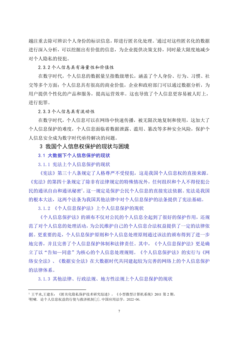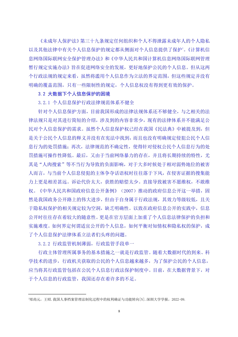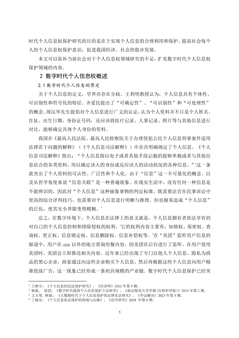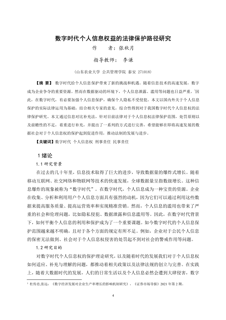 数字时代个人信息权益的法律保护路径研究目录摘要31绪论…31.1研究背景......31.2研究目的..32数字时代个人信息权概述......42.1数字时代个人信息的界定...义2.2数字时代个人信息权的概念...52.3数字时代个人信息权的特点...52.3.1个人信息以电子数据为载体...52.3.2个人信息具有海量性和价值性......62.3.3个人信息具有流动性..63我国个人信息权保护的现状与困境.,63.1大数据下个人信息保护的现状..b3.1.1宪法上个人信息保护的现状.....63.1.2《个人信息保护法》上个人信息保护的现状..63.1.3其他法律、行政法规、地方性法规上个人信息保护的现状·>3.2大数据下个人信息保护的困境.73.2.1个人信息保护行政法律规范体系不健全.·732.2行政监管机制薄弱,行政监管手段单一…73.2.3大数据时代下信息受害者得不到行政保护.....83.2.4公民对个人信息保护意识薄弱....84城外及有关地区个人信息权法律保护现状及其启示··94.1美国对个人信息权的碎片化保护...,..·..94.2欧盟对个人信息权的综合保护·04.3德国对个人信息权的立法保护.··.944域外个人信息法律保护对我国的启示·104.4.1立法层面....104.4.2司法层面.…105完善我国个人信息权益保护建议.··115.1健全个人信息行政监管机制....115.2构建个人信息行政公益诉讼制度..115.3建立大数据个人信息处理的行政许可制度.·。126结语……………【参考文献】.13【致谢词】.153数字时代个人信息权益的法律保护路径研究作者:张秋月指导教师:李谦(山东农业大学公共管理学院泰安271018)【摘要】数字时代给个人信息保护带来了新的挑战和机遇。随着信息技术的高速发展,数字成为企业争夺的重要资源。然而在数据驱动的环境下,个人信息泄露、滥用等问题也日益严重。因此,在数字时代,有必要加强个人信息保护,确保个人隐私不受侵犯。本文以国内外关于个人信息保护的实际法律运用为基础,结合相关专家的意见,综合性得到对于我国数字时代个人信息权的法律保护研究。本文通过信息对比补充法,针对目前法律对于个人信息权法律保护范围,处罚原则以及前瞻性的不足,着重进行补充,并提出了一系列的方式进行完善,希望能够在即将高速发展的数据社会对于个人信息权的保护起到促进作用,推动法制的发展与进步。【关键词】数字时代个人信息权刑事责任民事责任1绪论1.1研究背景在过去的几十年里,信息技术取得了巨大的进步,导致数据量的爆炸式增长。随着移动互联网、社交网络和物联网等技术的快速发展,全球数据量呈指数级增长。这种信息爆炸的现象被称为“数字时代”。在数字时代,个人信息成为一种宝贵的资源。企业在收集、分析和利用用户个人信息方面具有强烈的动机,因为它们可以通过利用这些数据来提高服务质量、提高运营效率和实现精准营销。然而,个人信息的滥用也带来了严重的社会和伦理问题,比如隐私侵犯、数据泄露和信息滥用等。因此,在数字时代背景下,如何平衡个人信息的利用和保护成为了一个重要课题。如今数字时代的个人信息保护范围越来越不明确,且对于各个方面的规定有所不足。例如,企业对于公民个人信息的保密无法做到、社会对于个人信息权侵害的处罚起不到对社会的警戒作用等问题。1.2研究目的对数字时代个人信息权的保护理论研究,以及随着时代的发展我们对于个人信息权如何适应、补充与理解的问题,都推动着相关政策以及法律法规的创立与完善。在实践上,随着大数据时代的发展,人们的日常生活以及个人信息必然会遭到大肆侵害,数字1杜传忠,张远:《数字经济发展对企业生产率增长的影响机制研究》,《证券市场导报》2021年第2期。时代个人信息权保护研究的目的是在于实现个人信息的合理利用和保护,提高社会每个人的个人信息权保护意识,促进我国经济、社会的稳步发展。本文可以弥补当前社会对于个人信息权领域研究的不足,扩充数字时代个人信息权保护领域的内容。2数字时代个人信息权概述2.1数字时代个人信息的界定关于个人信息的定义,学界亦存在分歧。王利明教授认为,个人信息具有个体性、可识别性和符号化的特征。齐爱民提出了“可确定性”、“可识别性”和“可处理性”的概念。周汉华先生提倡对个人信息进行广义的认定,认为个人资料并不只是个人姓名住址、出生日期、身份证号码,还应该将医疗记录、人事记录、照片等与其他信息进行对比,能够确定具体个人身份的资料。我国在《最高人民法院、最高人民检察院关于办理侵犯公民个人信息刑事案件适用法律若干问题的解释》(《个人信息司法解释》)中首次明确规定了个人信息。《个人信息司法解释》指出:“个人信息指以电子或者其他手段记载的能够单独或者与其他信息结合的各类资料,用以确定该人的身份或反应该人的活动状况的各种信息。”这一条款突出了个人资料的可认性、广泛性和个人化。由于“信息”这一不可量化的概念、以及从哲学角度来说“信息关联”是一种普遍现象。在现实生活中,没有任何一种信息是不能辨识的,因此对“个人信息”这种抽象事物的判定标准,既需要法官在民事诉讼中更高的综合评判技巧,也需要对个人信息进行明晰与推理,但也极易造成“个人信息”的泛化,使其安全界限变得模糊。总之,在数字环境下,个人信息在法律上的意义就是,个人信息拥