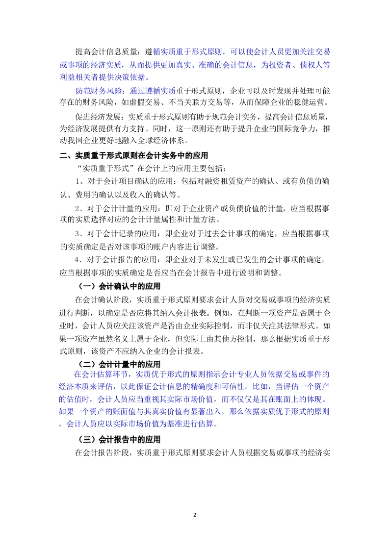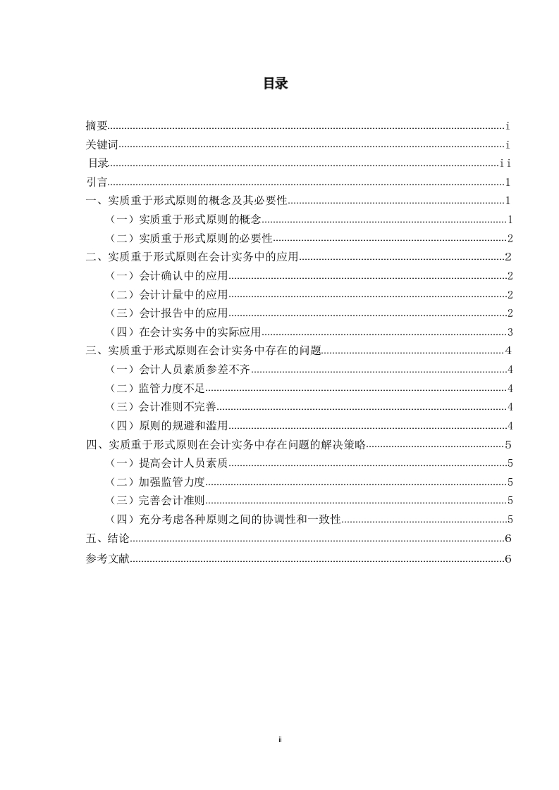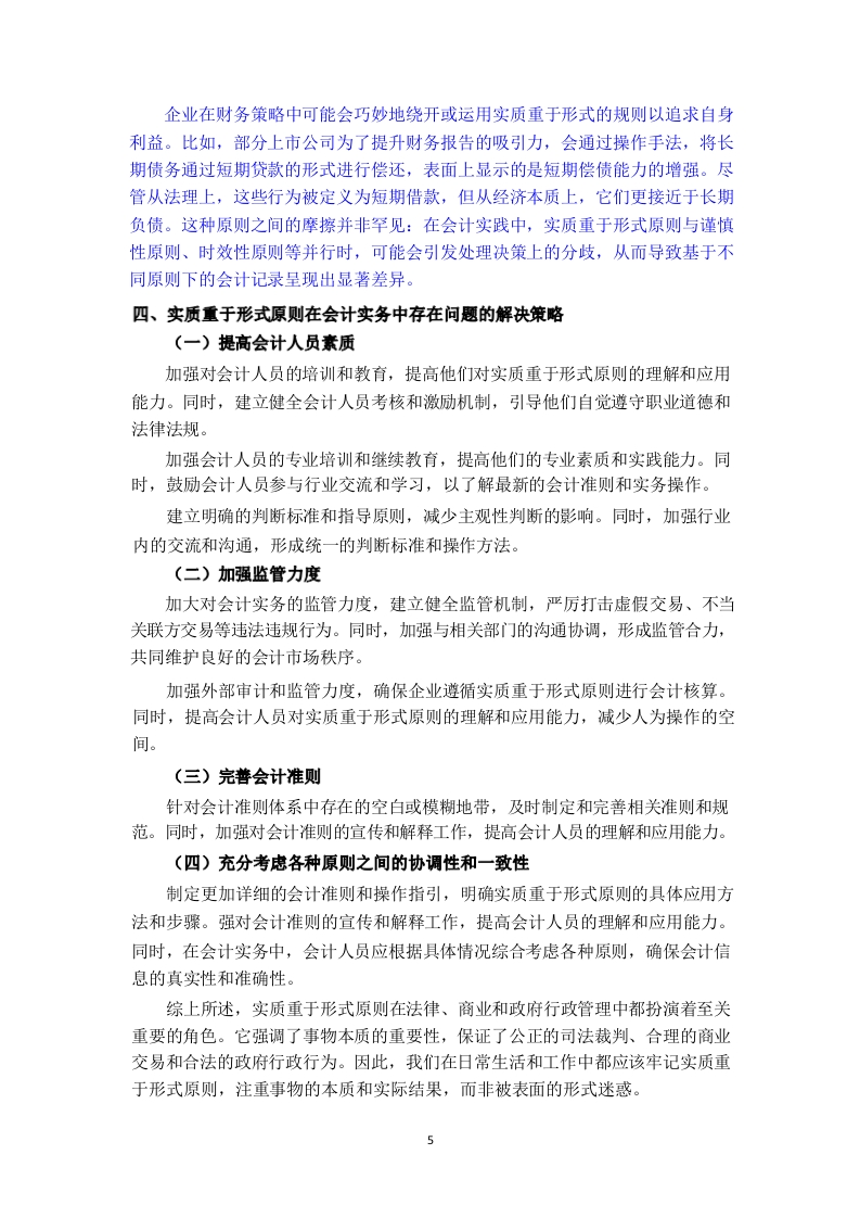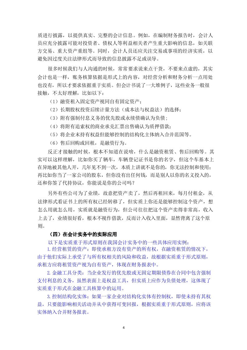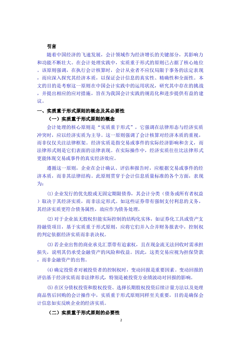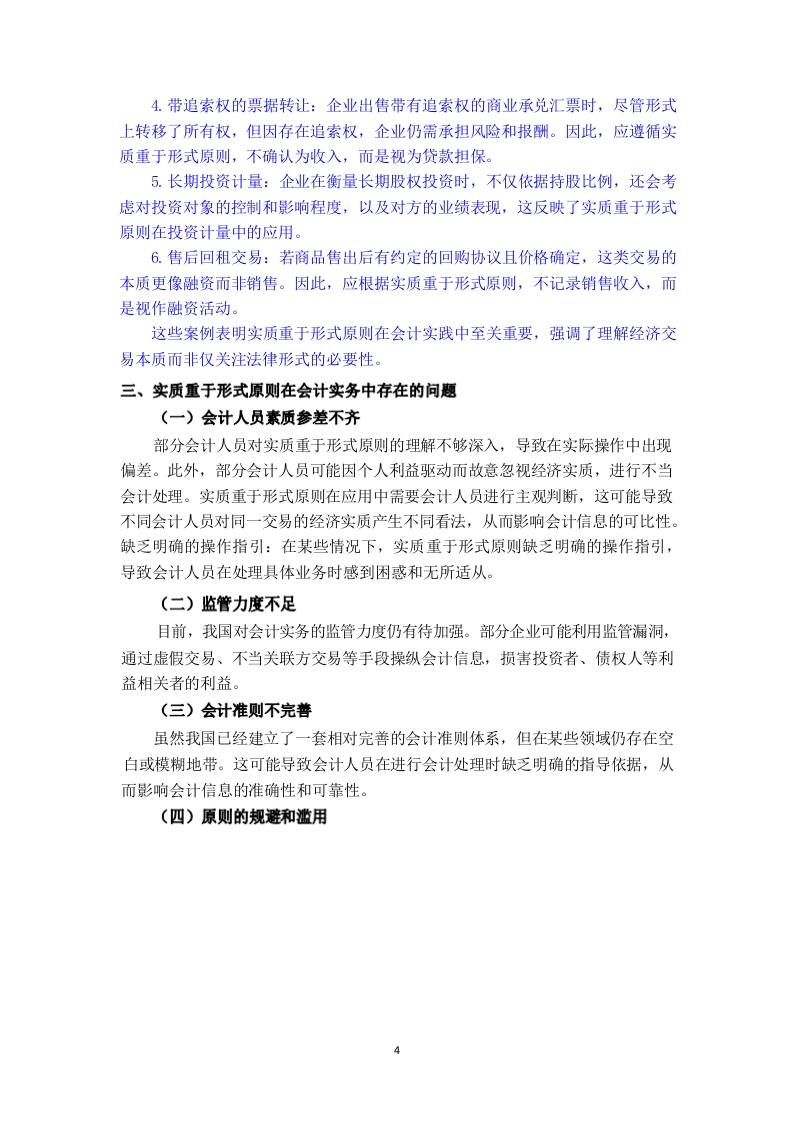 浅析实质重于形式在我国会计实务中的研究【摘要】伴随着我国国民经济总产值的每年增长,各种形式的企业如雨后春笋般涌现出来。公司内部的运营架构也出现了质变,这也为公司的会计工作带来了许多挑战和压力。会计核算的目标是淮确、客观、公正地反映企业的财务状况、经营成果和现金流量等信息:但是,形式仅仅是内容的载体,有些时候,经济交易的外部合法表现并不一定与其本质相符,甚至不能真实准确地反映出商业交易的经济本质,因此,要想真正地达到会计的目标,就必须从“实质”的角度来反映各项交易对公司的影响,这一点毋庸置疑。因此,在会计实务工作中贯彻实质重于形式的原则,这对于提高企业经济效益、优化会计实务结构起到了关键的作用。总而言之,在会计实践中运用“实质大于形式”的原则是十分必要的。遵循这一原则,就能保证会计信息的真实、可靠,从而有效地维持了会计核算的正常进行和业务活动的诚信。【关键词】实质重于形式:会计实务:会计核算目录酒要.…关键词…1目录..1引言一、实质重于形式原则的概念及其必要性(一)实质重于形式原则的概念..............(二)实质重于形式原则的必要性…2二、实质重于形式原则在会计实务中的应用…2(一)会计确认中的应用.2(二)会计计量中的应用…2(三)会计报告中的应用2(四)在会计实务中的实际应用..3三、实质重于形式原则在会计实务中存在的问题.4(一)会计人员素质参差不齐4(二)监管力度不足.4(三)会计准则不完善.4(四)原则的规避和滥用4四、实质重于形式原则在会计实务中存在问题的解决策略.5(一)提高会计人员素质.5(二)加强监管力度.…5(三)完善会计准则.5(四)充分考虑各种原则之间的协调性和一致性.5五、结论6参考文献.…6引言随着中国经济的飞速发展,会计领域作为经济增长的关键部分,其影响力和功能不断壮大。在会计处理实践中,实质重于形式的原则已占据了核心地位。该原则强调,在执行会计核算时,会计从业者不应仅局限于事务的法定表现,而应深入探究其经济本质,以保证会计信息的真实性、精确性和全面性。本文的目的是考察这一原则在中国会计实践中的运用状况,研究其中存在的挑战,并提出相应的应对措施,旨在为我国会计实践的规范化和进步提供有益的建议。一、实质重于形式原则的概念及其必要性(一)实质重于形式原则的概念会计处理的核心原则是“实质重于形式”,它强调在法律形态与经济实质冲突时,应以经济实质为主导。这一原则强调了会计核算对经济本质的重视,而非仅仅关注法律框架。经济实质是指交易或事件的实际经济影响和含义,而法律形式则是它们表面的法律表现。在实际操作中,经济实质往往比法律形式更能体现交易或事件的真实经济效应。遵循这一原则,企业在会计确认、评估和报告时,应根据交易或事件的经济本质,而非其法律结构。此原则贯穿于会计信息质量标准的各个方面,表现为:(1)企业发行的优先股或无固定期限债券,其会计分类(债务或所有者权益)取决于其经济实质,而非法定形式。如这些证券带有强制支付利息的义务,其经济实质更符合债务属性,故应作为债务处理。(2)对于企业虽无股权但能实际控制的结构化实体,如证券化工具或资产支持融资项目,基于实质重于形式原则,应将它们并入合并财务报表中,控制权的判定依据经济实质而非表决权。(3)若企业出售的商业承兑汇票带有追索权,且在现金流无法回收时需承担损失,说明其仍承受金融资产的风险和收益。因此,这类交易应视为担保贷款,而非金融资产的出售。(4)确定投资者对被投资者的控制权时,变动回报是重要因素。变动回报的评估基于经济实质而非法律形式,特别是被投资方业绩波动对回报的影响。(⑤)在区分债权投资和股权投资、选择长期股权投资后续计量方法以及处理商品售后回购的会计操作中,实质重于形式原则同样至关重要,目的是确保会计信息如实反映企业的经济实质。(二)实质重于形式原则的必要性2提高会计信息质量:遵循实质重于形式原则,可以使会计人员更加关注交易或事项的经济实质,从而提供更加真实、准确的会计信息,为投资者、债权人等利益相关者提供决策依据。防范财务风险:通过遵循实质重于形式原则,企业可以及时发现并处理可能存在的财务风险,如虚假交易、不当关联方交易等,从而保障企业的稳健运营。促进经济发展:实质重于形式原则有助于规范会计实务,提高会计信息质量,为经济发展提供有力支持。同时,这一原则还有助于提升企业的国际竞争力,推动我国企业更好地融入全球经济体系。二、实质重于形式原则在会计实务中的应用“实质重于形式”在会计上的应用主要包括:1、对于会计项目确认的应用:包括对融资租赁资产的确认、或有负债的确认、费用的确认以及收入的确认等。2、对于会计计量的应用:即对于企业资产或负债价值的计量,应当根据事项的实质选择对应的会计计量属性和计量方法。3、对于会计记录的应用:即企业对于过去会计事项的确定,应当根据事项的实质确定是否对该事项的账户内容进行调整。4、对于会计报告的应用:即企业对于未发生或已发生的会计事项的确定,应当根据事项的实质确定是否应当在会计报告中进行说明和调整。(一)会计确认中的应用在会计确认阶段,实质重于形式原