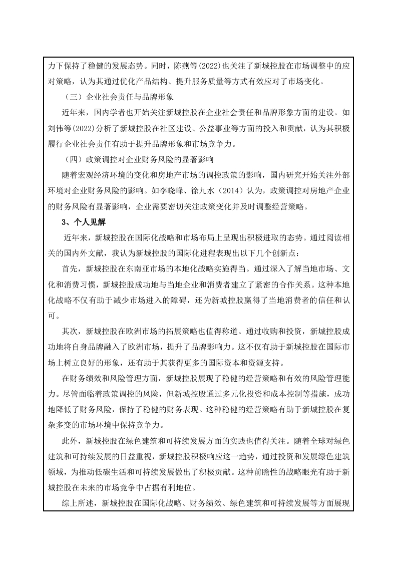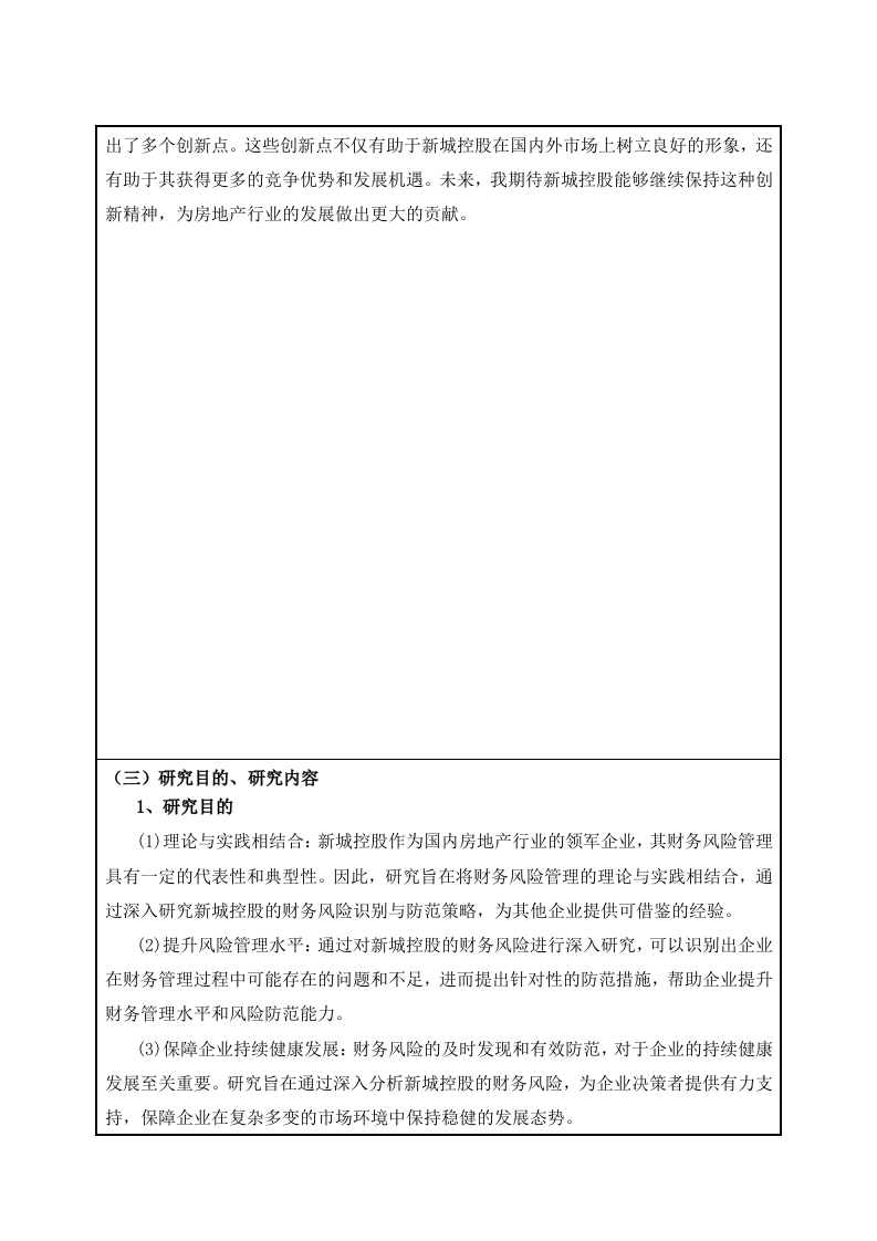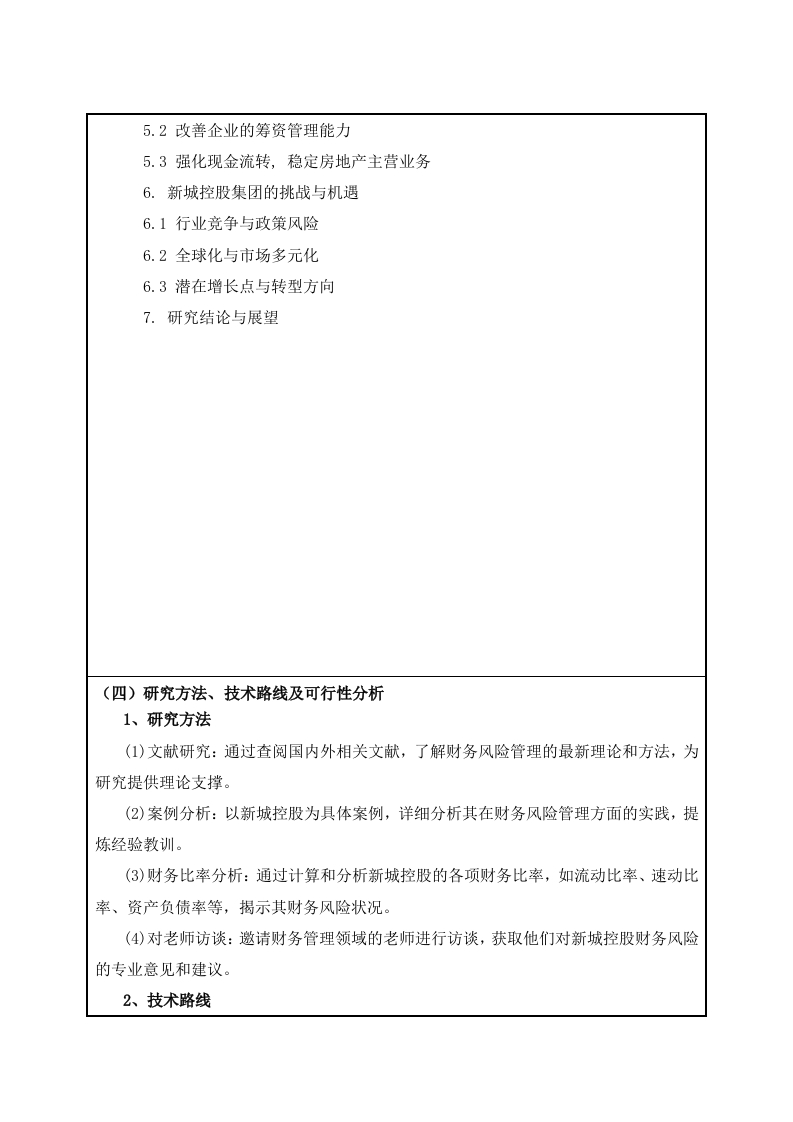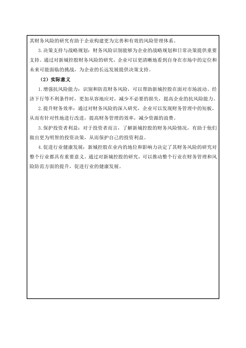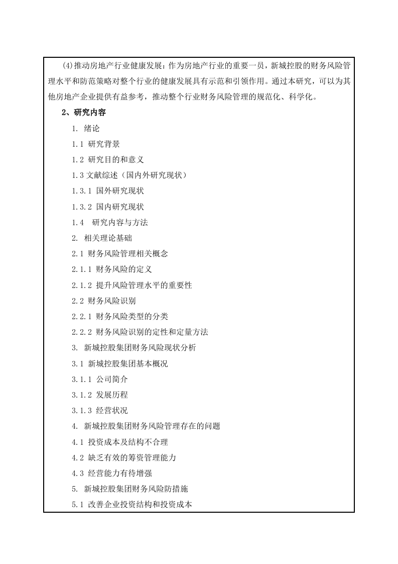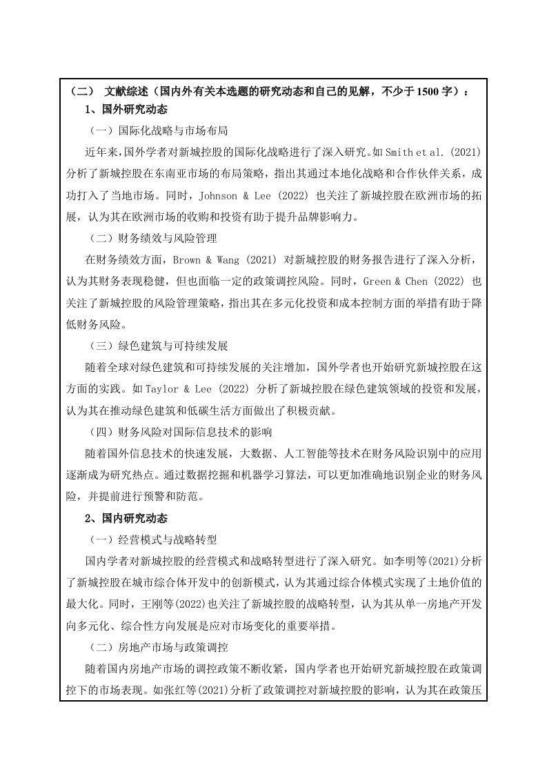 毕业论文开题报告书(一)本选题的理论、实际意义1、研究背景随着全球经济的不断发展和市场竞争的日益激烈,财务风险已成为企业运营过程中不可忽视的重要因素。新城控股集团,作为国内知名的综合性房地产开发商,其业务范围涵盖了住宅、商业、文化等多个领域。随着企业规模的不断扩大和市场环境的变化,新城控股面临的财务风险也日趋复杂多样。而财务风险,指的是企业在经营活动中因资金运动而面临的各种不确定性。这些不确定性可能来源于市场环境的变化、企业内部管理的漏洞、政策法规的调整等多种因素。财务风险的种类多种多样,包括筹资风险、投资风险、流动性风险、信用风险等。这些风险不仅可能对企业的财务状况造成负面影响,还可能影响企业的战略实施、市场竞争力以及长期发展。因此,识别与防范财务风险成为了确保新城控股健康、稳定发展的重要任务。新城控股集团1993年创立于江苏常州,现总部设于上海。经过31年的快速发展,成为跨足住宅地产和商业地产的综合性房地产集团。多年来,新城控股持续深耕房地产行业,形成了多元化的业务布局。凭借其卓越的品牌影响力、丰富的开发经验以及稳健的运营策略,新城控股在业内树立了良好的口碑。作为一家具有深厚历史底蕴和广泛市场影响力的综合性企业集团,自成立以来,在城市建设、房地产开发、商业运营等领域均取得了卓越的业绩。其成长历程充满了坚韧与智慧,也伴随着市场的风云变幻和行业的起伏跌宕。新城控股始终坚持以市场为导向,以客户需求为中心,通过不断创新和优化,逐步发展成为国内领先的综合性地产开发运营商。其成功背后,是对品质的执着追求,是对创新的不断探索,更是对社会责任的积极承担。2、研究意义(1)理论意义1.理论与实践结合:新城控股作为中国企业界的代表性企业,对其财务风险的深入研究,不仅是对现有财务理论的实际应用,更是对现有理论的检验与丰富。这种理论与实践的结合,有助于提升财务学的理论深度和应用广度。2.风险管理框架的完善:财务风险识别与防范是企业管理的重要组成部分。对于新城控股这样的企业,其财务风险的复杂性和多样性要求企业不断完善风险管理框架。对其财务风险的研究有助于企业构建更为完善和有效的风险管理体系。3.决策支持与战略规划:财务风险识别能够为企业的战略规划和日常决策提供重要支持。通过对新城控股财务风险的研究,企业可以更清晰地看到自身在市场中的定位和未来可能面临的挑战,为企业的长远发展提供决策支持。(2)实际意义1.增强抗风险能力:识别和防范财务风险,可以帮助新城控股在面对市场波动、经济下行等不利条件时,更加从容地应对,减少不必要的损失,提高企业的抗风险能力。2.提升财务效率:通过对财务风险的深入研究,企业可以发现财务管理中的短板,从而有针对性地进行改进,提高财务管理的效率,减少资源的浪费。3.保护投资者利益:对于投资者而言,了解新城控股的财务风险情况,有助于他们做出更为明智的投资决策,从而保护自已的投资利益。4.促进行业健康发展:新城控股在业内的地位和影响力决定了其财务风险的研究对整个行业都具有重要意义。通过对新城控股的研究,可以推动整个行业在财务管理和风险防范方面的提升,促进行业的健康发展。(二)文献综述(国内外有关本选题的研究动态和自己的见解,不少于1500字):1、国外研究动态(一)国际化战略与市场布局近年来,国外学者对新城控股的国际化战略进行了深入研究。如Smith et al.(2021)分析了新城控股在东南亚市场的布局策略,指出其通过本地化战略和合作伙伴关系,成功打入了当地市场。同时,Johnson&Lee(2022)也关注了新城控股在欧洲市场的拓展,认为其在欧洲市场的收购和投资有助于提升品牌影响力。(二)财务绩效与风险管理在财务绩效方面,Brown&Wang(2021)对新城控股的财务报告进行了深入分析,认为其财务表现稳健,但也面临一定的政策调控风险。同时,Green&Chen(2022)也关注了新城控股的风险管理策略,指出其在多元化投资和成本控制方面的举措有助于降低财务风险。(三)绿色建筑与可持续发展随着全球对绿色建筑和可持续发展的关注增加,国外学者也开始研究新城控股在这方面的实践。如Taylor&Lee(2022)分析了新城控股在绿色建筑领域的投资和发展,认为其在推动绿色建筑和低碳生活方面做出了积极贡献。(四)财务风险对国际信息技术的影响随着国外信息技术的快速发展,大数据、人工智能等技术在财务风险识别中的应用逐渐成为研究热点。通过数据挖掘和机器学习算法,可以更加准确地识别企业的财务风险,并提前进行预警和防范。2、国内研究动态(一)经营模式与战略转型国内学者对新城控股的经营模式和战略转型进行了深入研究。如李明等(2021)分析了新城控股在城市综合体开发中的创新模式,认为其通过综合体模式实现了土地价值的最大化。同时,王刚等(2022)也关注了新城控股的战略转型,认为其从单一房地产开发向多元化、综合性方向发展是应对市场变化的重要举措。(二)房地产市场与政策调控随着国内房地产市场的调控政策不断收紧,国内学者也开始研究新城控股在政策调控下的市场表现。如张红等(2021)分析了政策调控对新城控股的影响,认为其在政策压力下保持了稳健的发展态势。同
