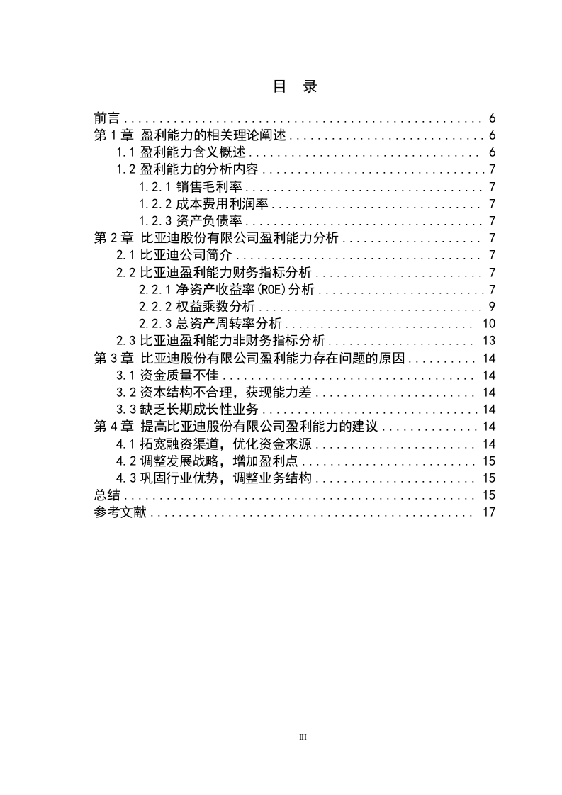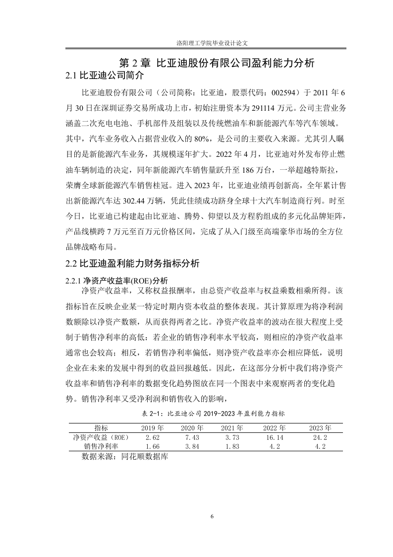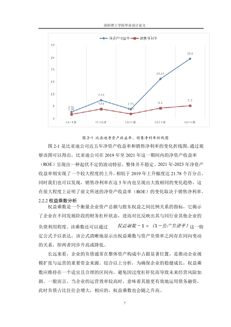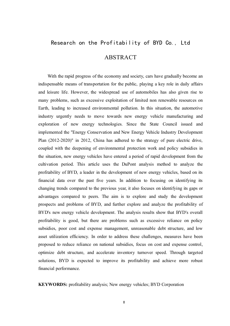 比亚迪股份有限公司盈利能力研究摘要随着经济社会的迅速进步,汽车已经逐渐成为大众不可或缺的出行工具,在日常事务及休闲生活中承担关键职能。然而,汽车的广泛应用亦滋生诸多问题,如过度榨取地球上有限的非可再生资源,导致环境污染程度加剧。在此情形下,汽车工业亟须向新能源汽车制造与新能源技术探索迈进。自2012年国务院发布实施《节能与新能源汽车产业发展规划(2012一2020年)》以来,我国坚持纯电驱动战略,加之环保工作的深入推进,以及形势迎来政策补贴,新能源汽车从培育期进入快速发展期。本文通过杜邦分析法,对在新能源汽车发展领域的佼佼者一一比亚迪近五年的财务数据进行盈利能力分析,除了注重与上年比较识别其变动趋势外,更注重与同业比较识别其存在的差距或优势,旨在探索研究比亚迪公司的发展前景及其中出现的问题,进而进一步探索分析比亚迪企业新能源汽车发展的盈利能力。分析结果发现比亚迪公司的盈利能力整体情况表现良好,但存在着过度依赖政策补贴、成本费用管理不善、负债结构不合理及资产使用效率低等问题。为了应对这些挑战,提出了减少对国家补助的依赖、注重成本费用控制、优化负债结构以及加快存货周转速度等对策。通过针对性解决方案,比亚迪公司有望改善其盈利能力,从而实现更加稳健的财务表现。关键词:盈利能力分析:新能源汽车:比亚迪公司Research on the Profitability of BYD Co.,LtdABSTRACTWith the rapid progress of the economy and society,cars have gradually become anindispensable means of transportation for the public,playing a key role in daily affairsand leisure life.However,the widespread use of automobiles has also given rise tomany problems,such as excessive exploitation of limited non renewable resources onEarth,leading to increased environmental pollution.In this situation,the automotiveindustry urgently needs to move towards new energy vehicle manufacturing andexploration of new energy technologies.Since the State Council issued andimplemented the "Energy Conservation and New Energy Vehicle Industry DevelopmentPlan(2012-2020)"in 2012,China has adhered to the strategy of pure electric drive,coupled with the deepening of environmental protection work and policy subsidies inthe situation,new energy vehicles have entered a period of rapid development from thecultivation period.This article uses the DuPont analysis method to analyze theprofitability of BYD,a leader in the development of new energy vehicles,based on itsfinancial data over the past five years.In addition to focusing on identifying itschanging trends compared to the previous year,it also focuses on identifying its gaps oradvantages compared to peers.The aim is to explore and study the developmentprospects and problems of BYD,and further explore and analyze the profitability ofBYD's new energy vehicle development.The analysis results show that BYD's overallprofitability is good,but there are problems such as excessive reliance on policysubsidies,poor cost and expense management,unreasonable debt structure,and lowasset utilization efficiency.In order to address these challenges,measures have beenproposed to reduce reliance on national subsidies,focus on cost and expense control,optimize debt structure,and accelerate inventory turnover speed.Through targetedsolutions,BYD is expected to improve its profitability and achieve more robustfinancial performance.KEYWORDS:profitability analysis;New energy vehicles;BYD Corporation目录前言..,,,,6第1章盈利能力的相关理论阐述61.1盈利能力含义概述61.2盈利能力的分析内容.71.2.1销售毛利率71.2.2成本费用利润率11.2.3资产负债率7第2章比亚迪股份有限公司盈利能力分析72.1比亚迪公司简介...........72.2比亚迪盈利能力财务指标分析…72.2.1净资产收益率(R0E)分析...72.2.2权益乘数分析92.2.3总资产周转率分析..102.3比亚迪盈利能力非财务指标分析13第3章比亚迪股份有限公司盈利能力存在问题的原因143.1资金质量不佳143.2资本结构不合理,获现能力差143.3缺乏长期成长性业务..14第4章提高比亚迪股份有限公司盈利能力的建议144.1拓宽融资渠道,优化资金来源144.2调整发展战略,增加盈利点.154.3巩固行业优势,
