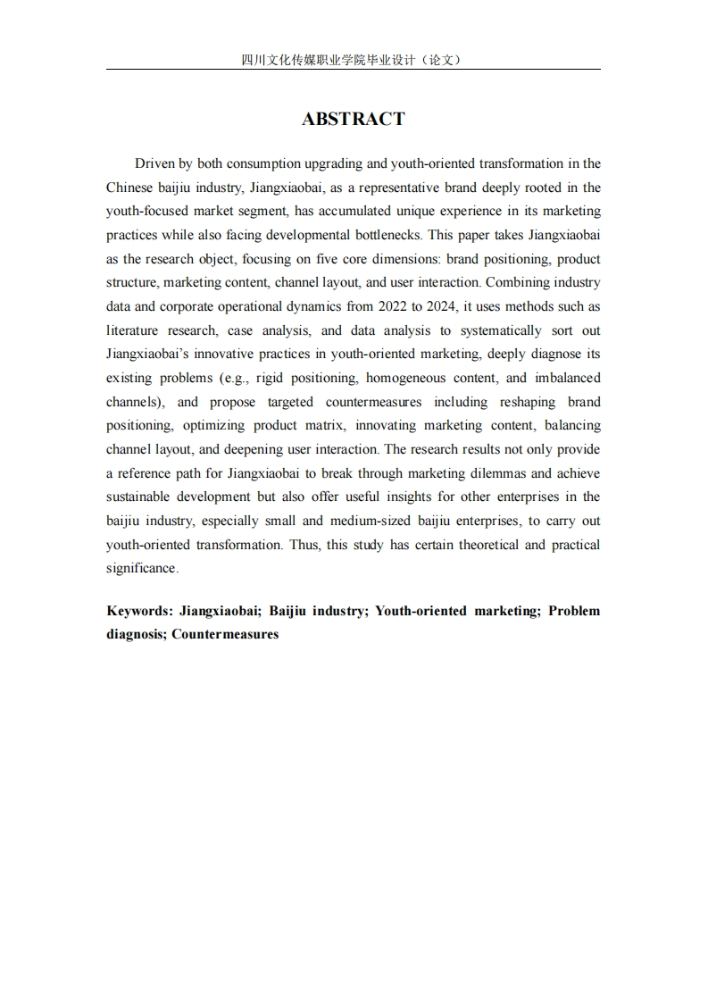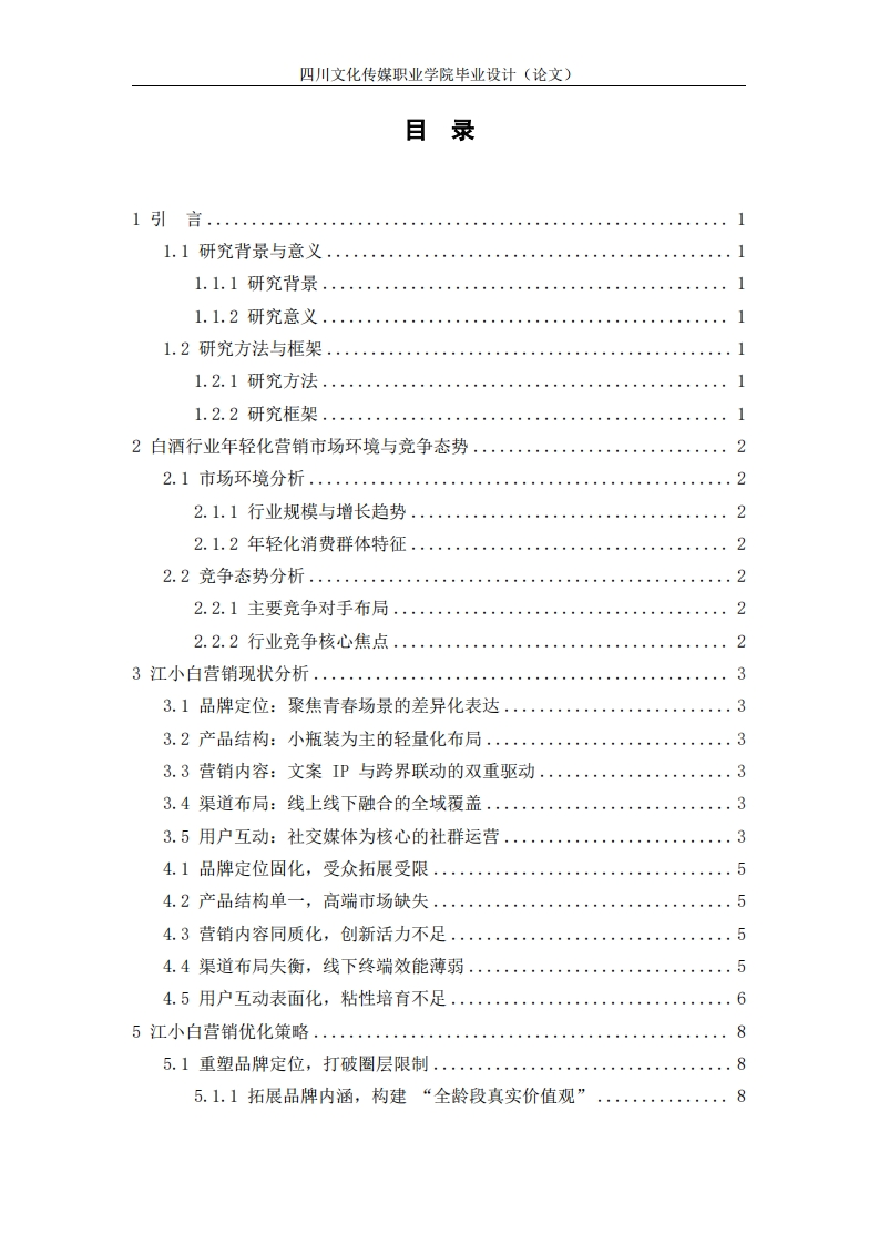 四川文化传媒职业学院毕业设计(论文)江小白公司的营销问题诊断及应对策略探讨摘要在白酒行业消费升级与年轻化转型的双重驱动下,江小白作为深耕年轻化赛道的代表性品牌,其营销实践既积累了独特经验,也面临着发展瓶颈。本文以江小白为研究对象,聚焦品牌定位、产品结构、营销内容、渠道布局及用户互动五大核心维度,结合2022-2024年行业数据与企业经营动态,运用文献研究法、案例分析法、数据分析法等研究方法,系统梳理江小白在年轻化营销中的创新实践,深入诊断其存在的定位固化、内容同质化、渠道失衡等问题,并针对性提出重塑品牌定位、优化产品矩阵、创新营销内容、均衡渠道布局、深化用户互动的应对策略。研究结果不仅为江小白突破营销困境、实现可持续发展提供参考路径,也为白酒行业其他企业,尤其是中小酒企的年轻化转型提供有益借鉴,具有一定的理论价值与实践意义。关键词:江小白:白酒行业:年轻化营销:问题诊断:应对策略四川文化传媒职业学院毕业设计(论文)ABSTRACTDriven by both consumption upgrading and youth-oriented transformation in theChinese baijiu industry,Jiangxiaobai,as a representative brand deeply rooted in theyouth-focused market segment,has accumulated unique experience in its marketingpractices while also facing developmental bottlenecks.This paper takes Jiangxiaobaias the research object,focusing on five core dimensions:brand positioning,productstructure,marketing content,channel layout,and user interaction.Combining industrydata and corporate operational dynamics from 2022 to 2024,it uses methods such asliterature research,case analysis,and data analysis to systematically sort outJiangxiaobai's innovative practices in youth-oriented marketing,deeply diagnose itsexisting problems (e.g.,rigid positioning,homogeneous content,and imbalancedchannels),and propose targeted countermeasures including reshaping brandpositioning,optimizing product matrix,innovating marketing content,balancingchannel layout,and deepening user interaction.The research results not only providea reference path for Jiangxiaobai to break through marketing dilemmas and achievesustainable development but also offer useful insights for other enterprises in thebaijiu industry,especially small and medium-sized baijiu enterprises,to carry outyouth-oriented transformation.Thus,this study has certain theoretical and practicalsignificanceKeywords:Jiangxiaobai;Baijiu industry;Youth-oriented marketing;Problemdiagnosis;Countermeasures四川文化传媒职业学院毕业设计(论文)目录1引言.……11.1研究背景与意义.....1.1.1研究背景.....1.1.2研究意义.......1.2研究方法与框架....1.2.1研究方法....11.2.2研究框架.2白酒行业年轻化营销市场环境与竞争态势..2.1市场环境分析.………22.1.1行业规模与增长趋势.22.1.2年轻化消费群体特征..。22.2竞争态势分析.......22.2.1主要竞争对手布局......2.2.2行业竞争核心焦点...…23江小白营销现状分析……331品牌定位:聚焦青春场景的差异化表达.…33.2产品结构:小瓶装为主的轻量化布局..33.3营销内容:文案P与跨界联动的双重驱动…33.4渠道布局:线上线下融合的全域覆盖..33.5用户互动:社交媒体为核心的社群运营..34.1品牌定位固化,受众拓展受限......4.2产品结构单一,高端市场缺失.…4.3营销内容同质化,创新活力不足.…54.4渠道布局失衡,线下终端效能薄弱.....·..54.5用户互动表面化,粘性培育不足..…..65江小白营销优化策略……85.1重塑品牌定位,打破圈层限制...85.1.1拓展品牌内涵,构建“全龄段真实价值观”.8四川文化传媒职业学院毕业设计(论文)5.1.2拓展消费场景,从“泛社交”到“细分场景渗透”·85.2优化产品结构,覆盖多元需求.…5.2.1高端化突破:打造“品质+文化”双驱动的高端系列..895.2.2多元化创新:聚焦功能化与定制化需求....·5.3创新营销内容,强化价值传递........95.3.1文案营销升级:从“扎心”到“价值共鸣”…95.3.2跨界合作深化:从“品牌曝光”到“价值共创”…105.3.3短视频内容创新:打造“江小白生活实验室”IP..·105.4平衡渠道布局,提升终端效能............115.4.1线上渠道优化:从“公域依赖”到“私域深耕”…115.4.2线下渠道拓展:“千城万店”计划下沉县域市场..·115.43线下终端标准化:构建“江小白终端评分体系”.115.5深化用户互动,构建品牌社群......125.5.1精细化社群运营:从“泛群”到“垂直社群”125.5.2完善用户共创机制:从“活动参与”到“长期合作”·125.5.3构建长效会员体系:从“短期奖励”到“长期绑定”.13结论14参考文献..15致谢……16