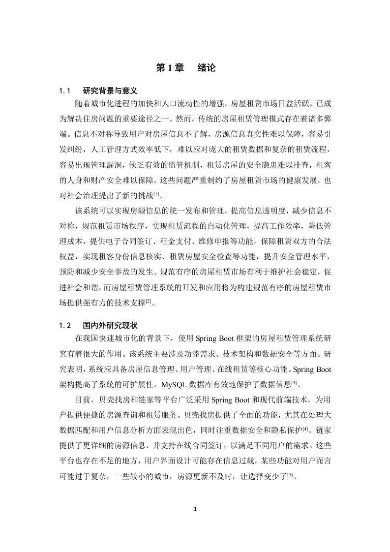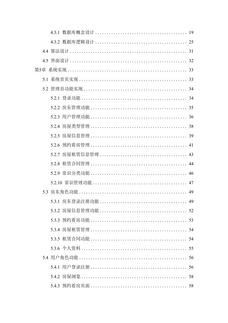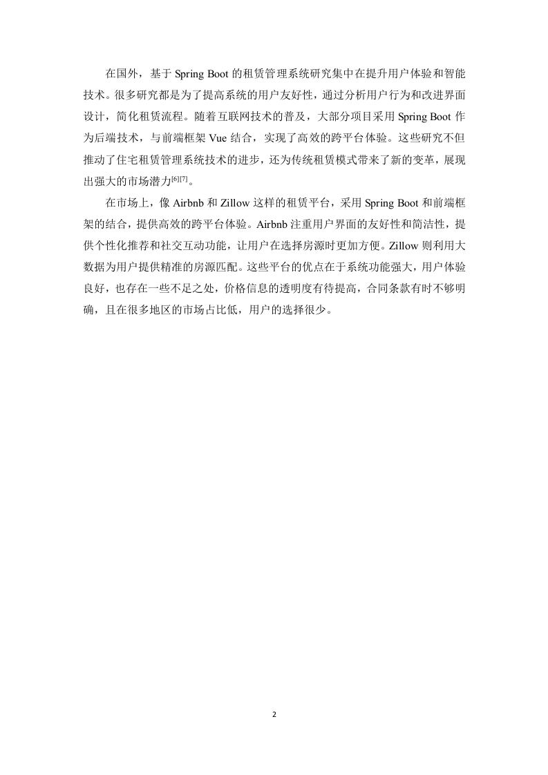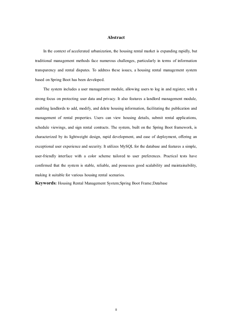 目录摘要....Abstract............I第1章绪论..…11.1研究背景与意义.....1.2国内外研究现状..第2章关键技术简介.2.1 Spring Boot框架.2.2 MySQL数据库.....32.3B/S模式..42.4系统开发平台及简介4第3章系统分析...63.1系统概述.....63.2可行性分析...63.2.1经济可行性分析63.2.2技术可行性分析..633需求分析..73.3.1功能需求分析..73.3.2非功能需求分析8第4章系统设计....94.1系统结构设计..94.2系统模块设计..94.2.1管理员模块设计94.2.2房东模块设计..134.2.3用户功能模块164.3数据库设计...…194.3.1数据库概念设计194.3.2数据库逻辑设计254.4算法设计314.5界面设计..32第5章系统实现335.1系统首页实现.…335.2管理员功能实现..345.2.1登录功能..345.2.2房东管理功能355.2.3用户管理功能365.2.4房屋类型管理385.2.5房屋信息管理395.2.6预约看房管理415.2.7房屋租赁信息管理.435.2.8租赁合同管理445.2.9常识分类功能...465.2.10常识管理功能..475.3房东角色功能....495.3.1房东登录注册功能..495.3.2房屋信息管理功能...。。。。。。。。。525.3.3预约看房功能...535.3.4房屋租赁管理..545.3.5租赁合同功能...545.3.6个人资料....。。。。。。。。555.4用户角色功能....565.4.1用户登录注册...565.4.2房屋浏览.....585.4.3预约看房页面....585.4.4房屋租赁......605.4.5房屋常识.615.4.6个人中心..63第6章系统测试...·656.1系统目的..656.2测试过程.656.3测试结论66结论...67参考文献..68致谢69附录.70摘要在城市化加速的背景下,房屋租赁市场发展快速,但传统管理方法存在诸多问题,特别是信息透明度和租金纠纷方面。为解决这些问题,开发了一款基于Spring Boot的房屋租赁管理系统。该系统包括用户管理模块,用户可以进行登录和注册功能,用于保护用户信息和隐私,也包括房东管理模块,房东可以对房屋信息进行新增、修改和删除,便于房源的发布和管理。用户可以查看房屋信息,提交租赁申请,预约看房和签订租赁合同。系统基于Spring Boot框架,特点为轻量级、快速开发和易于部署,提供卓越的用户体验和安全性。数据库采用MySQL,界面设计简单符合用户,色彩设计符合用户喜好。通过实际测试证实,该系统稳定、可靠,具有良好的扩展性、可维护性,适用于各种房屋租赁场景。关键词:房屋租赁管理系统:Spring Boot框架:数据库