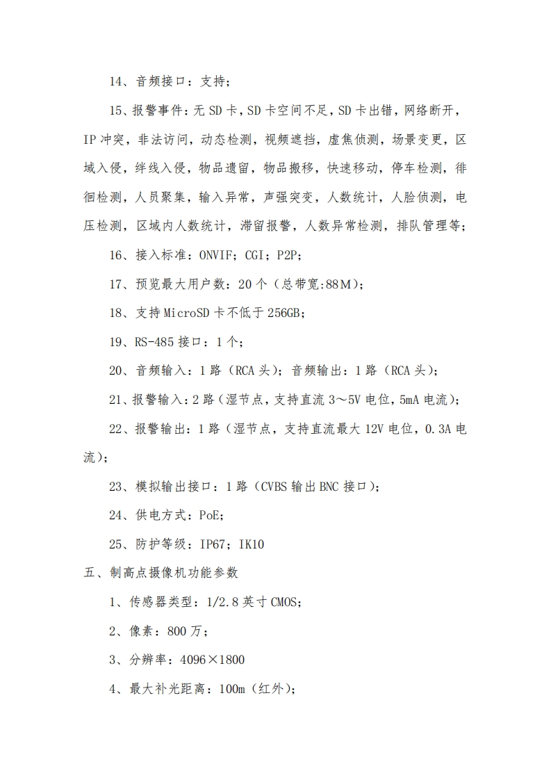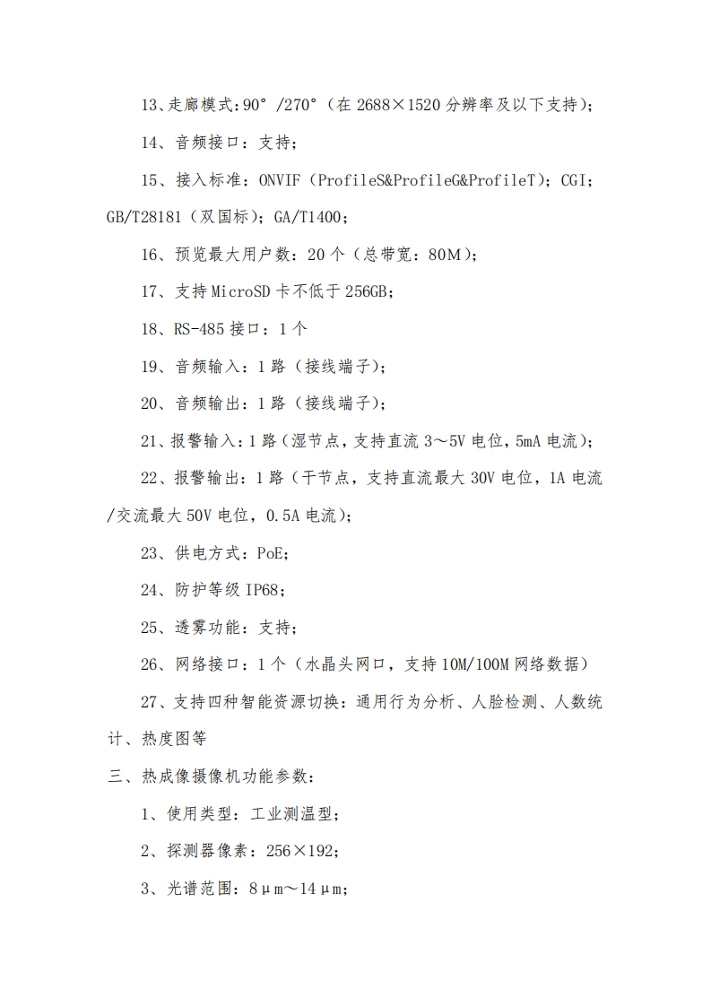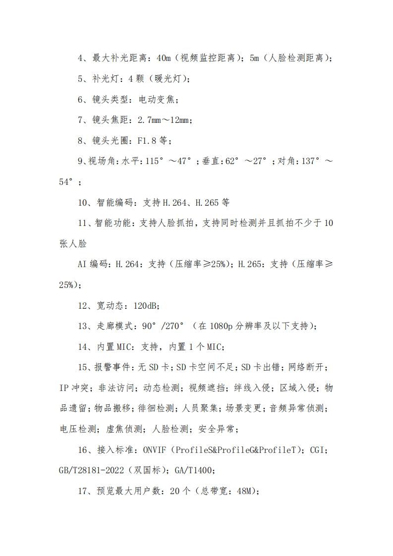 浙江华智新航科技有限公司具备是一套集成化、智能化的安防管理解决方案,核心功能涵盖实时图像获取、数据传输、集中控制与智能分析四大层面。在图像采集环节,系统具备优异的低照度成像与宽动态处理能力,无论强光或暗光环境,都能保证画面细节清晰可辨。后端支持全天候不间断录制,并采用先进的智能编码技术,在保障影像质量的前提下,有效降低存储资源占用与传输带宽压力。管理平台提供实时预览、多画面轮巡、电子地图定位、录像回溯与快速检索等功能,用户可通过多种终端随时随地访问系统,实时掌握现场动态。该系统的核心价值首先体现在安全保障层面。它构建了一道无形的数字防线,对异常情况实时感知、主动告警,有效预防潜在风险,并为事后追溯提供清晰可靠的影像依据。其次,系统显著优化了管理效率。通过技术手段替代或辅助人工值守,可实现重点区域的远程集中监管,降低人力巡查成本。再者,系统具有良好的适应性与扩展性,可根据不同场景需求,灵活接入更多智能应用,持续赋能精细化运营。整体而言,这套系统不仅实现了对空间的全时全域可视化覆盖,更通过智能分析能力为安全管理注入了主动思考的要素,为用户打造一个更加安全、有序、可控的运营环境。产品介绍一、人脸抓拍摄像机功能参数:1、传感器类型:1/1.8英寸CM0S;2、像素:400万;3、最大分辨率:2688×1520: