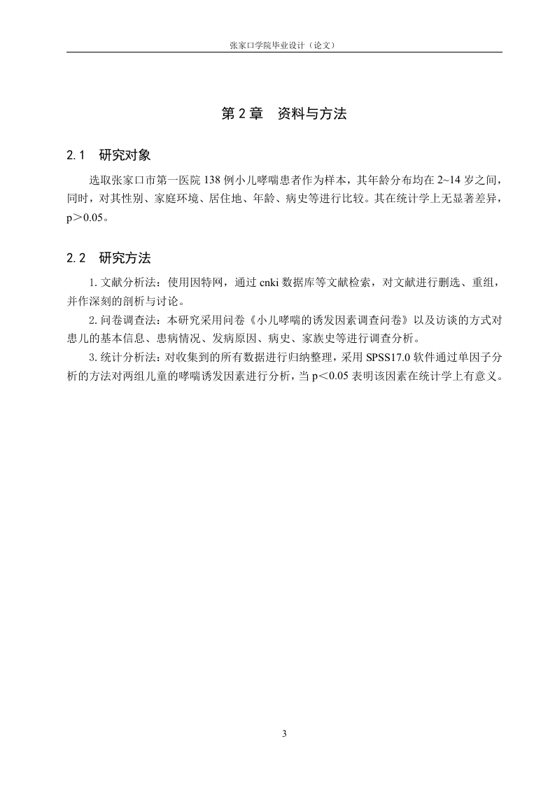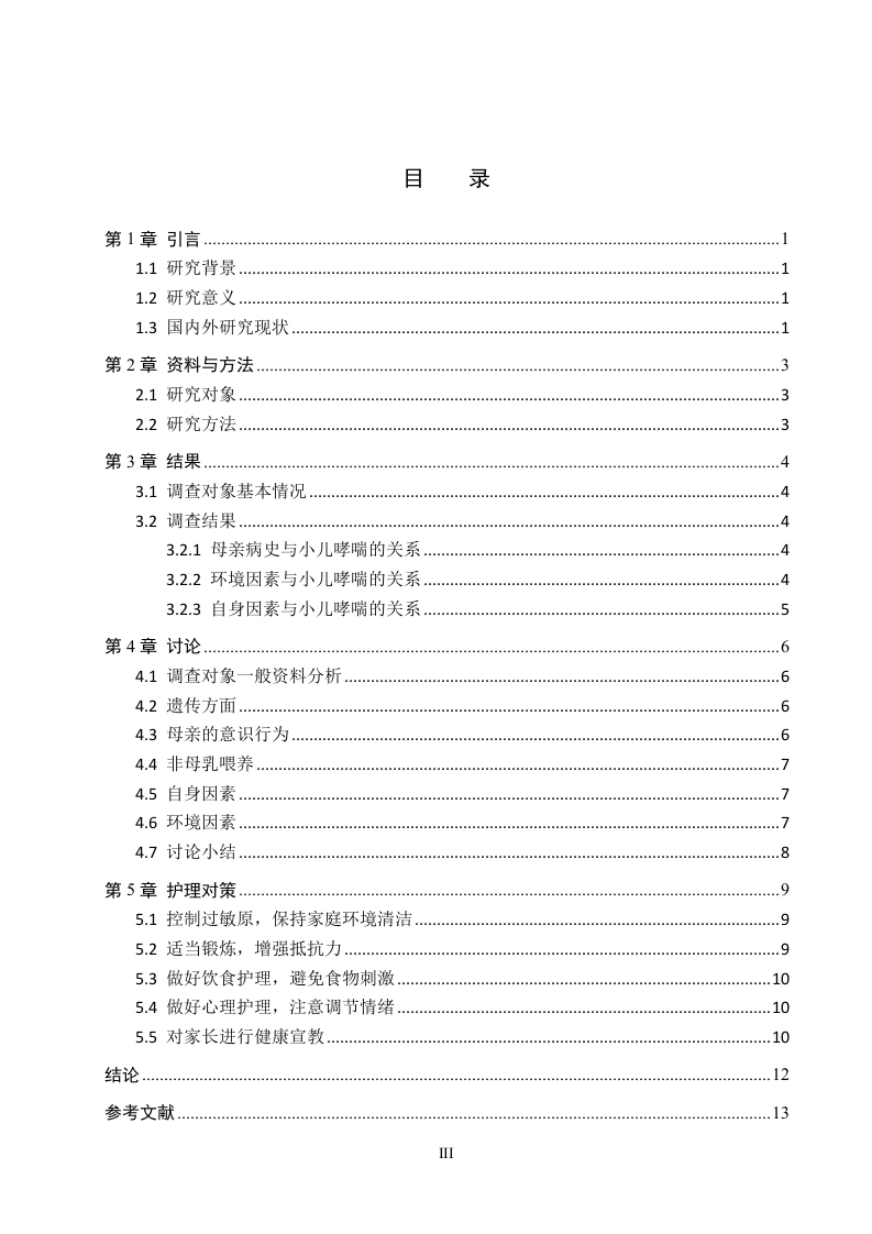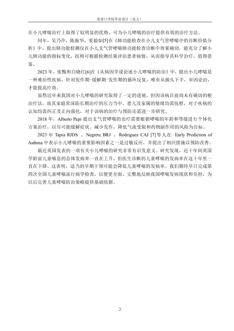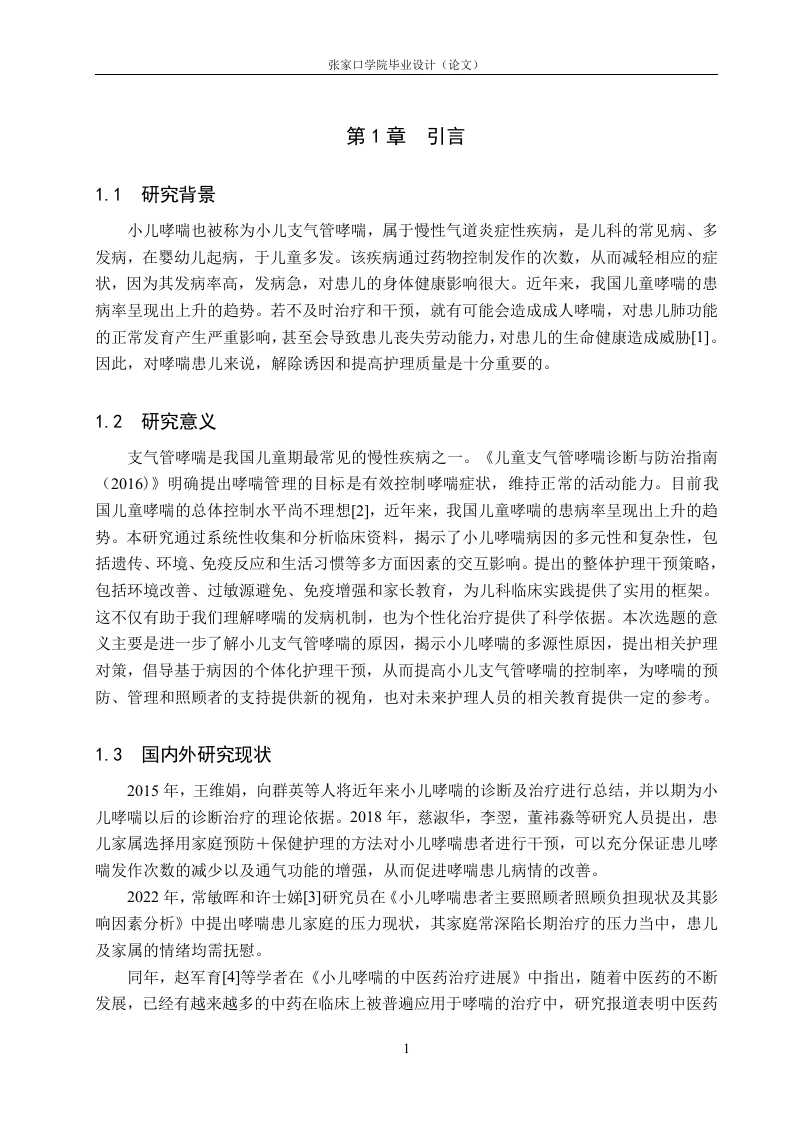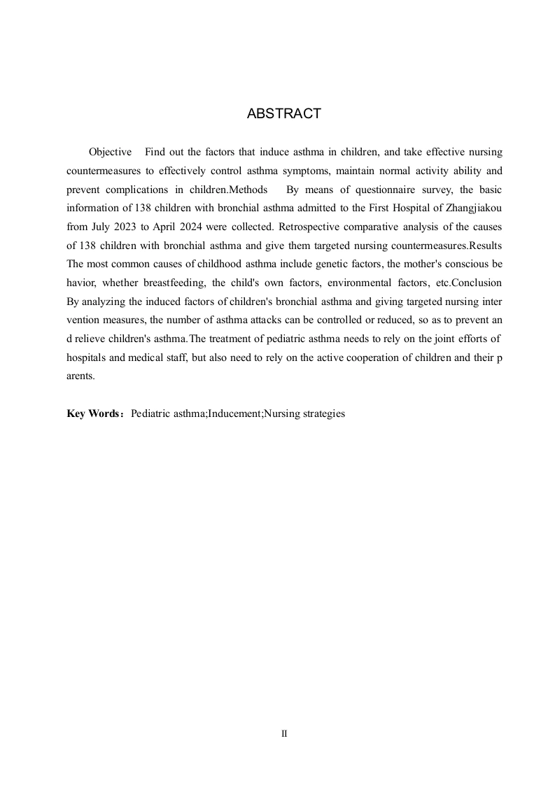 小儿哮喘的原因分析及护理对策摘要目的探寻诱发小儿哮喘的因素,并且有针对性的提出并采取相应护理对策,有效控制哮喘症状,维持正常的活动能力,预防小儿并发症的发生。方法采用问卷调查的方式,收集张家口第一医院自2023年7月至2024年5月期间收住院的138例支气管哮喘患儿的基本信息,分析这138例支气管哮喘患儿的发病原因,给予其针对性的护理对策。结果诱发儿童哮喘最常见到的因素包括遗传因素,母亲的意识行为,是否为母乳喂养,儿童自身因素和环境因素等。结论通过对小儿支气管哮喘诱发因素的分析,并给予针对性的护理干预措施,可以控制哮喘发作的次数或降低其发作程度,从而预防和缓解小儿哮喘。小儿哮喘的治疗需要依靠医院和医护人员的共同努力,更需要依靠患儿及其家长的积极配合。关键词:小儿哮喘:诱因:护理对策ABSTRACTObjective Find out the factors that induce asthma in children,and take effective nursingcountermeasures to effectively control asthma symptoms,maintain normal activity ability andprevent complications in children.Methods By means of questionnaire survey,the basicinformation of 138 children with bronchial asthma admitted to the First Hospital of Zhangjiakoufrom July 2023 to April 2024 were collected.Retrospective comparative analysis of the causesof 138 children with bronchial asthma and give them targeted nursing countermeasures.ResultsThe most common causes of childhood asthma include genetic factors,the mother's conscious behavior,whether breastfeeding,the child's own factors,environmental factors,etc.ConclusionBy analyzing the induced factors of children's bronchial asthma and giving targeted nursing intervention measures,the number of asthma attacks can be controlled or reduced,so as to prevent and relieve children's asthma.The treatment of pediatric asthma needs to rely on the joint efforts ofhospitals and medical staff,but also need to rely on the active cooperation of children and their parents.Key Words:Pediatric asthma;Inducement;Nursing strategies目录第1章引言…。1.1研究背景.11.2研究意义….11.3国内外研究现状.1第2章资料与方法.32.1研究对象.32.2研究方法3第3章结果…3.1调查对象基本情况...43.2调查结果.…43.2.1母亲病史与小儿哮喘的关系..43.2.2环境因素与小儿哮喘的关系43.2.3自身因素与小儿哮喘的关系5第4章讨论.64.1调查对象一般资料分析.64.2遗传方面.…64.3母亲的意识行为】.64.4非母乳喂养….74.5自身因素.74.6环境因素.4.7讨论小结.8第5章护理对策..95.1控制过敏原,保持家庭环境清洁.95.2适当锻炼,增强抵抗力.…。95.3做好饮食护理,避免食物刺激.105.4做好心理护理,注意调节情绪.105.5对家长进行健康宣教..10结论.12参考文献.13致谢14附录A小儿哮喘诱发因素调查问卷】IV