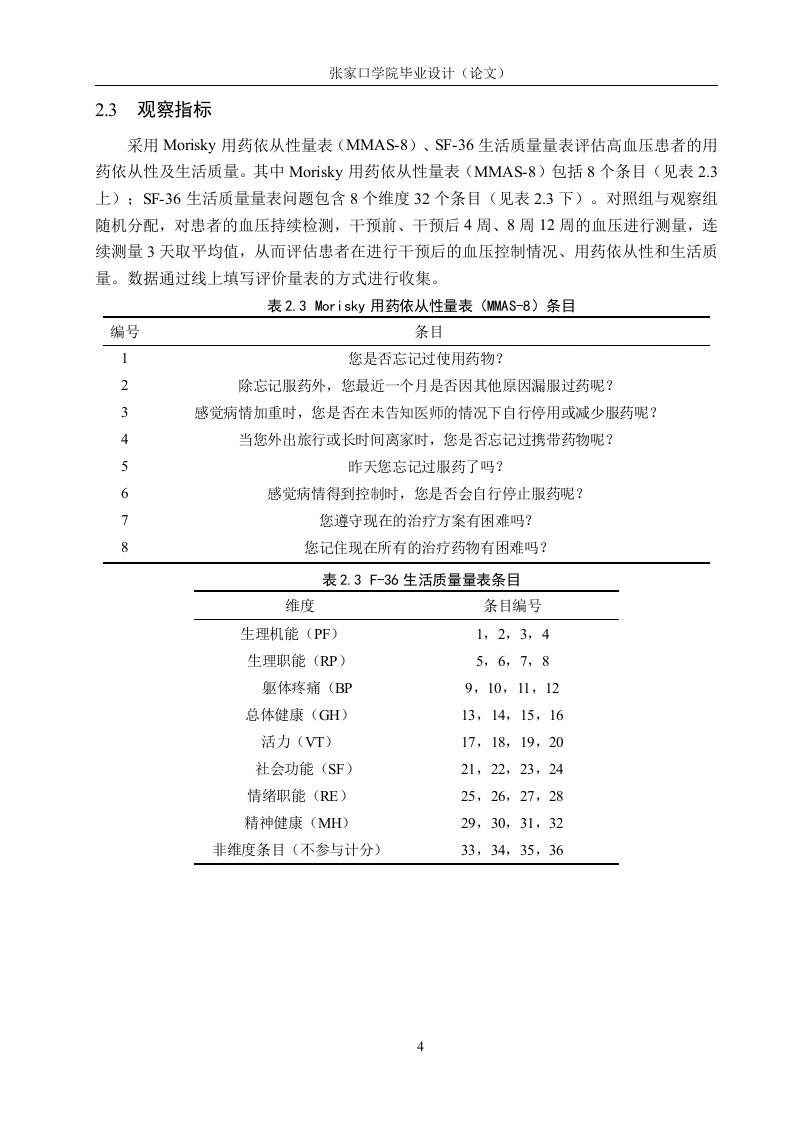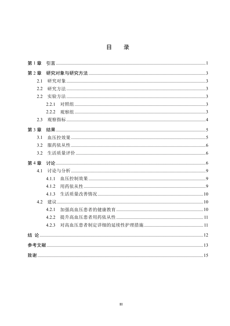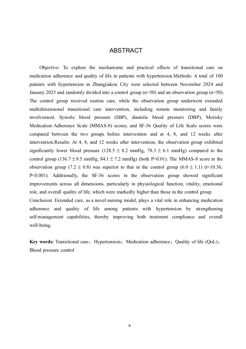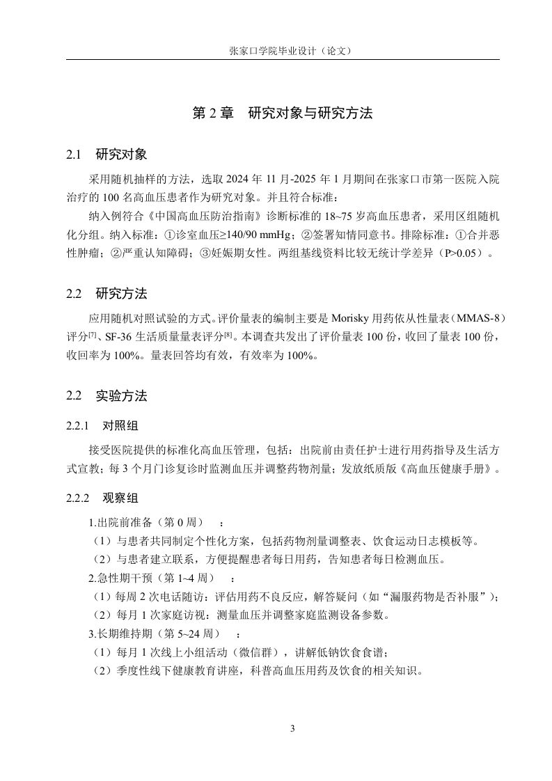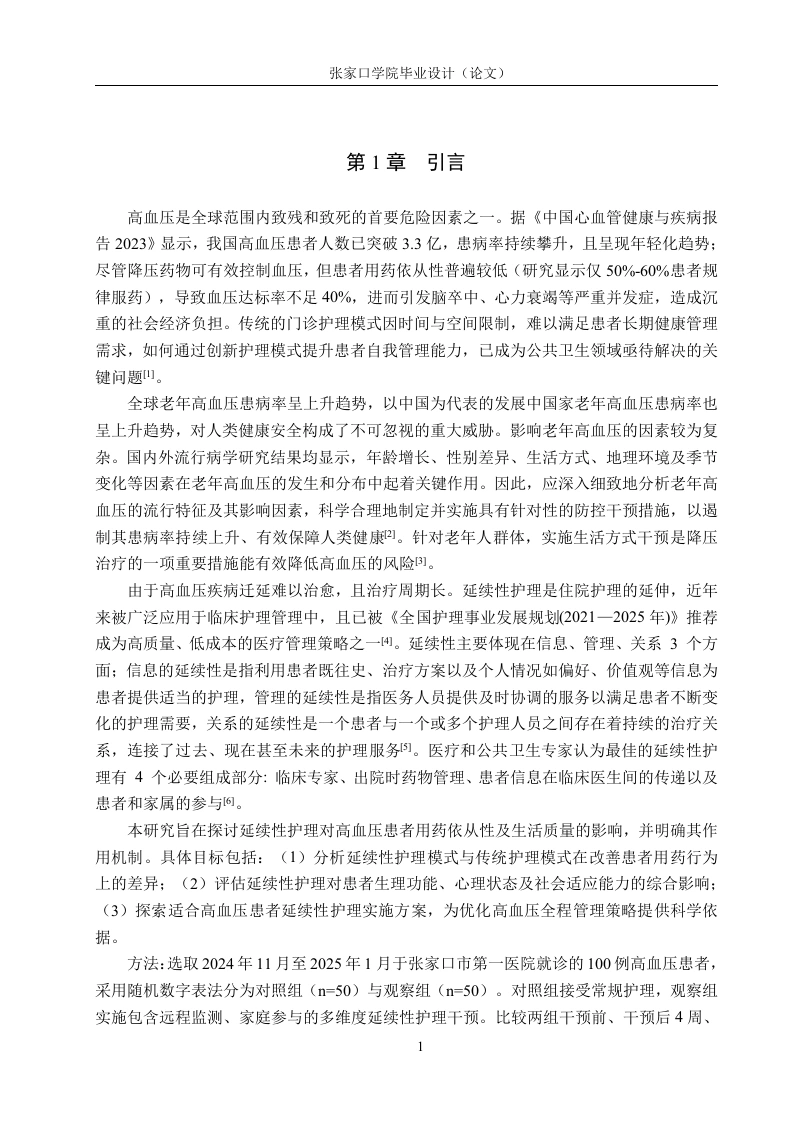 延续性护理对高血压患者用药依从性及生活质量的影响摘要目的:探讨延续性护理对高血压患者用药依从性及生活质量的影响机制与实践效果。方法:选取2024年11月至2025年1月张家口市的100例高血压患者,采用随机数字表法分为对照组(=50)与观察组(=50)。对照组接受常规护理,观察组实施包含远程监测、家庭参与的多维度延续性护理干预。比较两组干预前、干预后4周、8周、12周的收缩压(SBP)、舒张压(DBP)、Morisky用药依从性量表(MMAS-8)评分、SF-36生活质量量表评分。结果:干预4周、8周、12周后,最终结果观察组血压(128.5±8.2mmHg,78.3±6.1mmHg)显著低于对照组血压(136.7±9.5mmHg,84.1±7.2mmHg)(均P<0.01):MMAS-8评分观察组(7.2±0.8分)优于对照组(6.0±1.1分)(仁10.36,P<0.001);观察组S℉-36各维度幅度显著提升,且显著高于对照组,本次干预在提升实验组个体的生理功能、精力、情感职能及总体生活质量方面表现出显著效果。结论:延续性护理作为一种新型的护理模式,在提高高血压患者的用药依从性和生活质量方面具有重要作用,增强患者的自我管理能力,从而提高用药依从性和生活质量。关键词:延续性护理:高血压:用药依从性;生活质量:血压控制ABSTRACTObjective:To explore the mechanisms and practical effects of transitional care onmedication adherence and quality of life in patients with hypertension.Methods:A total of 100patients with hypertension in Zhangjiakou City were selected between November 2024 andJanuary 2025 and randomly divided into a control group(n=50)and an observation group(n=50).The control group received routine care,while the observation group underwent extendedmultidimensional transitional care intervention,including remote monitoring and familyinvolvement.Systolic blood pressure (SBP),diastolic blood pressure (DBP),MoriskyMedication Adherence Scale (MMAS-8)scores,and SF-36 Quality of Life Scale scores werecompared between the two groups before intervention and at 4,8,and 12 weeks afterintervention.Results:At 4,8,and 12 weeks after intervention,the observation group exhibitedsignificantly lower blood pressure (128.5+8.2 mmHg,78.3+6.1 mmHg)compared to thecontrol group (136.79.5 mmHg,84.17.2 mmHg)(both P<0.01).The MMAS-8 score in theobservation group (7.2+0.8)was superior to that in the control group (6.0+1.1)(t=10.36,P<0.001).Additionally,the SF-36 scores in the observation group showed significantimprovements across all dimensions,particularly in physiological function,vitality,emotionalrole,and overall quality of life,which were markedly higher than those in the control groupConclusion:Extended care,as a novel nursing model,plays a vital role in enhancing medicationadherence and quality of life among patients with hypertension by strengtheningself-management capabilities,thereby improving both treatment compliance and overallwell-being.Key words:Transitional care:Hypertension;Medication adherence;Quality of life (QoL);Blood pressure control目录第1章引言第2章研究对象与研究方法.32.1研究对象32.2研究方法.。32.2实验方法32.2.1对照组32.2.2观察组32.3观察指标..4第3章结果.53.1血压控效果53.2服药依从性.…。.63.2生活质量评价.6第4章讨论.64.1讨论与分析.94.1.1血压控制效果94.1.2用药依从性94.1.3生活质量改善情况.104.2建议104.2.1加强高血压患者的健康教育104.2.2提升高血压患者用药依从性4.2.3对高血压患者制定详细的延续性护理措施11结纶44444444.12参考文献.….13致谢….15张家口学院毕业设计(论文)第1章引言高血压是全球范围内致残和致死的首要危险因素之一。据《中国心血管健康与疾病报告2023》显示,我国高血压患者人数已突破3.3亿,患病率持续攀升,且呈现年轻化趋势:尽管降压药物可有效控制血压,但患者用药依从性普遍较低(研究显示仅50%-60%患者规律服药),导致血压达标率不足40%,进而引发脑卒中、心力衰竭等严重并发症,造成沉重的社会经济负担。传统的门诊护理模式因时间与空间限制,难以满足患者长期健康管理需求,如何通过创新护理模式提升患者自我管理能力,已成为公共卫生领域亟待解决的关键问题山。全球老年高血压患病率呈上升趋势,以中国为代表的发展中国家老年高血压患病率也呈上升趋势,对人类健康安全构成了不可忽视的重大威胁。影响老年高血压的因素较为复杂。国内外流行病学研究结果均显示,年龄增长、性别差异、生活方式、地理环境及季节变化等因素在老年高血压的发生和分布中起着关键作用。因此,应深入细致地分
