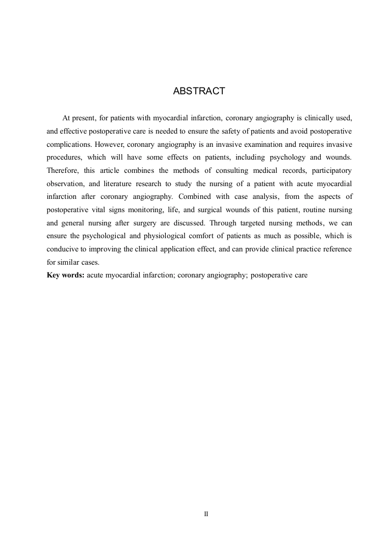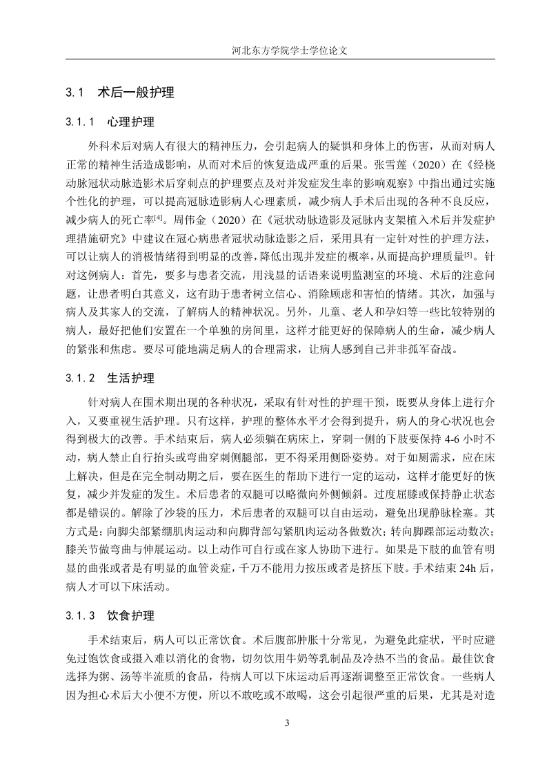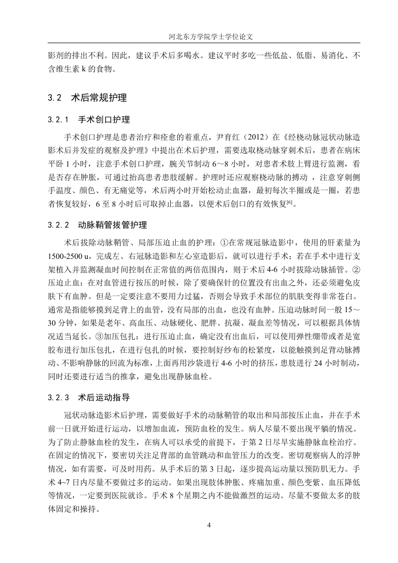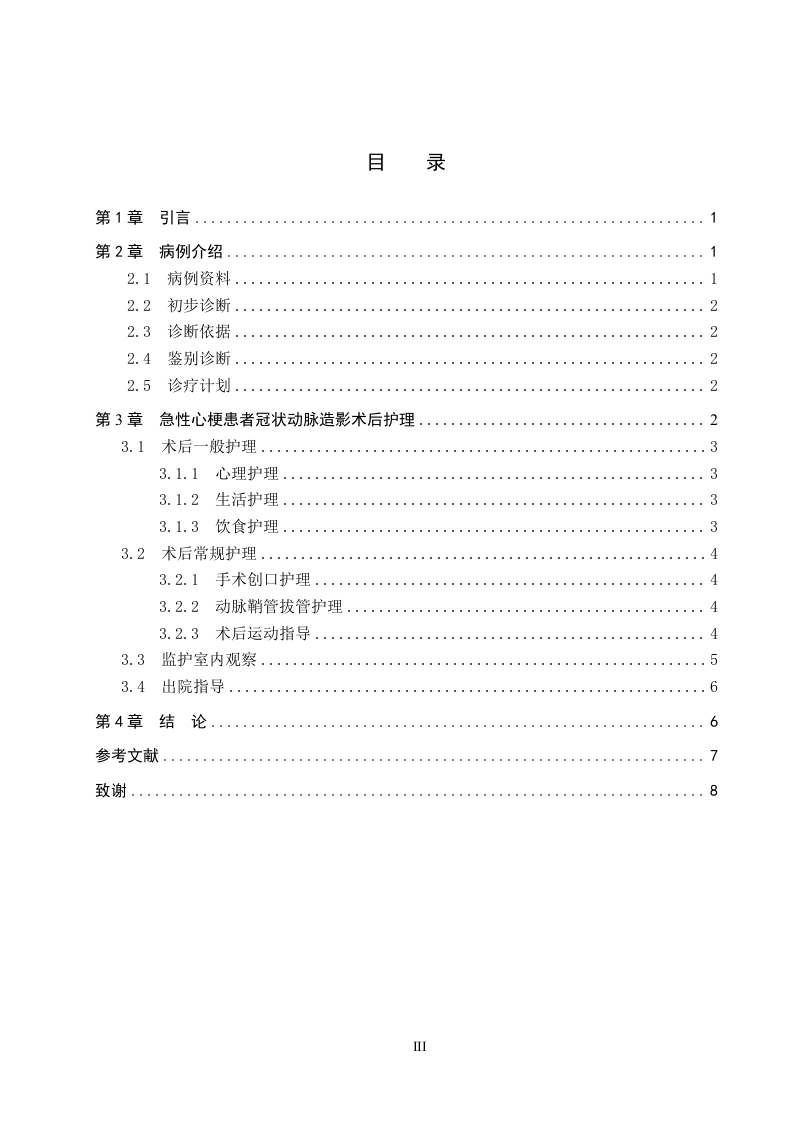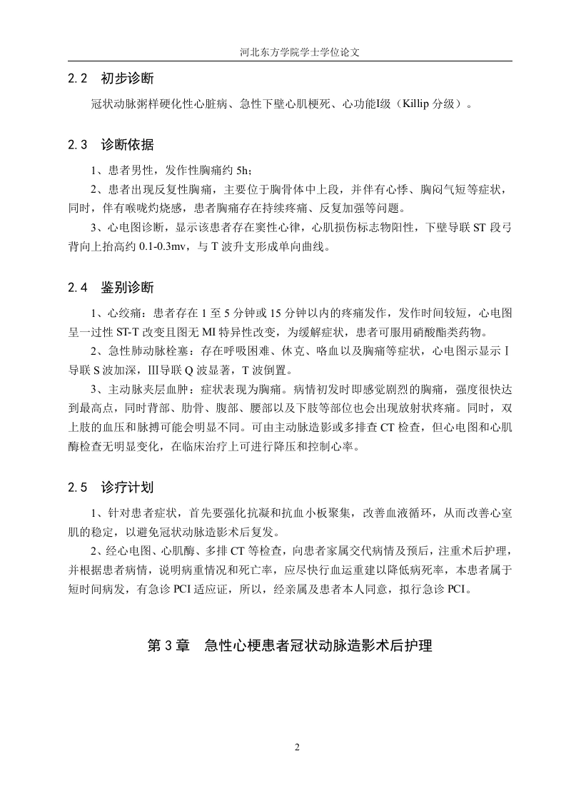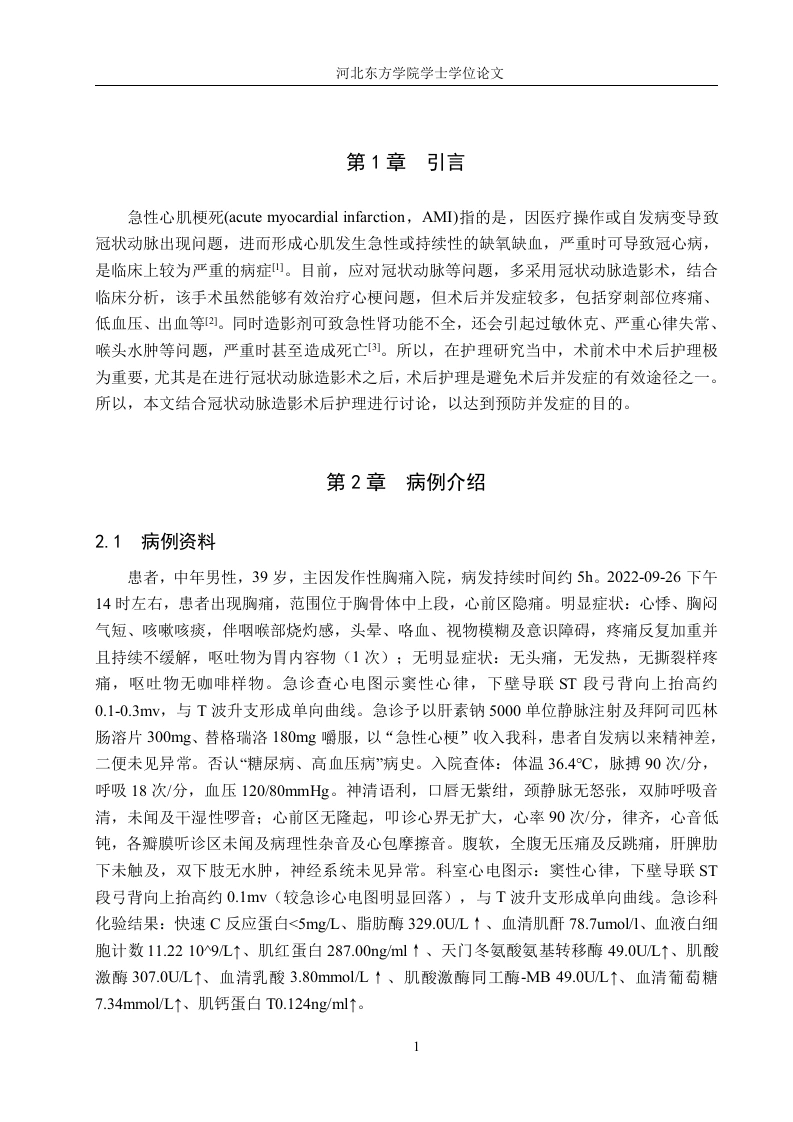 一例急性心梗患者行冠状动脉造影术后的护理摘要目前,对于心梗患者,临床上采用冠脉造影术,需要术后进行有效护理,才能够保证患者生命安全,进而避免术后并发症。但是冠脉造影术属于侵入式检查,需要进行有创操作,会对患者产生一些影响,包括心理、创口等。所以本文结合查阅病历资料、参与式观察、文献研究等方法,对一例急性心梗患者行冠状动脉造影术后护理进行研究,结合案例分析,从本例患者术后生命体征监测、生活、手术创口等方面入手,对患者手术后常规护理和一般护理等进行论述。通过针对性的护理方法,尽可能保证患者心理和生理上的舒适,有利于提高临床应用效果,并且能够为相似病例提供临床实践参考。关键词:急性心梗:冠状动脉造影术;术后护理ABSTRACTAt present,for patients with myocardial infarction,coronary angiography is clinically used,and effective postoperative care is needed to ensure the safety of patients and avoid postoperativecomplications.However,coronary angiography is an invasive examination and requires invasiveprocedures,which will have some effects on patients,including psychology and wounds.Therefore,this article combines the methods of consulting medical records,participatoryobservation,and literature research to study the nursing of a patient with acute myocardialinfarction after coronary angiography.Combined with case analysis,from the aspects ofpostoperative vital signs monitoring,life,and surgical wounds of this patient,routine nursingand general nursing after surgery are discussed.Through targeted nursing methods,we canensure the psychological and physiological comfort of patients as much as possible,which isconducive to improving the clinical application effect,and can provide clinical practice referencefor similar cases.Key words:acute myocardial infarction;coronary angiography;postoperative careⅡ目录第1章引言..…第2章病例介绍2.1病例资料...2.2初步诊断22.3诊断依据..2.4鉴别诊断.…2.5诊疗计划.................2第3章急性心梗患者冠状动脉造影术后护理23.1术后一般护理........3.1.1心理护理..33.1.2生活护理..…33.1.3饮食护理...3.2术后常规护理......……43.2.1手术创口护理43.2.2动脉鞘管拔管护理…43.2.3术后运动指导3.3监护室内观察..….53.4出院指导...….6第4章结论参考文献....…7致谢..面河北东方学院学士学位论文第1章引言急性心肌梗死(acute myocardial infarction,AMI)指的是,因医疗操作或自发病变导致冠状动脉出现问题,进而形成心肌发生急性或持续性的缺氧缺血,严重时可导致冠心病,是临床上较为严重的病症山。目前,应对冠状动脉等问题,多采用冠状动脉造影术,结合临床分析,该手术虽然能够有效治疗心梗问题,但术后并发症较多,包括穿刺部位疼痛、低血压、出血等四。同时造影剂可致急性肾功能不全,还会引起过敏休克、严重心律失常、喉头水肿等问题,严重时甚至造成死亡)。所以,在护理研究当中,术前术中术后护理极为重要,尤其是在进行冠状动脉造影术之后,术后护理是避免术后并发症的有效途径之一。所以,本文结合冠状动脉造影术后护理进行讨论,以达到预防并发症的目的。第2章病例介绍2.1病例资料患者,中年男性,39岁,主因发作性胸痛入院,病发持续时间约5h。2022-09-26下午14时左右,患者出现胸痛,范围位于胸骨体中上段,心前区隐痛。明显症状:心悸、胸闷气短、咳嗽咳痰,伴咽喉部烧灼感,头晕、咯血、视物模糊及意识障碍,疼痛反复加重并且持续不缓解,呕吐物为胃内容物(1次):无明显症状:无头痛,无发热,无撕裂样疼痛,呕吐物无咖啡样物。急诊查心电图示窦性心律,下壁导联ST段弓背向上抬高约0.1-0.3mv,与T波升支形成单向曲线。急诊予以肝素钠5000单位静脉注射及拜阿司匹林肠溶片300mg、替格瑞洛180mg嚼服,以“急性心梗”收入我科,患者自发病以来精神差,二便未见异常。否认“糖尿病、高血压病”病史。入院查体:体温36.4℃,脉搏90次/分,呼吸18次/分,血压120/80mmHg。神清语利,口唇无紫绀,颈静脉无怒张,双肺呼吸音清,未闻及干湿性啰音:心前区无隆起,叩诊心界无扩大,心率90次/分,律齐,心音低钝,各瓣膜听诊区未闻及病理性杂音及心包摩擦音。腹软,全腹无压痛及反跳痛,肝脾肋下未触及,双下肢无水肿,神经系统未见异常。科室心电图示:窦性心律,下壁导联ST段弓背向上抬高约0.1mv(较急诊心电图明显回落),与T波升支形成单向曲线。急诊科化验结果:快速C反应蛋白<5mg/L、脂肪酶329.0UL↑、血清肌酐78.7umol1、血液白细胞计数11.22109L↑、肌红蛋白287.00ng/ml↑、天门冬氨酸氨基转移酶49.0UL↑、肌酸激酶307.0UL↑、血清乳酸3.80 mmol/L↑、肌酸激酶同工酶-MB49.0UL↑、血清葡萄糖7.34mmol/L↑、肌钙蛋白T0.124ng/ml↑。