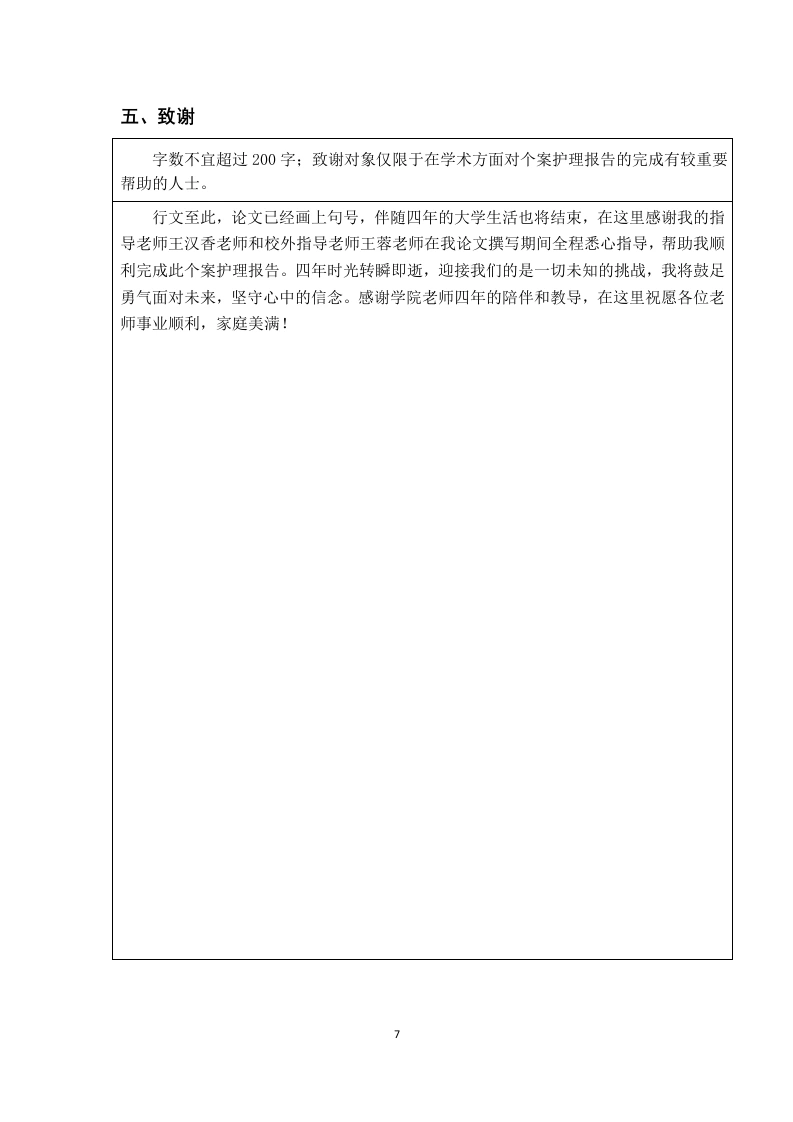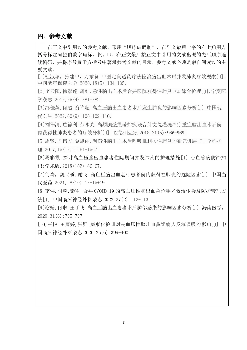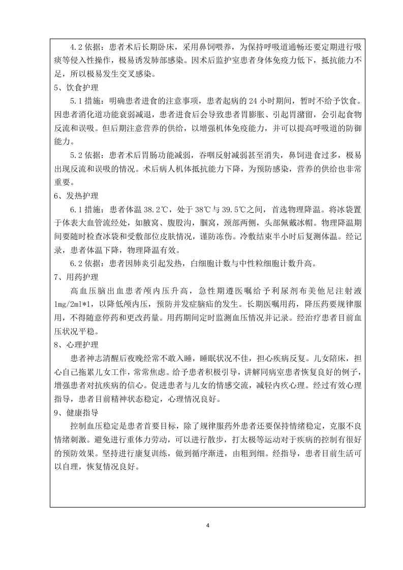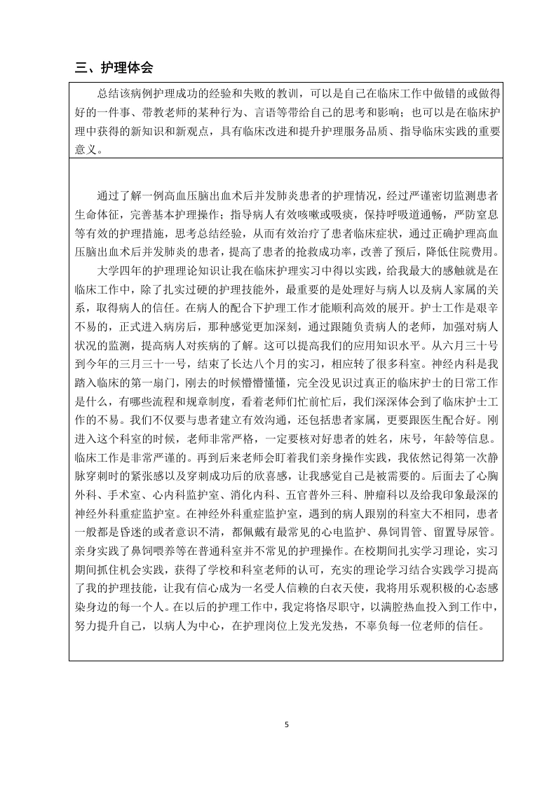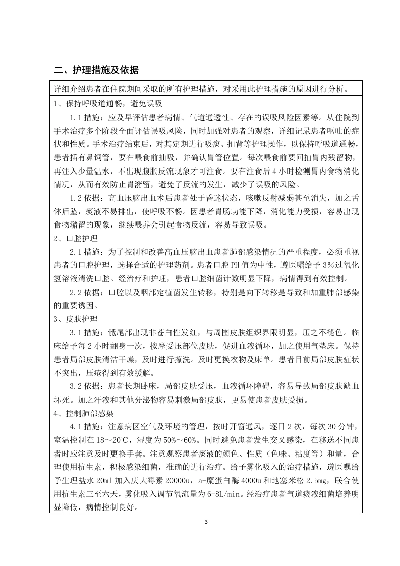 一例高血压脑出血术后并发肺炎患者的护理一、病例介绍:内容包括:①患者一般情况及入院经过:②患者主诉、临床表现、实验室检查、既往史:③治疗、护理过程及其效果。1、患者一般情况及入院经过患者,女,60岁,汉族,职业退休,已婚,无药物及食物过敏史,无家族遗传病史。患者意识障碍,家属陈述患者于活动后出现憋气、呼吸困难2小时,2022年8月13日家属随急救车将患者送入我院神经外科重症监护室。查体:体温38.2℃,脉搏次数为每分106次,呼吸次数为每分22次,血压为150/89mlHg。患者神志昏迷,头颅无畸形,双侧瞳孔等大,位置处于中心,左右直径为3:3mm,光反应存在,胸廓对称无畸形,双肺呼吸音粗,可以听到啰音,腹部软,肠鸣音正常。经治疗,患者情况良好,于2023年2月30日出院。2、临床信息2.1患者主诉:咳嗽,咳痰,胸痛伴呼吸困难2小时。临床表现:患者咳嗽,咳痰,胸痛呼吸困难,四肢无自主活动左侧肢体刺激有反应,右侧肢体刺激无反应,眼球活动障碍。2.2实验室检查:脑脊液压力增高,血液破入脑室,检查呈血性无感染。查肝肾功能正常。白细胞计数10.53×10/L,中性粒细胞计数8.2×10/L,淋巴细胞计数0.57×10/L,单核细胞计数0.27×10/L,嗜酸性粒细胞计数0.05×10/L,嗜碱性粒细胞计数0.01×10/L,红细胞计数4.71×10^12/L,血红蛋白145g/L,血小板计数163×10/L。凝血酶原时间12.7s,部分凝血酶原时间27.4s,凝血酶时间16.1s,纤维蛋白原1.96g/L,D-二聚体测定0.54mg/L,纤维蛋白原降解产物2.1mg/L,PT百分活度90.7%,APTT比值0.88,TT比值0.9。痰液检查结果显示:铜绿假单胞菌(+),肺炎链球菌(+)。2.3辅助检查:脑CT平扫显示左侧额顶叶脑出血,多发腔隙脑梗死,部分软化灶,白质脱髓鞘,脑萎缩。双侧乳突炎,多组鼻窦炎,我院新冠病毒核酸检测阴性。2.4既往史:既往有高血压、冠心病、脑梗死,颅脑术后、下肢静脉血栓术后、上腔静脉血栓、肝硬化。否认结核病史,否认传染病史,预防接种史不详,否认药物及食物过敏史,否认输血史。2.5初步诊断:脑内出血:高血压:冠状动脉粥样硬化性心脏病:重症肺炎3、治疗、护理过程及其效果:患者住院后给予长期医嘱注射用拉氧头孢钠0.5*1支/支抗菌消炎:给予清开灵注射液21*1支/支用于清热解毒、消炎、镇静安神的功效:给予复方氨基酸注射液1.25g/250m1*1用于补充氨基酸,促进人体蛋白质代谢功能正常,纠正负氮平衡,加速伤口愈合,改善术后的营养状况:给予体外培育牛黄1粒用于促进脂肪的消化和吸收、止咳化痰:给予熟三七粉2袋用于补血养血和提高免疫力:给予水蛭粉一粒入中药口服用于活血化瘀,消肿止痛:给予雾化吸入用复方异丙托溴铵溶液(坦量舒)(2.5+0.5)mg和二羟丙茶碱注射液250ml/2ml*1支/支静脉注射用于解痉平喘:给予布美他尼注射液1mg/21*1支/支用于脱水减轻脑水肿:住院期给予低盐低脂鼻饲流质饮食。经治疗和护理患者生命体征平稳,病情稳定。2二、护理措施及依据详细介绍患者在住院期间采取的所有护理措施,对采用此护理措施的原因进行分析。1、保持呼吸道通畅,避免误吸1.1措施:应及早评估患者病情、气道通透性、存在的误吸风险因素等。从住院到手术治疗多个阶段全面评估误吸风险,同时加强对患者的观察,详细记录患者呕吐的症状和性质。手术治疗结束后,对其定期进行吸痰、扣背等护理操作,以保持呼吸道通畅,患者插有鼻饲管,要在喂食前抽吸,并确认胃管位置。每次喂食前要回抽胃内残留物,再注入少量温水,不出现腹胀反流现象才可注食。要在注食后4小时检测胃内食物消化情况,从而有效防止胃潴留,避免了反流的发生,减少了误吸的风险。1.2依据:高血压脑出血术后患者处于昏迷状态,咳嗽反射减弱甚至消失,加之舌体后坠,痰液不易排出,使呼吸不畅。因患者胃肠功能下降,消化能力受损,容易出现食物潴留的现象,继续喂养会引起食物反流,容易导致误吸。2、口腔护理2.1措施:为了控制和改善高血压脑出血患者肺部感染情况的严重程度,必须重视患者的口腔护理,选择合适的护理药剂。患者口腔PH值为中性,遵医嘱给予3%过氧化氢溶液清洗口腔。经治疗和护理,患者口腔细菌计数明显下降,病情得到有效控制。2.2依据:口腔以及咽部定植菌发生转移,特别是向下转移是导致和加重肺部感染的重要诱因。3、皮肤护理3.1措施:骶尾部出现非苍白性发红,与周围皮肤组织界限明显,压之不褪色。临床给予每2小时翻身一次,按摩受压部位皮肤,促进血液循环,加之使用气垫床。保持患者局部皮肤清洁干燥,及时进行擦洗。及时更换衣物及床单。患者目前局部皮肤症状不突出,压疮得到有效缓解。3.2依据:患者长期卧床,局部皮肤受压,血液循环障碍,容易导致局部皮肤缺血坏死。加之汗液和其他分泌物容易刺激局部皮肤,更易使患者皮肤受损。4、控制肺部感染4.1措施:注意病区空气及环境的管理,按时开窗通风,逐日2次,每次30分钟,室温控制在18~20℃,湿度为50%~60%。同时避免患者发生交叉感染,在移送不同患者时应注意及时更换手套。注意观察患者痰液的颜色、性质(色味、粘度等)和量,合理使用抗生素,积极感染细菌,准确的进行治疗。给予雾化吸入的治疗措施,遵医嘱给子生理盐水20m1加入庆大霉素20000u,a-糜蛋白酶4000u和地塞米松2.5mg,联合使用抗生素三至六天,雾化吸入调节氧流量为6-8L/min。经治疗患者气道痰液细菌培养明显降低,病情控制良好。4.2依据:患者术后长期卧床,采用鼻饲喂养,为