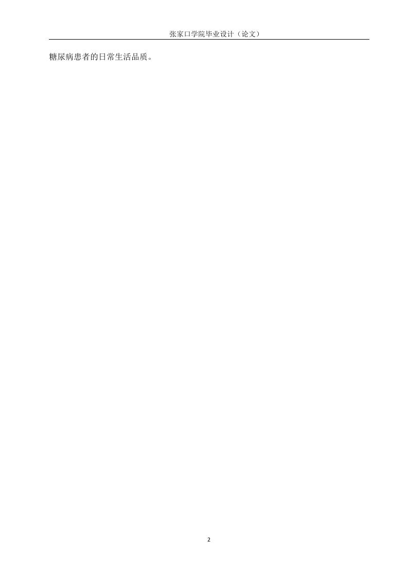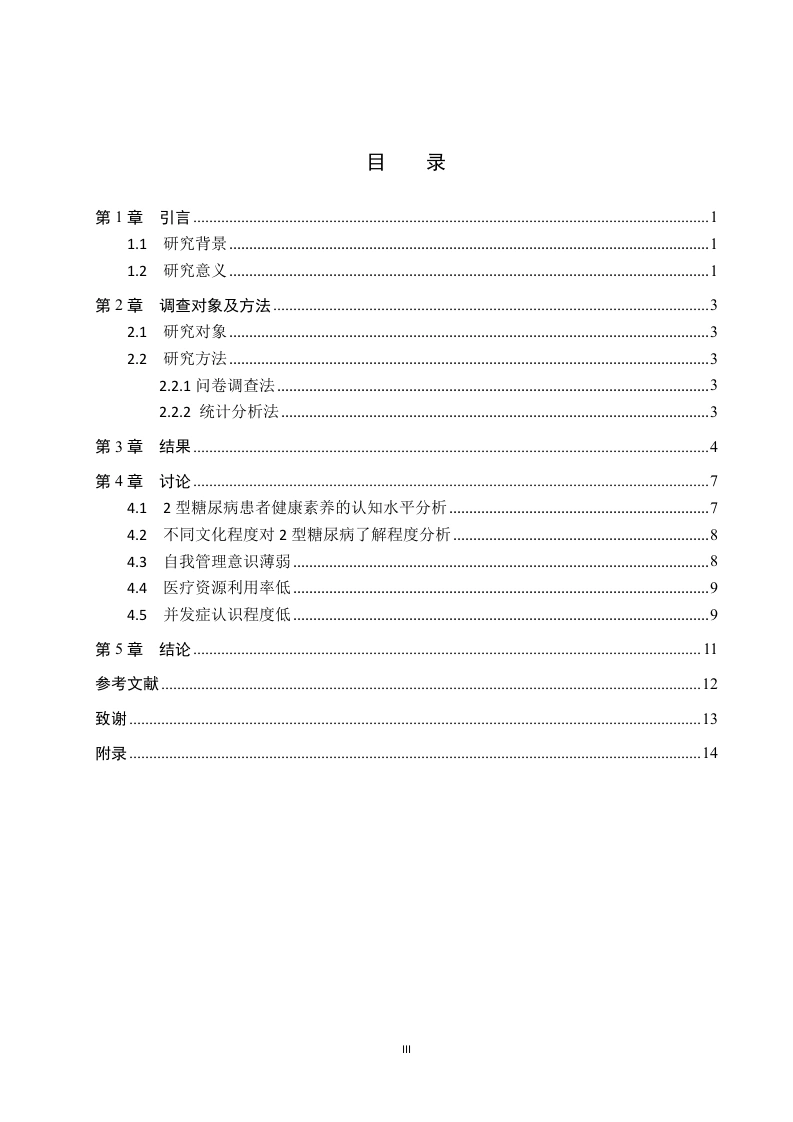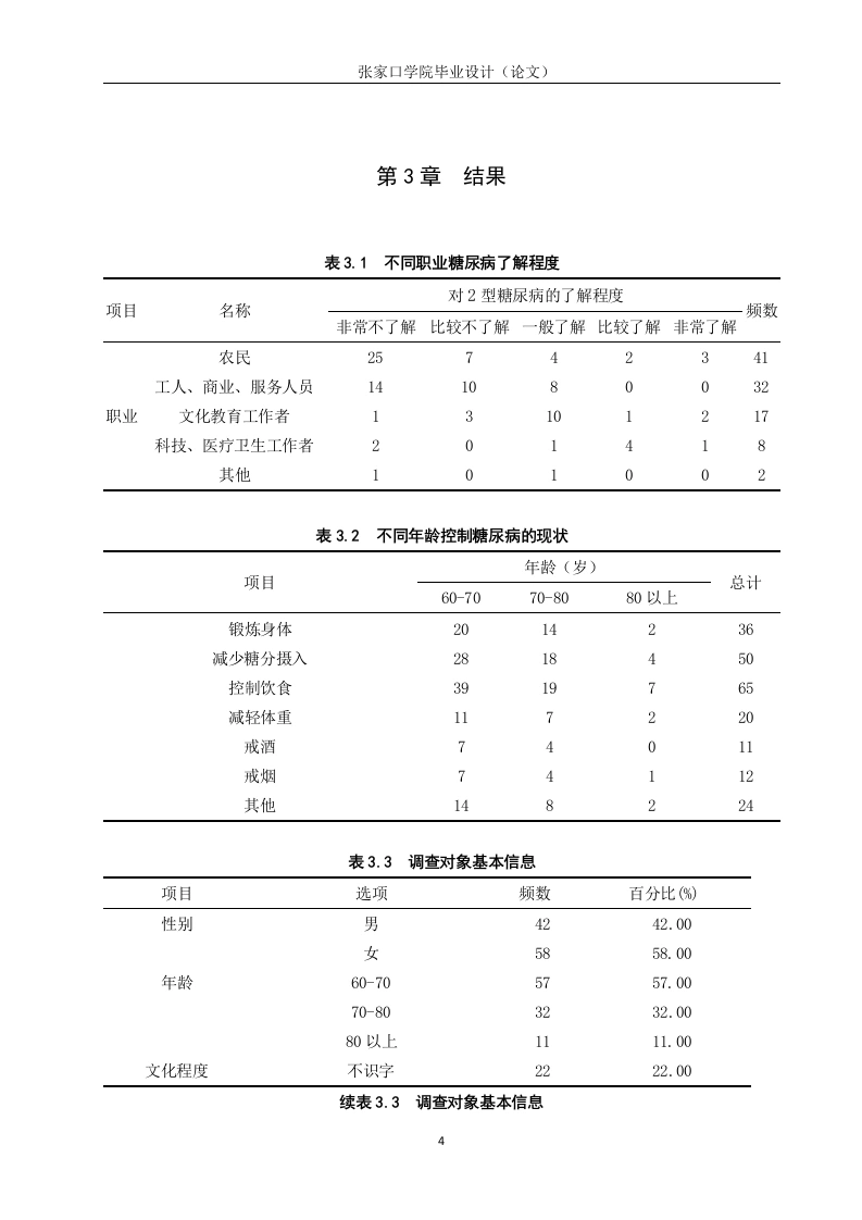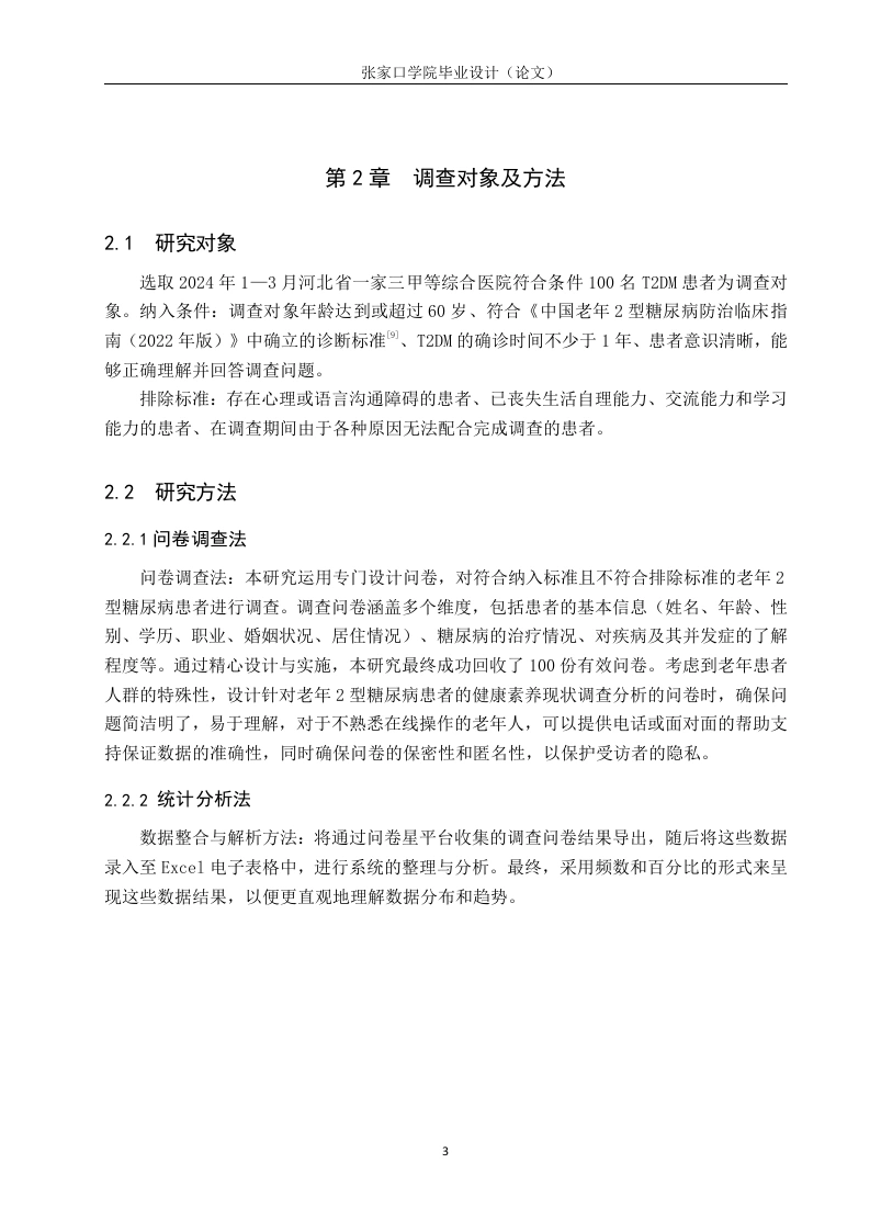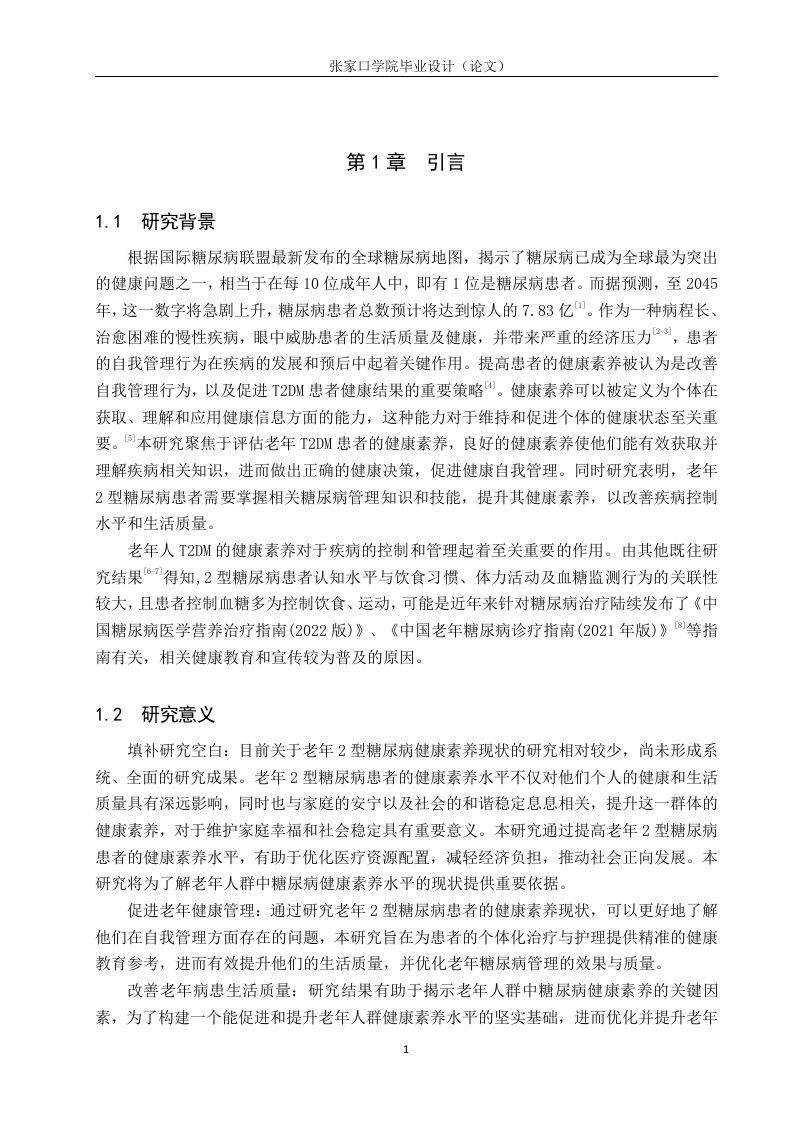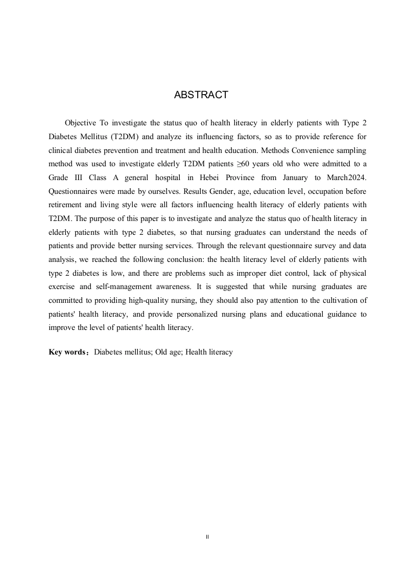 老年2型糖尿病健康素养现状调查分析摘要目的调查老年2型糖尿病(Type2 Diabetes Mellitus,T2DM)患者健康素养现状并分析其影响因素,为临床糖尿病的防治和健康宣教提供参考。方法采用便利抽样法,于2024年1月到3月河北省一所三级甲等综合医院收治的≥60岁老年T2DM患者为研究对象,采用自制调查问卷的形式对其进行问卷调查。结果性别,年龄,文化水平,退离休前的职业,居住方式等均是老年T2DM患者健康素养的影响因素。结论老年2型糖尿病患者的健康素养水平较低,存在饮食控制不当、缺乏体育锻炼和自我管理意识等问题。建议护理学毕业生在致力于提供高质量护理的同时,也应关注患者的健康素养培养,提供个性化的护理计划和教育指导,以提高患者的健康素养水平。关键词:糖尿病;老年;健康素养ABSTRACTObjective To investigate the status quo of health literacy in elderly patients with Type 2Diabetes Mellitus (T2DM)and analyze its influencing factors,so as to provide reference forclinical diabetes prevention and treatment and health education.Methods Convenience samplingmethod was used to investigate elderly T2DM patients >60 years old who were admitted to aGrade III Class A general hospital in Hebei Province from January to March2024.Questionnaires were made by ourselves.Results Gender,age,education level,occupation beforeretirement and living style were all factors influencing health literacy of elderly patients withT2DM.The purpose of this paper is to investigate and analyze the status quo of health literacy inelderly patients with type 2 diabetes,so that nursing graduates can understand the needs ofpatients and provide better nursing services.Through the relevant questionnaire survey and dataanalysis,we reached the following conclusion:the health literacy level of elderly patients withtype 2 diabetes is low,and there are problems such as improper diet control,lack of physicalexercise and self-management awareness.It is suggested that while nursing graduates arecommitted to providing high-quality nursing,they should also pay attention to the cultivation ofpatients'health literacy,and provide personalized nursing plans and educational guidance toimprove the level of patients'health literacy.Key words:Diabetes mellitus;Old age;Health literacy目录第1章引言.1.1研究背景1.2研究意义第2章调查对象及方法…32.1研究对象….32.2研究方法….32.2.1问卷调查法32.2.2统计分析法3第3章结果4第4章讨论…。4.12型糖尿病患者健康素养的认知水平分析.74.2不同文化程度对2型糖尿病了解程度分析84.3自我管理意识薄弱.84.4医疗资源利用率低94.5并发症认识程度低.9第5章结论.11参考文献.12致谢13附录.14张家口学院毕业设计(论文)第1章引言1.1研究背景根据国际糖尿病联盟最新发布的全球糖尿病地图,揭示了糖尿病已成为全球最为突出的健康问题之一,相当于在每10位成年人中,即有1位是糖尿病患者。而据预测,至2045年,这一数字将急剧上升,糖尿病患者总数预计将达到惊人的7.83亿。作为一种病程长、治愈困难的慢性疾病,眼中威胁患者的生活质量及健康,并带来严重的经济压力2,患者的自我管理行为在疾病的发展和预后中起着关键作用。提高患者的健康素养被认为是改善自我管理行为,以及促进T2DM患者健康结果的重要策略①。健康素养可以被定义为个体在获取、理解和应用健康信息方面的能力,这种能力对于维持和促进个体的健康状态至关重要。本研究聚焦于评估老年T2DM患者的健康素养,良好的健康素养使他们能有效获取并理解疾病相关知识,进而做出正确的健康决策,促进健康自我管理。同时研究表明,老年2型糖尿病患者需要掌握相关糖尿病管理知识和技能,提升其健康素养,以改善疾病控制水平和生活质量。老年人T2DM的健康素养对于疾病的控制和管理起着至关重要的作用。由其他既往研究结果6得知,2型糖尿病患者认知水平与饮食习惯、体力活动及血糖监测行为的关联性较大,且患者控制血糖多为控制饮食、运动,可能是近年来针对糖尿病治疗陆续发布了《中国糖尿病医学营养治疗指南(2022版)》、《中国老年糖尿病诊疗指南(2021年版)》⑧等指南有关,相关健康教育和宣传较为普及的原因。1.2研究意义填补研究空白:目前关于老年2型糖尿病健康素养现状的研究相对较少,尚未形成系统、全面的研究成果。老年2型糖尿病患者的健康素养水平不仅对他们个人的健康和生活质量具有深远影响,同时也与家庭的安宁以及社会的和谐稳定息息相关,提升这一群体的健康素养,对于维护家庭幸福和社会稳定具有重要意义。本研究通过提高老年2型糖尿病患者的健康素养水平,有助于优化医疗资源配置,减轻经济负担,推动社会正向发展。本研究将为了解老年人群中糖尿病健康素养水平的现状提供重要依据。促进老年健康管理:通过研究老年2型糖尿病患者的健康素养现状,可以更好地了解他们在自我管理方面存在的问题,本研究旨在为患者的个体化治疗与护理提供精准的健康教育参考,进而有效提升他们的生活质量,并优化老年糖尿病管理的效果与质量。改善老年病患生活质量:研究结果有助于揭示老年人群中糖尿病健