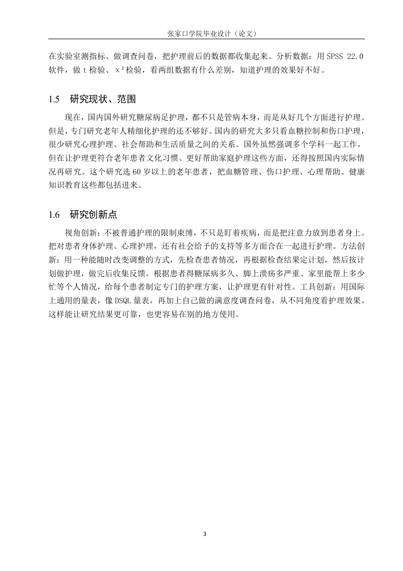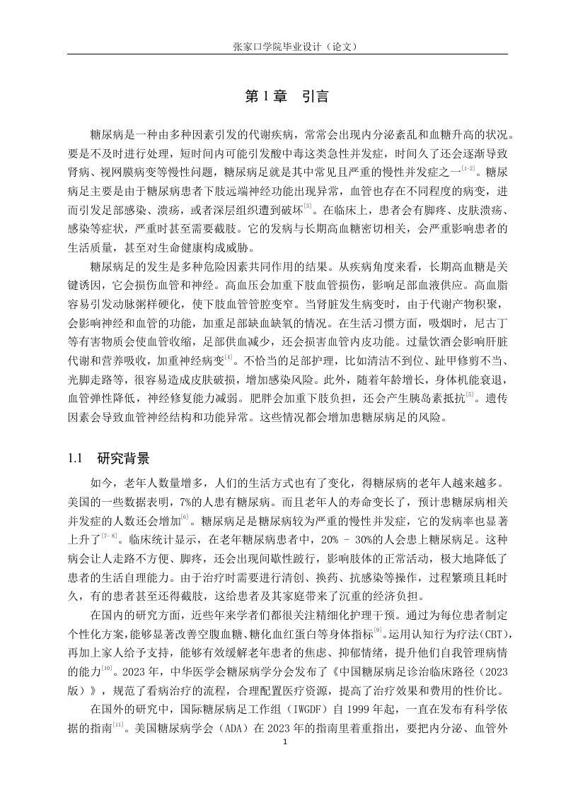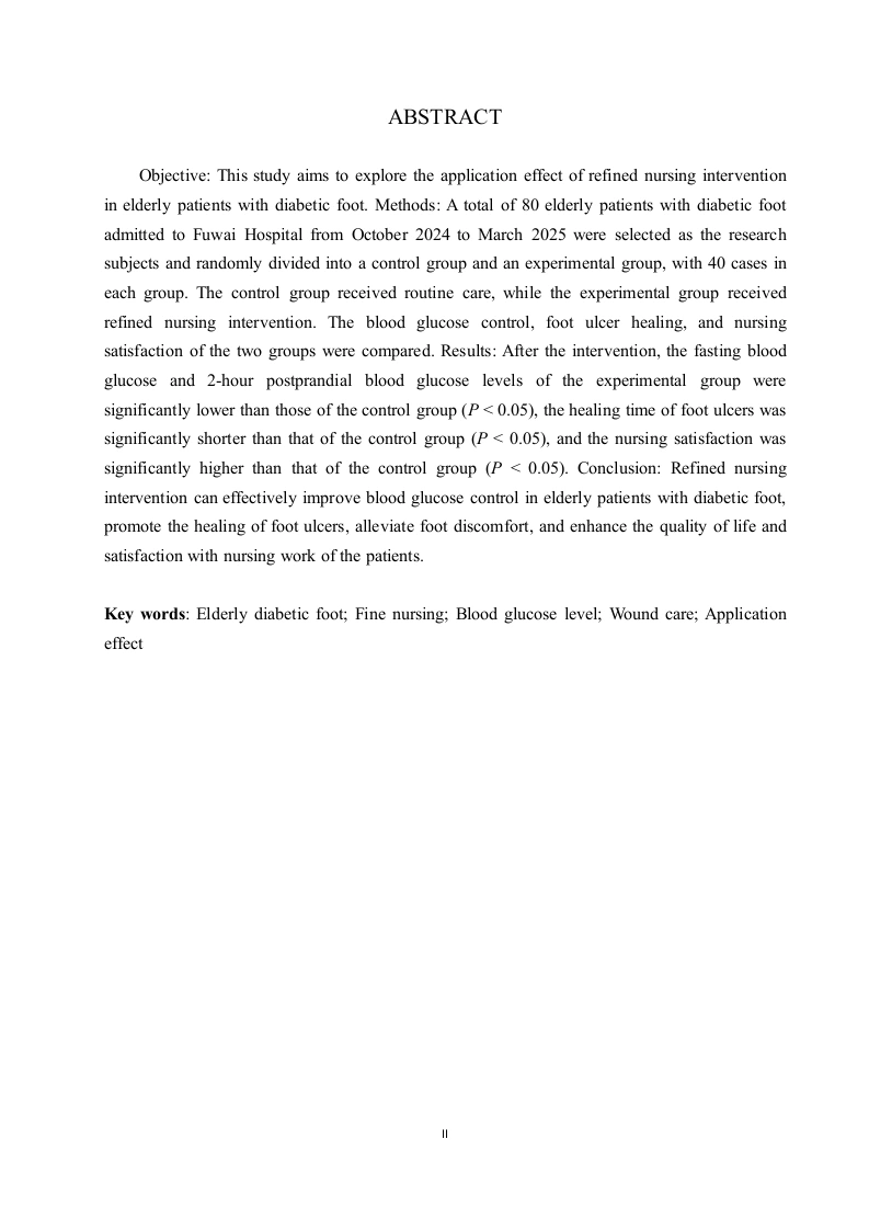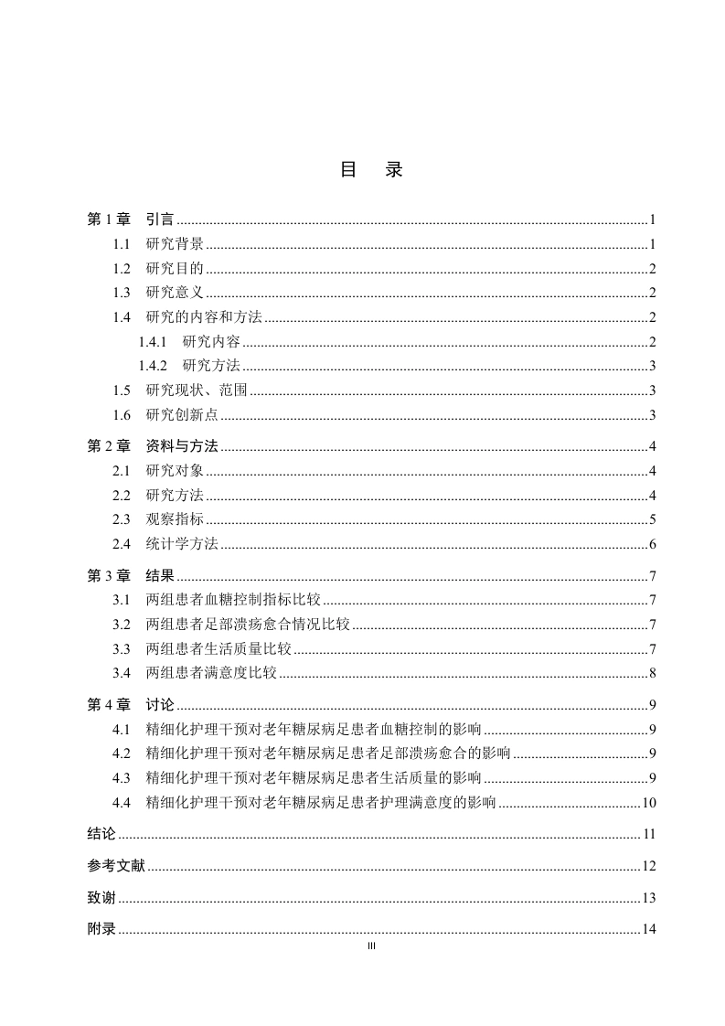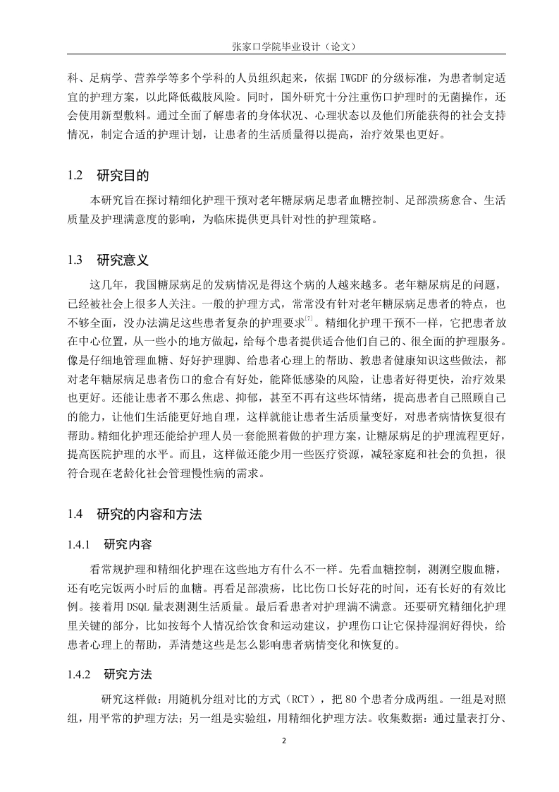 精细化护理干预在老年糖尿病足患者中的应用效果摘要目的:这个研究想要看看精细化护理干预对老年糖尿病足患者有没有用。方法:选了2024年10月到2025年3月在阜外医院住院的80个老年糖尿病足患者。把他们随机分成两组,一组叫对照组,一组叫实验组,每组都有40个人。对照组用普通的护理方法,实验组用精细化护理干预。然后对比两组患者的血糖控制得怎么样、脚上溃疡愈合得好不好、生活质量怎么样,还有对护理的满意程度。结果:护理之后,实验组患者空腹时的血糖、吃完饭2小时后的血糖,都比对照组低很多(P<0.05)。实验组患者脚上溃疡愈合的时间,比对照组短很多(P<0.05)。而且实验组患者的生活质量评分、对护理的满意程度,都比对照组高很多(P<0.05)。结论:精细化护理干预能让老年糖尿病足患者的血糖控制得更好,让脚上的溃疡好得更快,能减轻脚的不舒服。还能让患者生活质量提高,对护理工作更满意。关键词:老年糖尿病足;精细化护理;血糖水平:伤口护理;应用效果ABSTRACTObjective:This study aims to explore the application effect of refined nursing interventionin elderly patients with diabetic foot.Methods:A total of 80 elderly patients with diabetic footadmitted to Fuwai Hospital from October 2024 to March 2025 were selected as the researchsubjects and randomly divided into a control group and an experimental group,with 40 cases ineach group.The control group received routine care,while the experimental group receivedrefined nursing intervention.The blood glucose control,foot ulcer healing,and nursingsatisfaction of the two groups were compared.Results:After the intervention,the fasting bloodglucose and 2-hour postprandial blood glucose levels of the experimental group weresignificantly lower than those of the control group (P<0.05),the healing time of foot ulcers wassignificantly shorter than that of the control group(P<0.05),and the nursing satisfaction wassignificantly higher than that of the control group (P<0.05).Conclusion:Refined nursingintervention can effectively improve blood glucose control in elderly patients with diabetic foot,promote the healing of foot ulcers,alleviate foot discomfort,and enhance the quality of life andsatisfaction with nursing work of the patients.Key words:Elderly diabetic foot;Fine nursing;Blood glucose level;Wound care;Applicationeffect目录第1章]引言.…1.】研究背景.1.2研究目的.21.3研究意义.21.4研究的内容和方法.21.4.1研究内容21.4.2研究方法…..31.5研究现状、范围31.6研究创新点….3第2章资料与方法..42.1研究对象….42.2研究方法.42.3观察指标.52.4统计学方法.6第3章结果.73.1两组患者血糖控制指标比较.73.2两组患者足部溃疡愈合情况比较.73.3两组患者生活质量比较.3.4两组患者满意度比较…8第4章讨论.….94.1精细化护理干预对老年糖尿病足患者血糖控制的影响.94.2精细化护理干预对老年糖尿病足患者足部溃疡愈合的影响94.3精细化护理干预对老年糖尿病足患者生活质量的影响.94.4精细化护理干预对老年糖尿病足患者护理满意度的影响10结论参考文献.12致谢13附录.14附录A…14附录B.15附录C………16附录D25附录E…27e